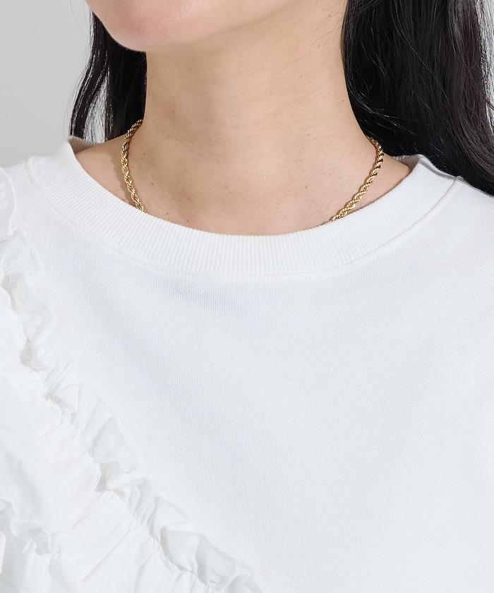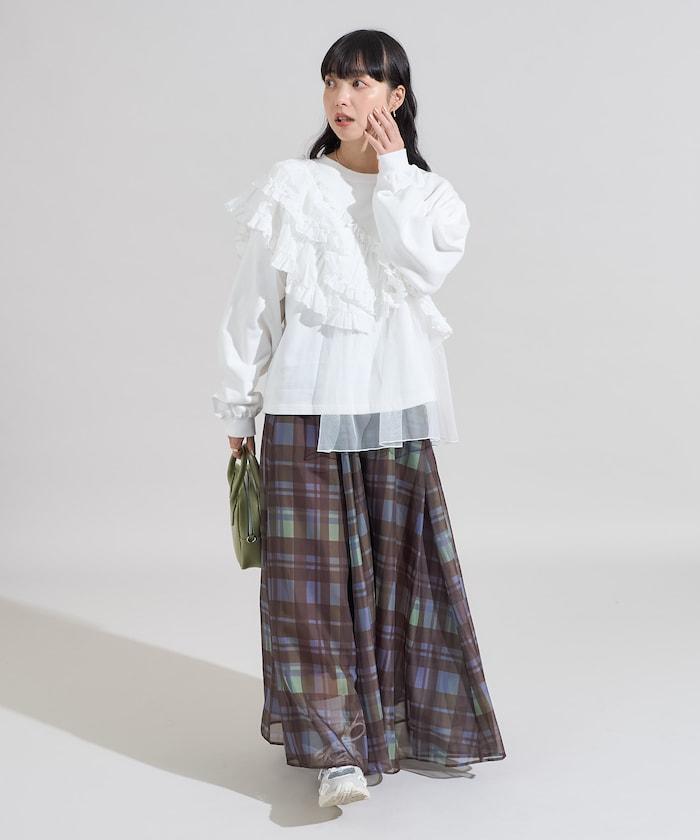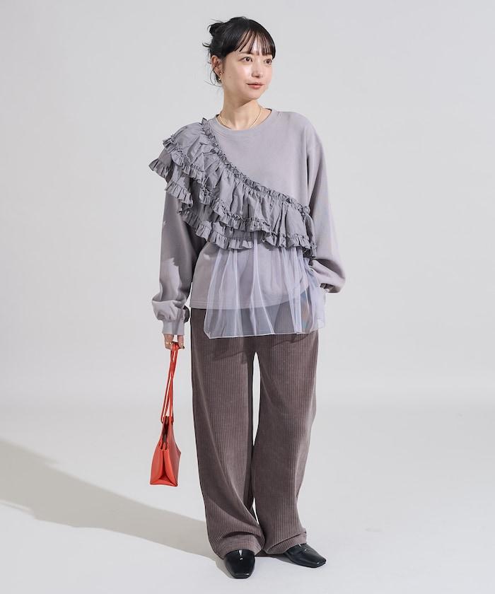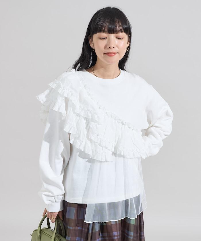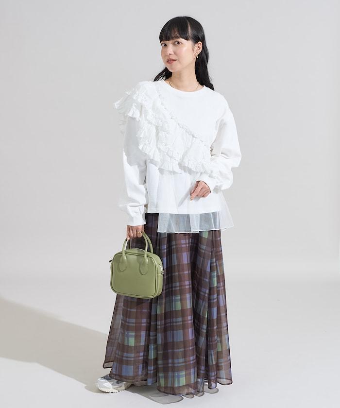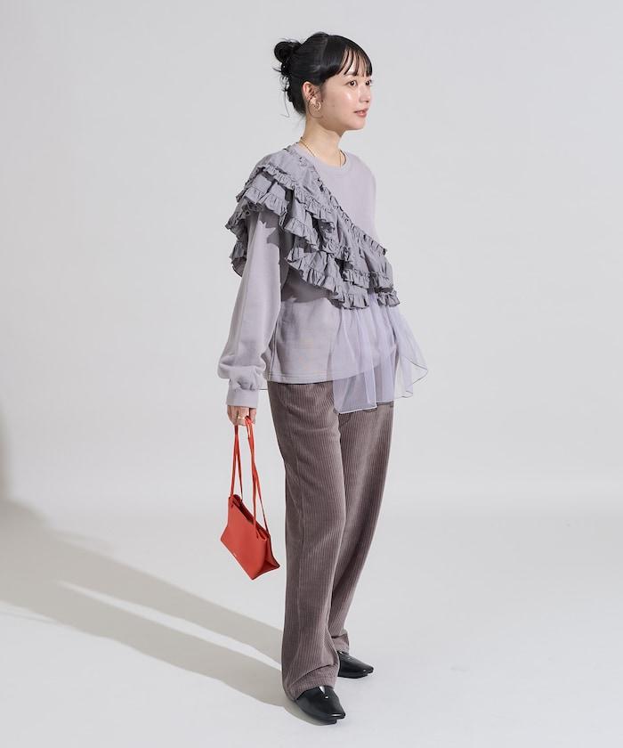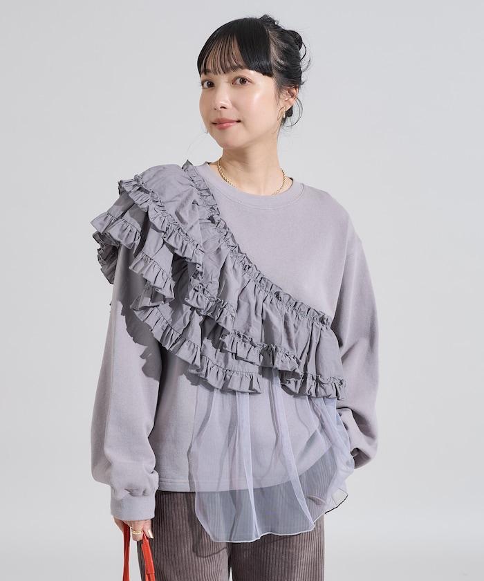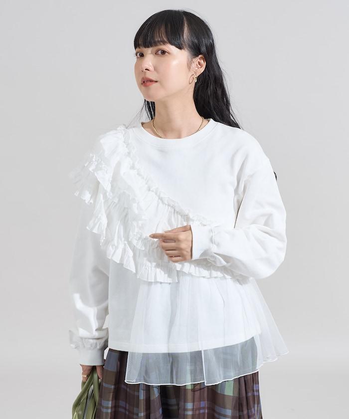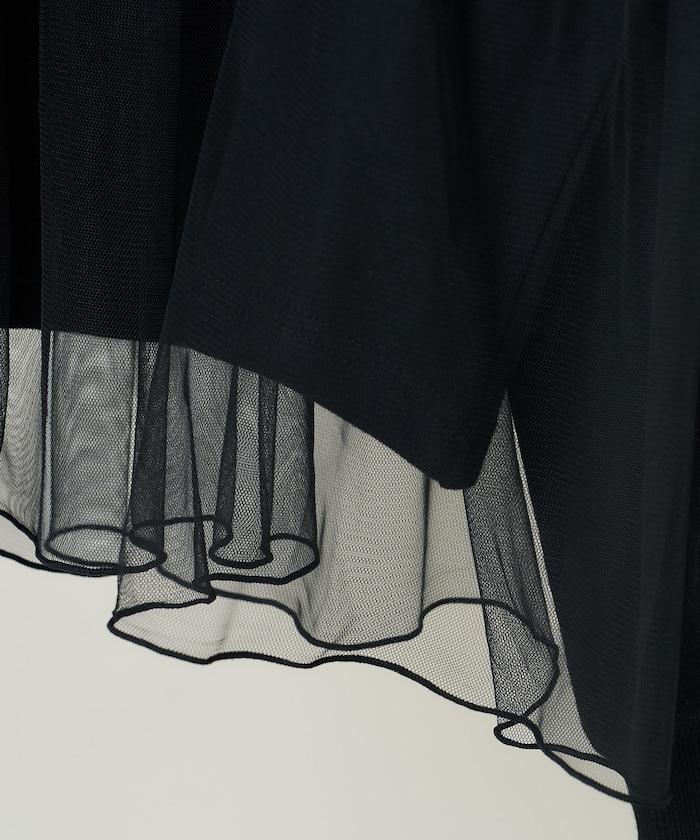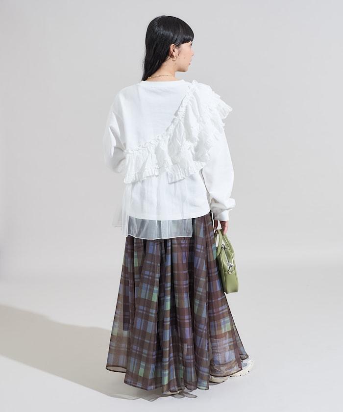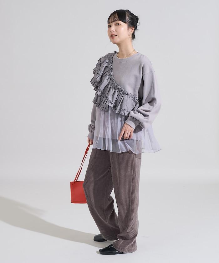 褶邊和薄紗的不對稱運用營造出更加立體的效果。