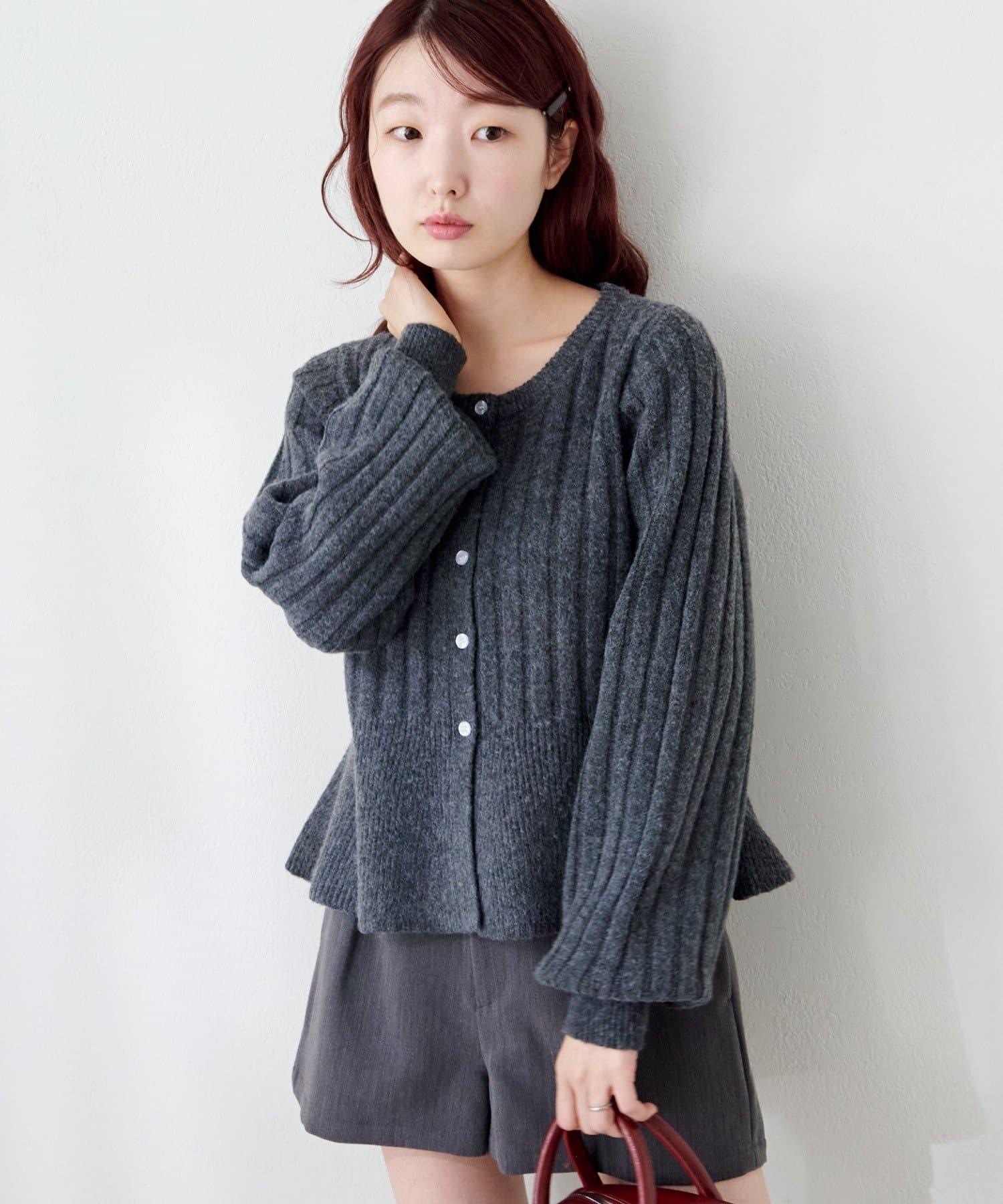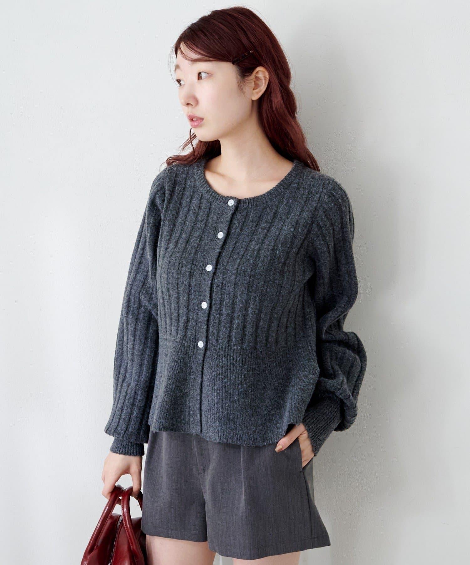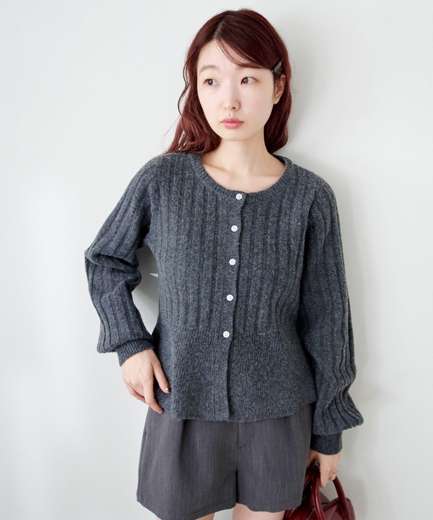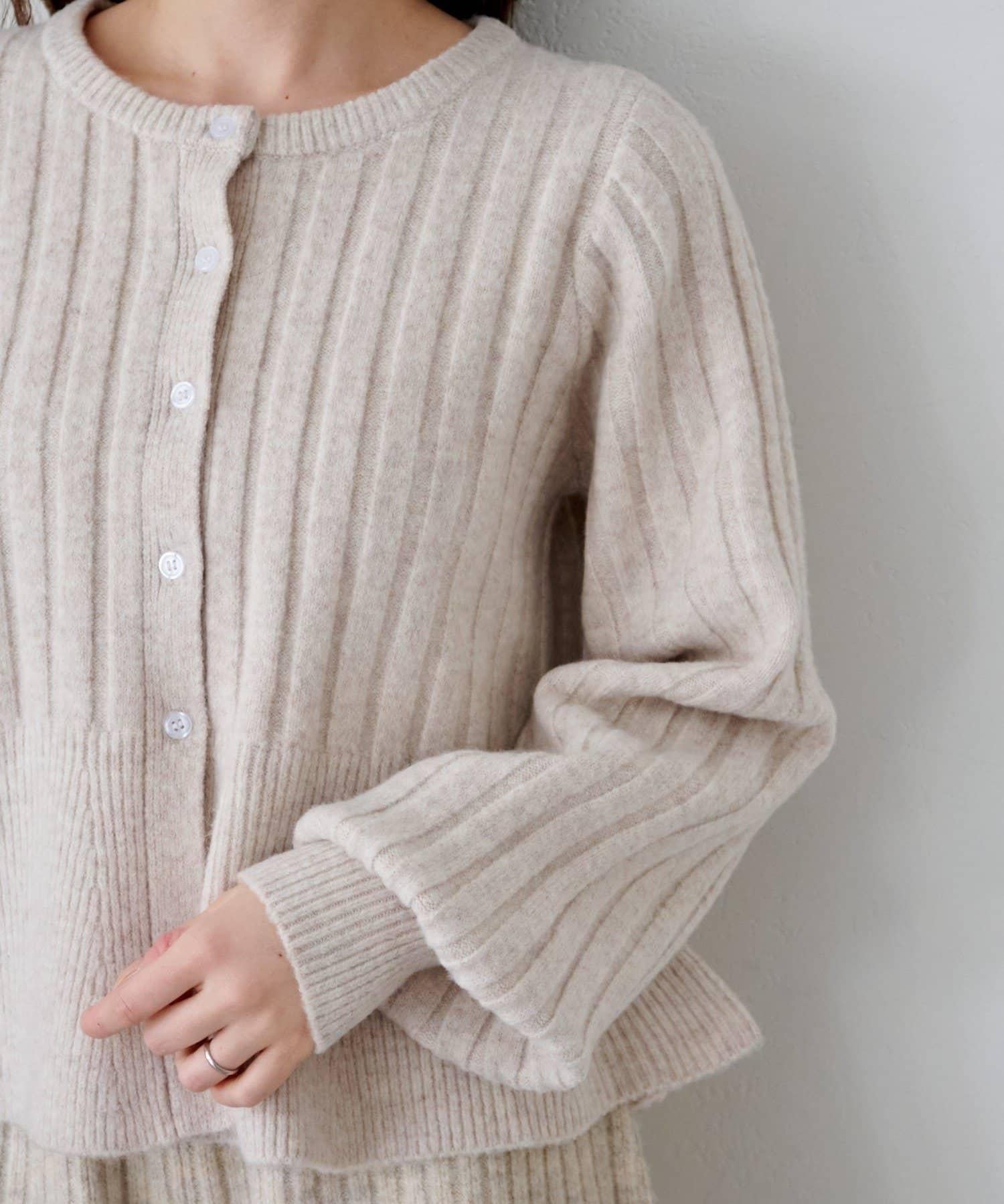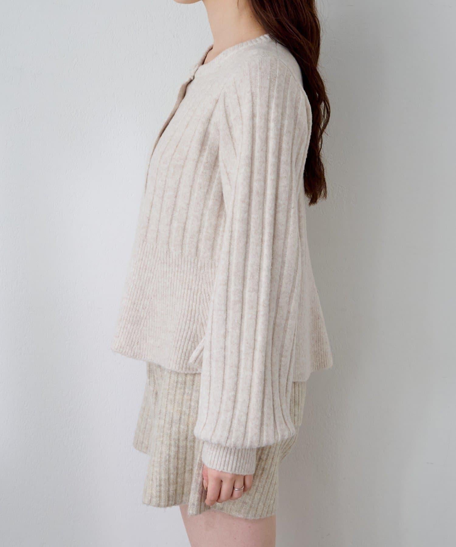 羅紋針織開衫採用蓬蓬裙廓形,腰部柔和地展開,營造出女性的柔美印象。