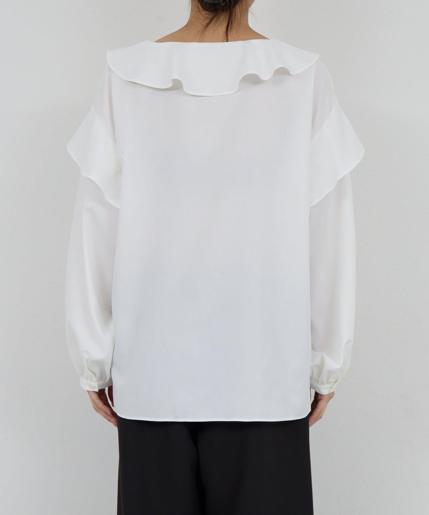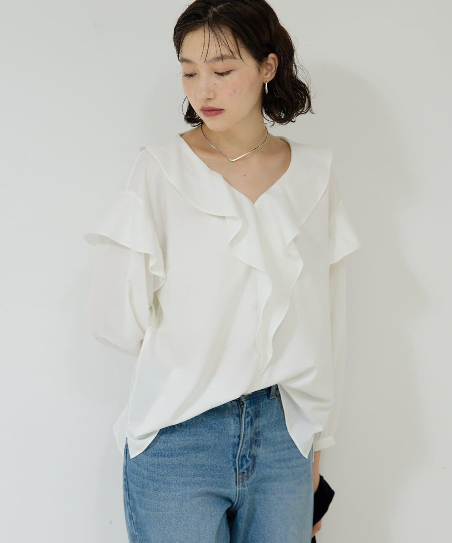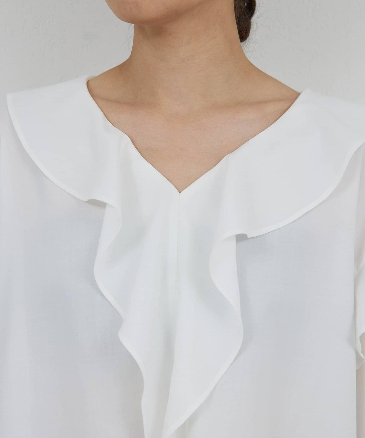 上衣採用簡潔的 V 領設計,領口處的荷葉邊並不豐滿,卻有一種飄逸感。