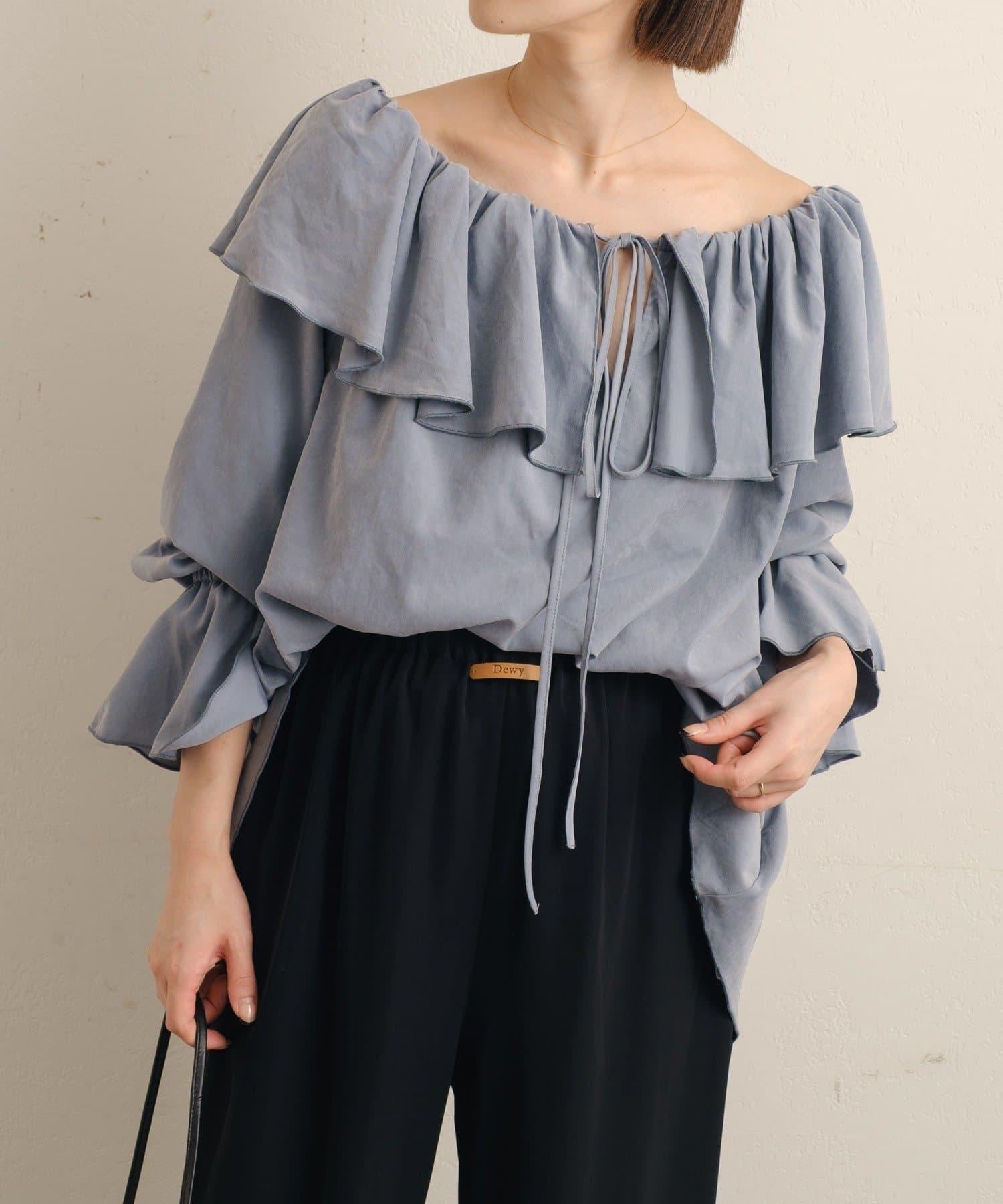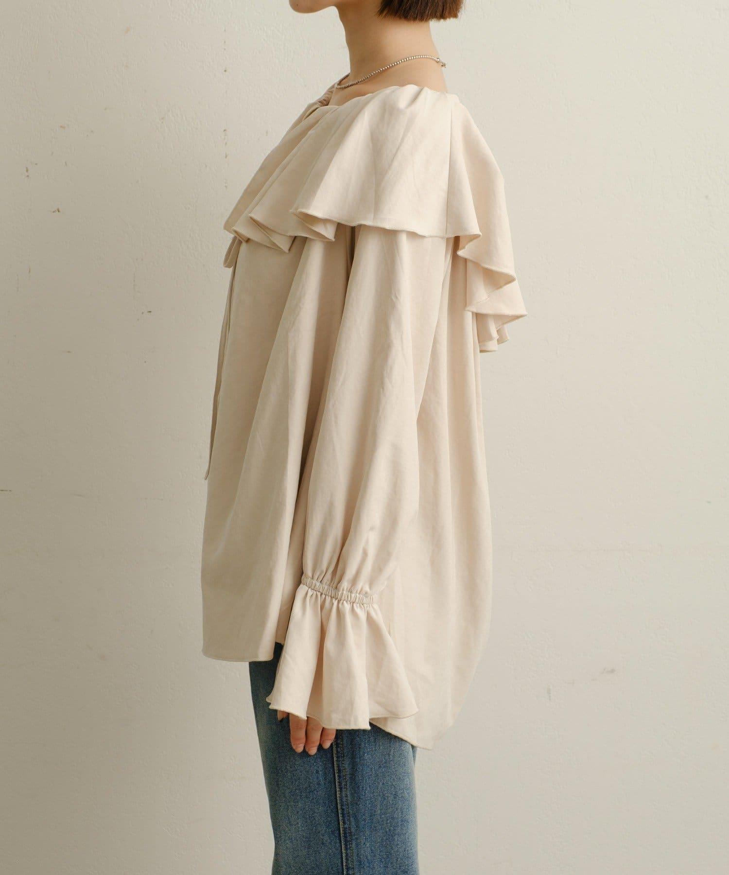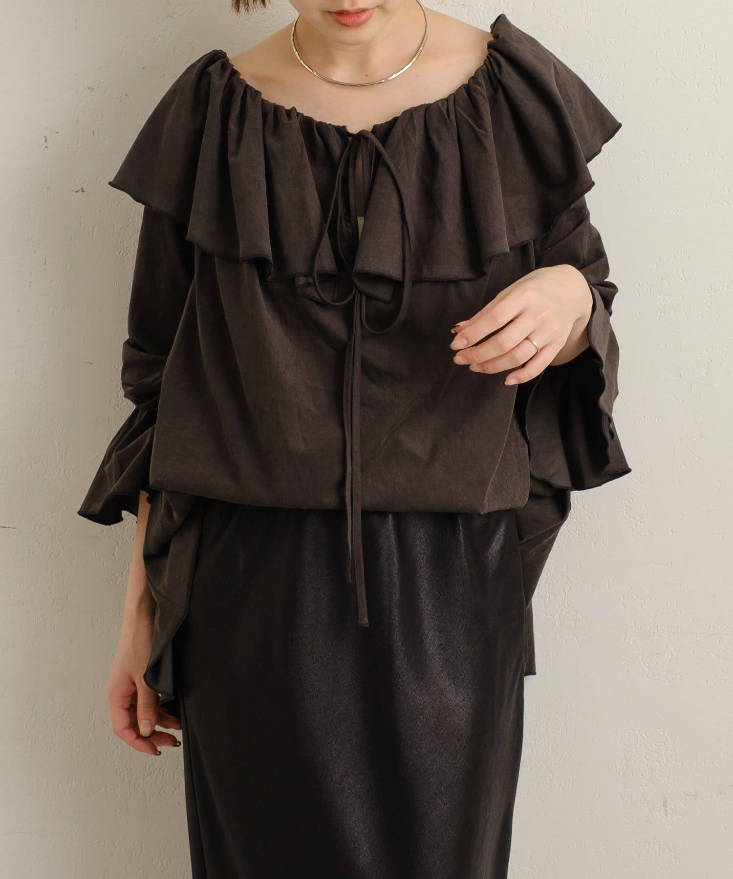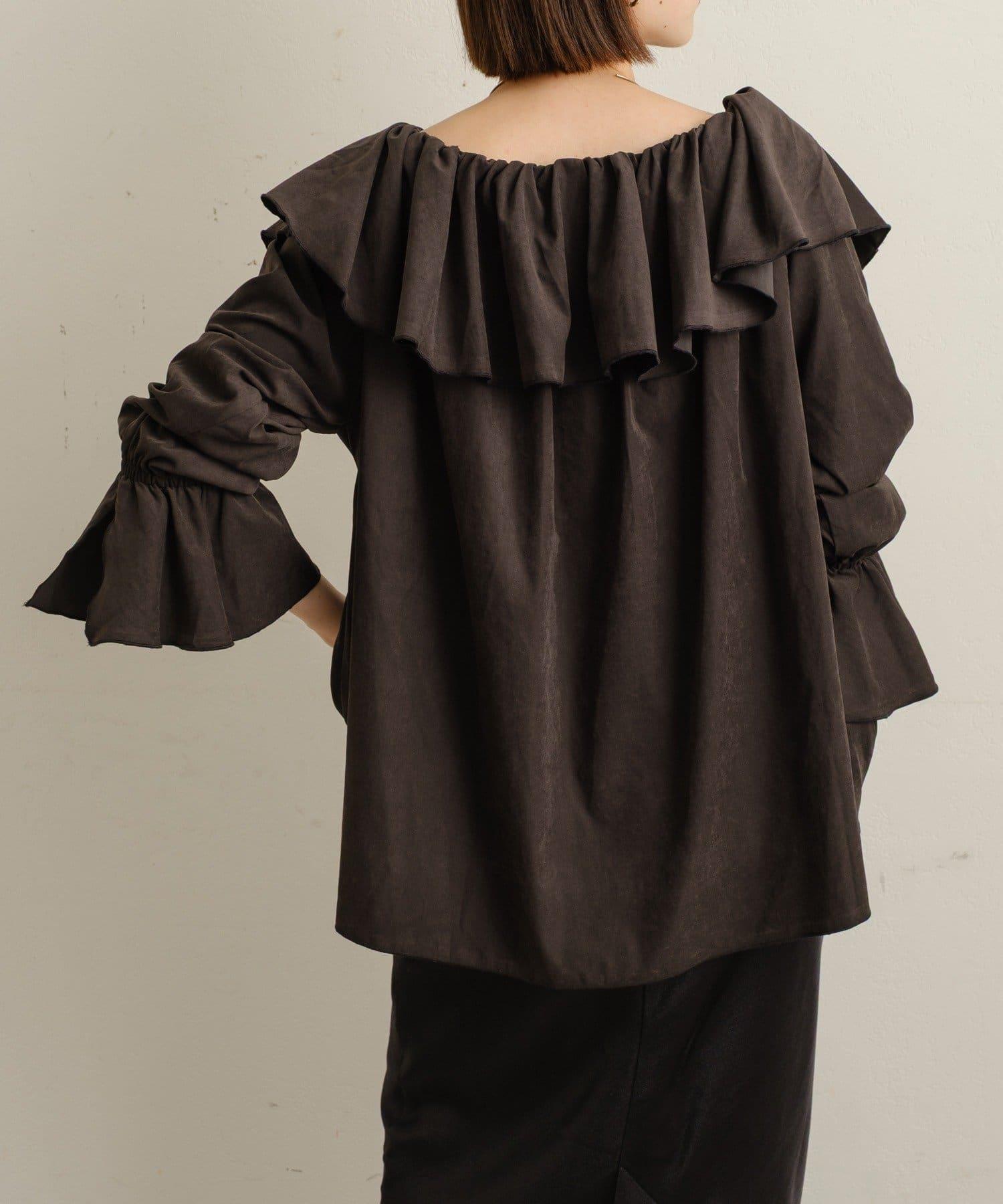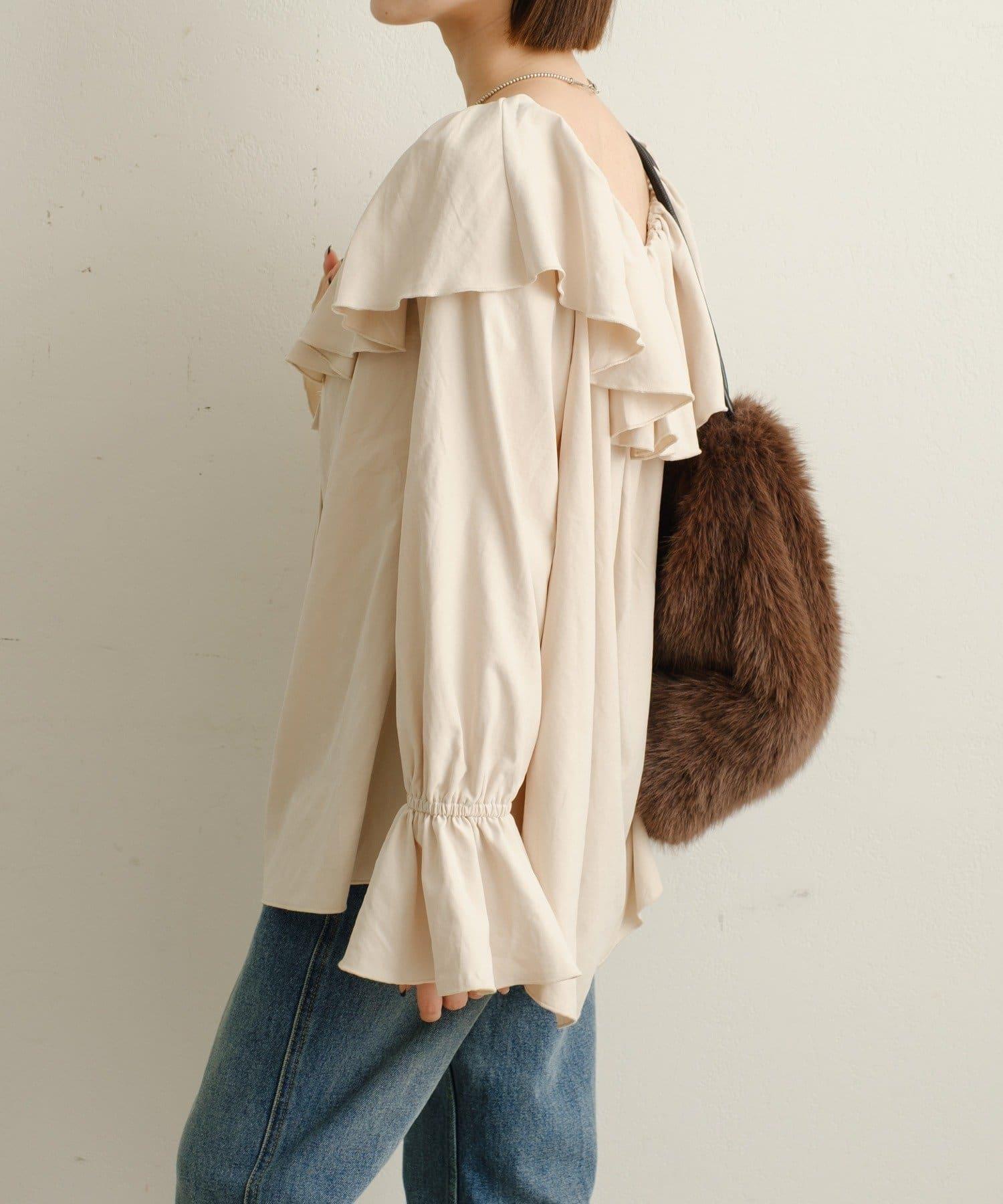 這款荷葉邊上衣的大荷葉邊設計,給人一種成熟可愛的感覺。