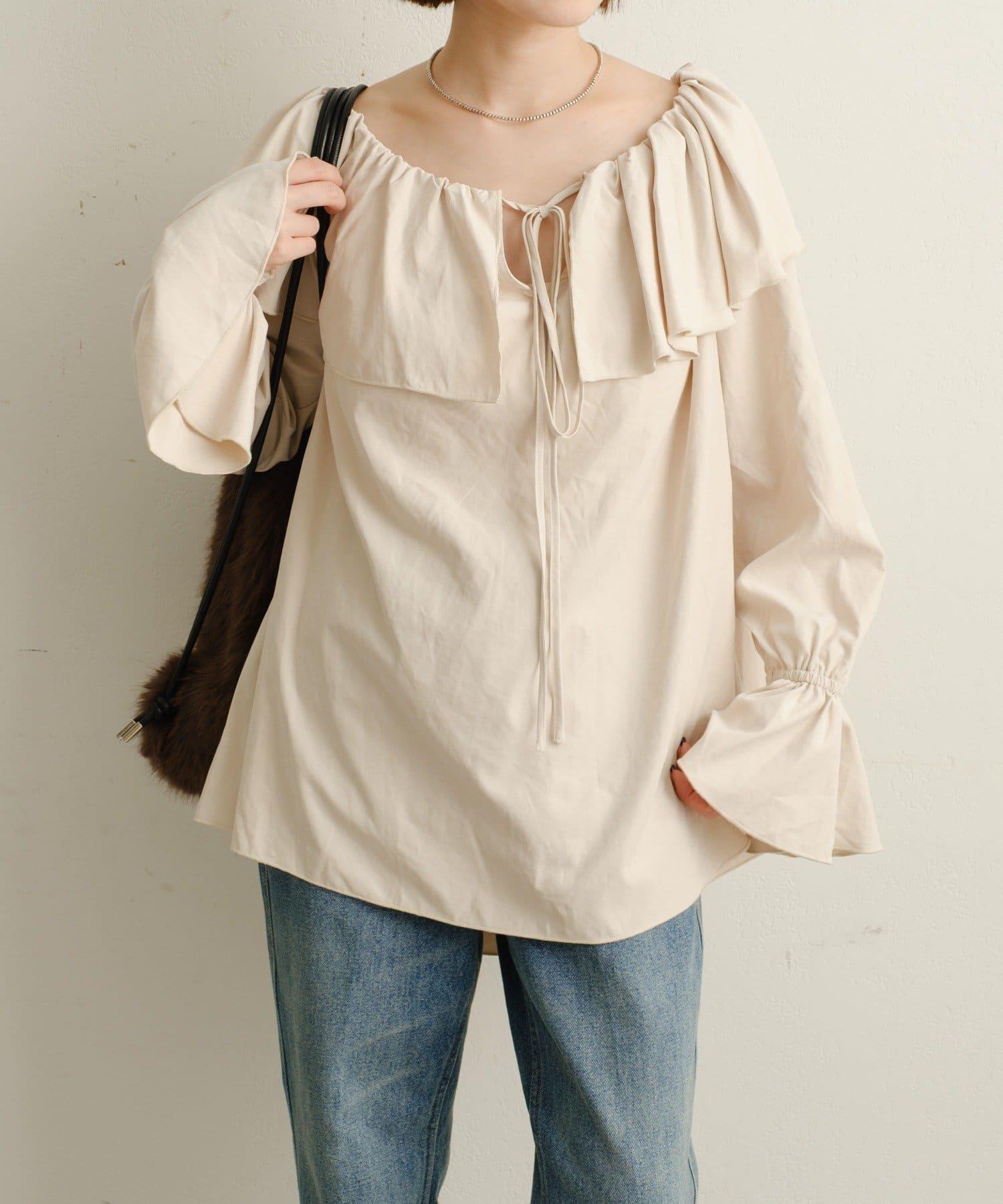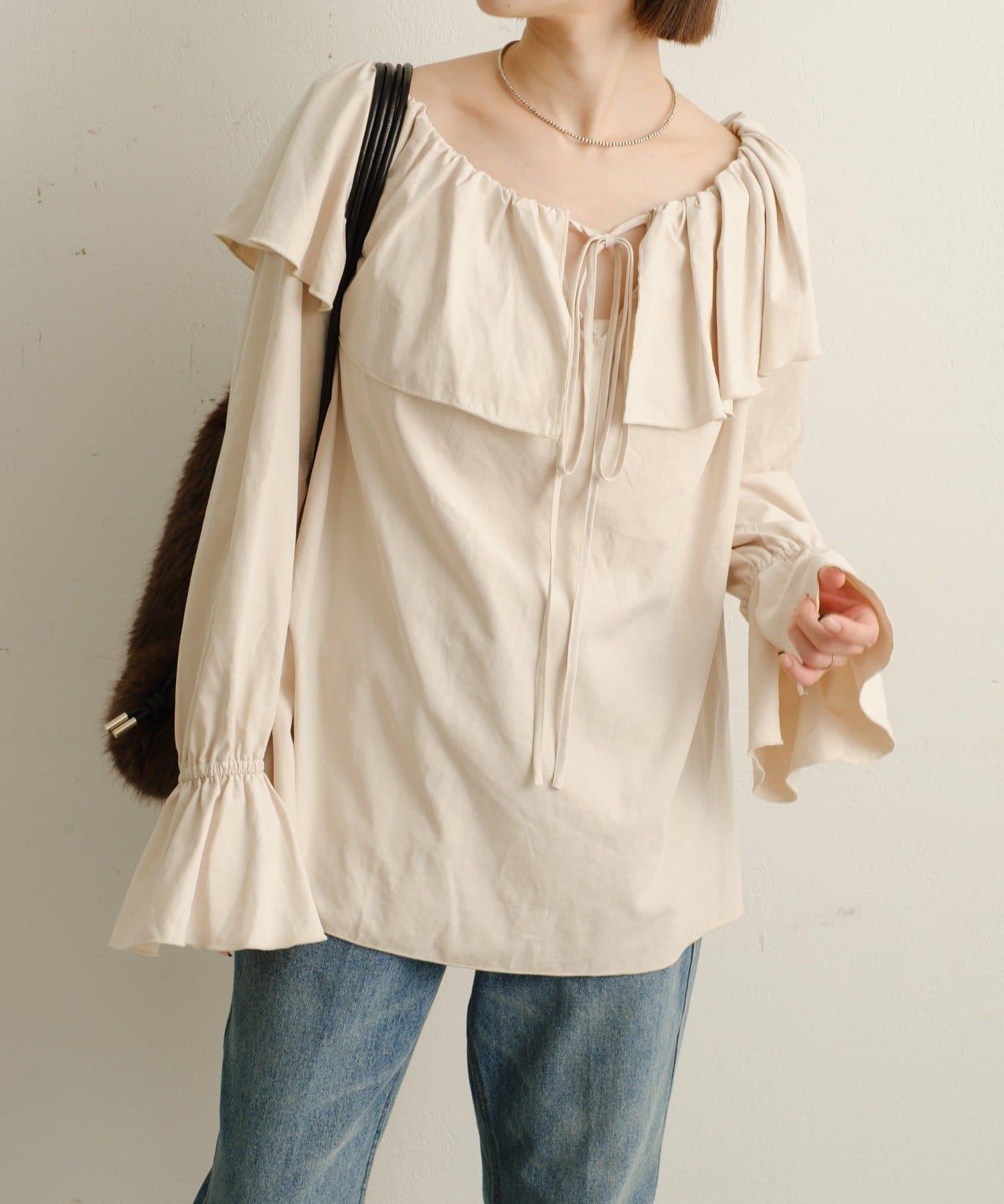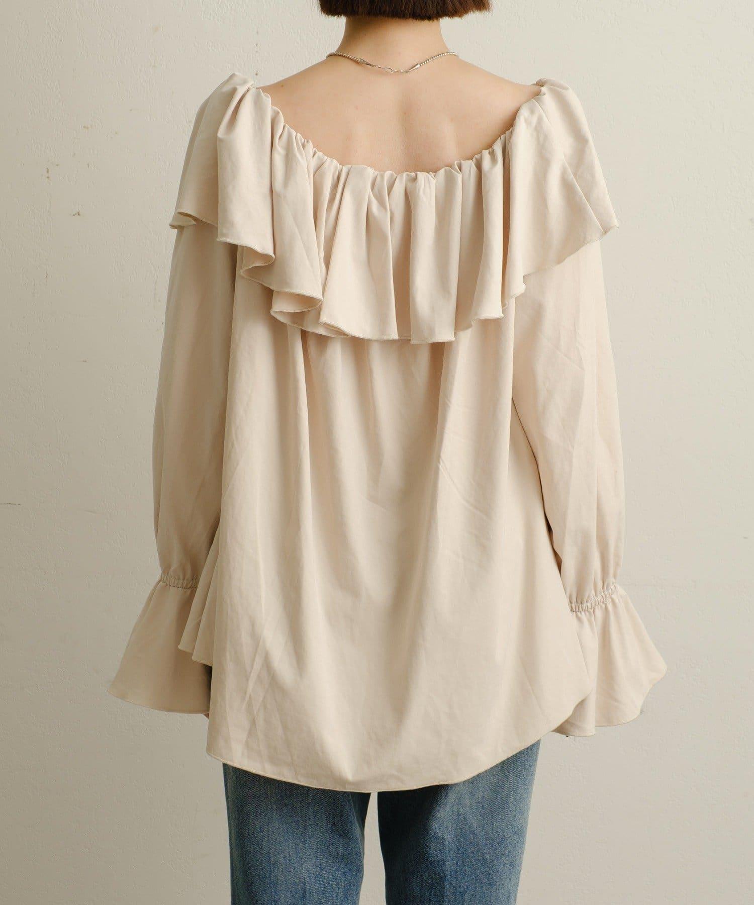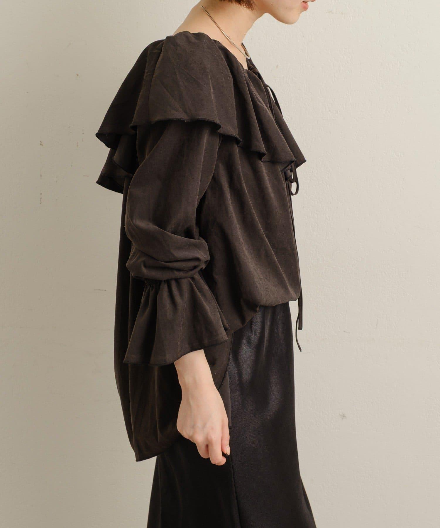 這款荷葉邊上衣的大荷葉邊設計,給人一種成熟可愛的感覺。