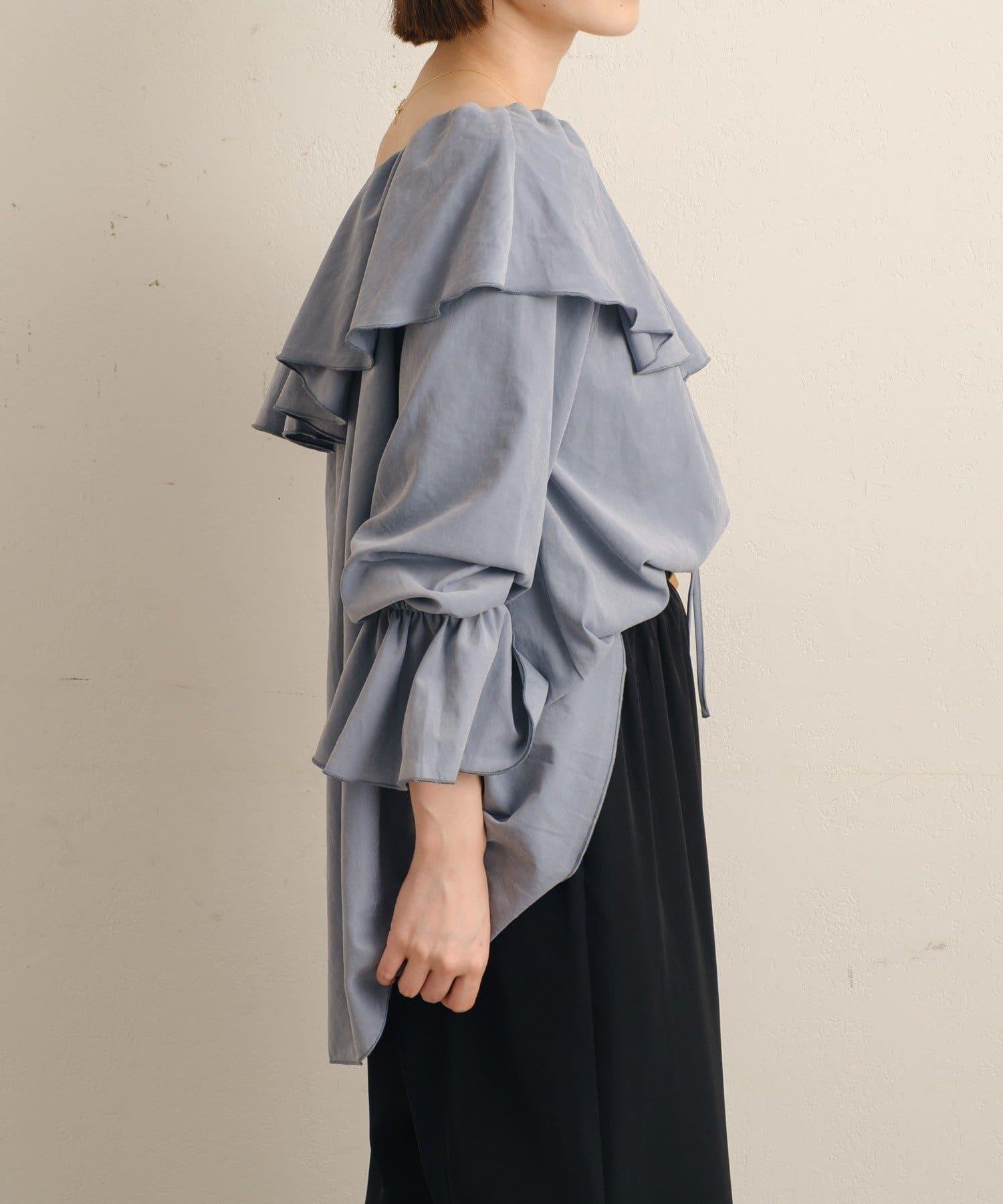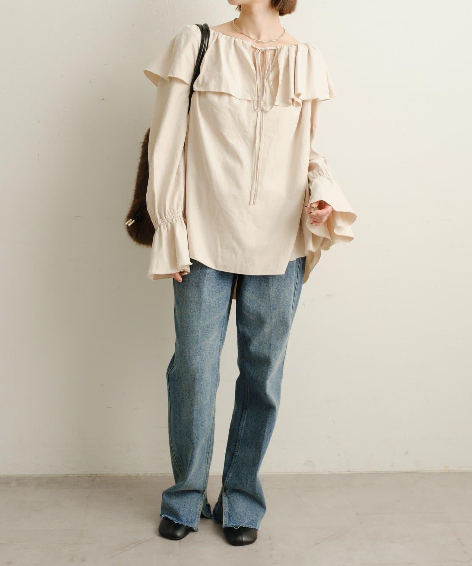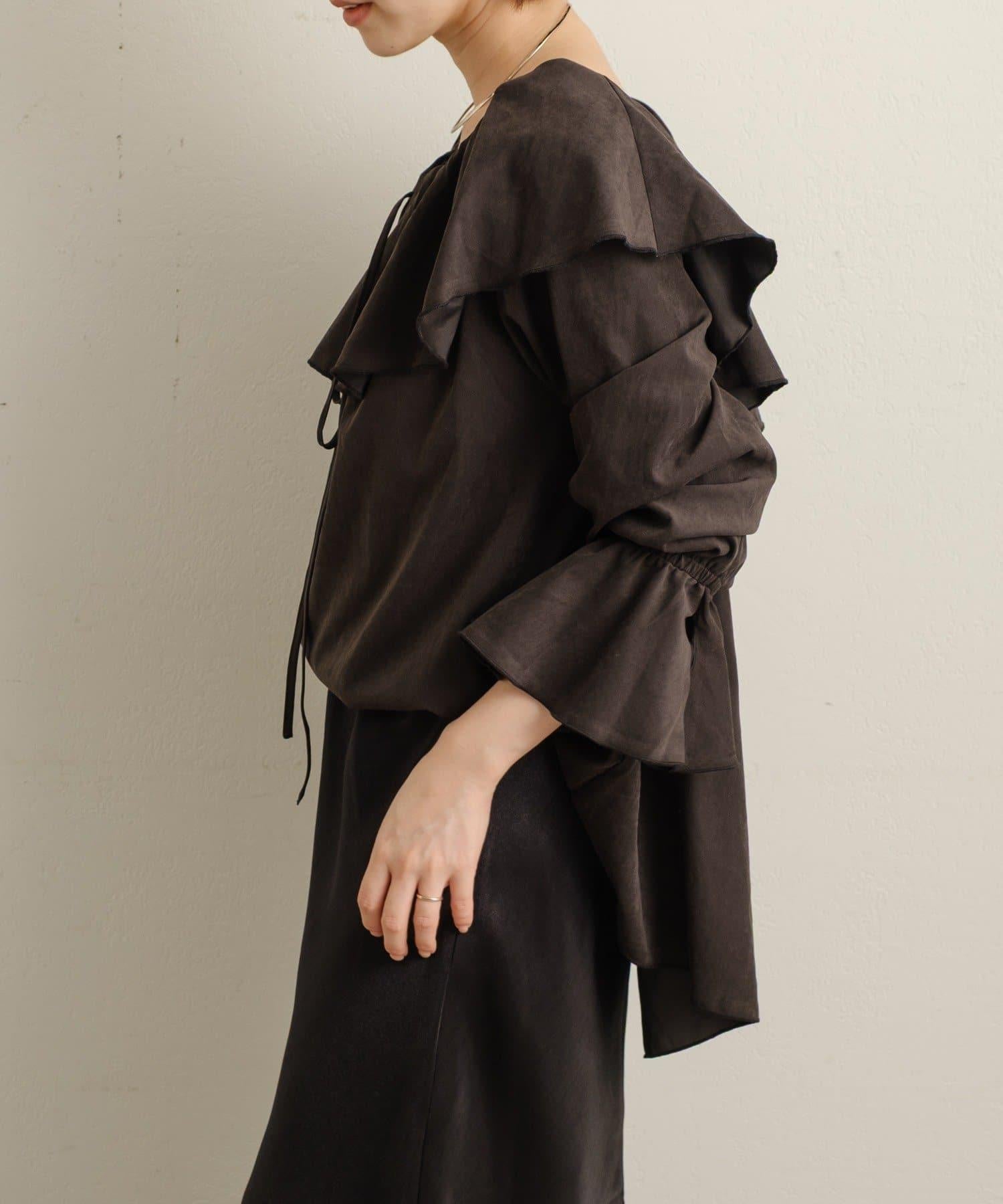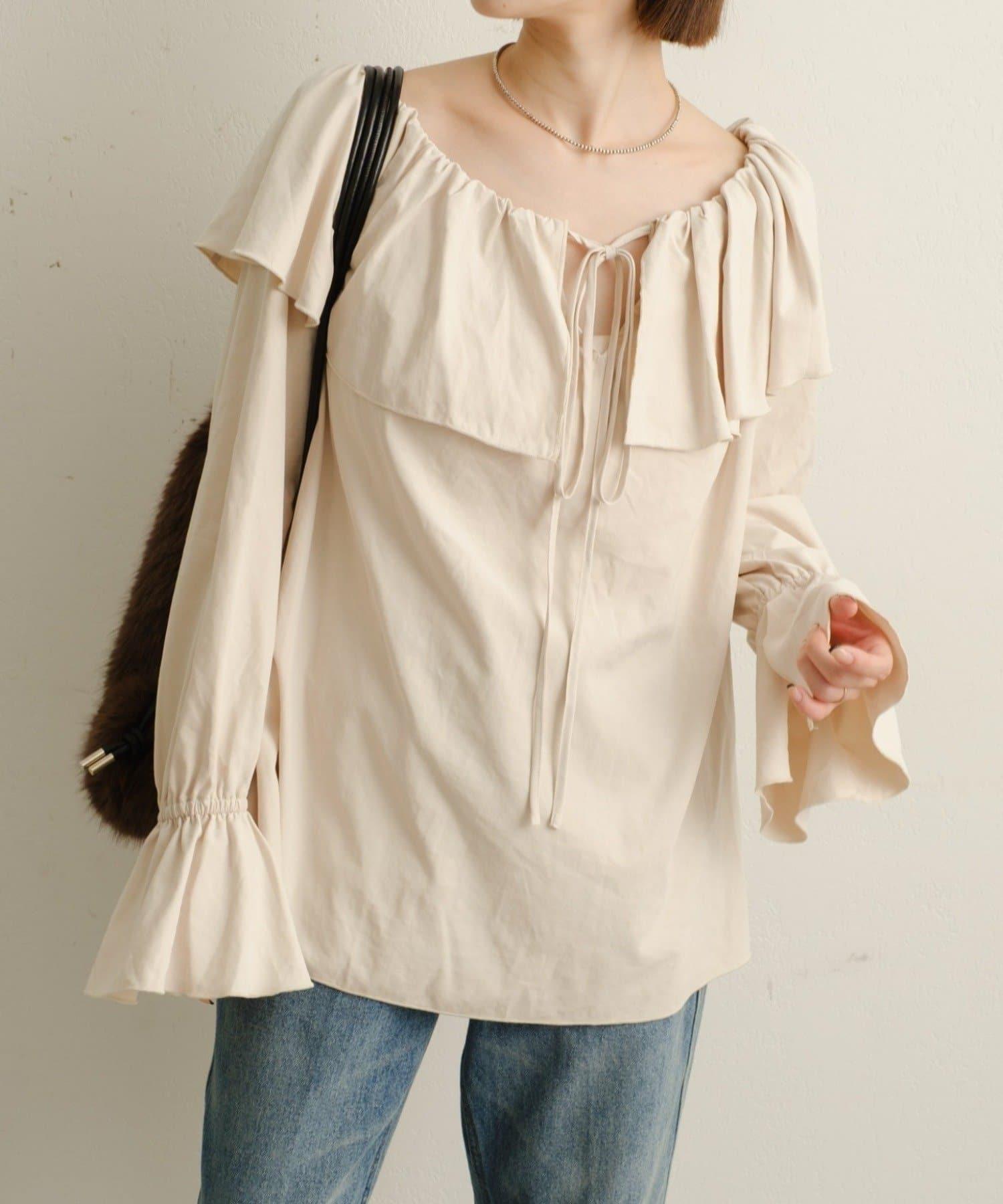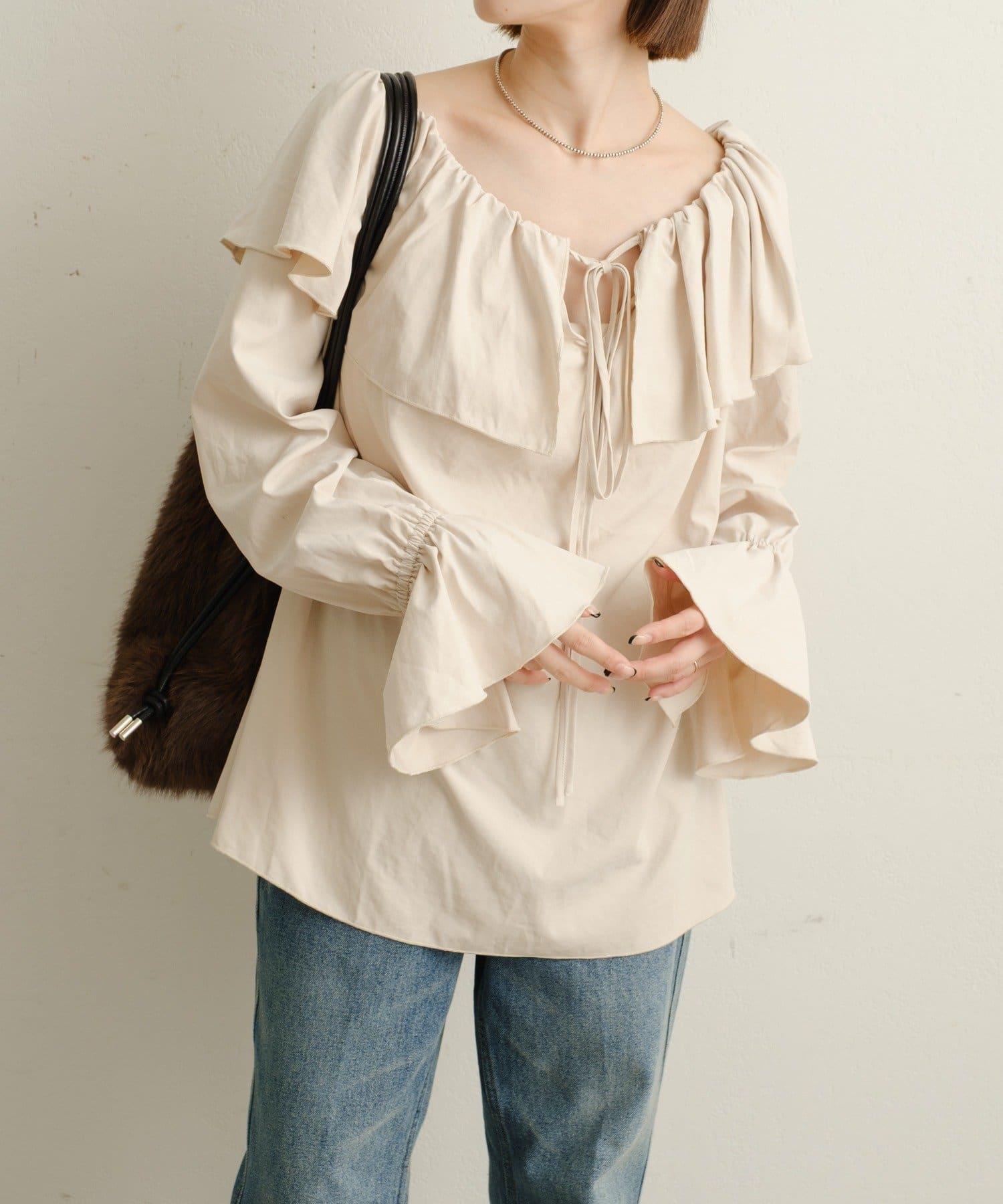 這款荷葉邊上衣的大荷葉邊設計,給人一種成熟可愛的感覺。