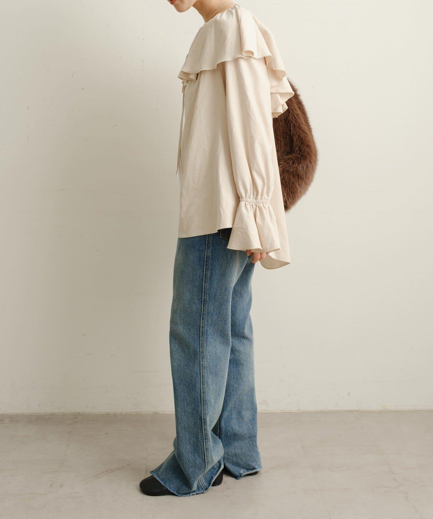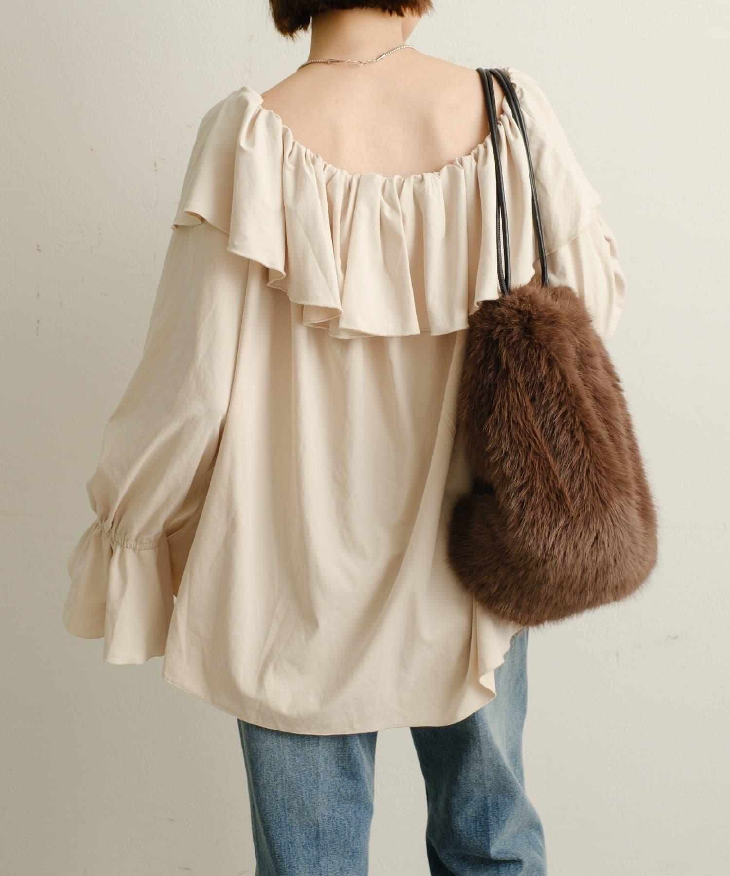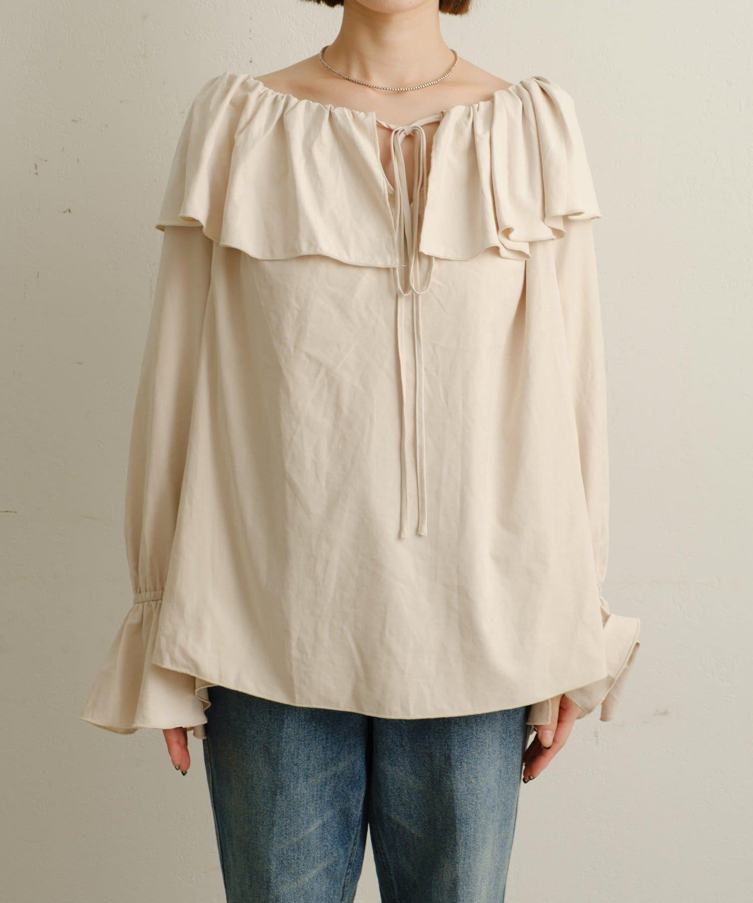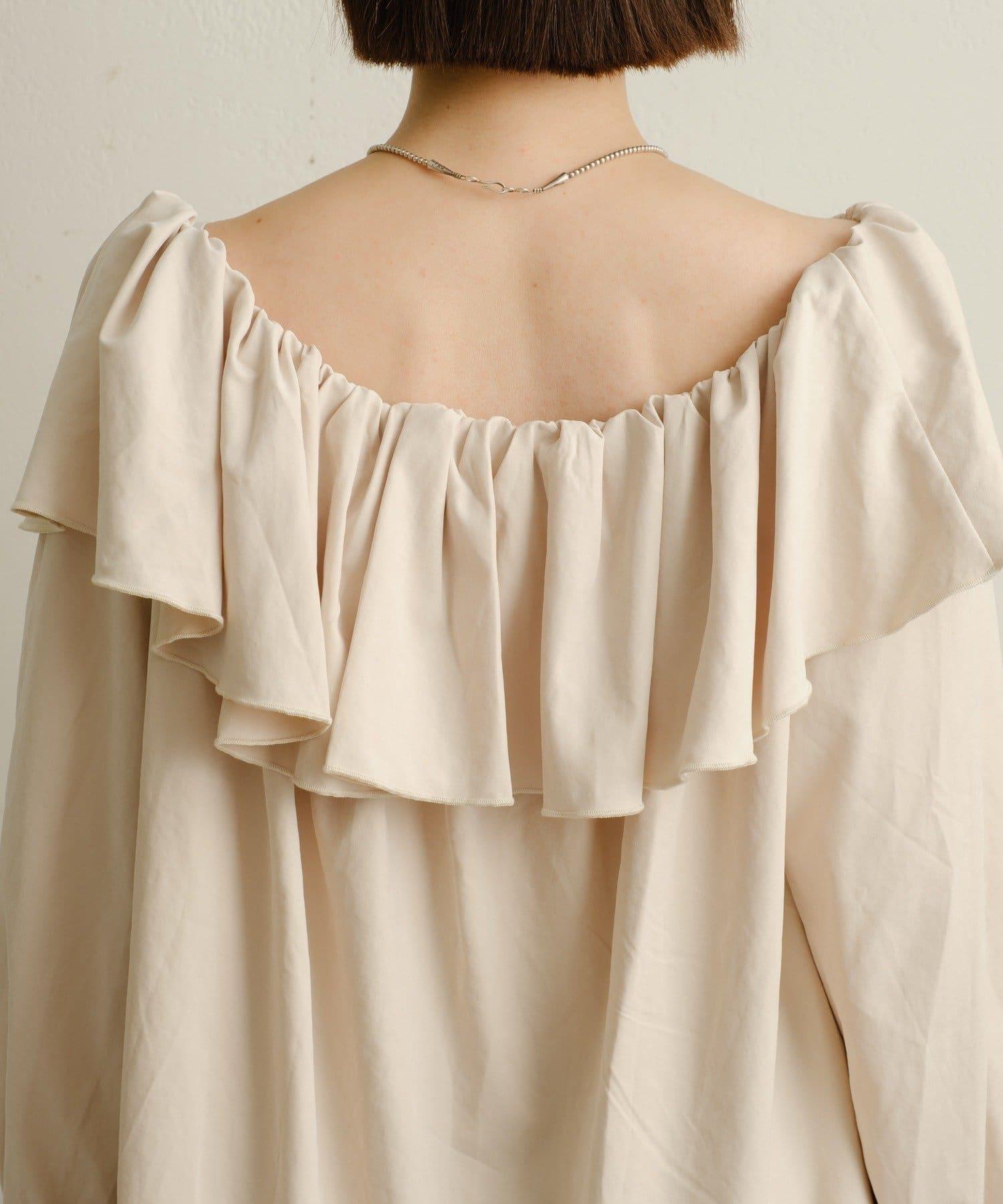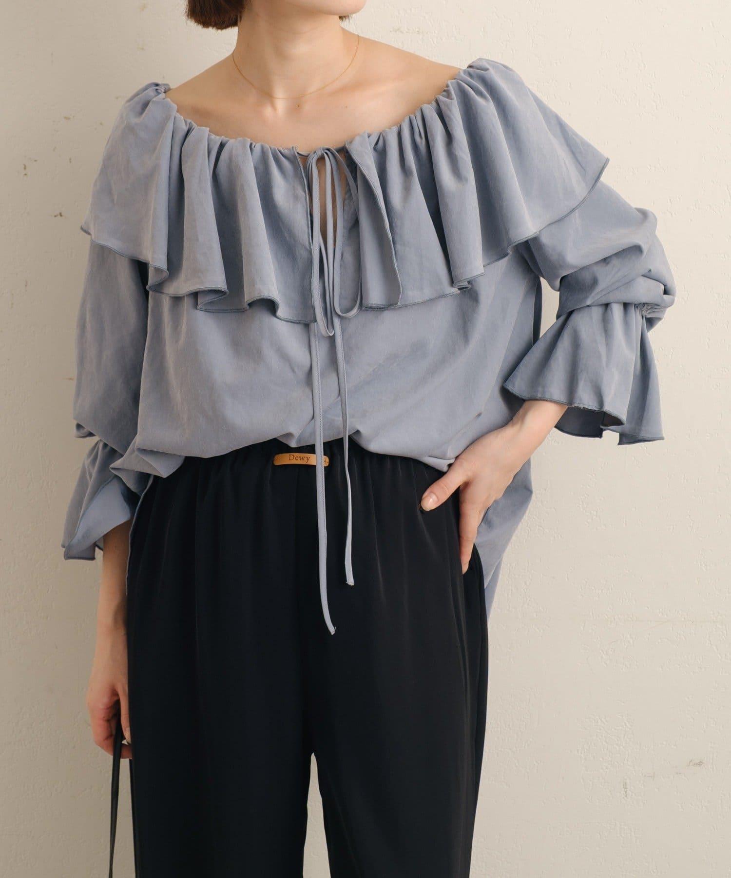 這款荷葉邊上衣的大荷葉邊設計,給人一種成熟可愛的感覺。