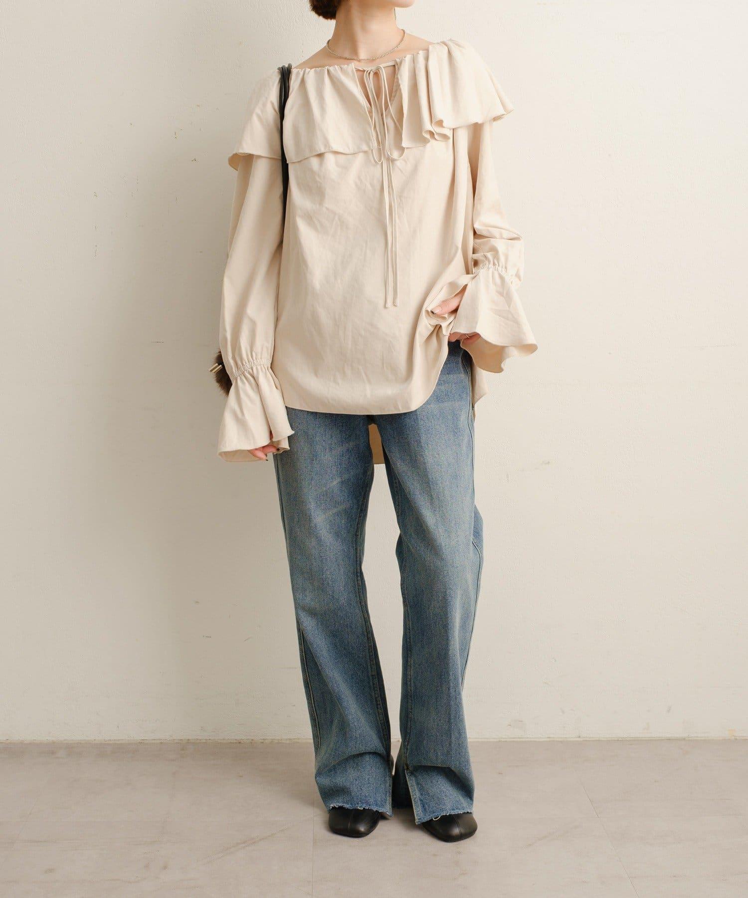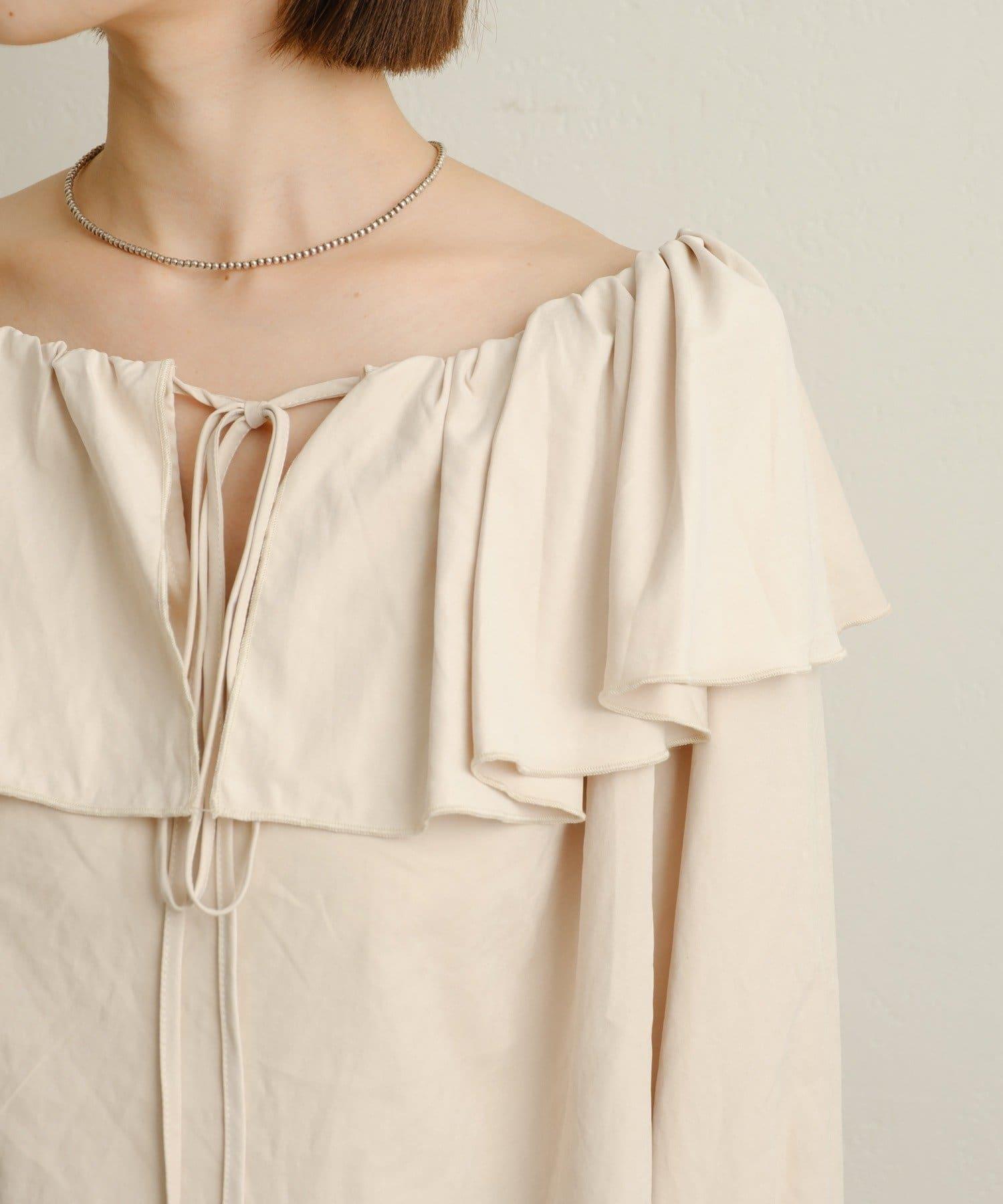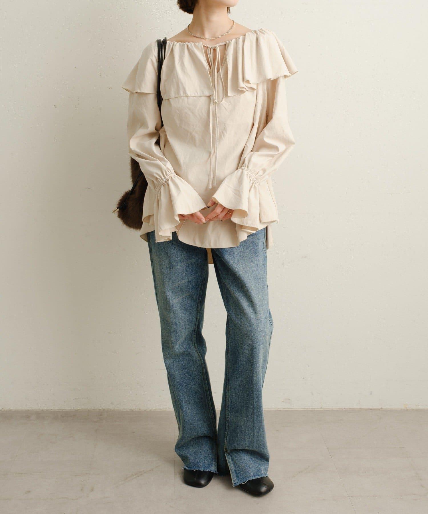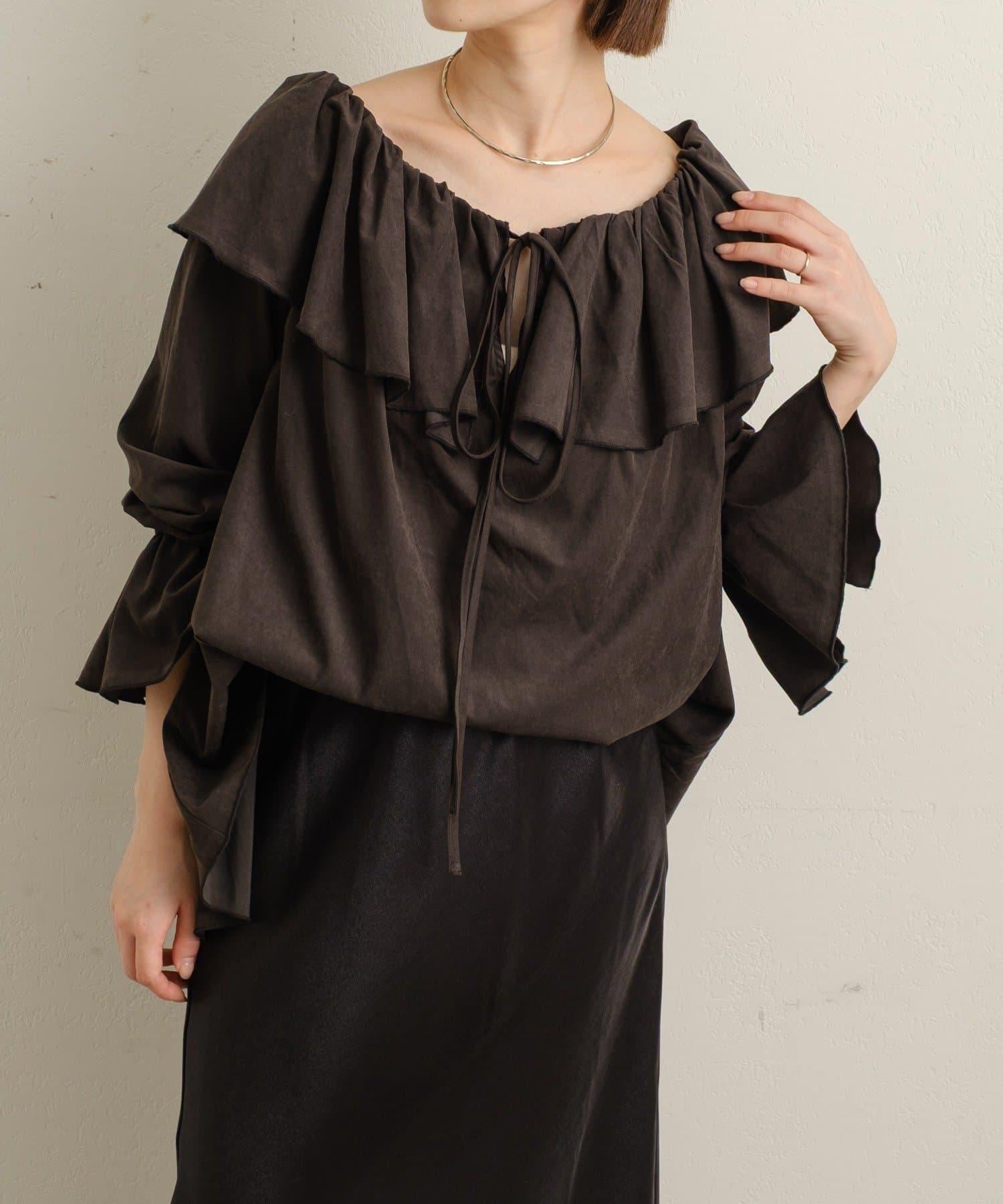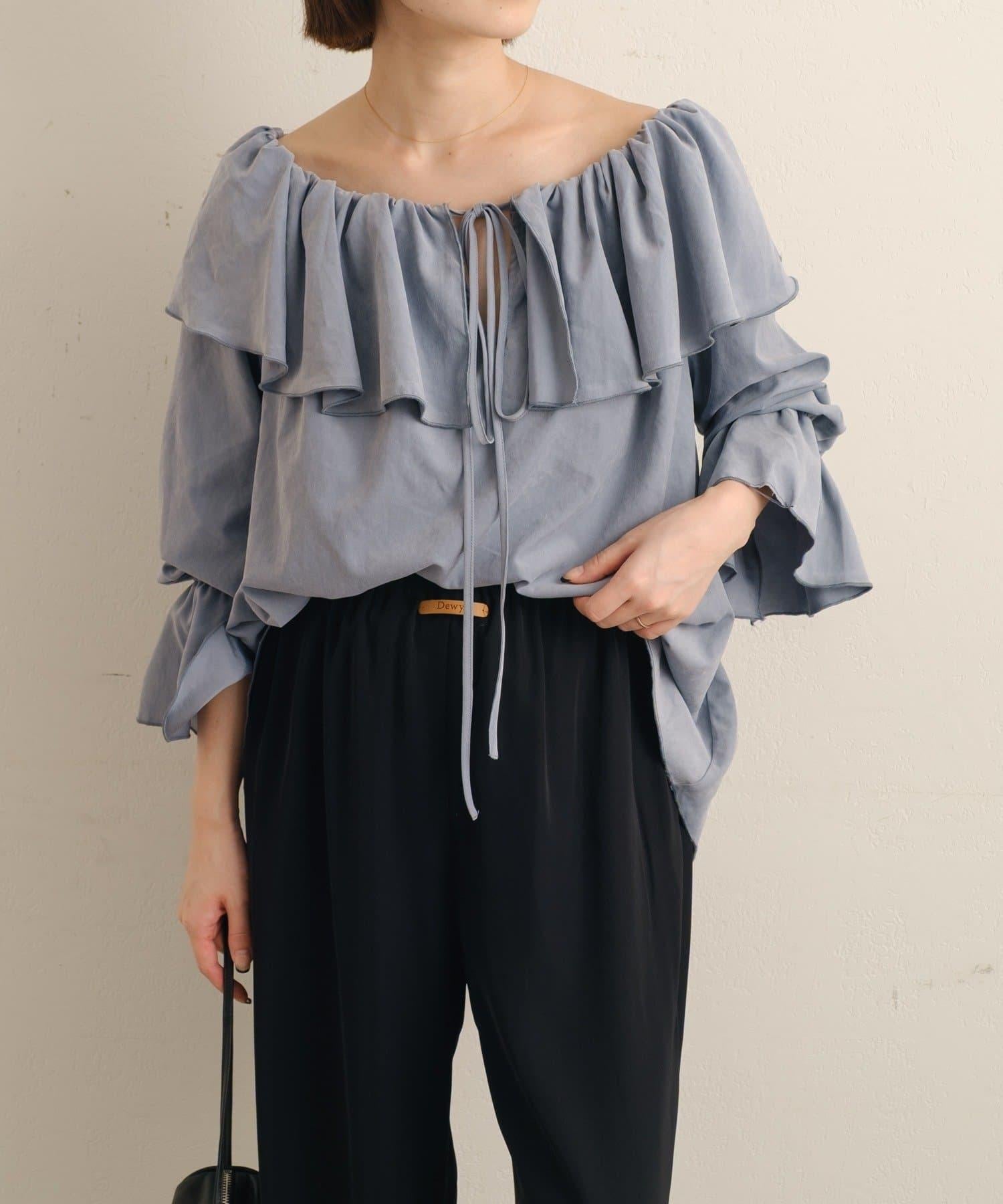這款荷葉邊上衣的大荷葉邊設計,給人一種成熟可愛的感覺。