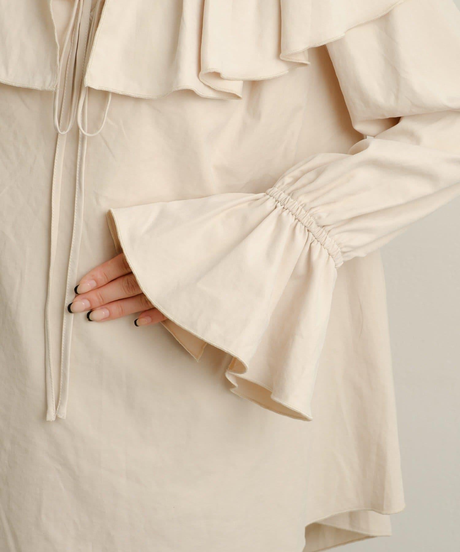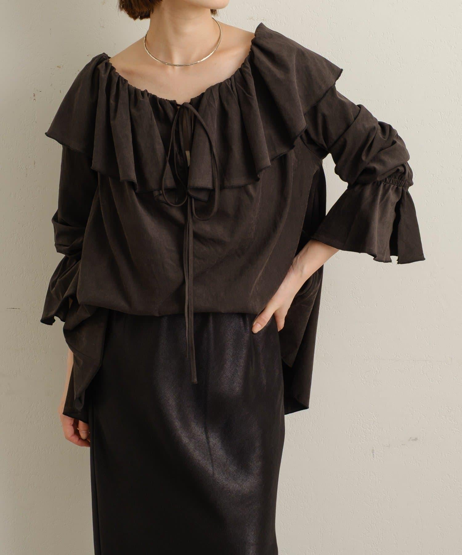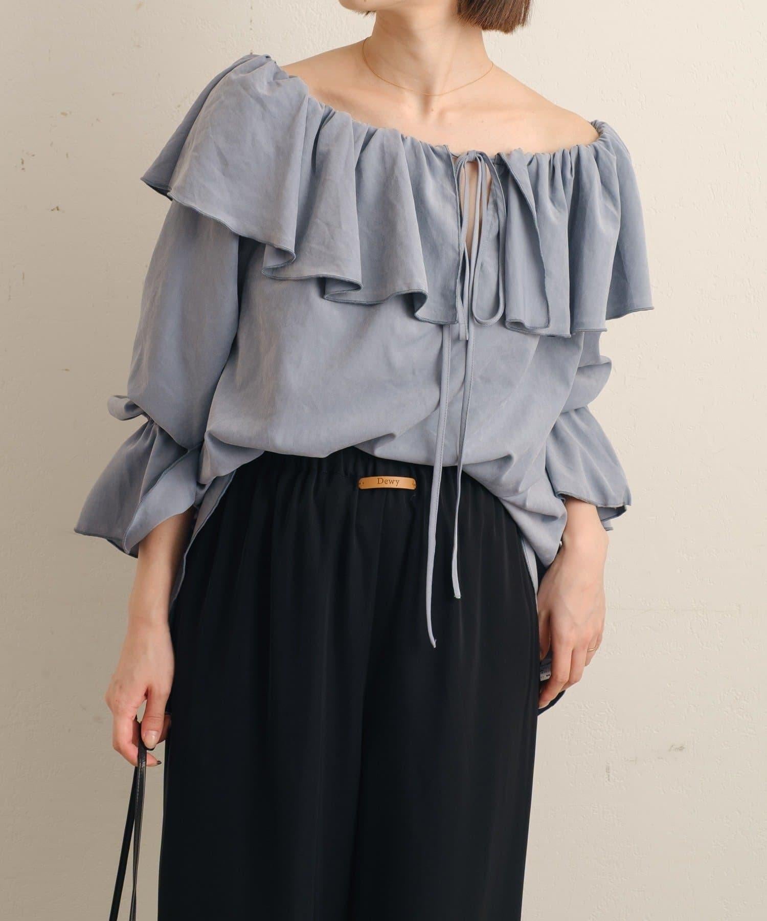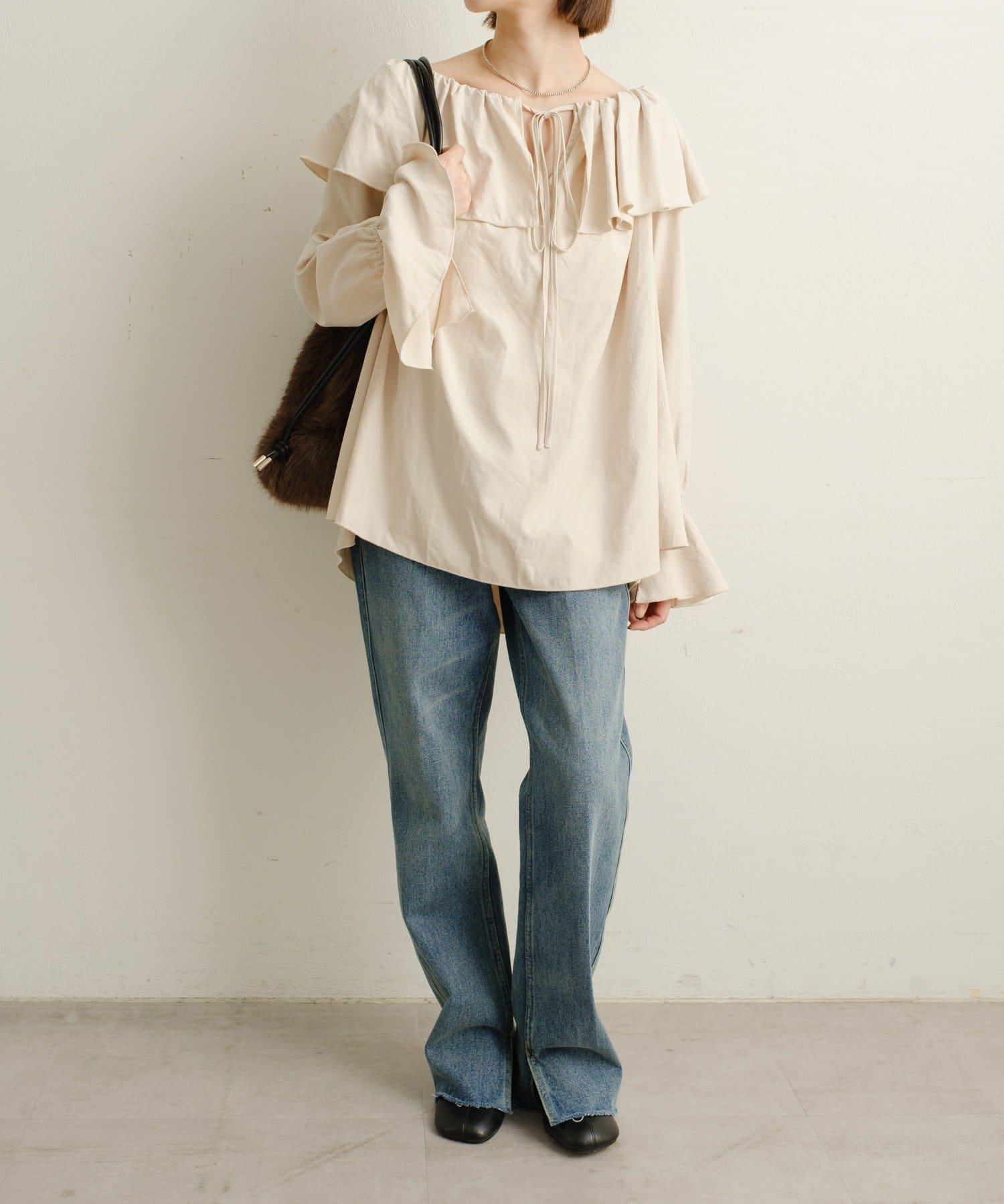 這款荷葉邊上衣的大荷葉邊設計,給人一種成熟可愛的感覺。