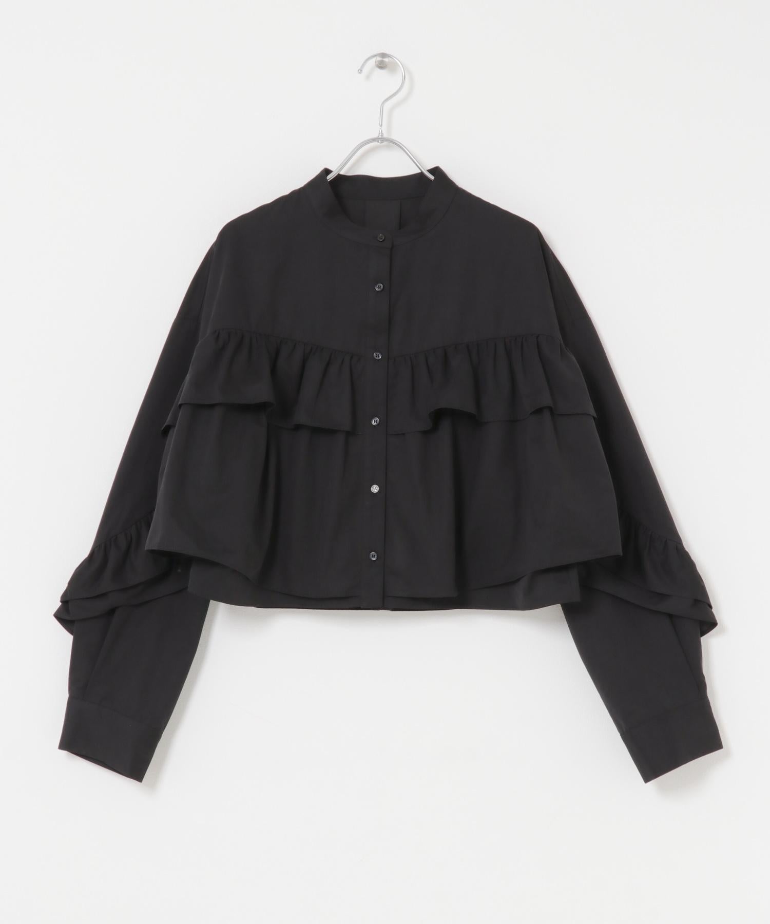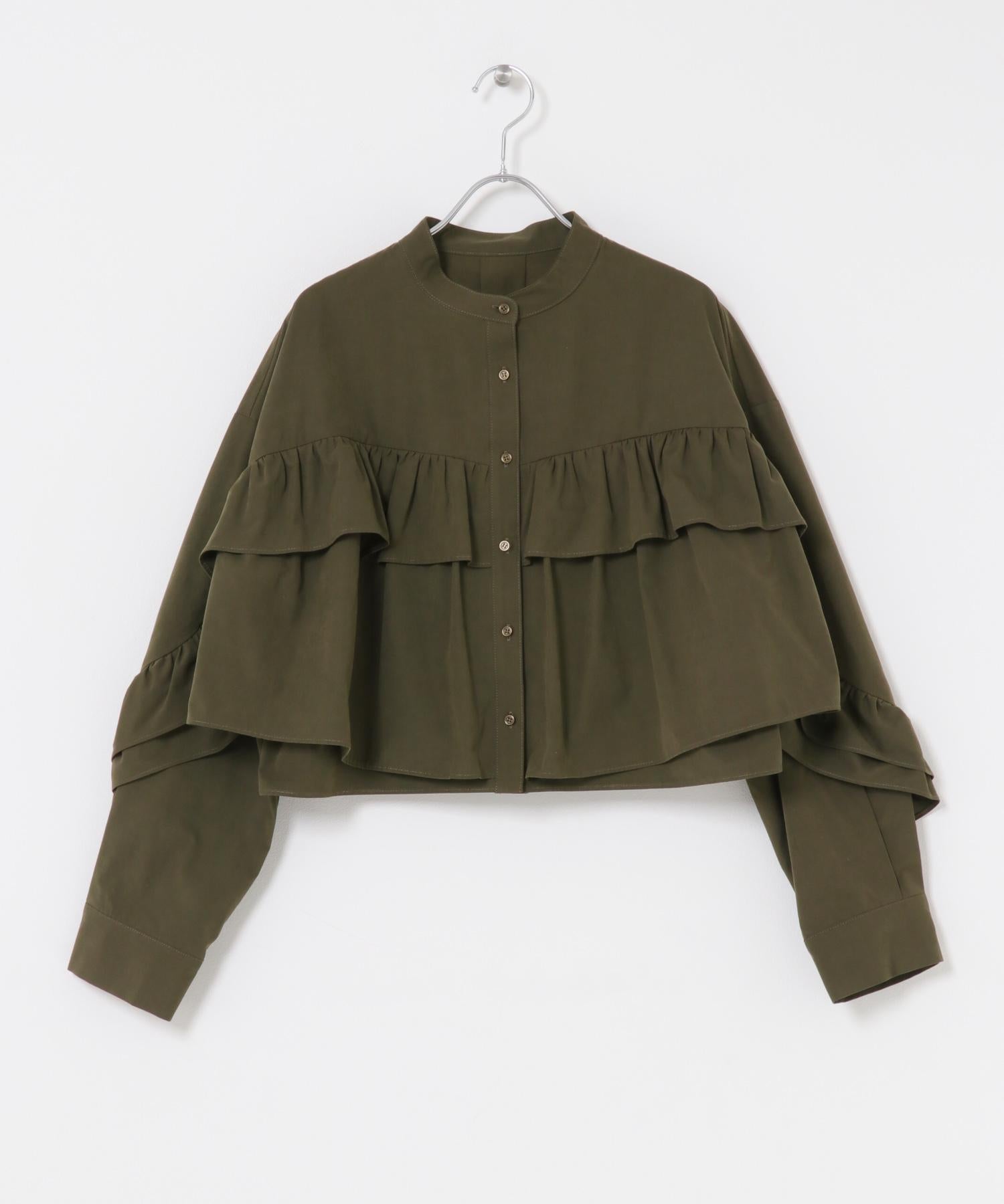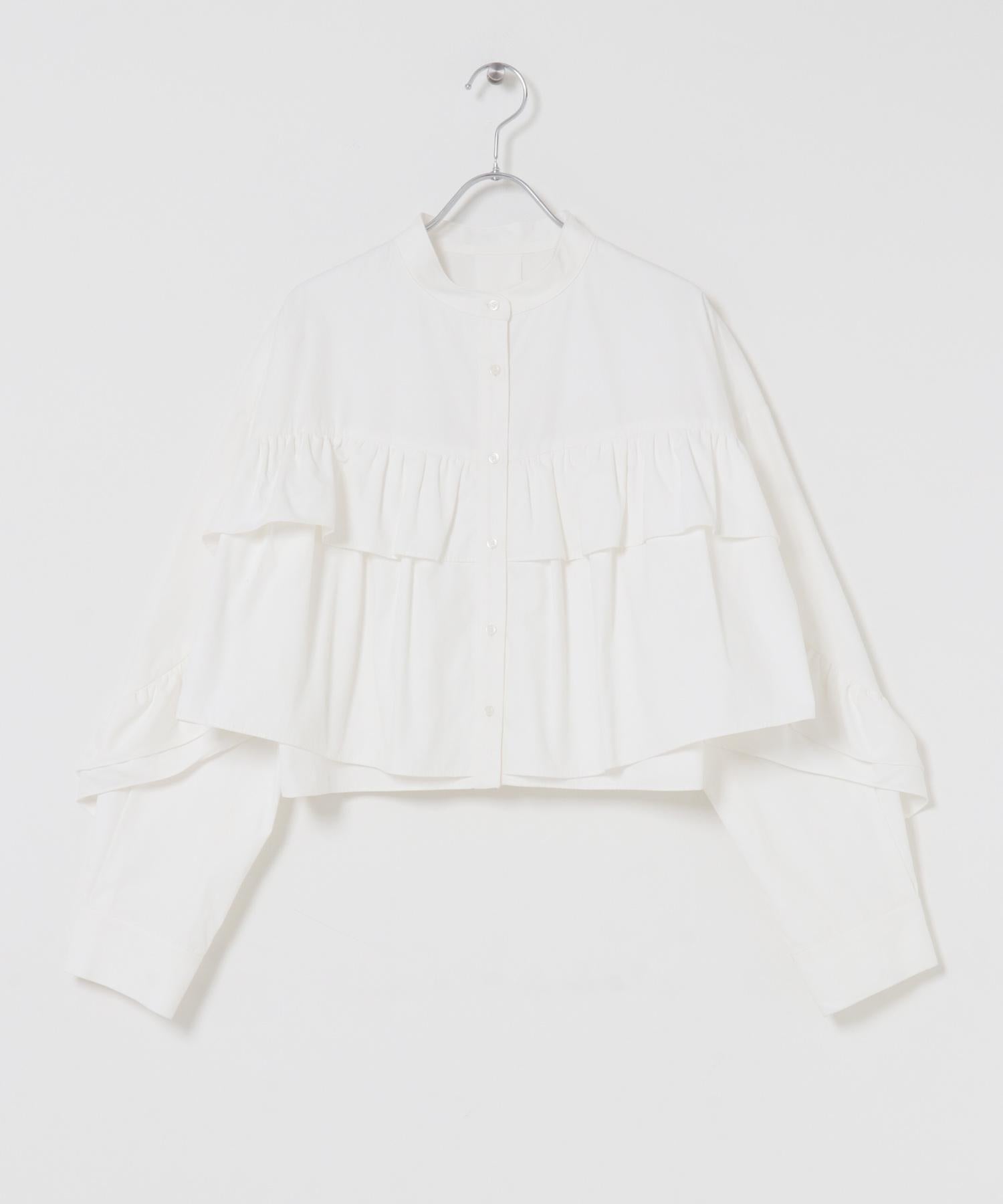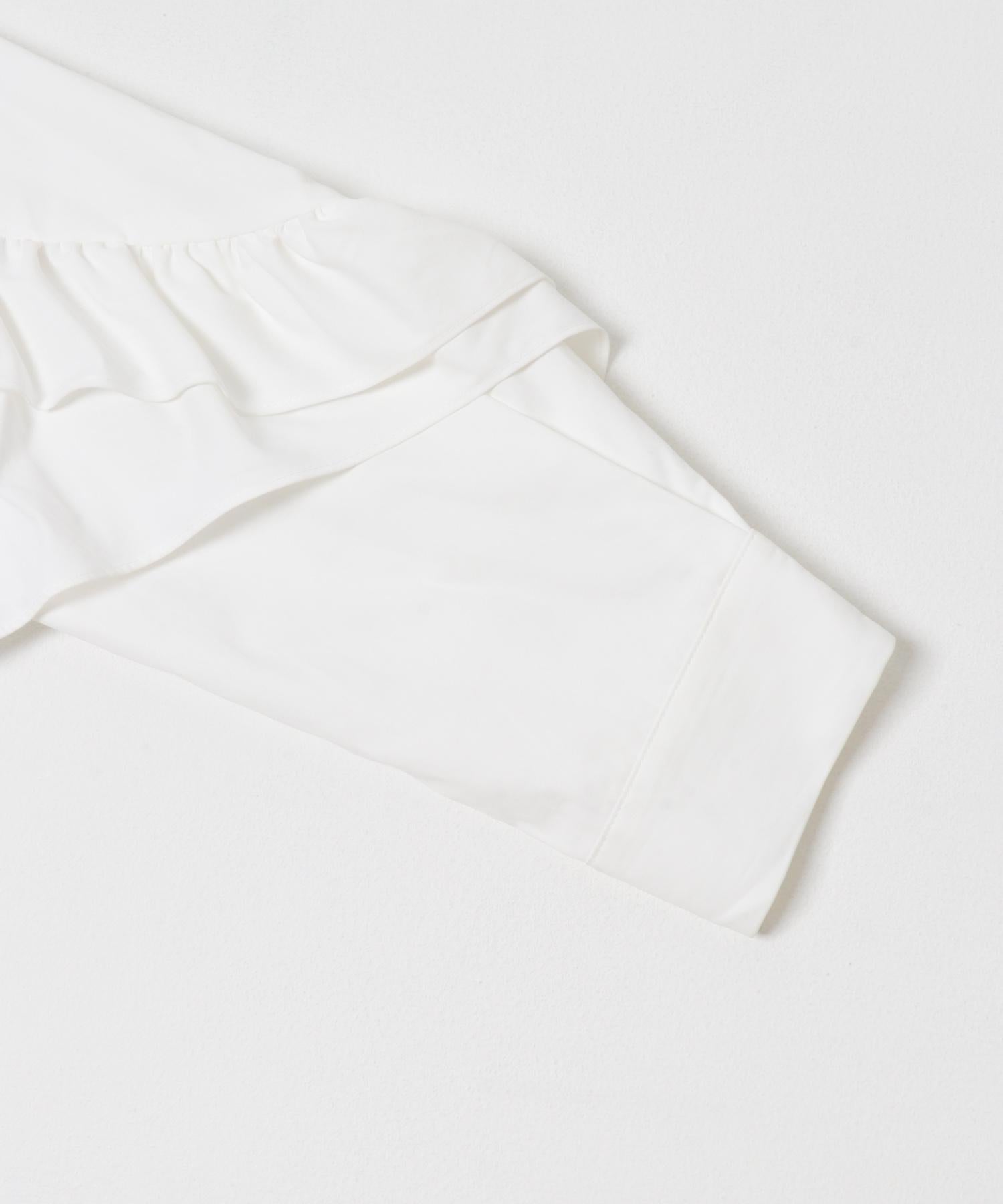 這款上衣採用表面微微凸起的面料製成。從衣袖到衣身的荷葉邊設計是一大亮點。上衣後部的下襬收起,長度緊湊。