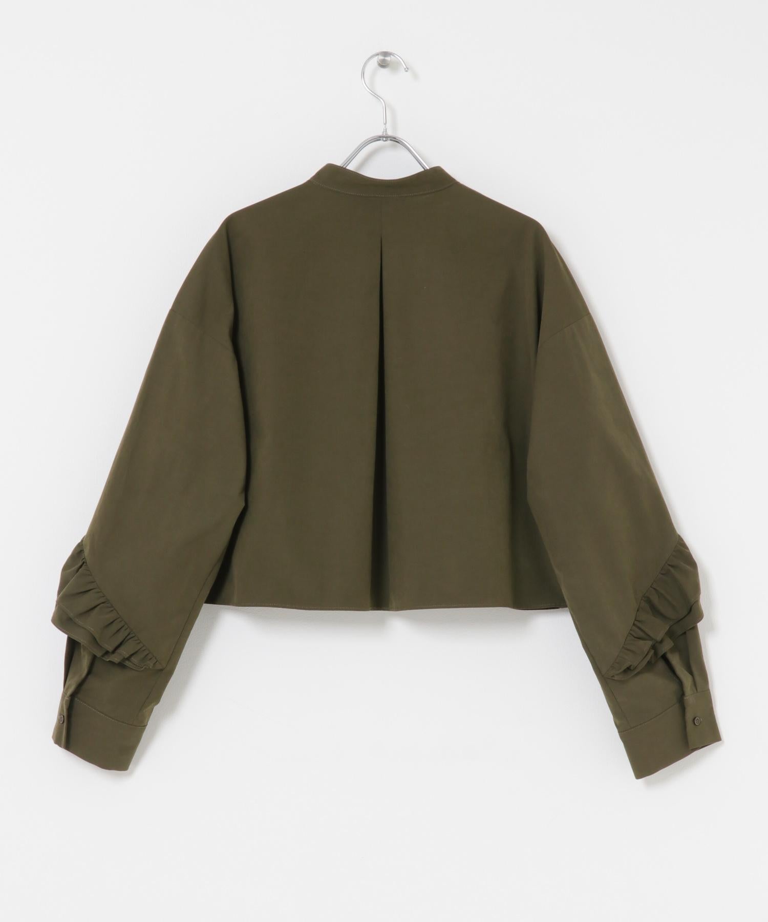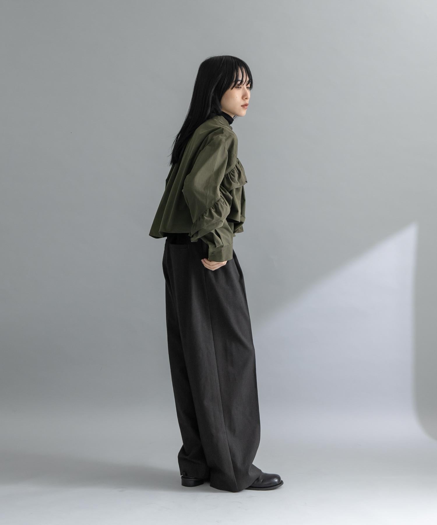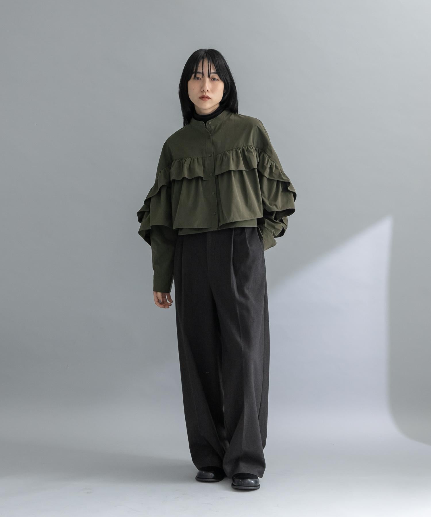 這款上衣採用表面微微凸起的面料製成。從衣袖到衣身的荷葉邊設計是一大亮點。上衣後部的下襬收起,長度緊湊。