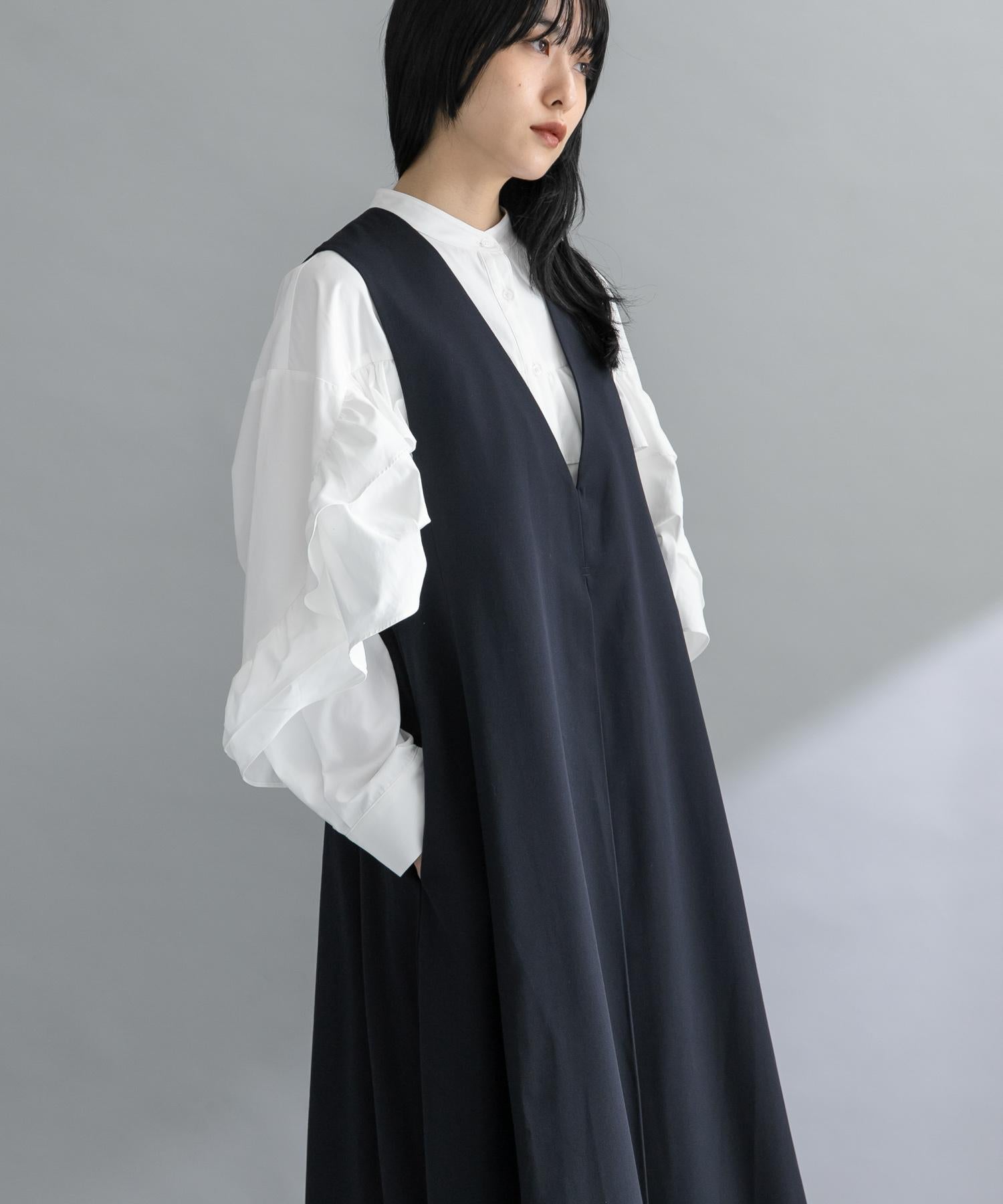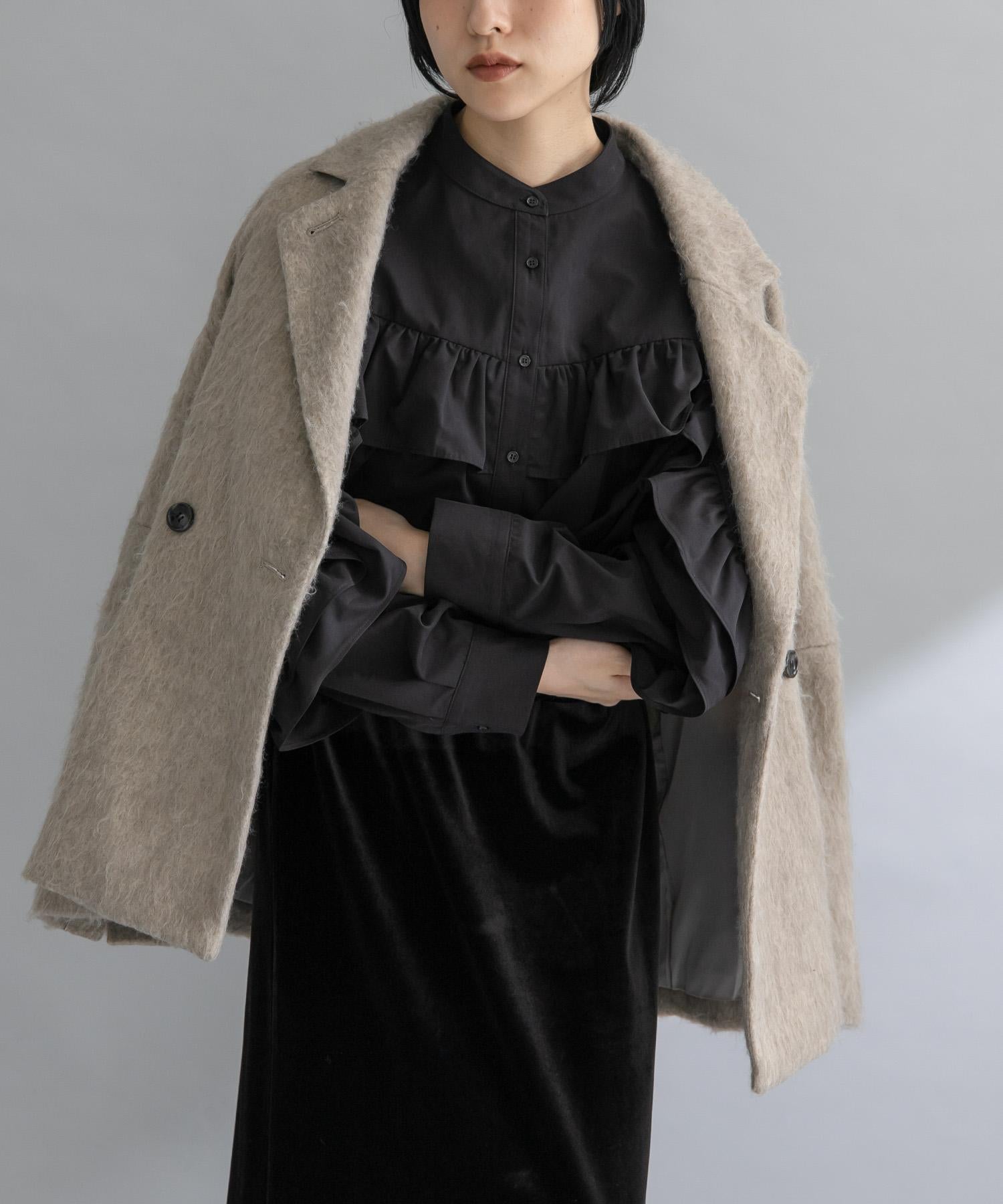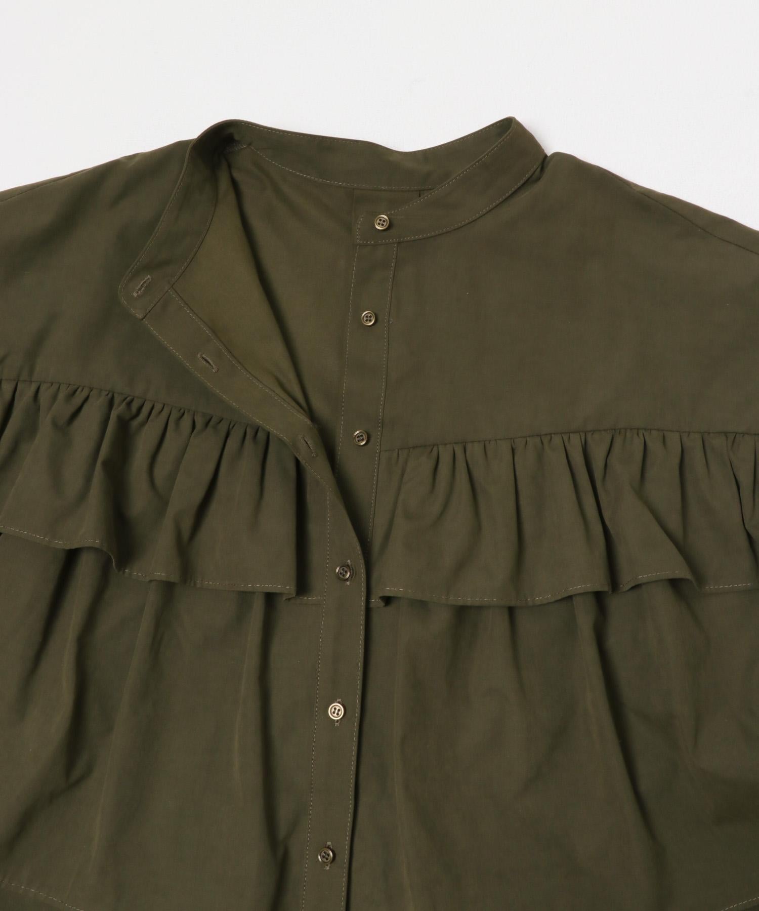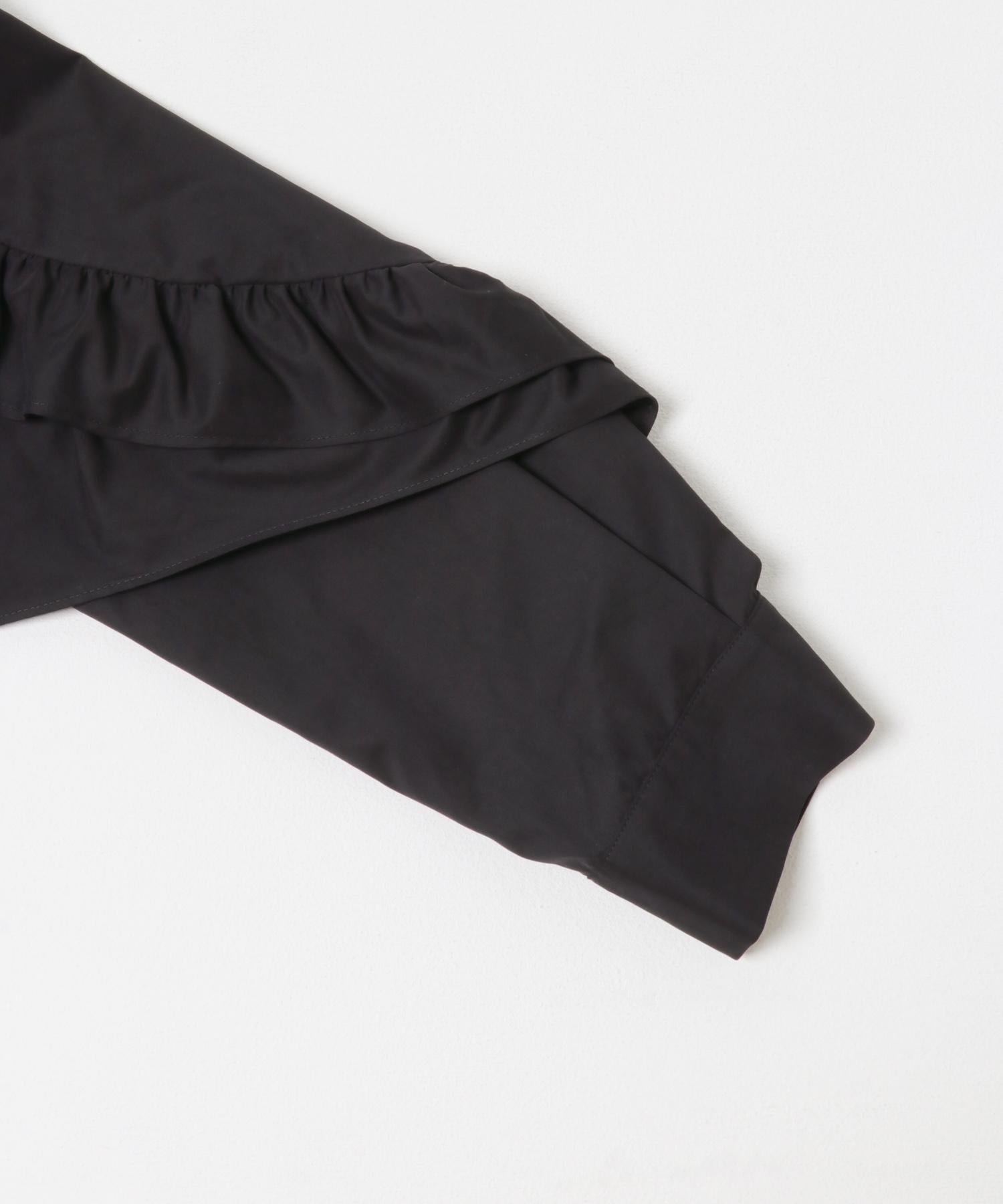 這款上衣採用表面微微凸起的面料製成。從衣袖到衣身的荷葉邊設計是一大亮點。上衣後部的下襬收起,長度緊湊。