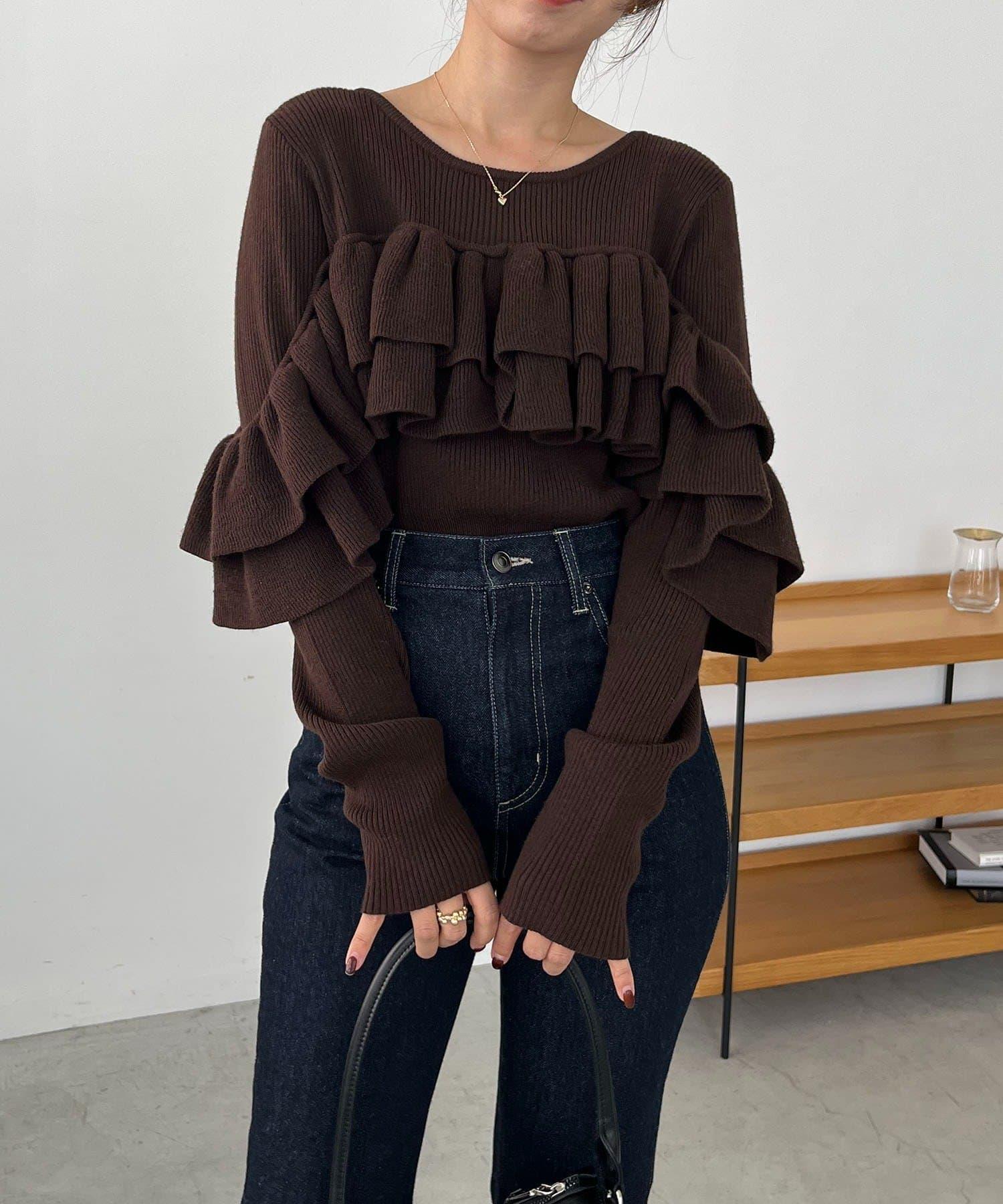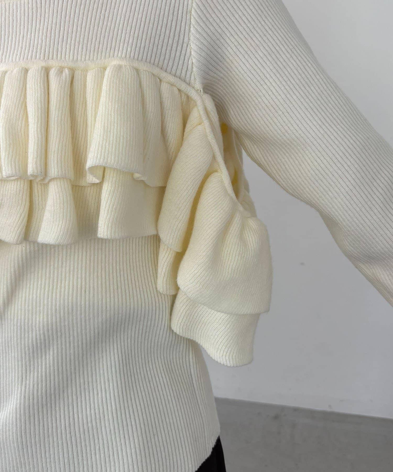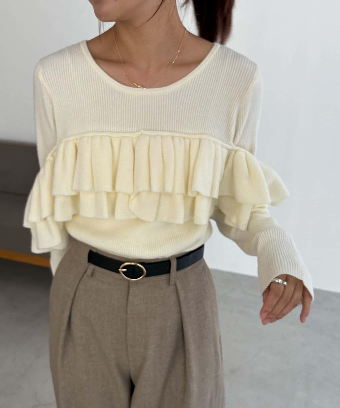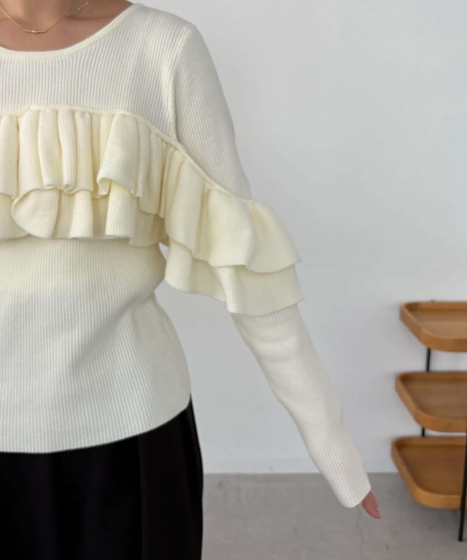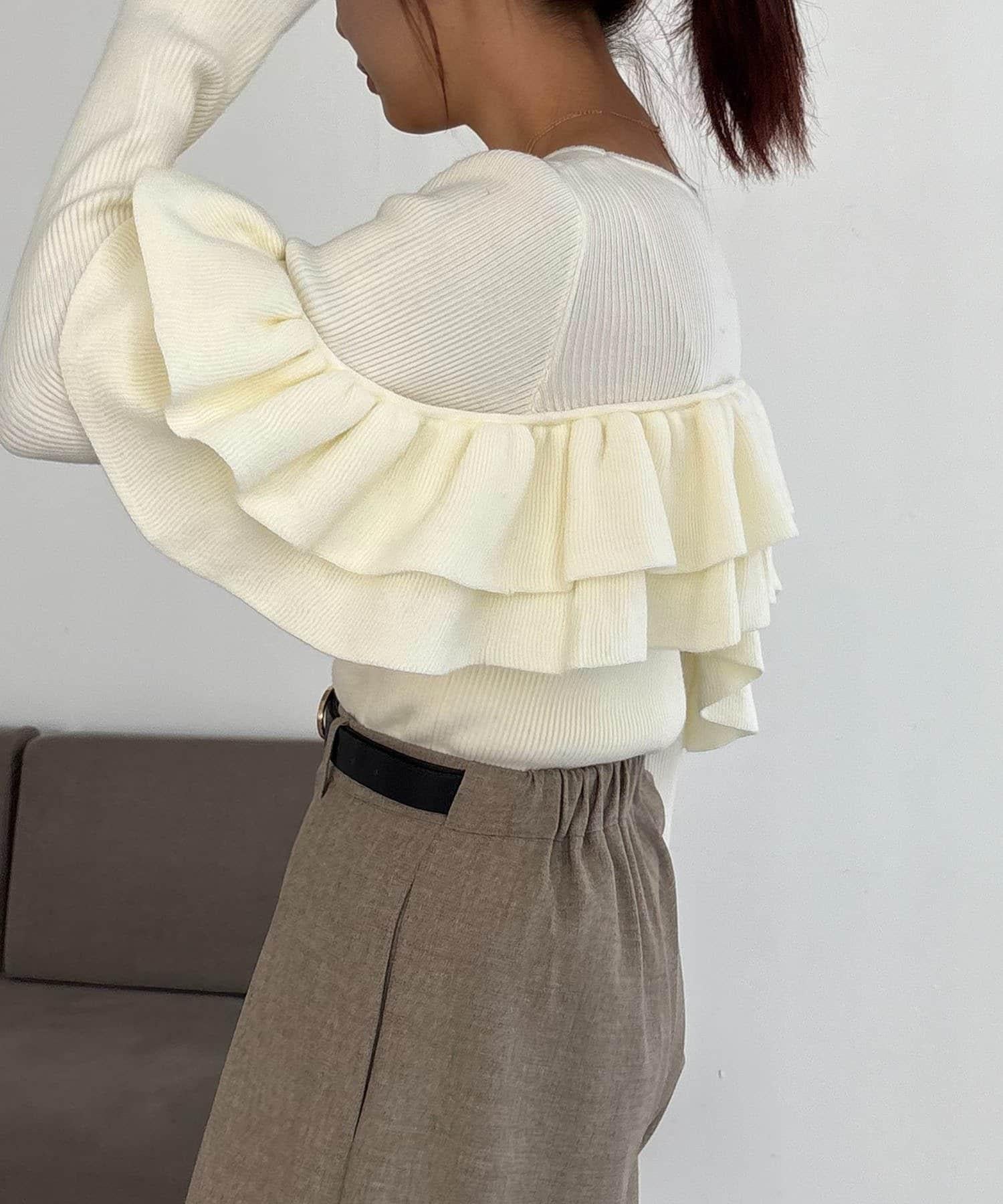 帶有荷葉邊的針織衫,設計嫵媚動人。