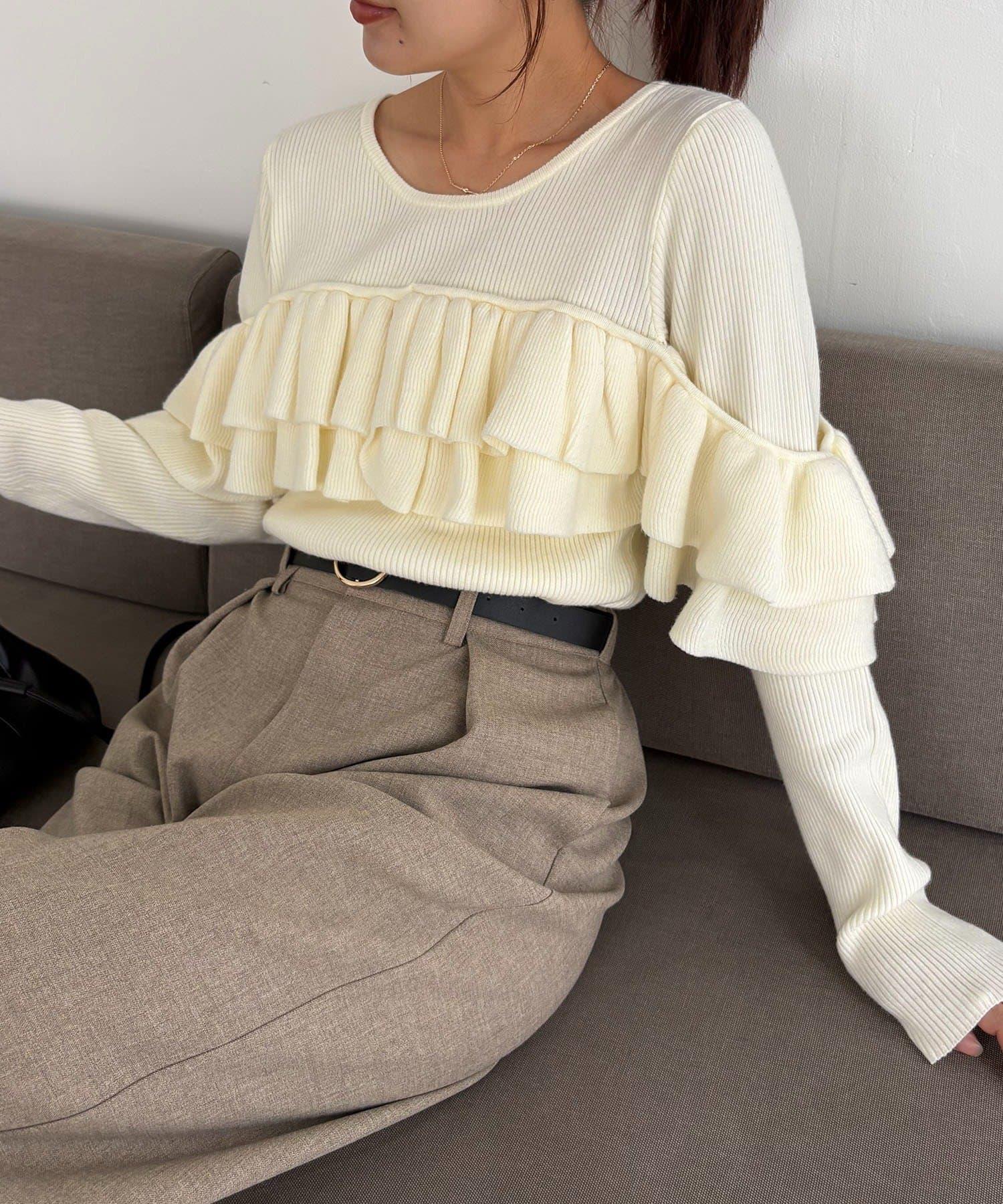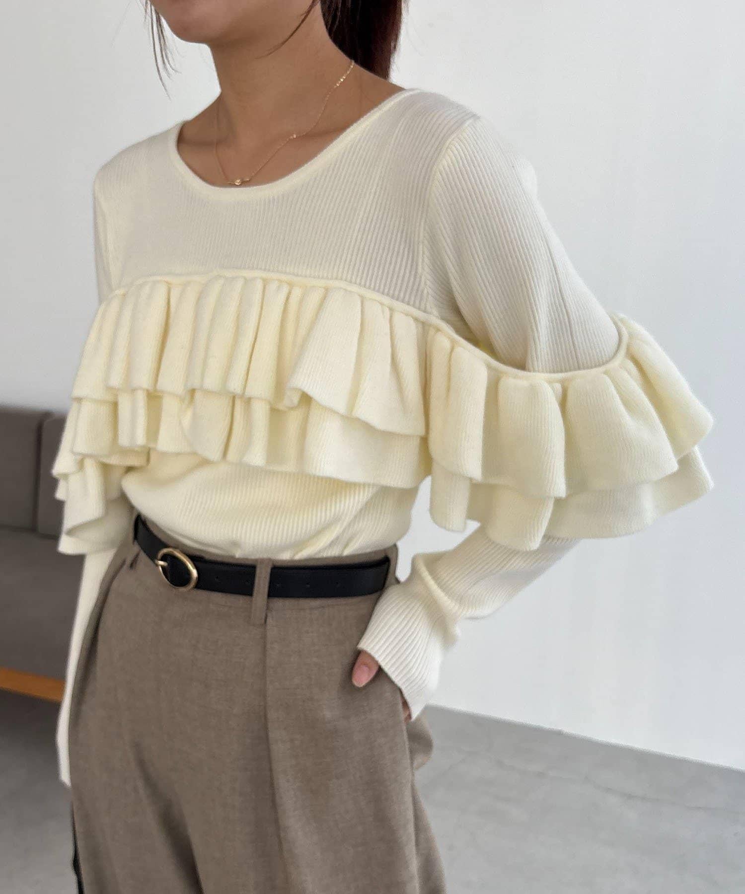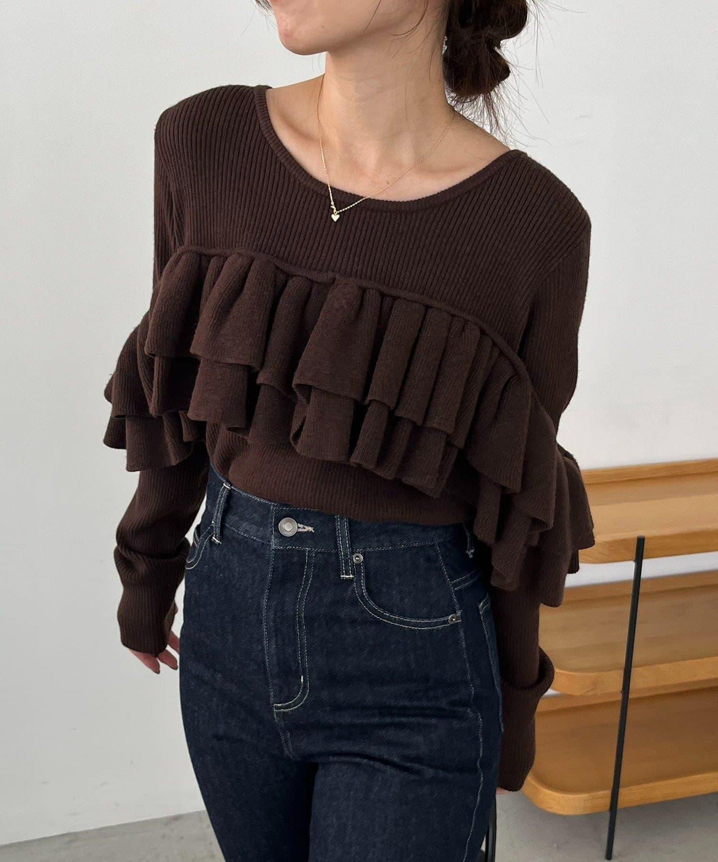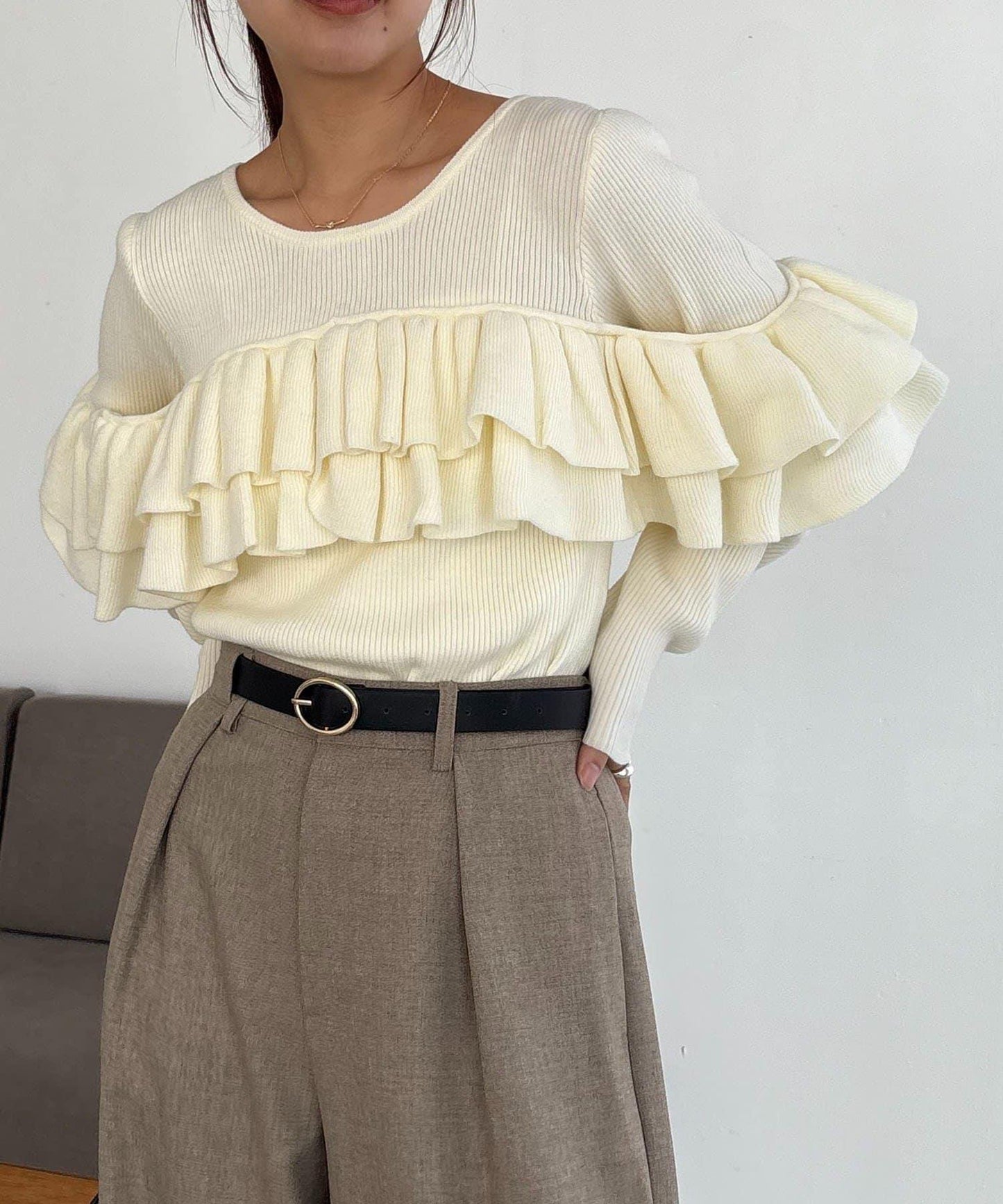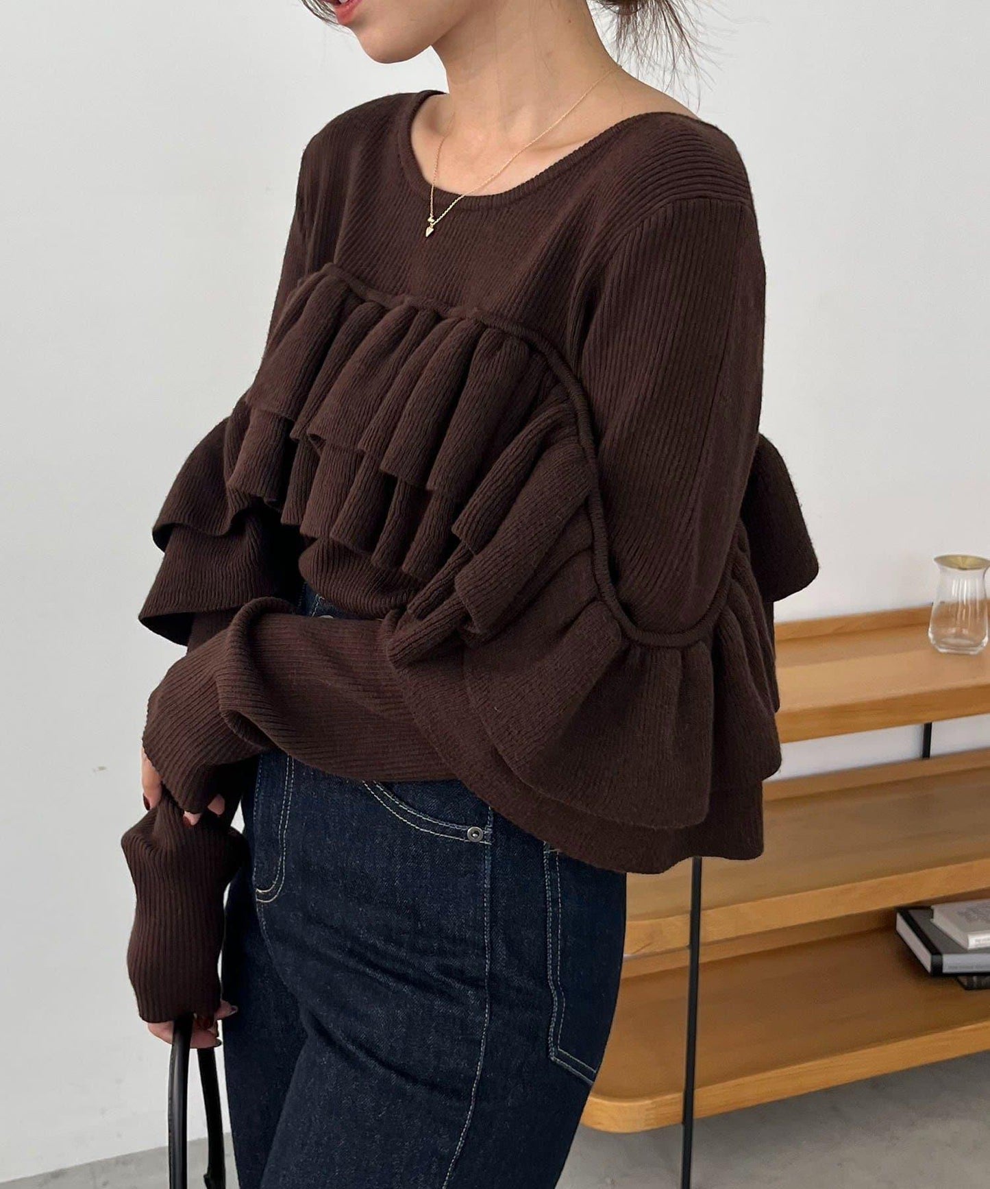 帶有荷葉邊的針織衫,設計嫵媚動人。