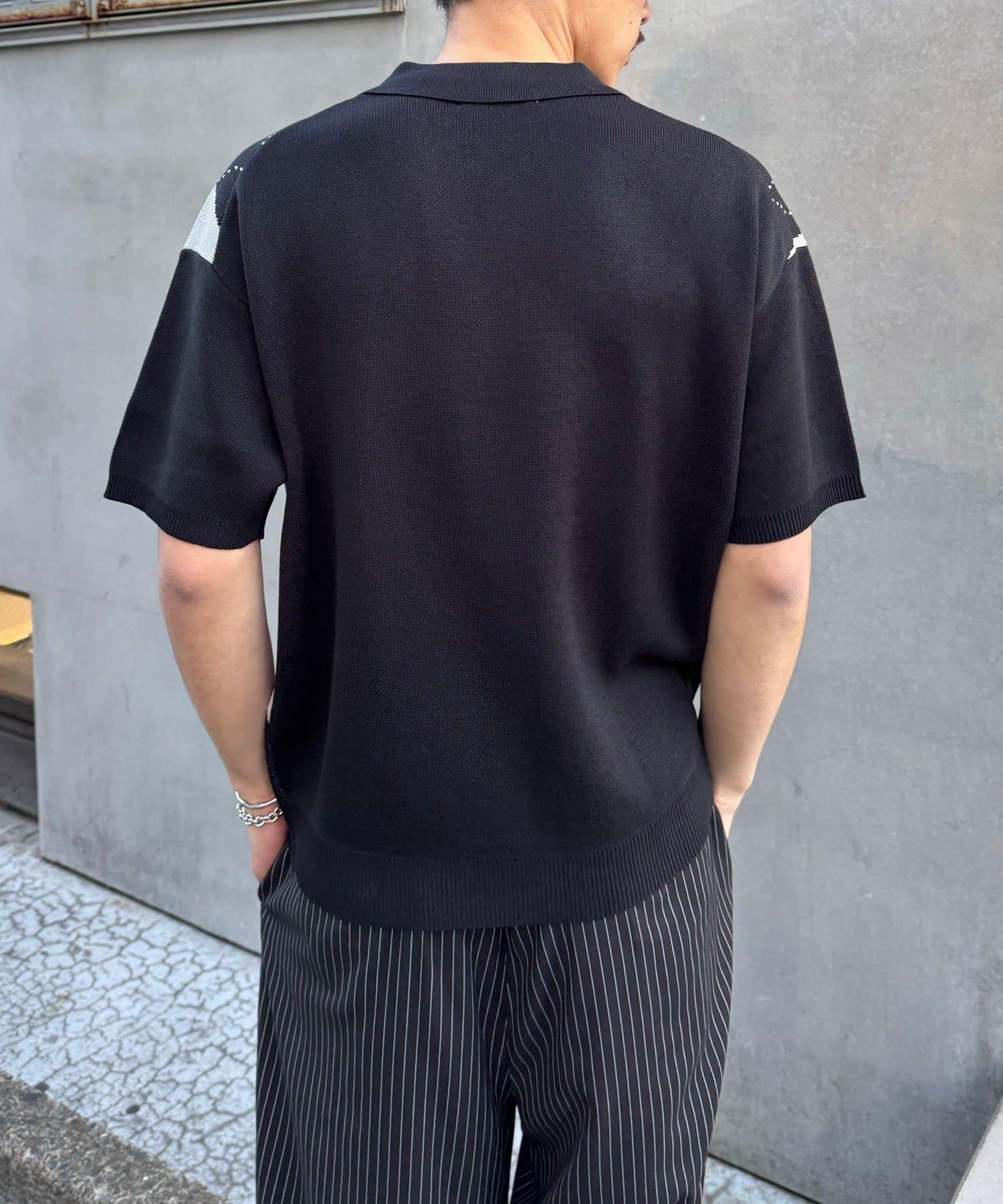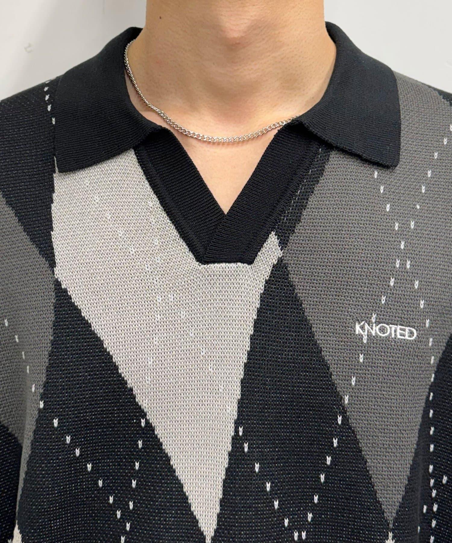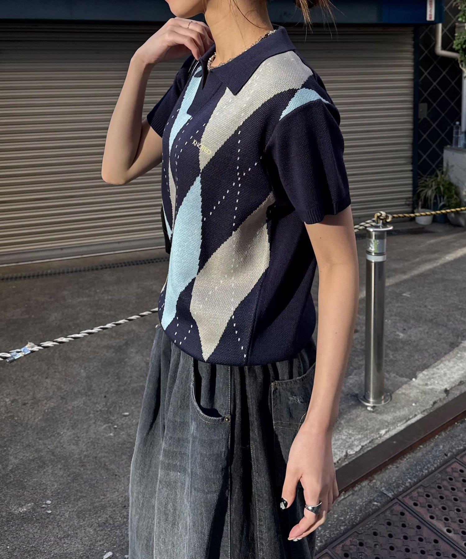 半袖夏季針織馬球衫,提花編織的大方格圖案。