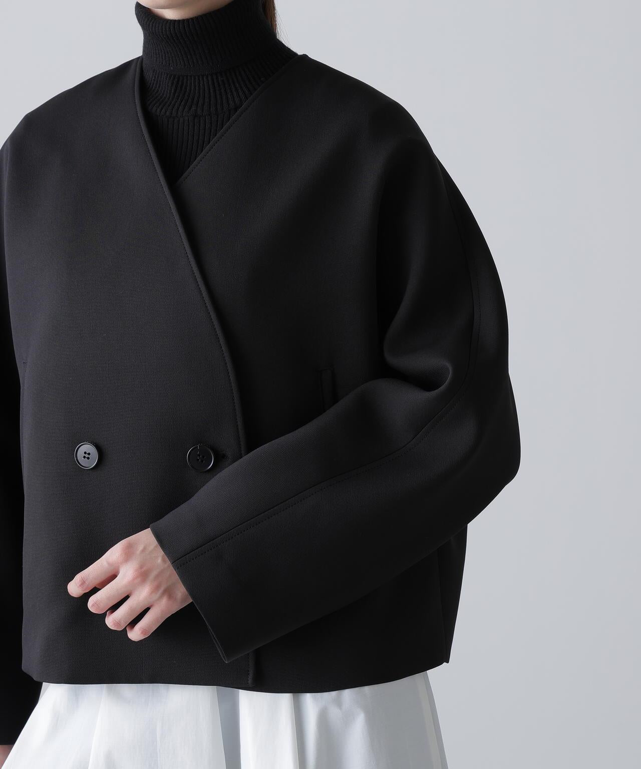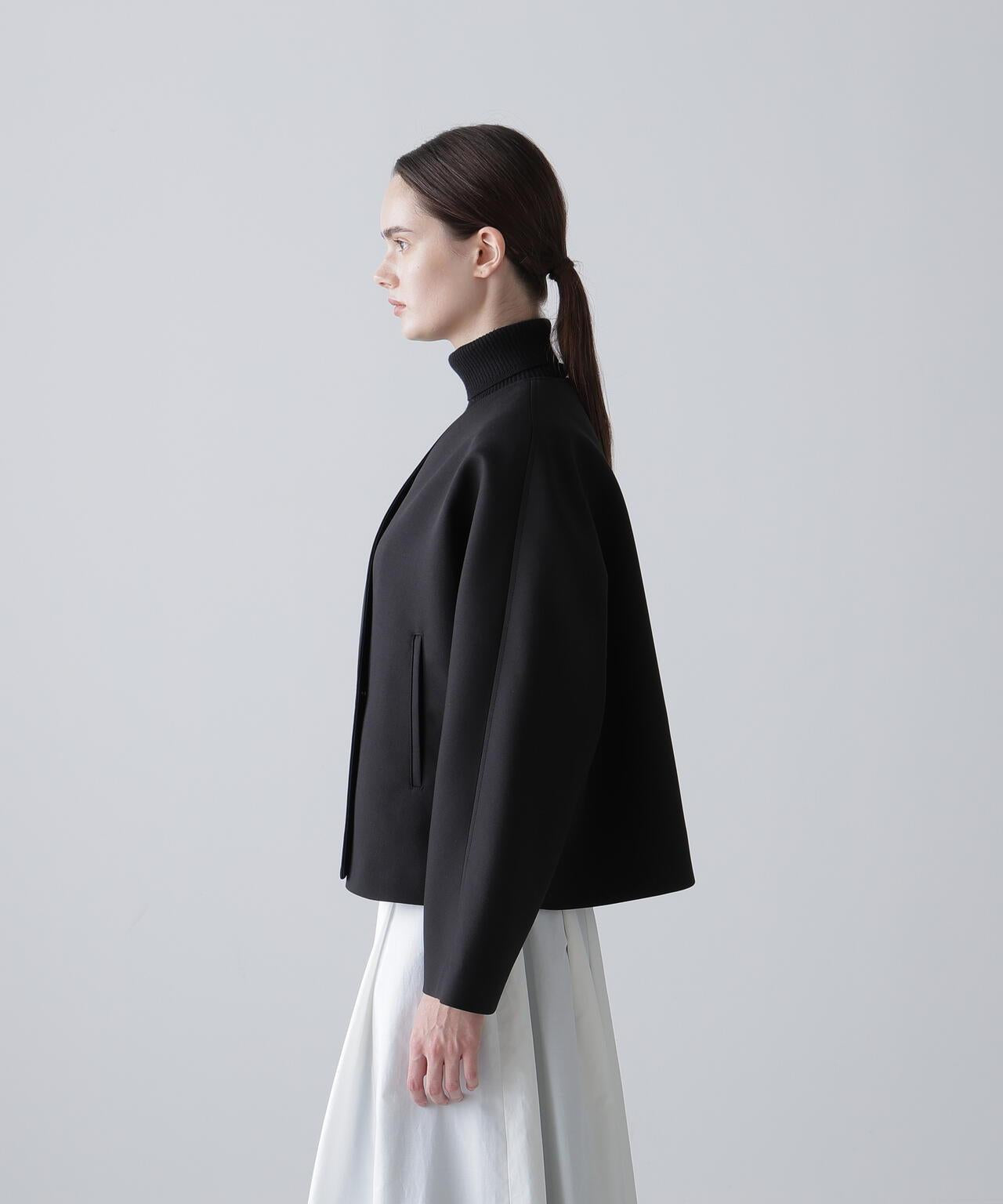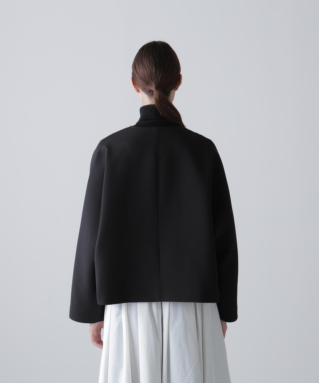Matrasse 三層布質無領夾克,具有獨特的彈力這款雙層無領夾克由合成材料製成,具有良好的厚度和獨特的彈力。蝙蝠袖從衣身延伸開來,為這款多功能夾克勾勒出優美的肩部線條。面料由膨鬆的聚酯加工紗線製成,採用三層編織工藝,使面料具有柔軟而獨特的緊繃感。
