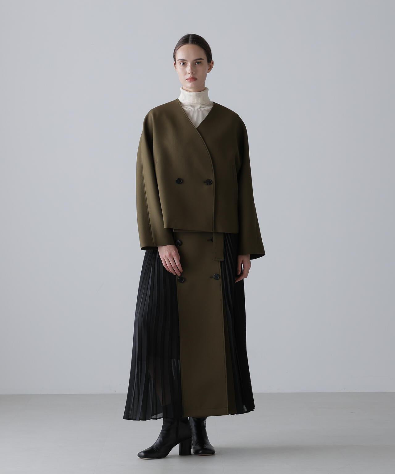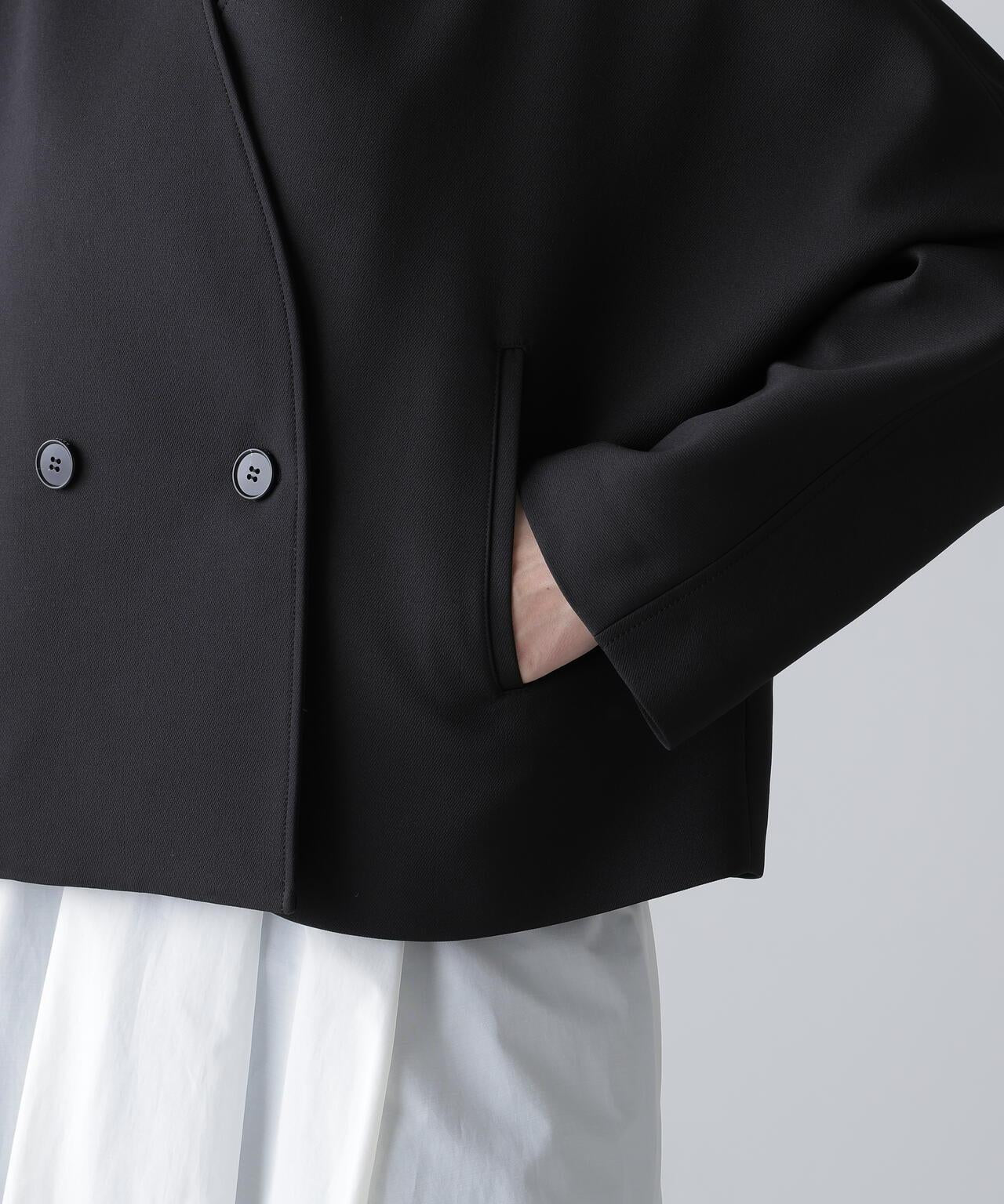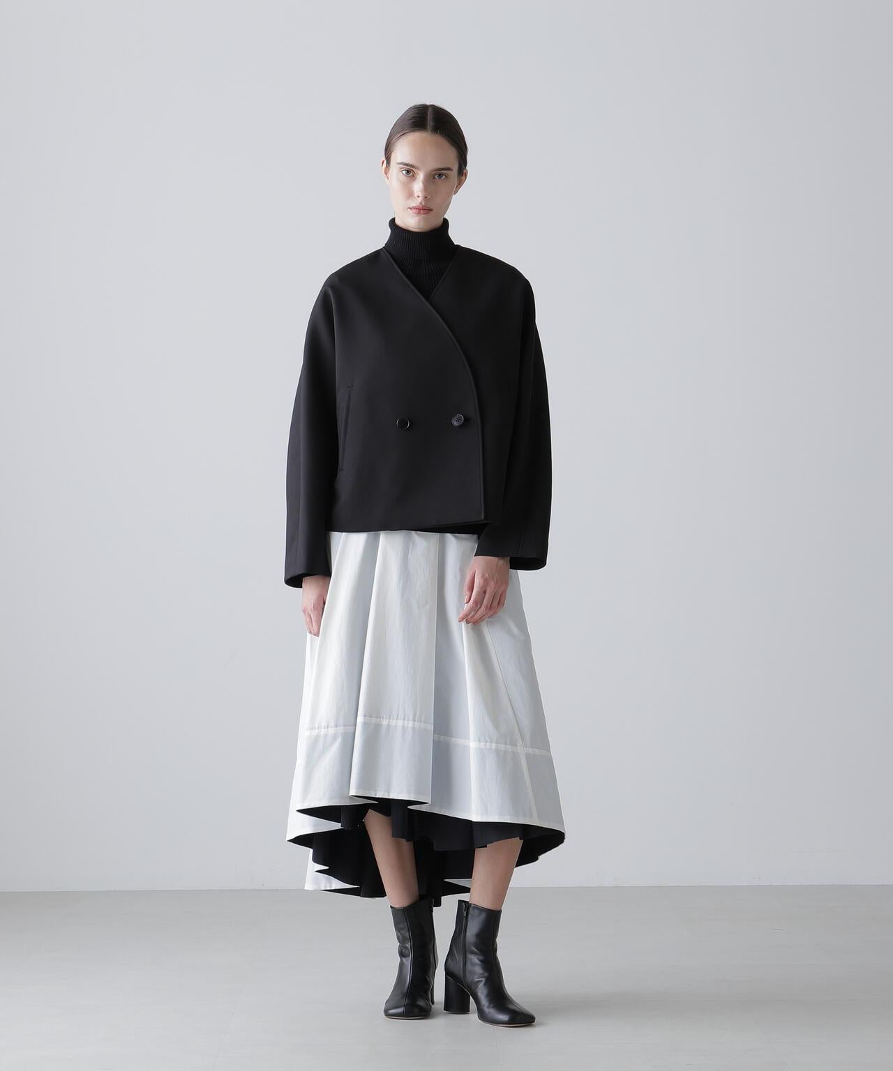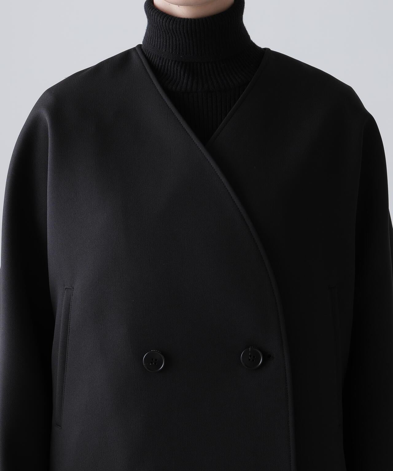 Matrasse 三層布質無領夾克,具有獨特的彈力這款雙層無領夾克由合成材料製成,具有良好的厚度和獨特的彈力。蝙蝠袖從衣身延伸開來,為這款多功能夾克勾勒出優美的肩部線條。面料由膨鬆的聚酯加工紗線製成,採用三層編織工藝,使面料具有柔軟而獨特的緊繃感。