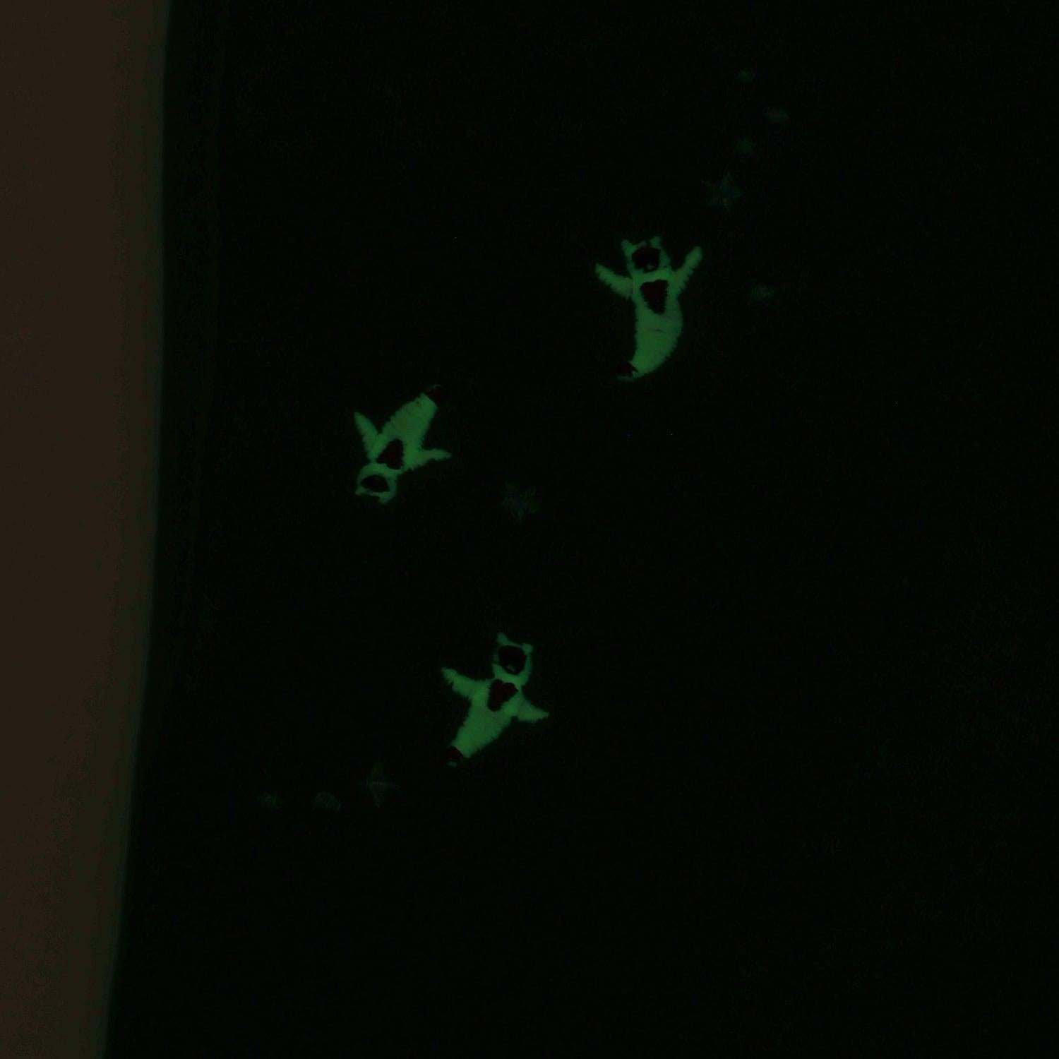 刺繡使用了蓄光線,使動物在黑暗中發光。