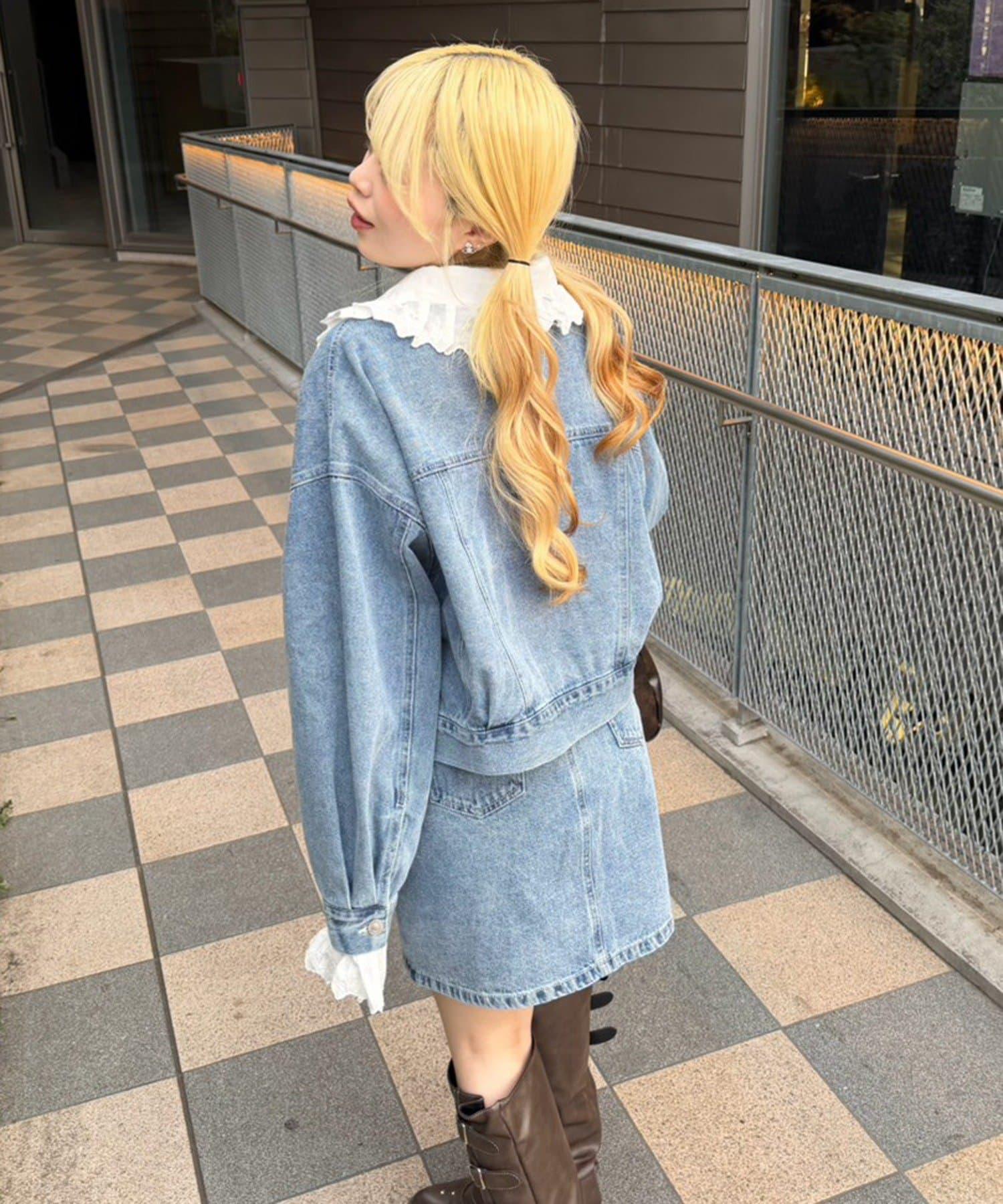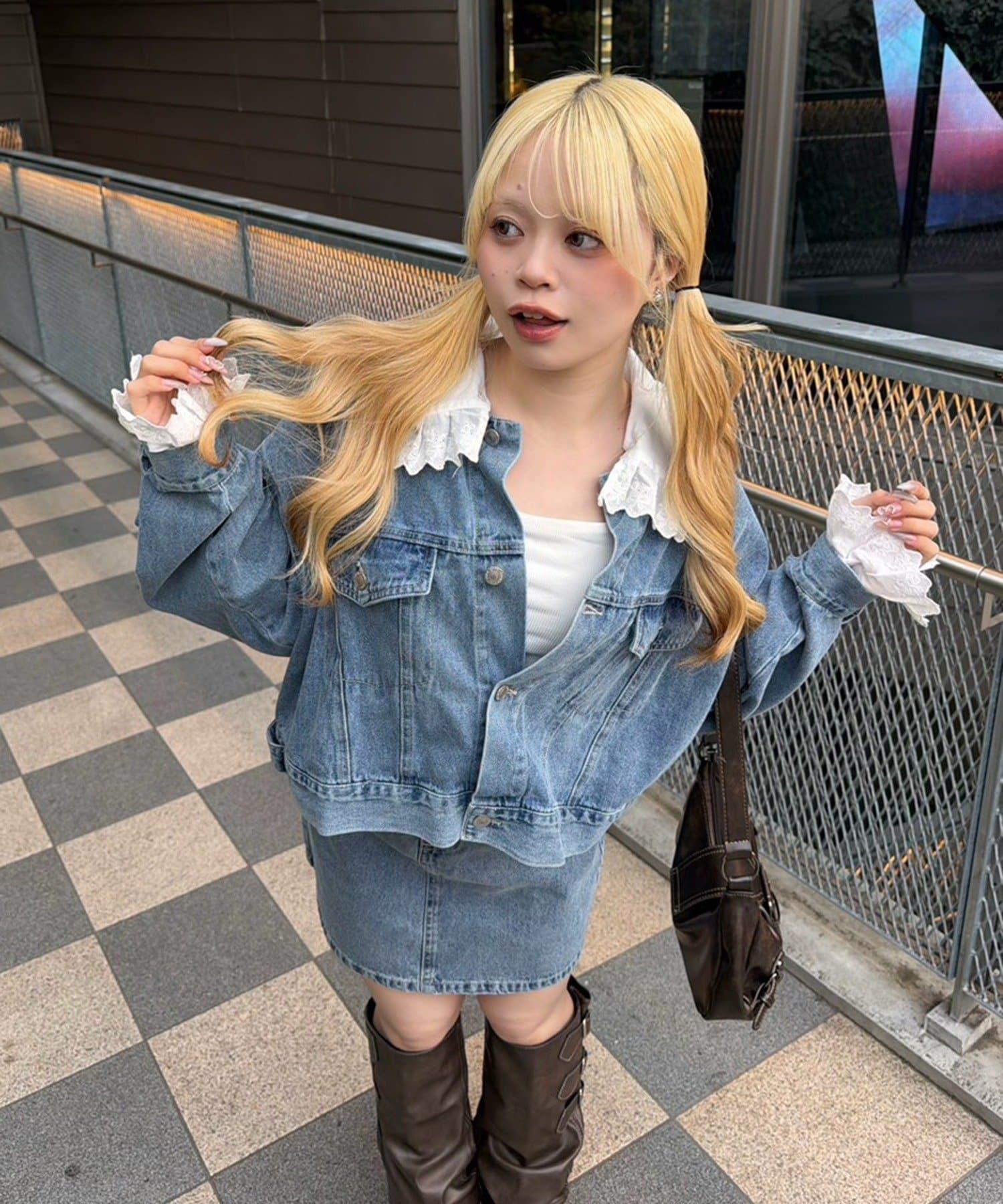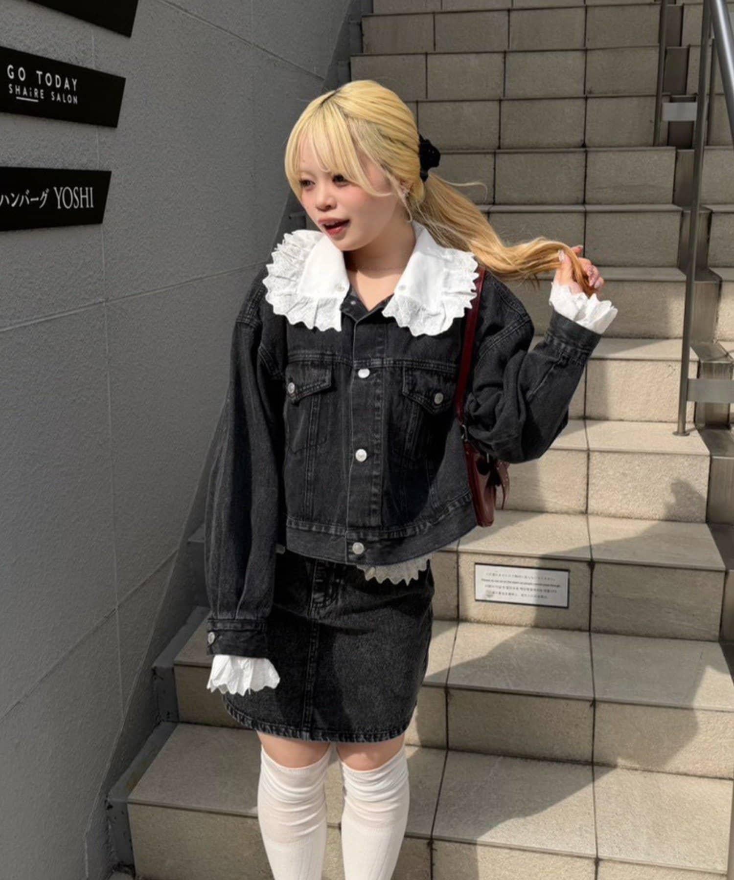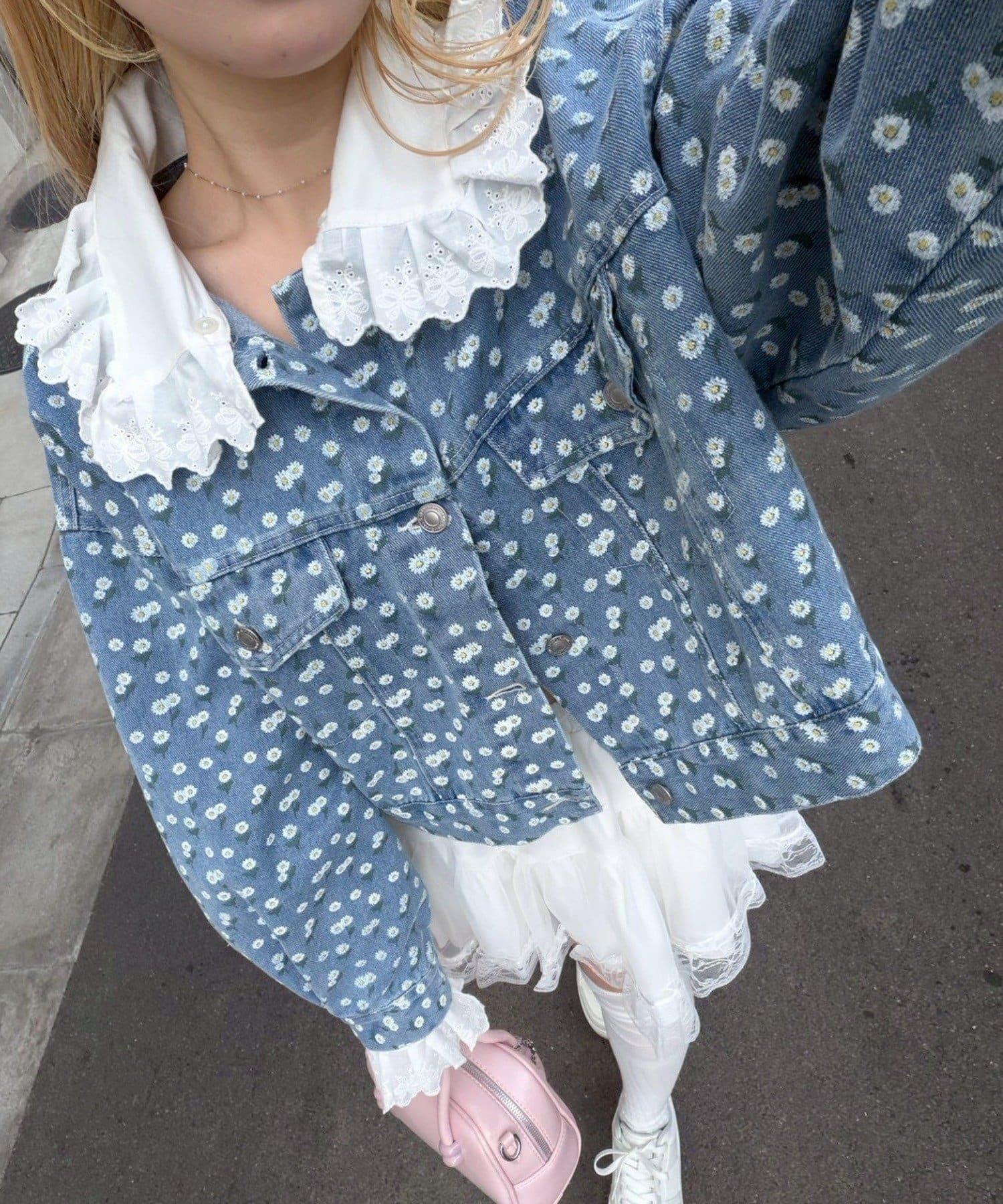 衣領上精緻的蕾絲花邊是這款牛仔夾克的一大亮點。