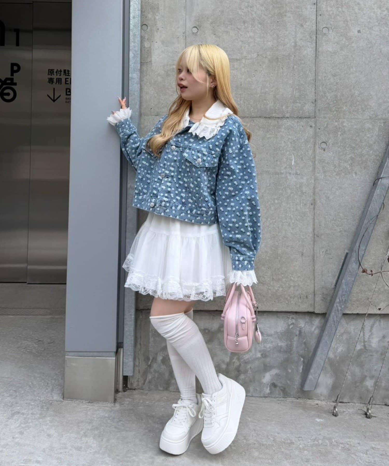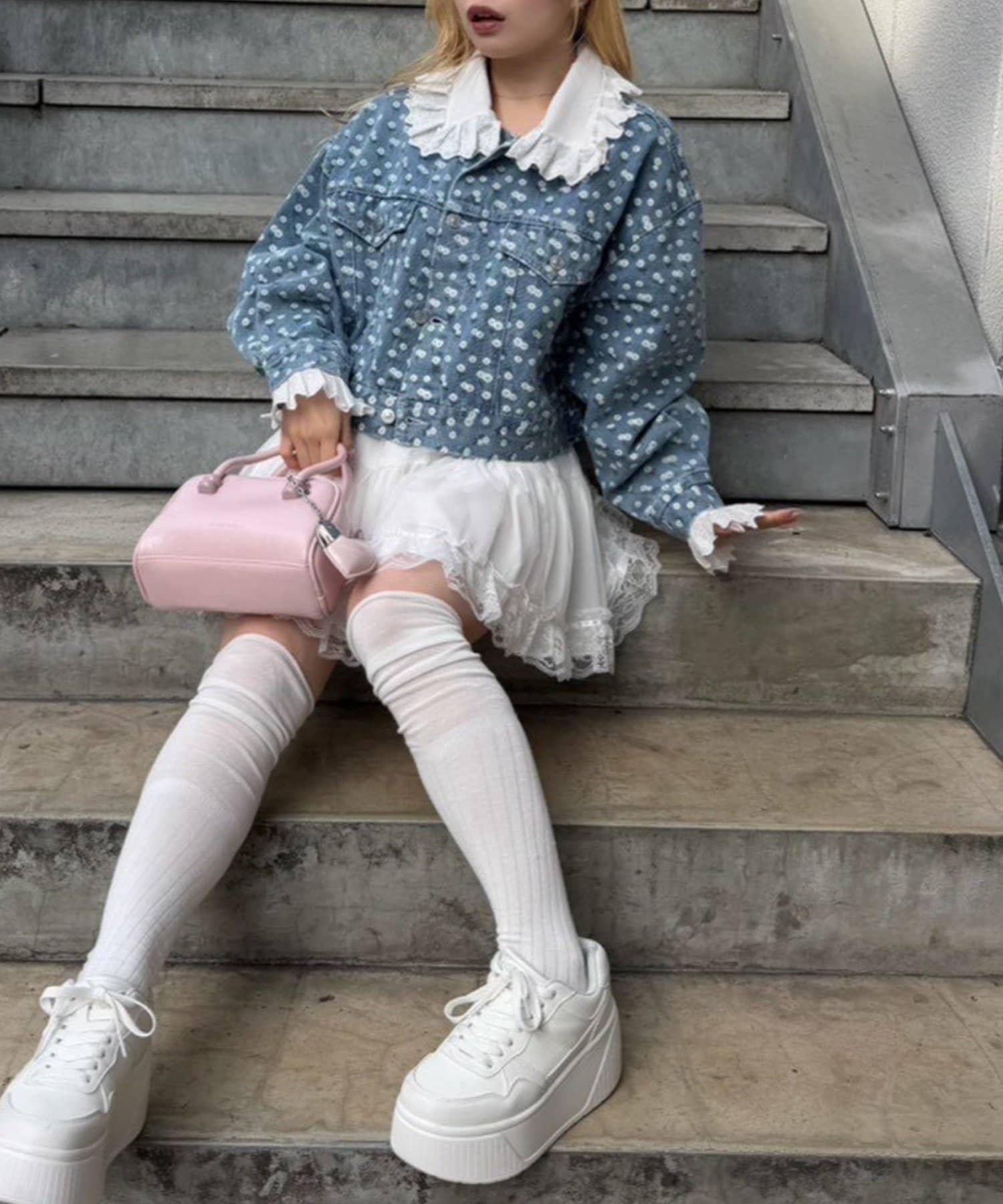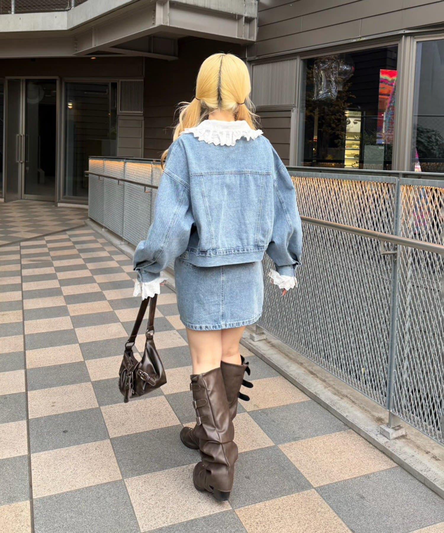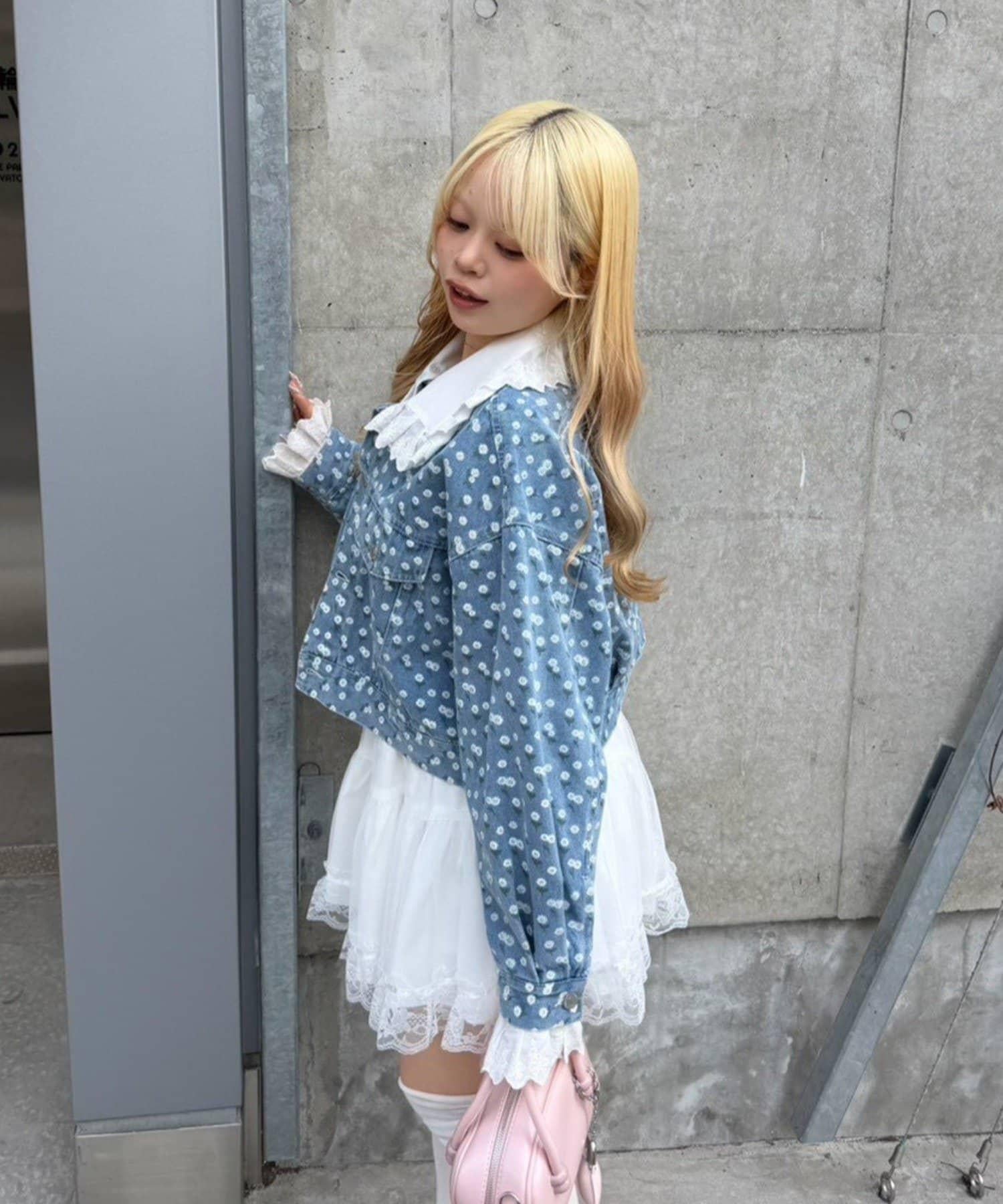 衣領上精緻的蕾絲花邊是這款牛仔夾克的一大亮點。