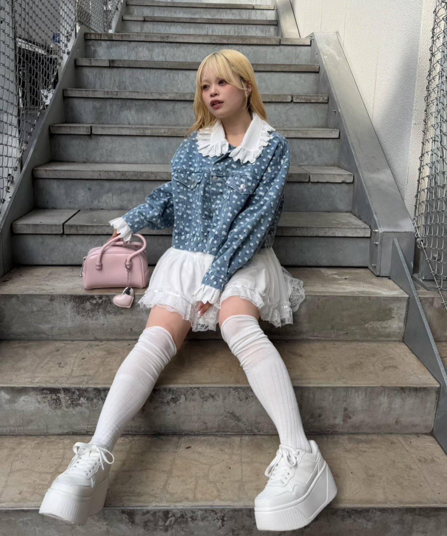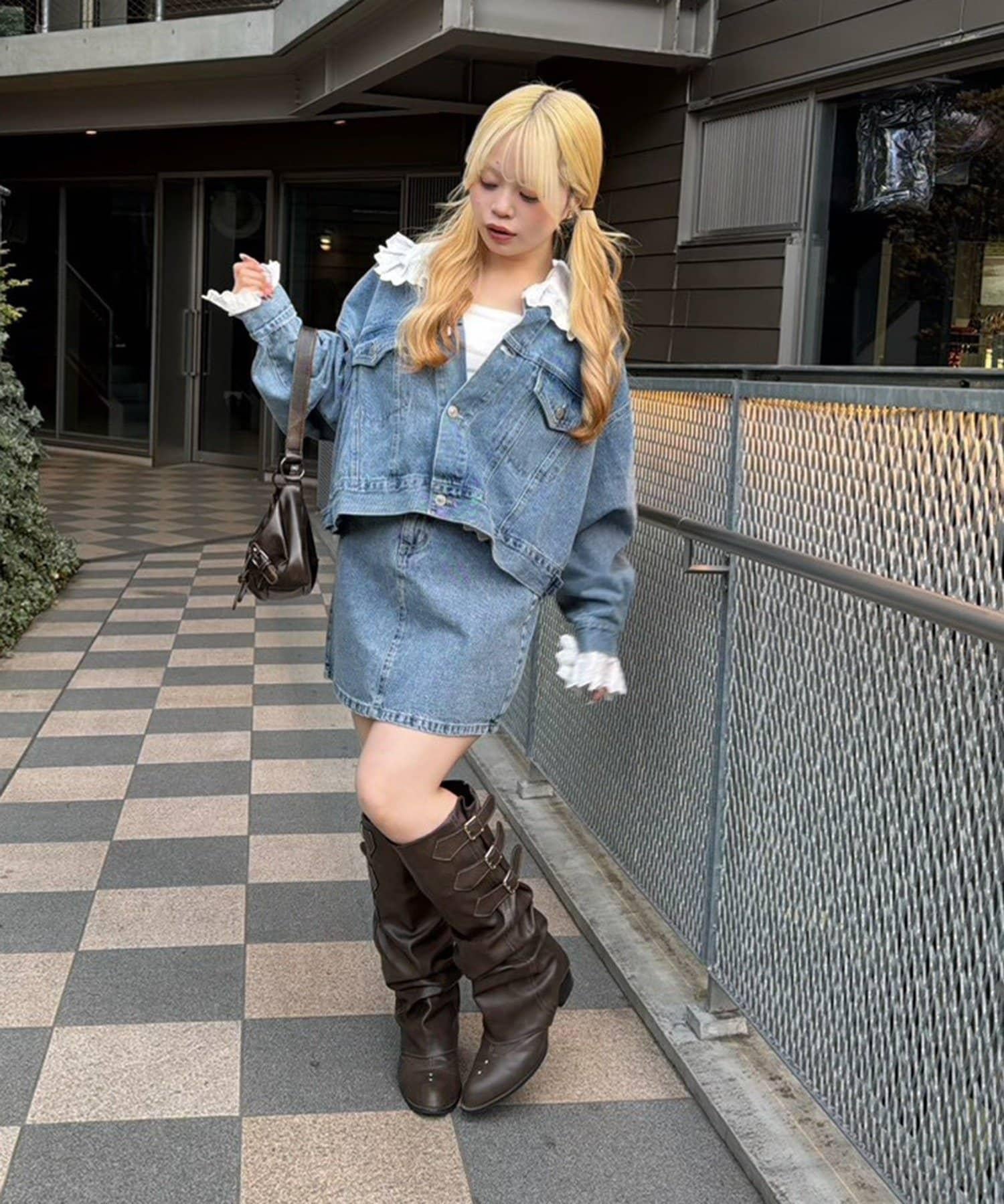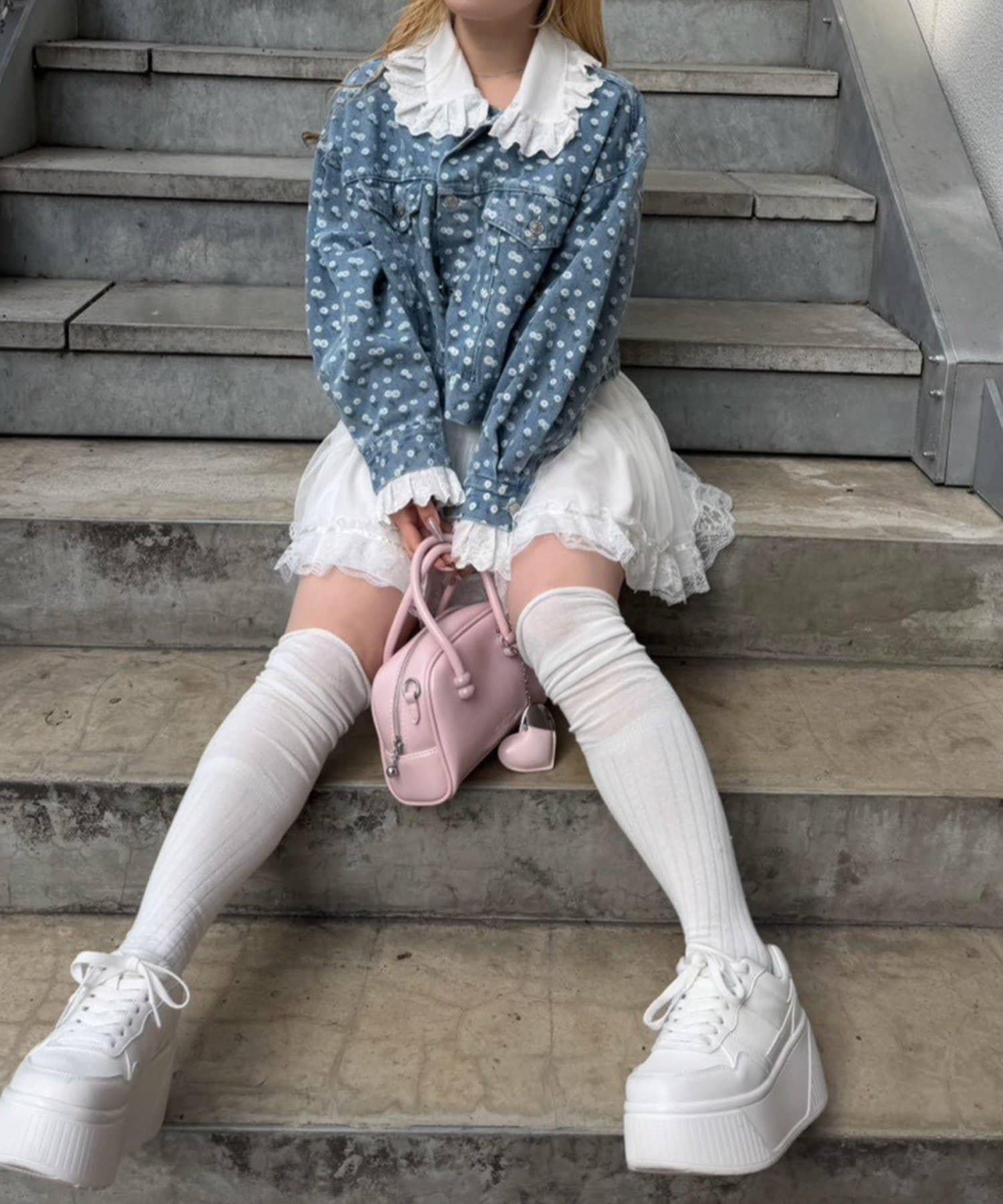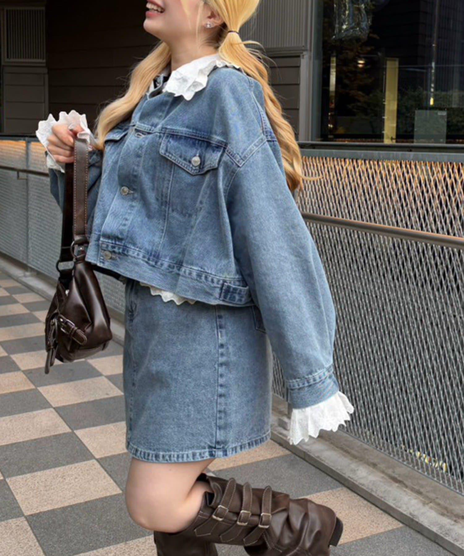衣領上精緻的蕾絲花邊是這款牛仔夾克的一大亮點。