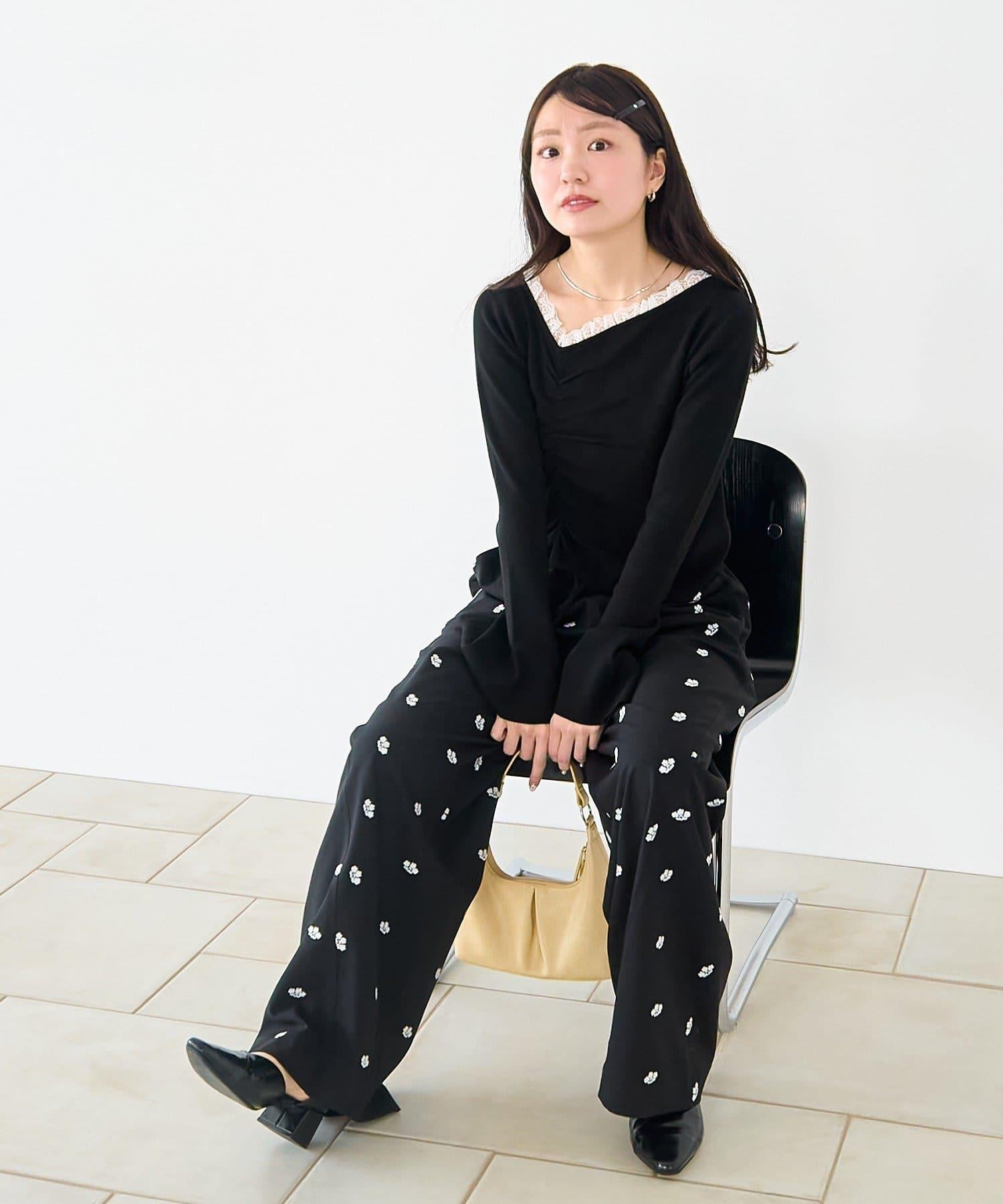 肩部精緻的蕾絲花邊和前幅的碎花設計,提升了這款單品的女性魅力。