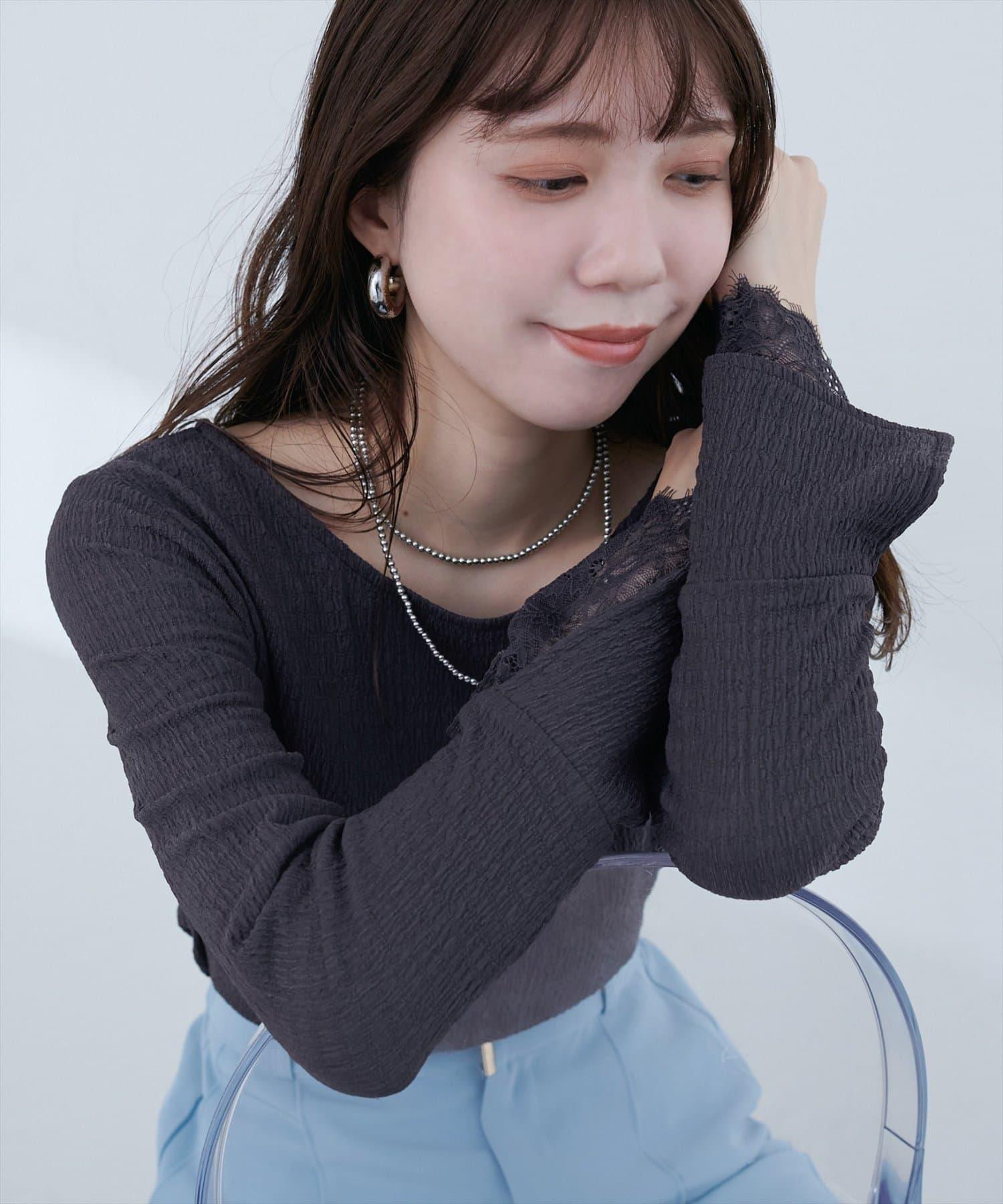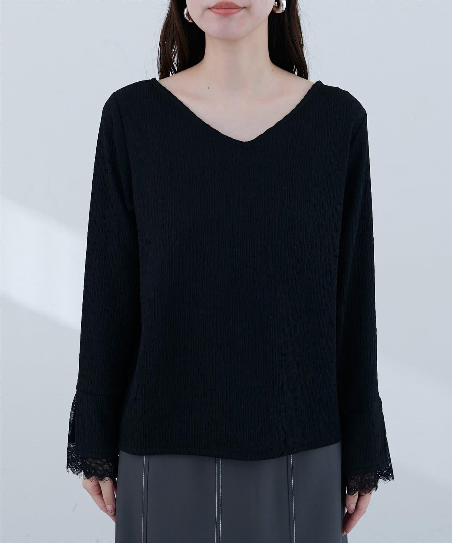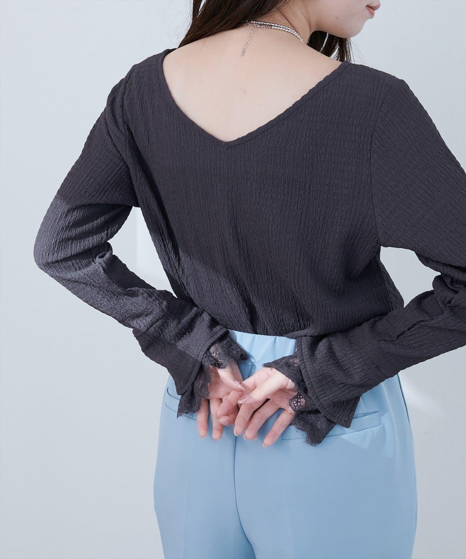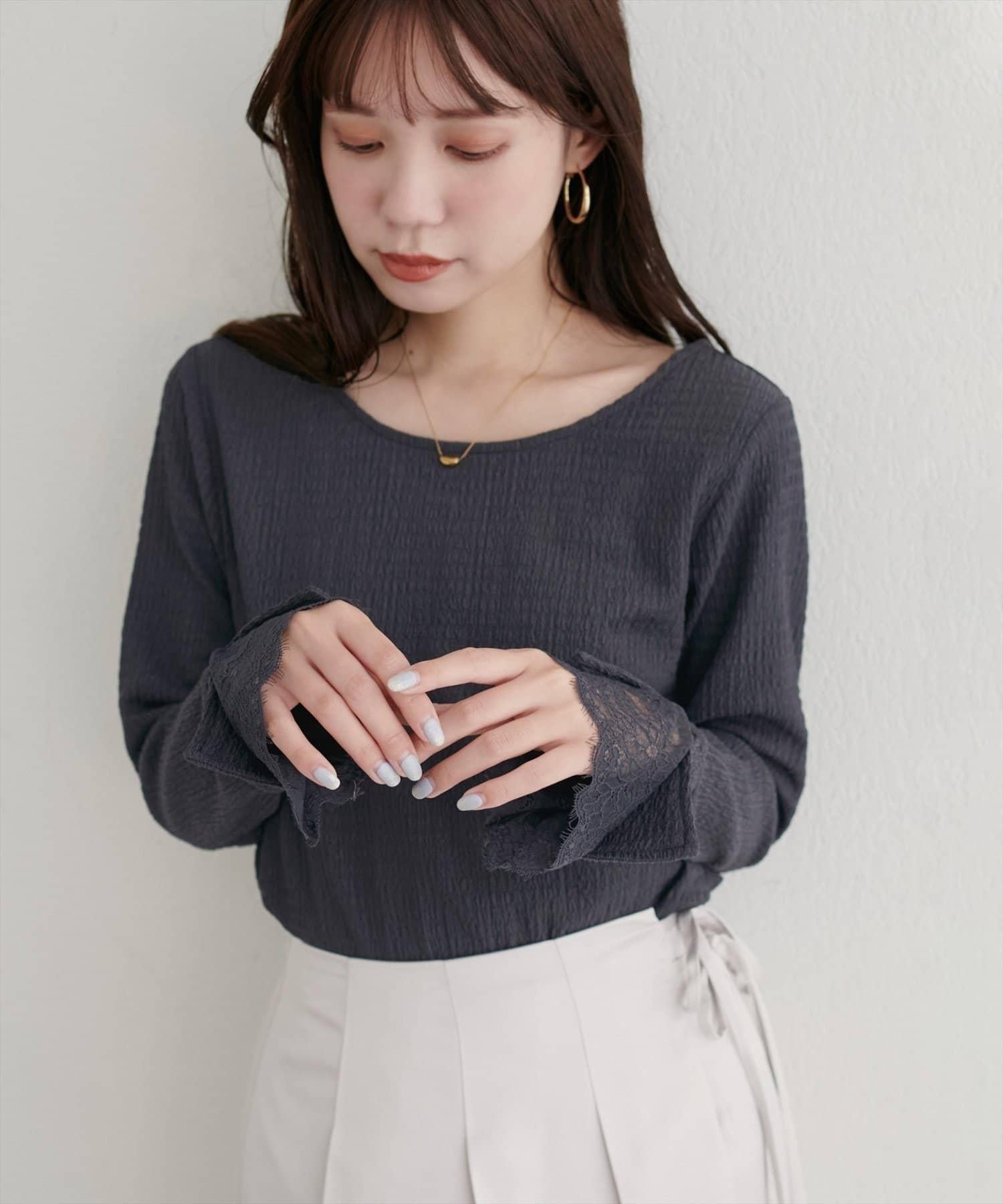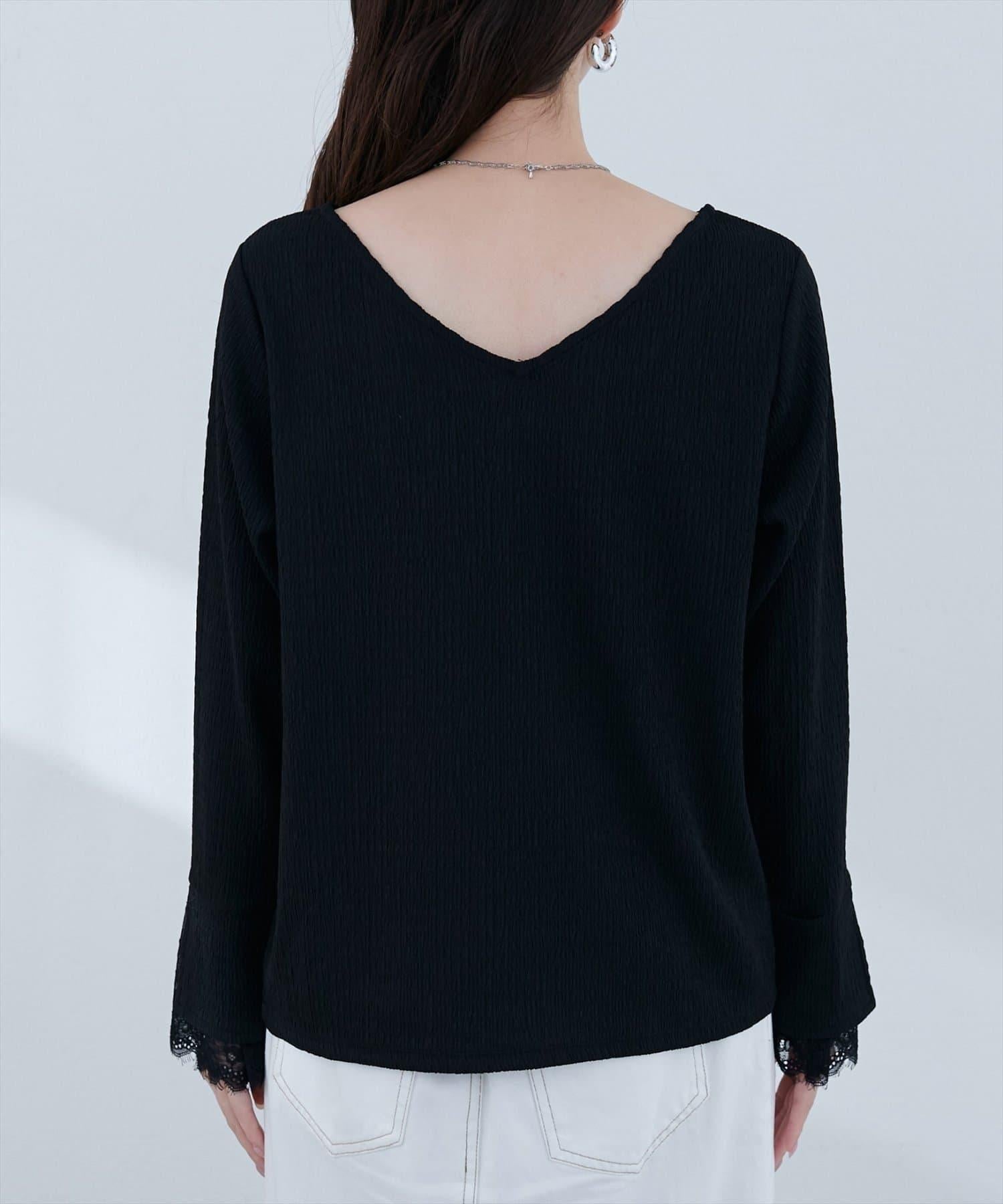 V 領可以穿在前面,露出肩部,營造出寬鬆的感覺。蕾絲不甜膩,給人精緻的印象。
