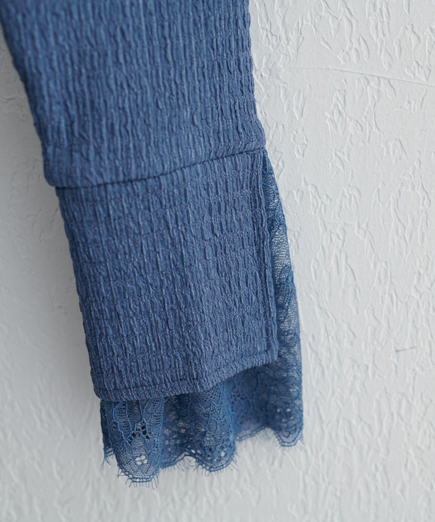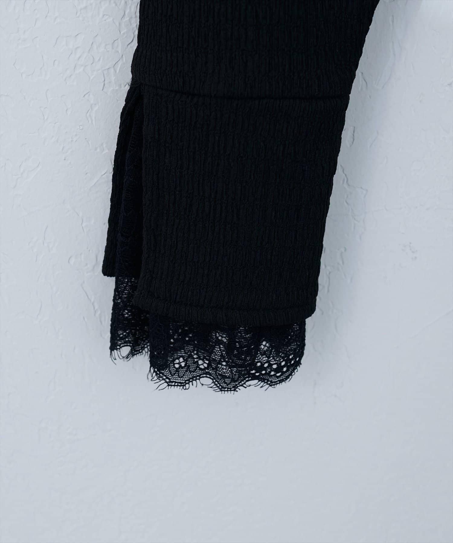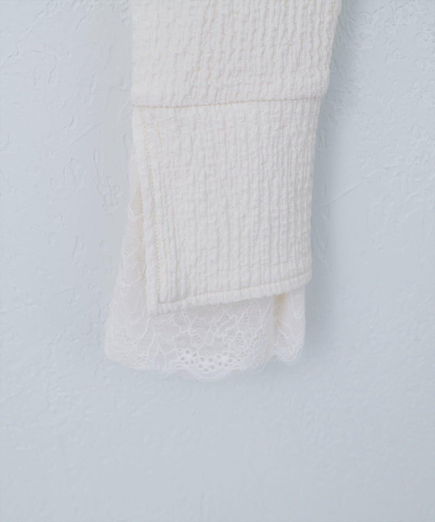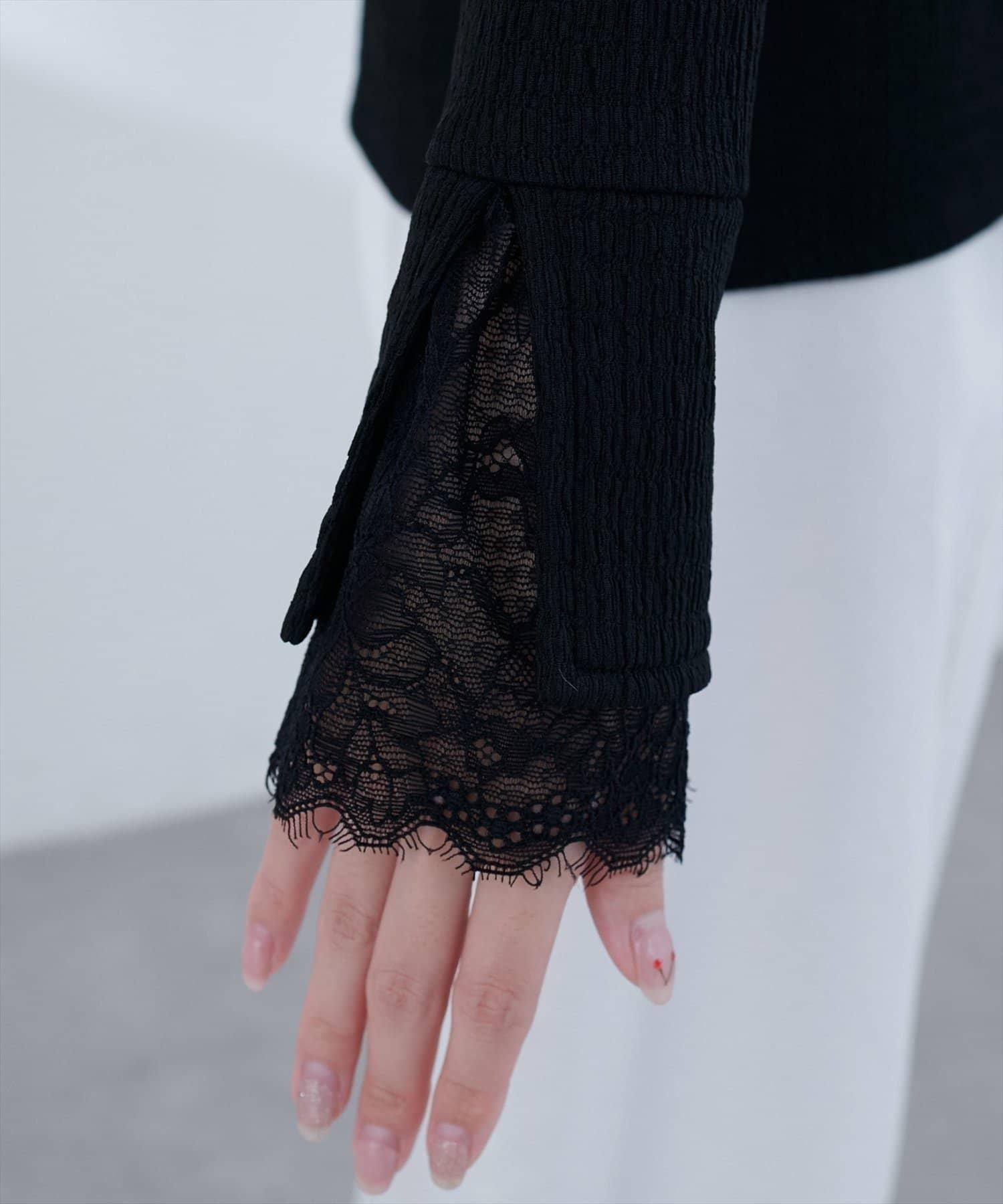 長袖剪裁,前後雙向設計,袖口處有精緻的蕾絲花邊。