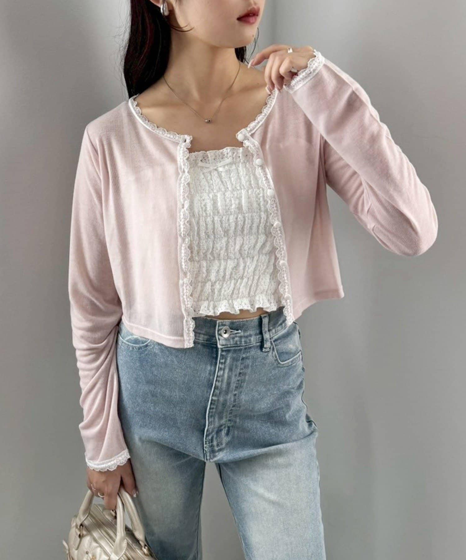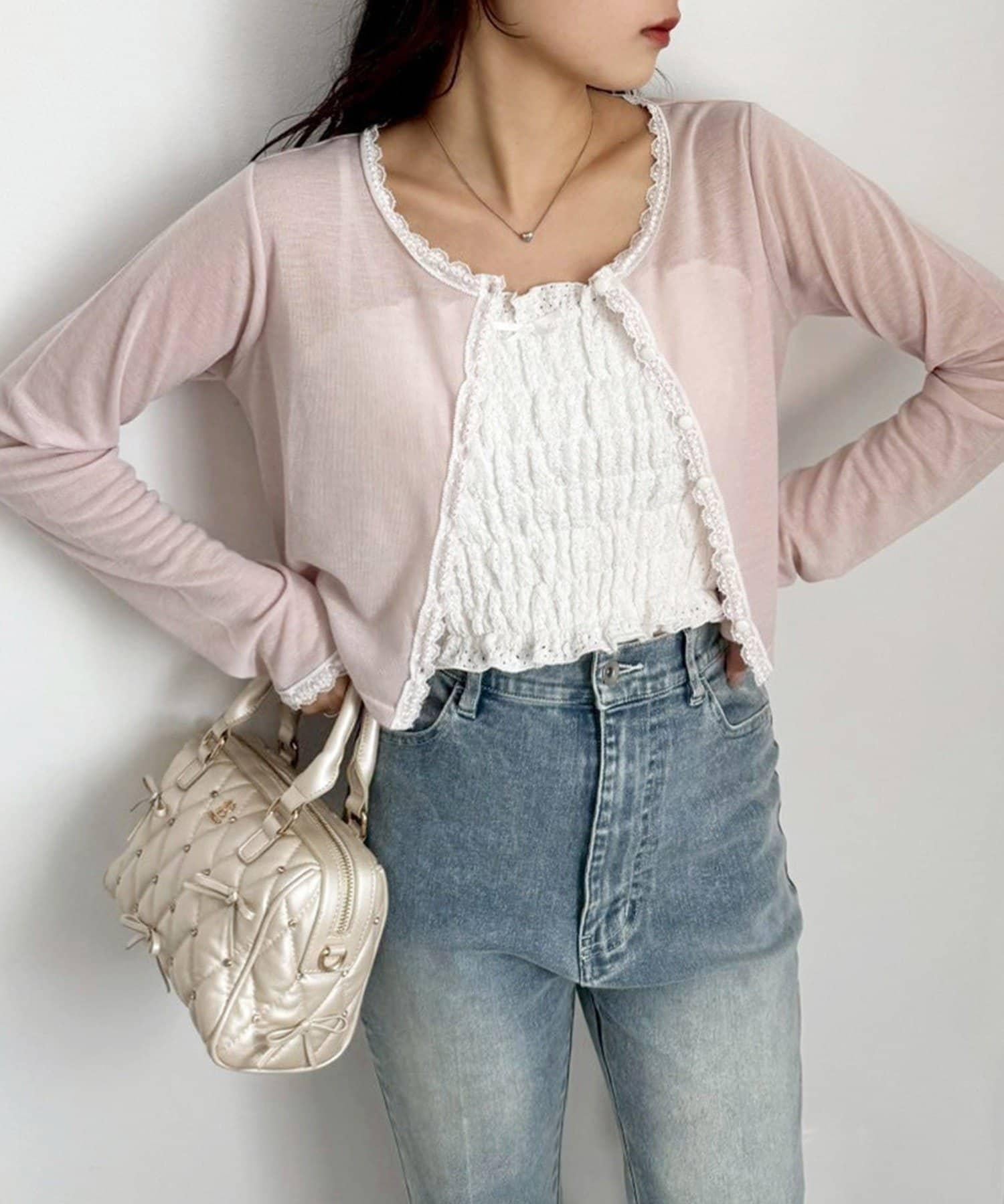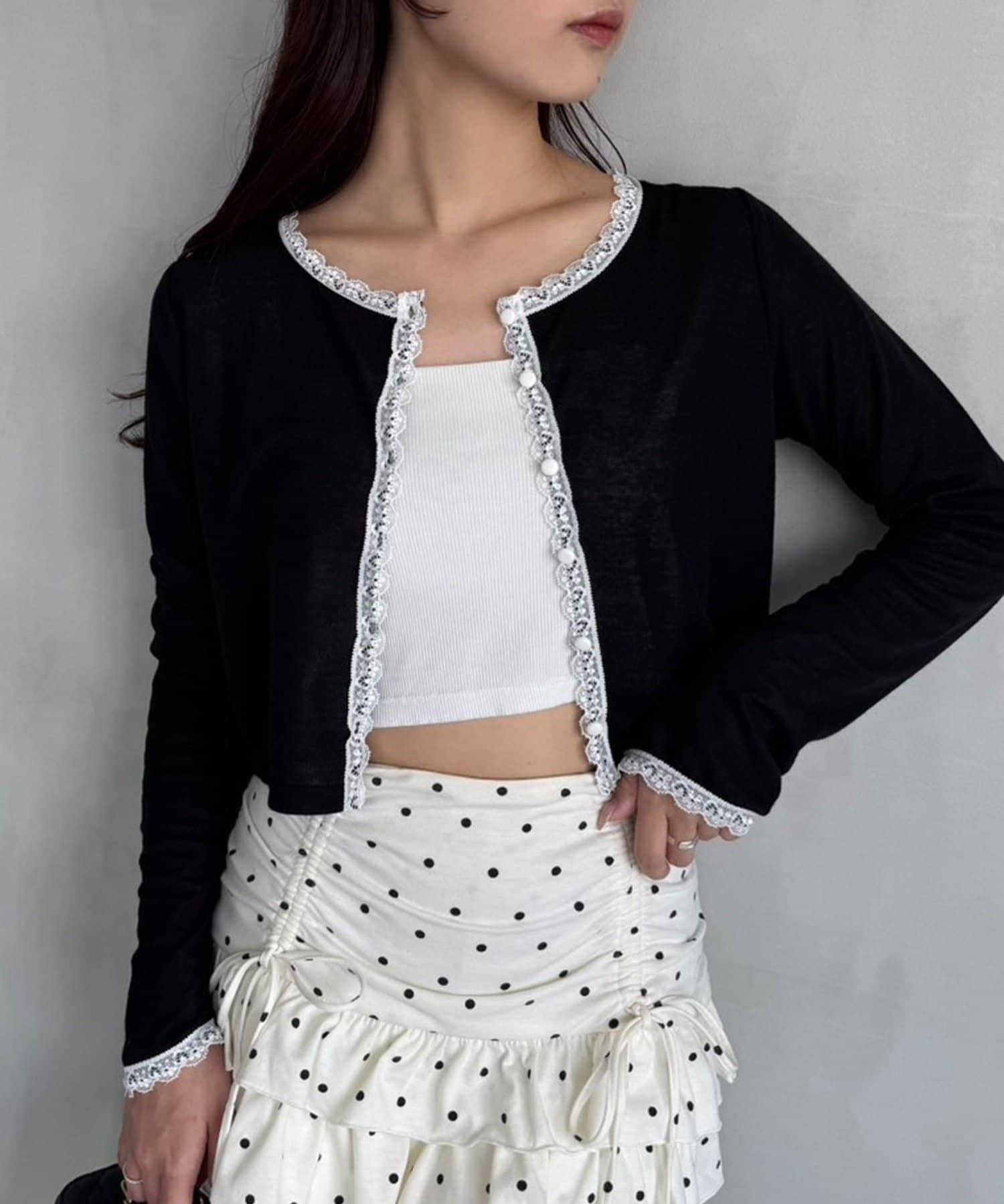 短款剪裁面料開衫,蕾絲花邊增添魅力。