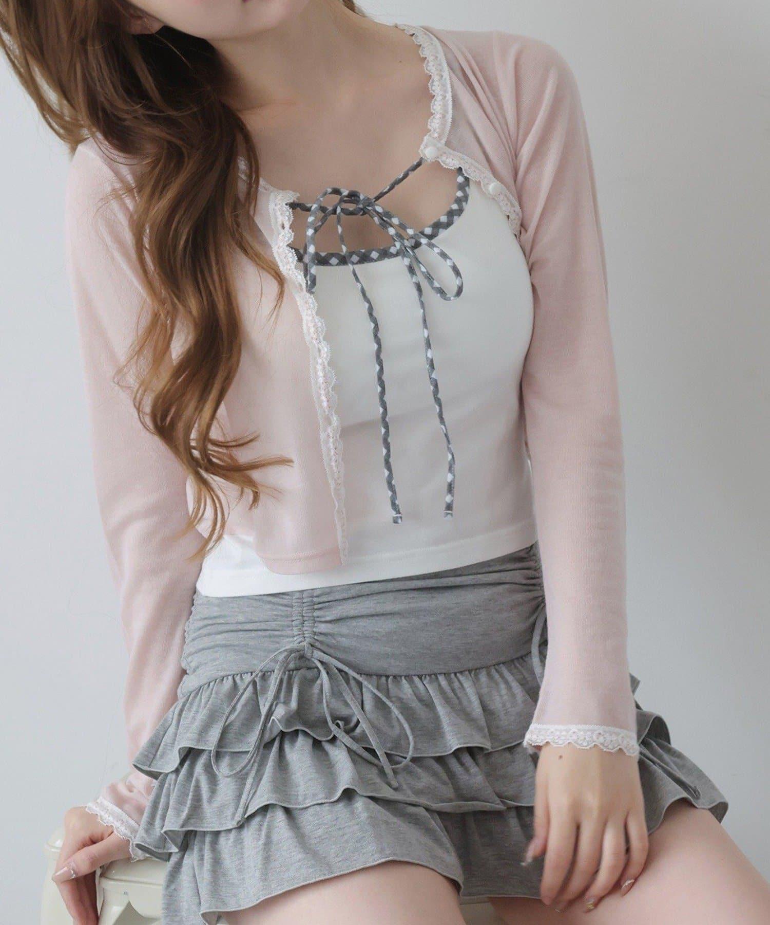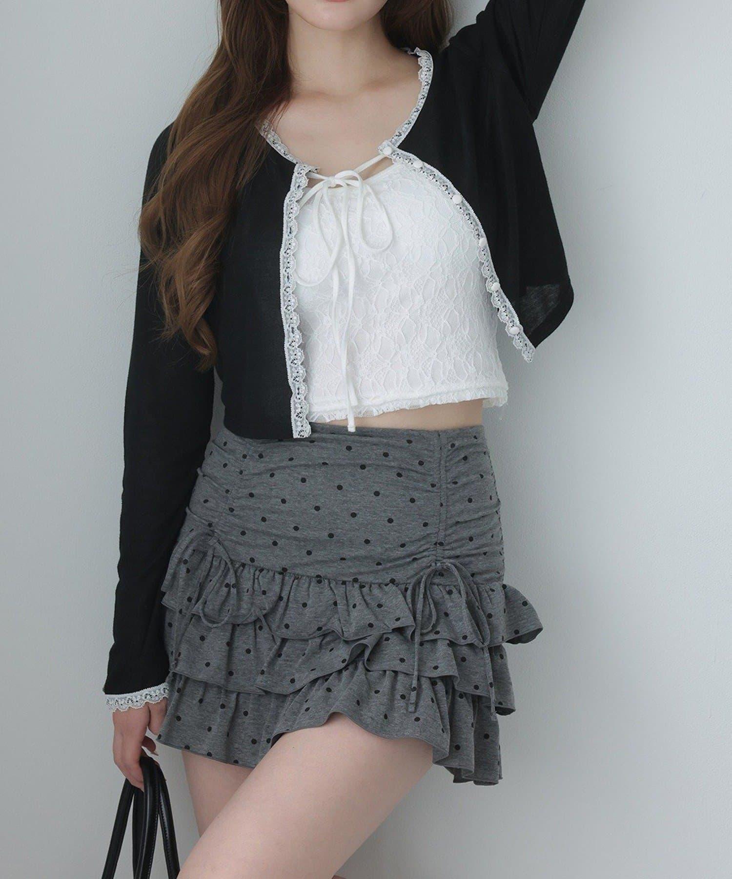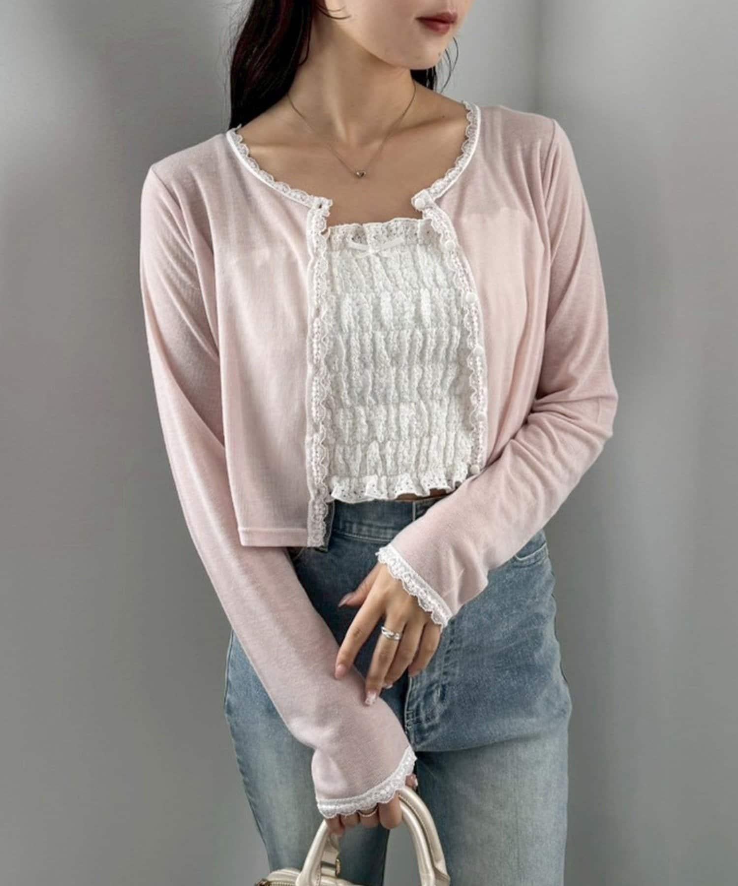 短款剪裁面料開衫,蕾絲花邊增添魅力。