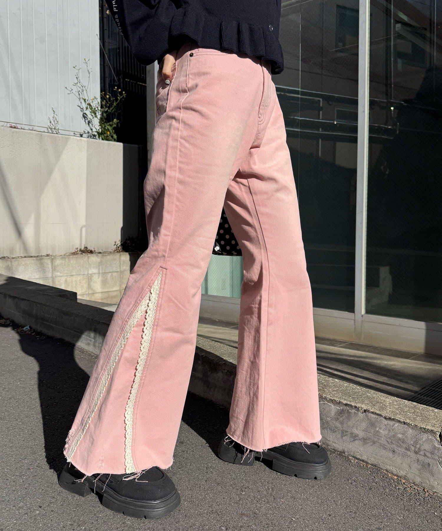 蕾絲省褶喇叭牛仔褲