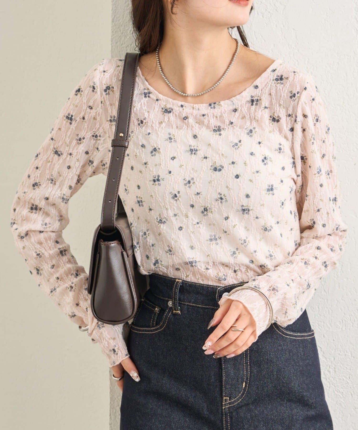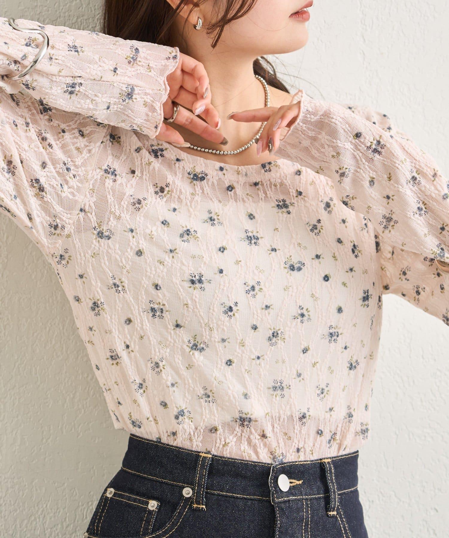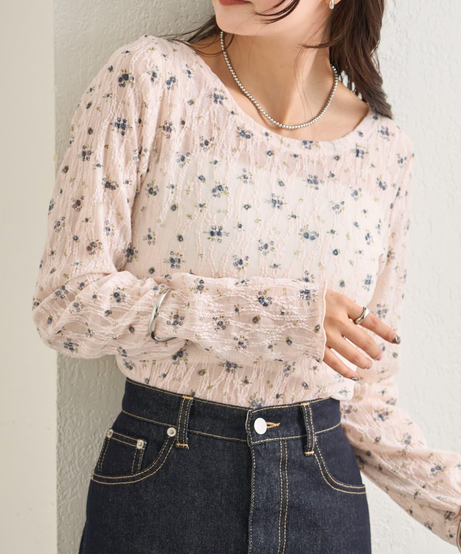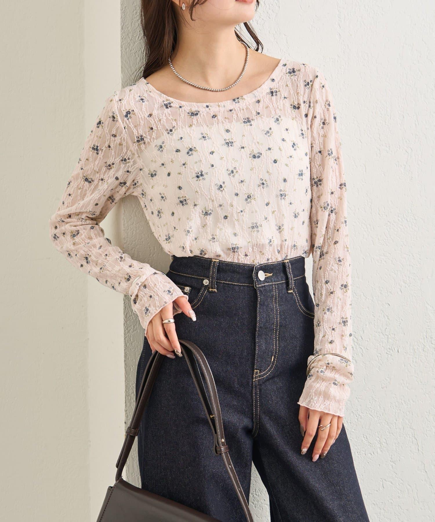 可愛中帶有恰到好處的透明感!蕾絲花卉圖案透視 T,適合多層次款式。