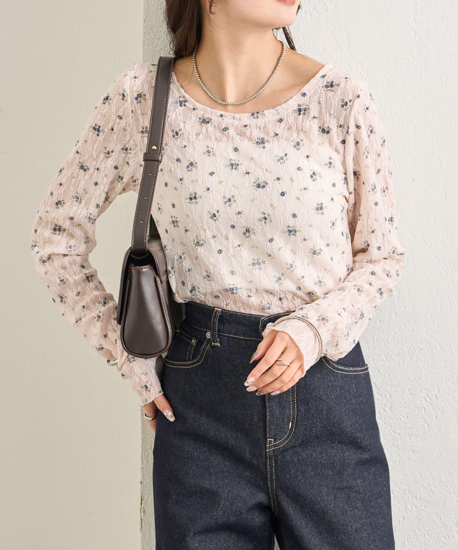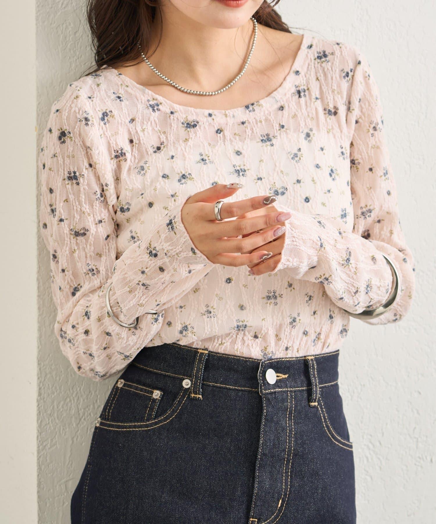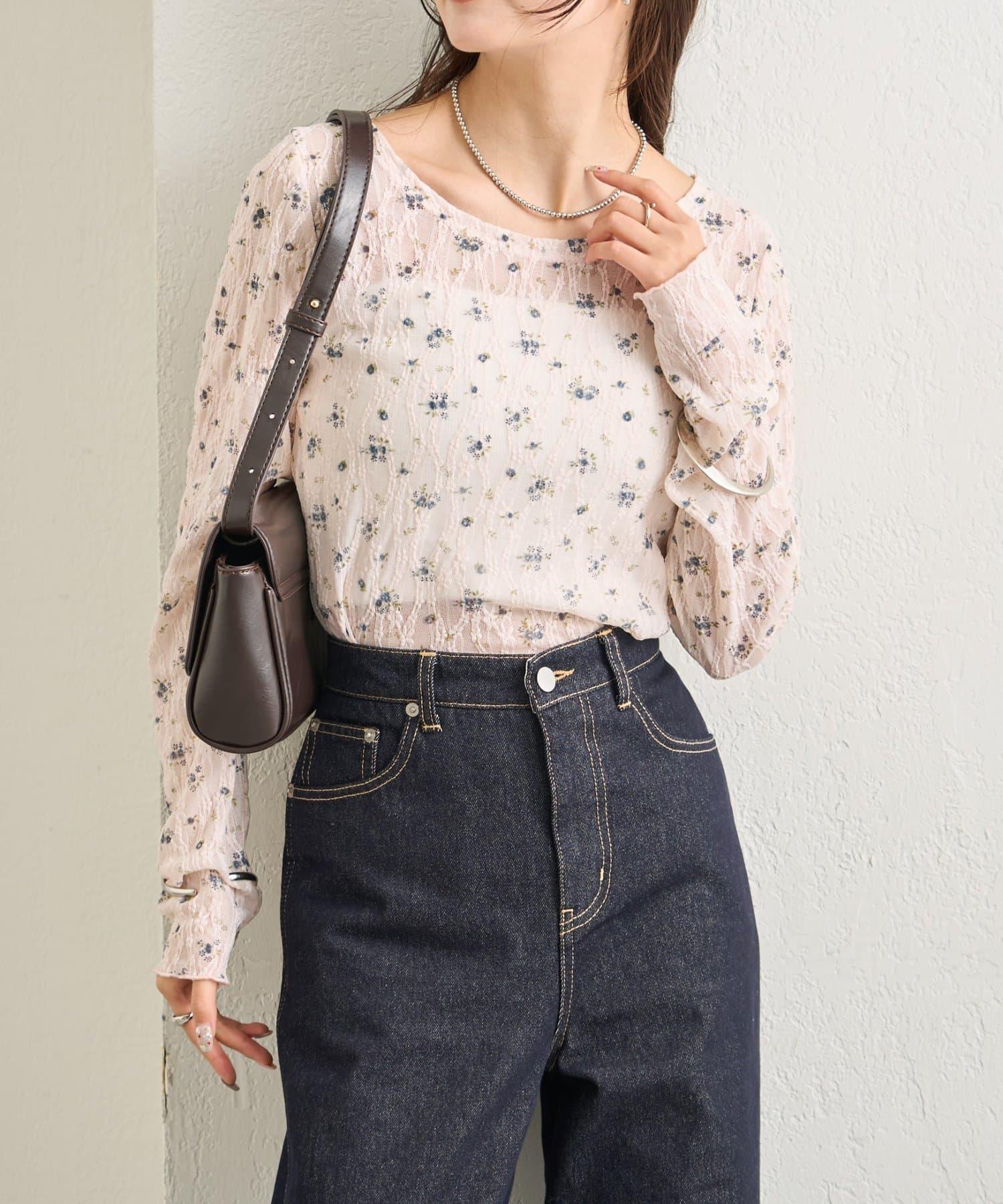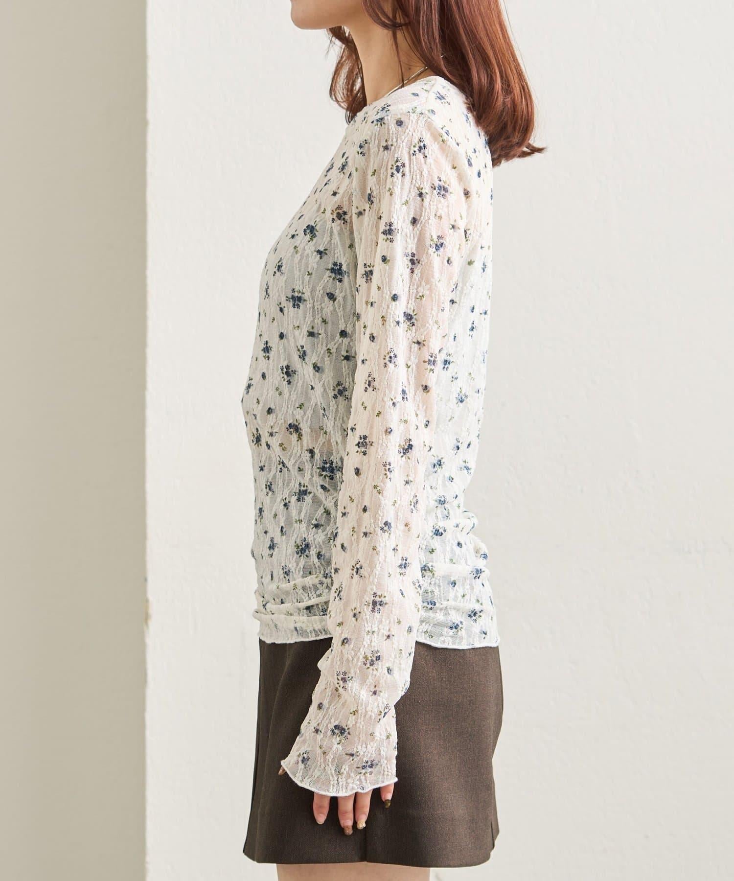 可愛中帶有恰到好處的透明感!蕾絲花卉圖案透視 T,適合多層次款式。