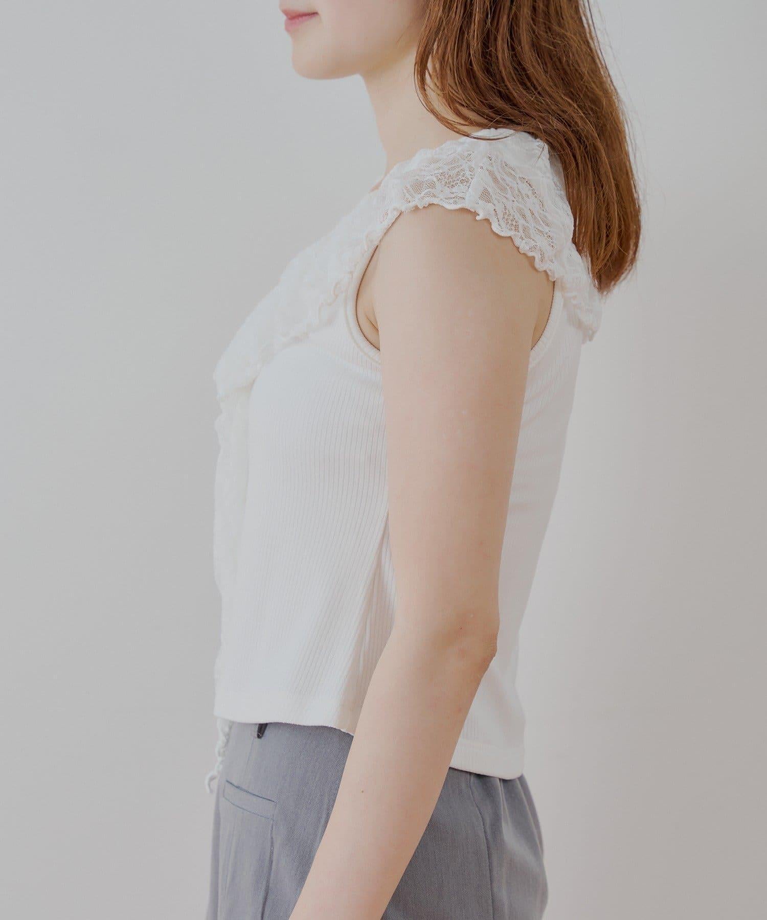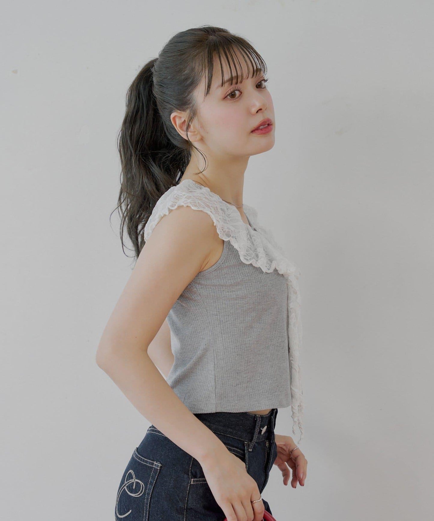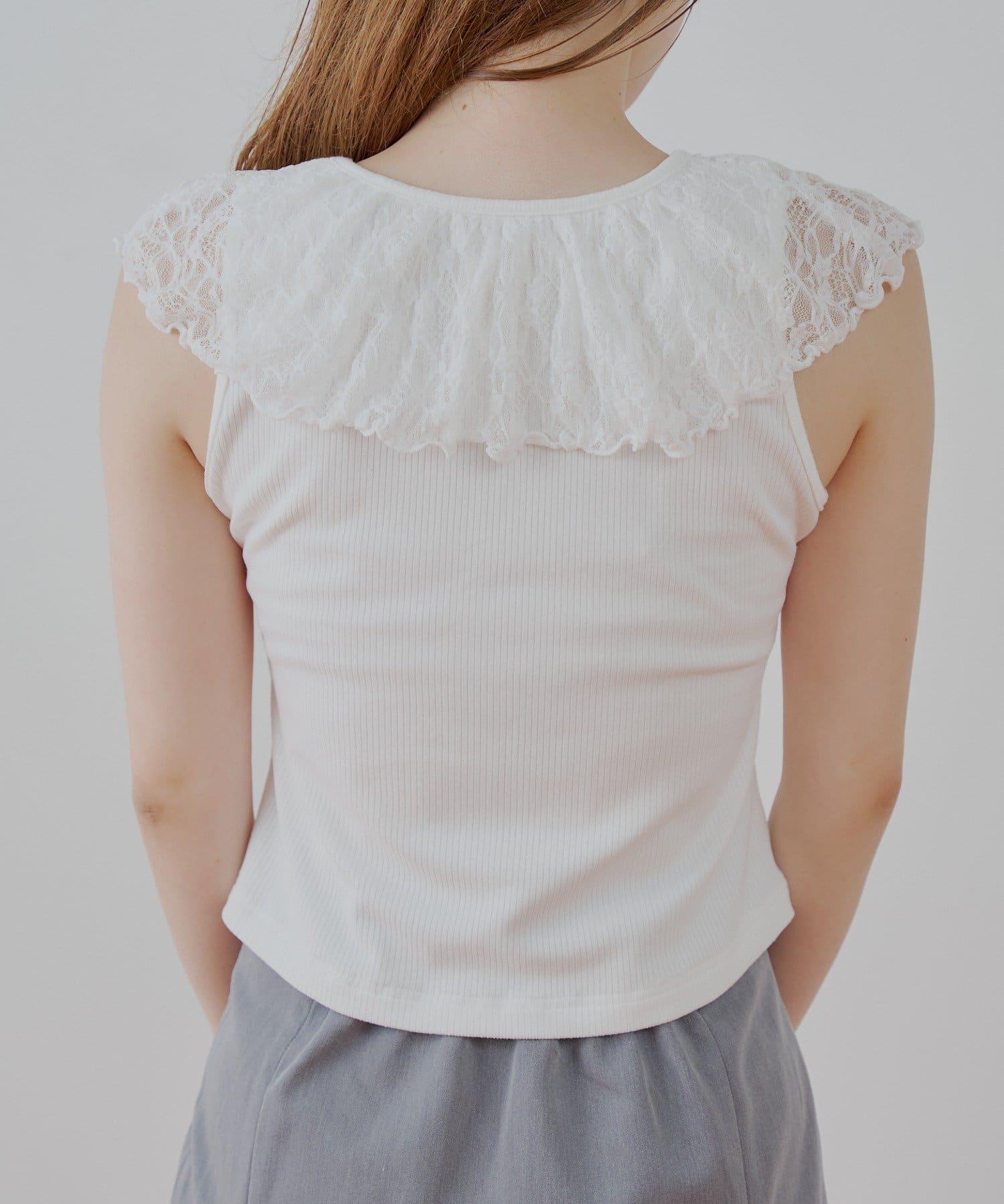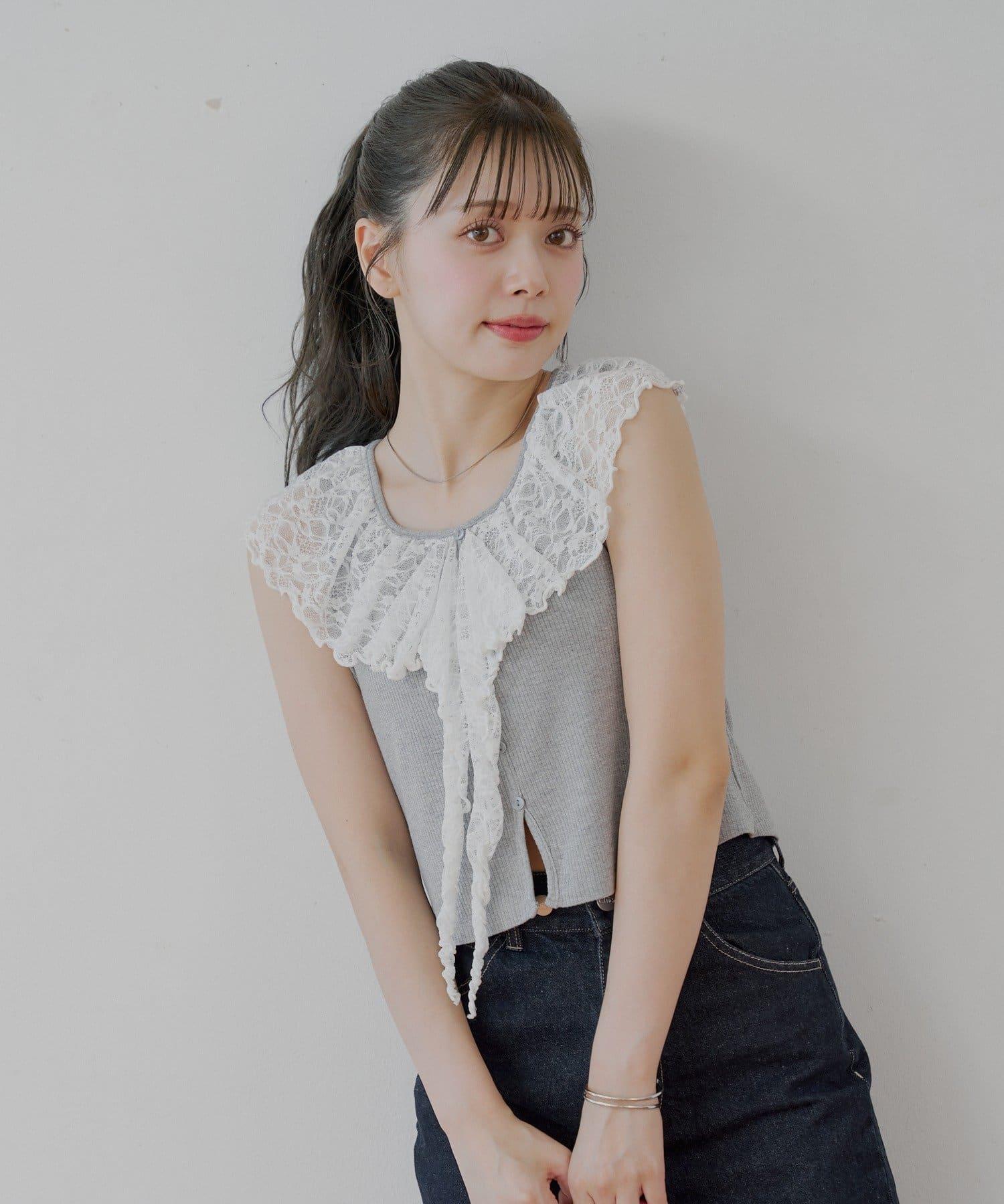 這款無袖羅紋 T 恤以蕾絲裝飾,優雅通透。