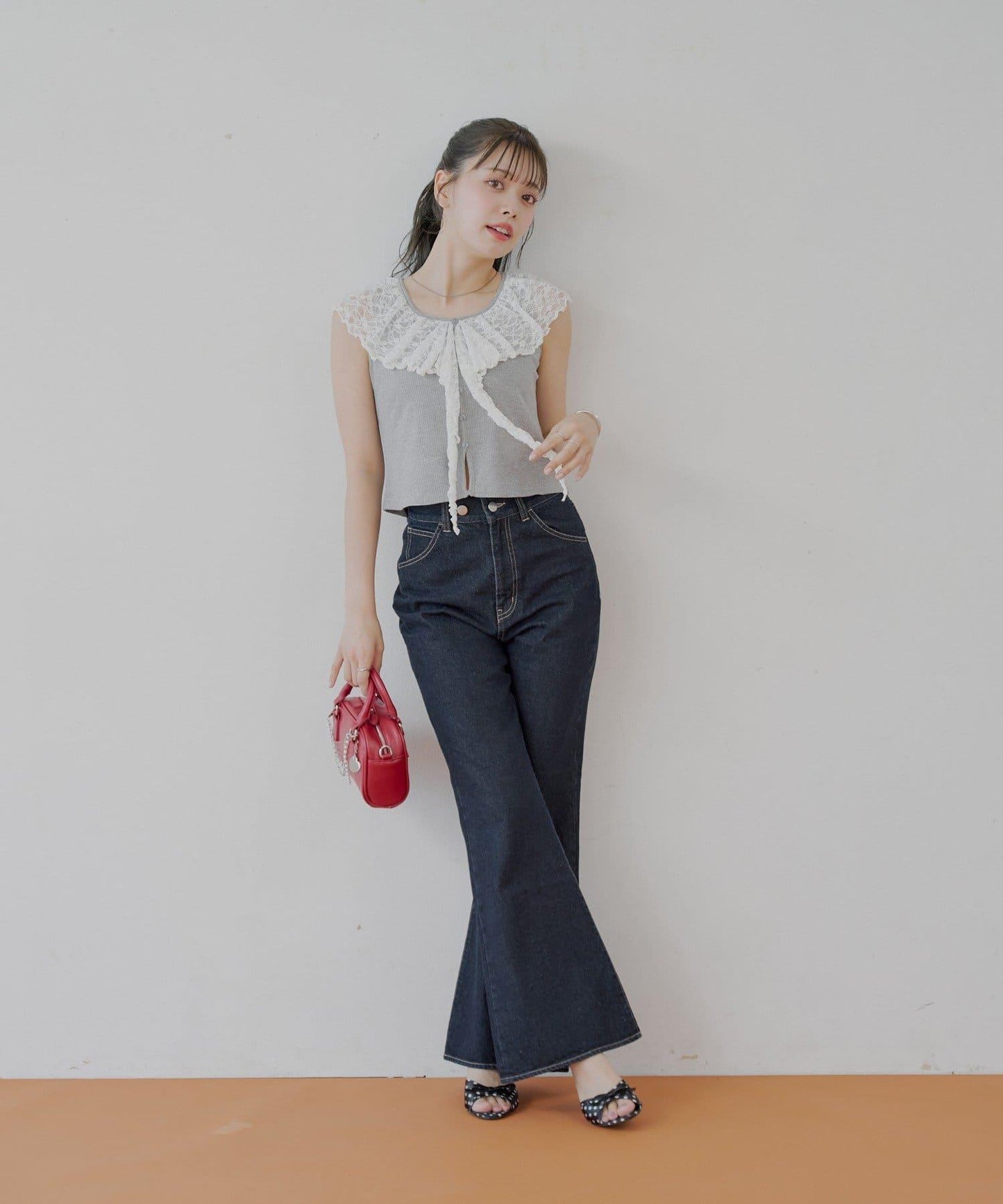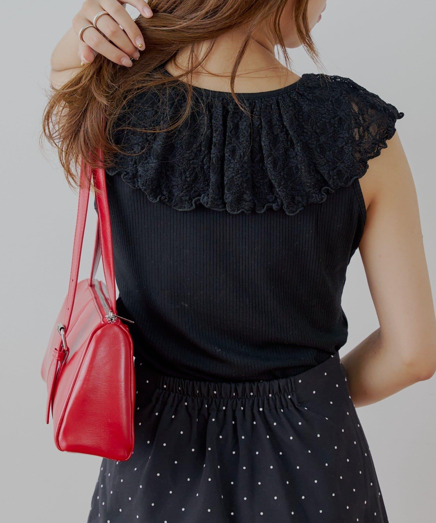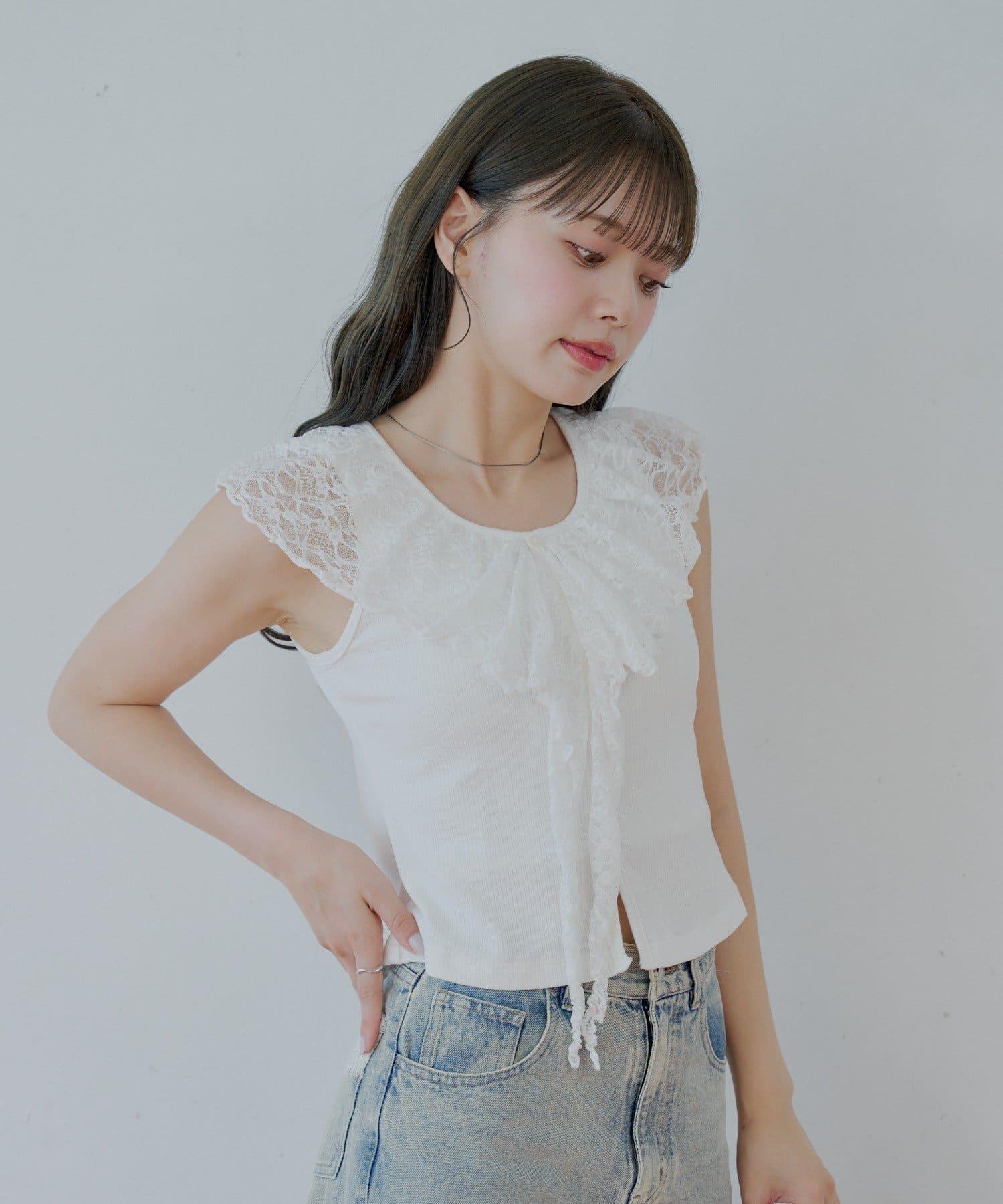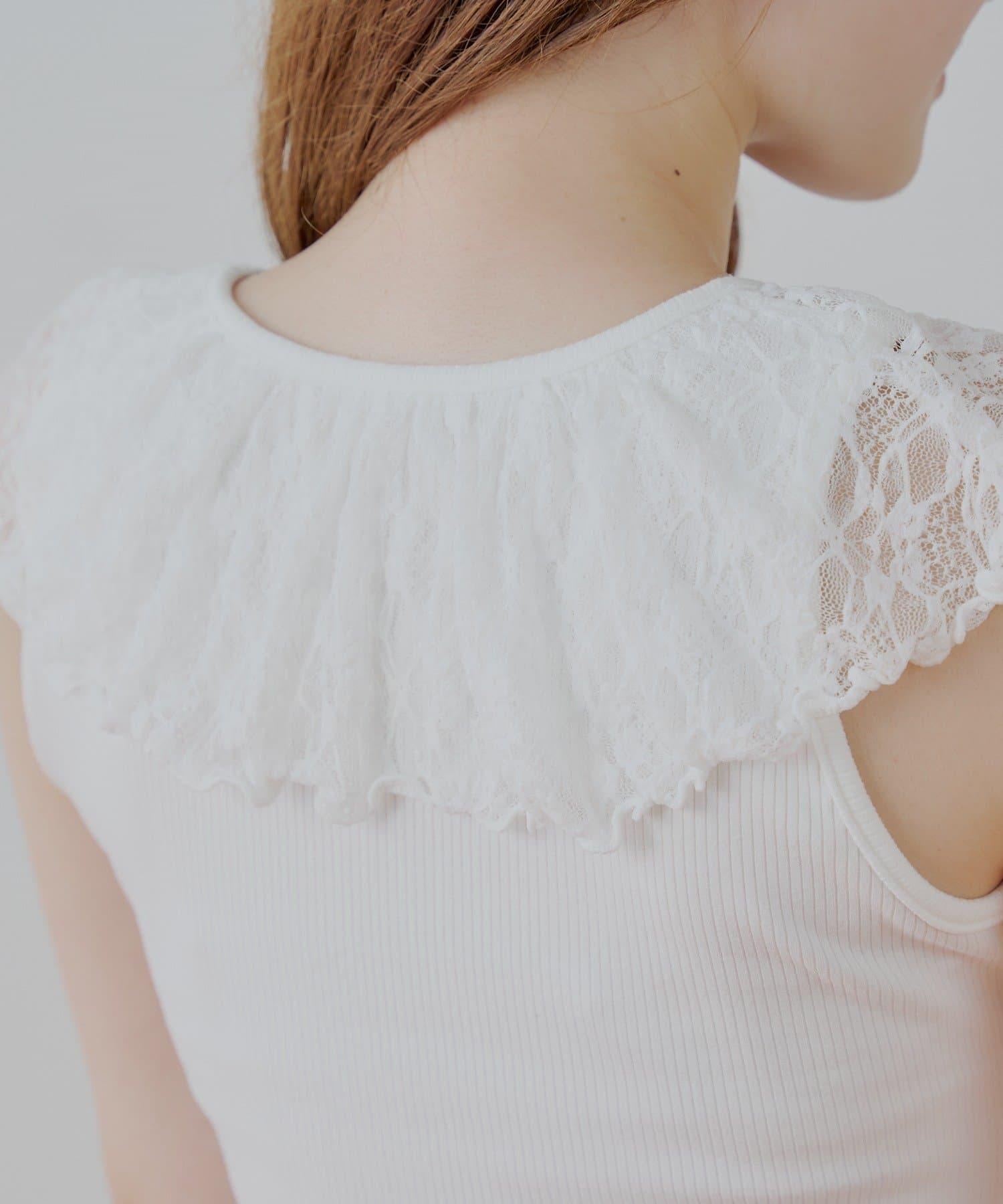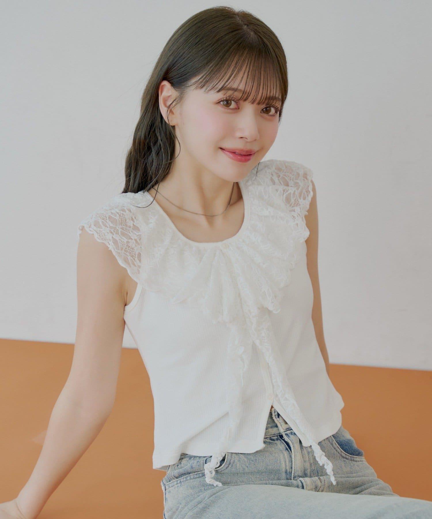 這款無袖羅紋 T 恤以蕾絲裝飾,優雅通透。
