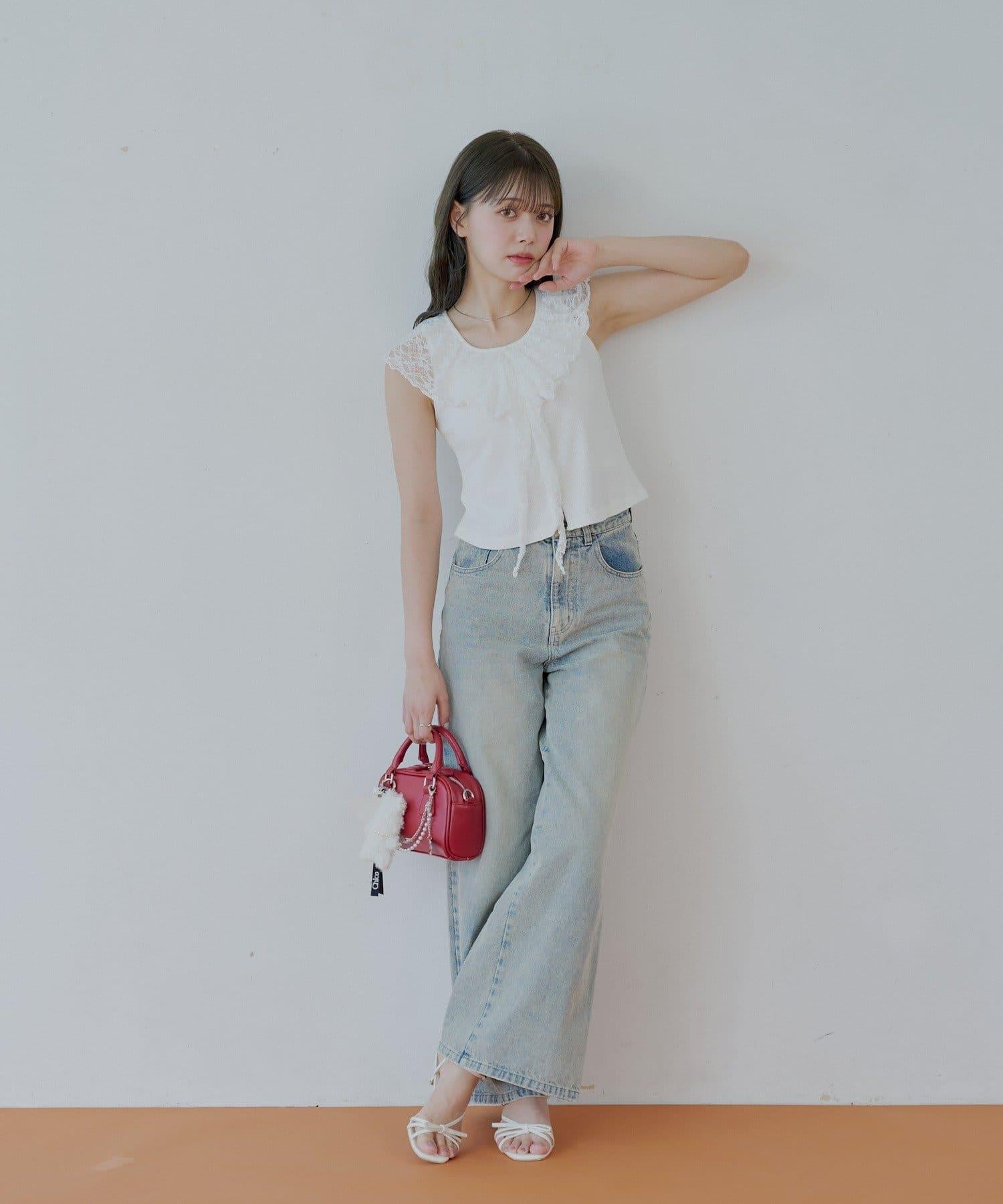 衣領和衣袖上的褶皺蕾絲為這款簡潔的 T 恤增添了一絲魅力。