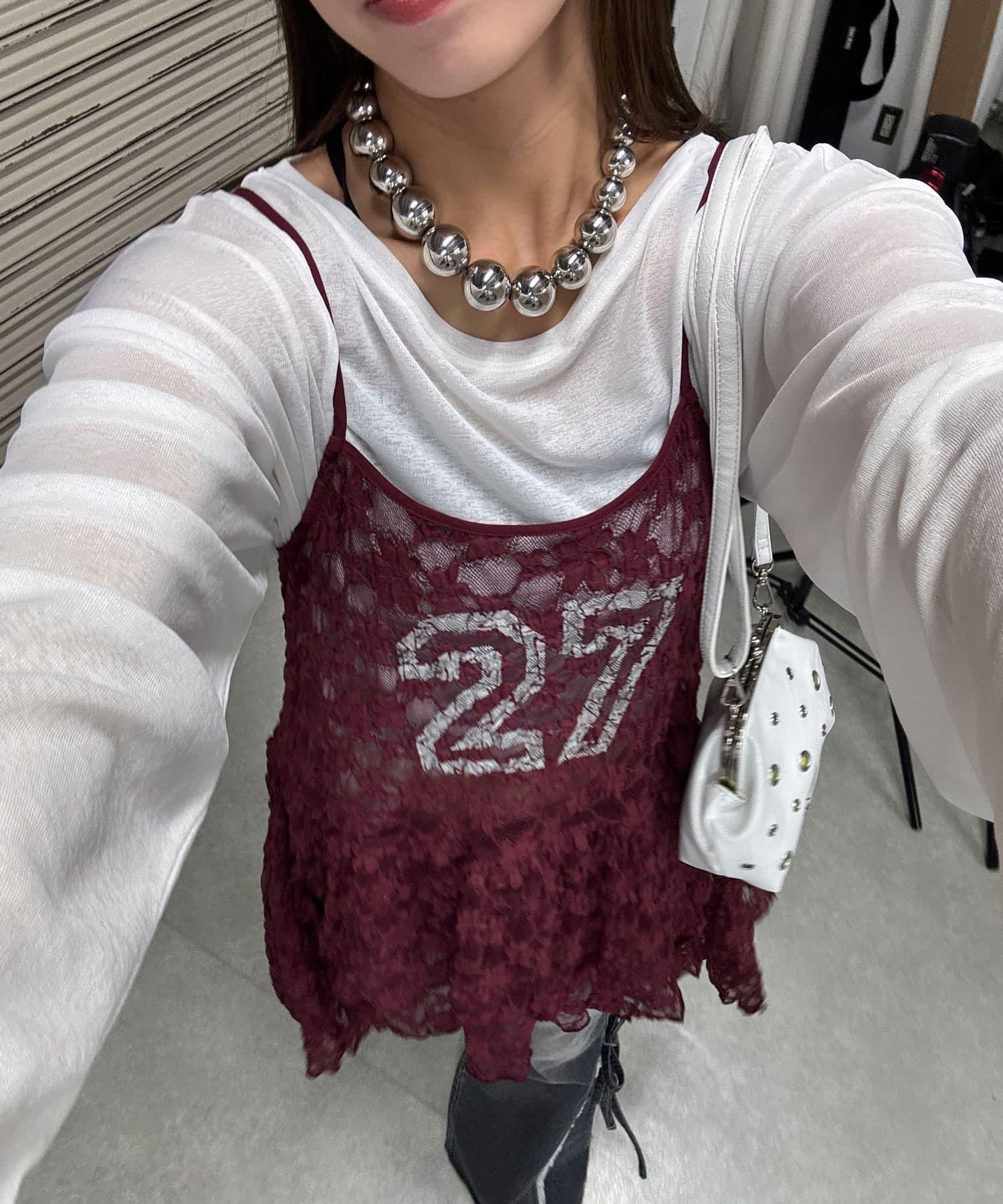 這是一款獨特的吊帶連身裙,採用精緻的全蕾絲設計,並添加了動感的數字徽標。