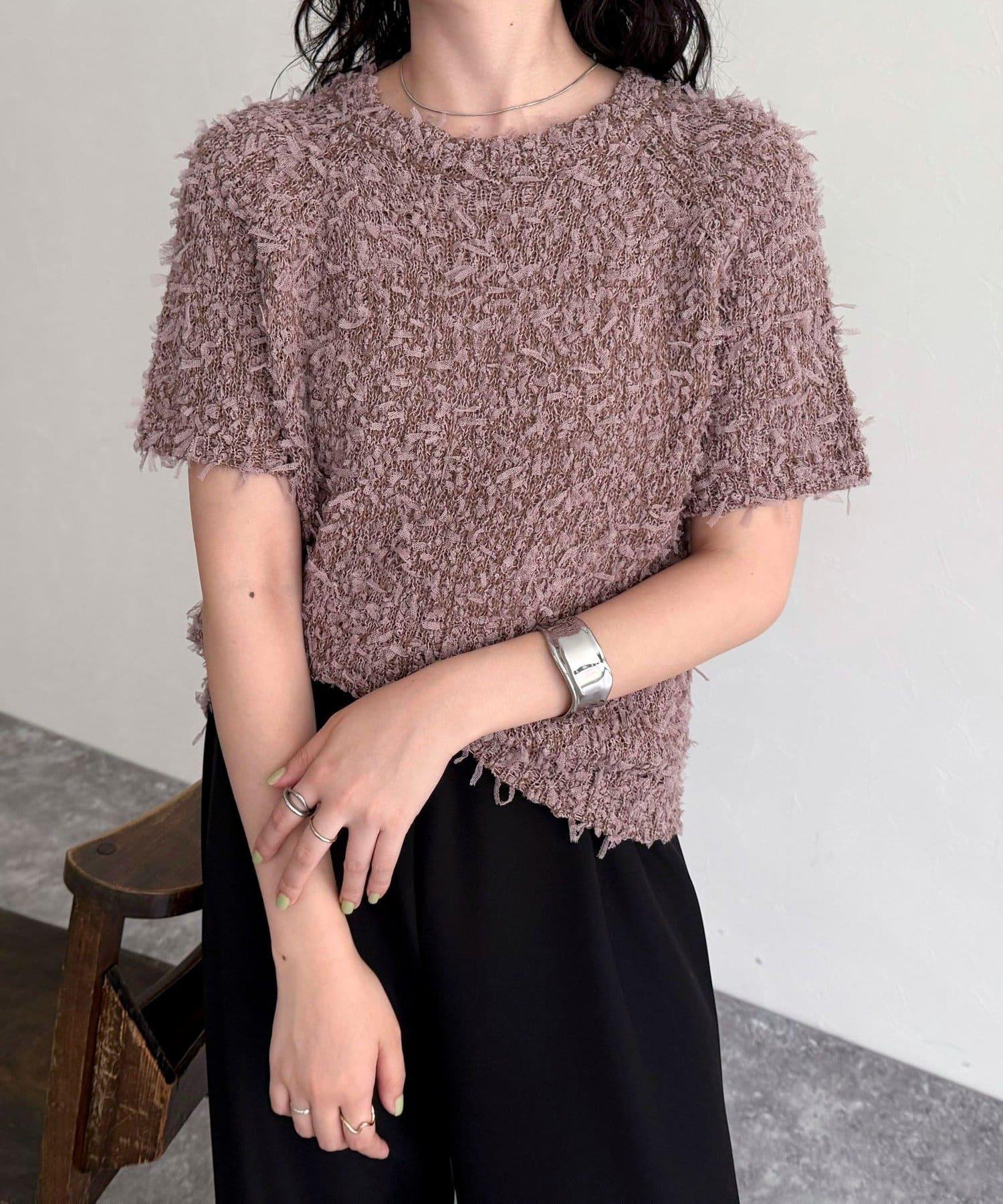這款帶有薄紗帶的短袖針織套頭衫採用了不同材質的時尚混搭。
