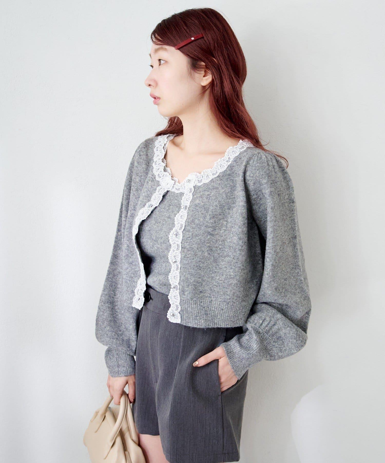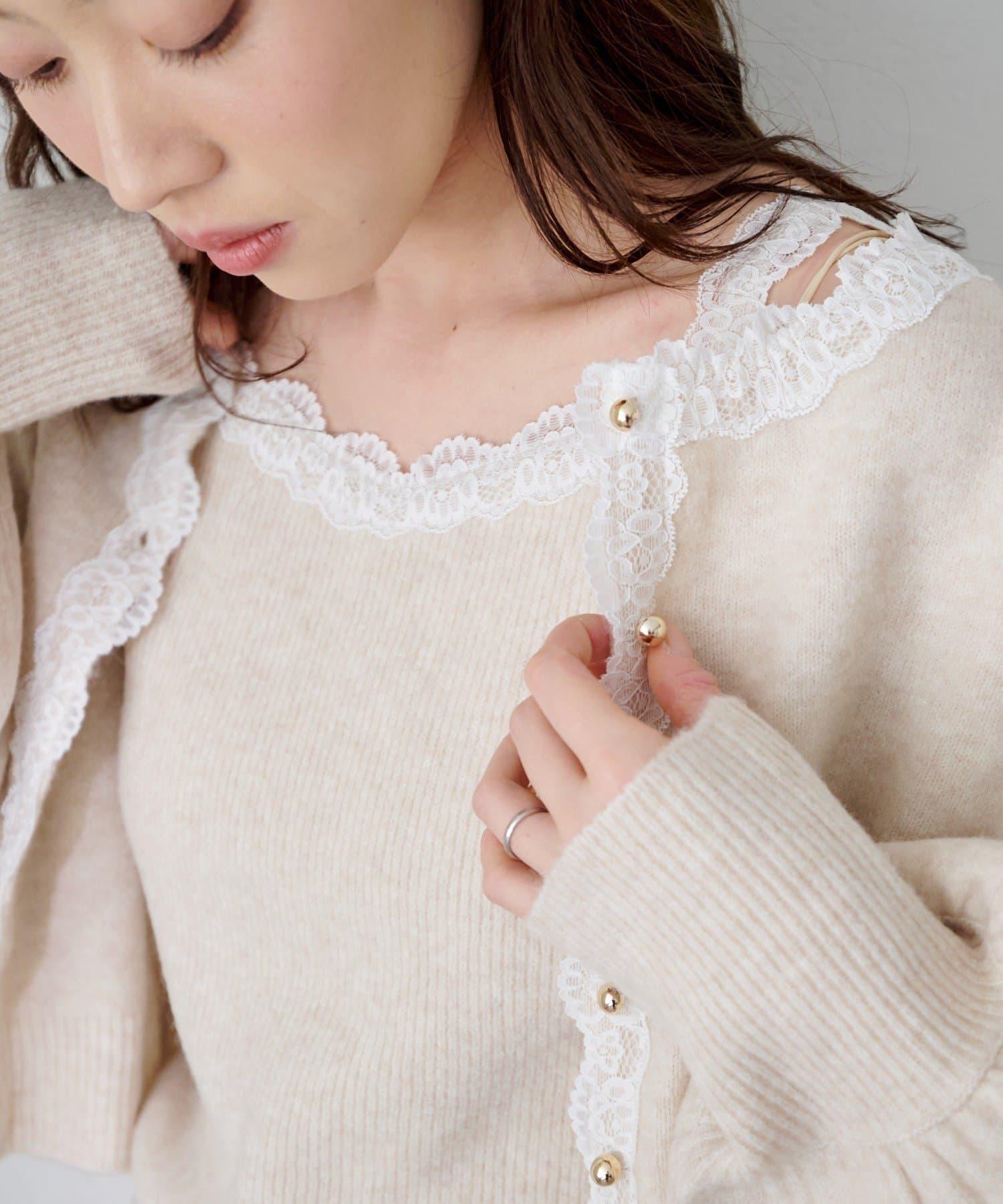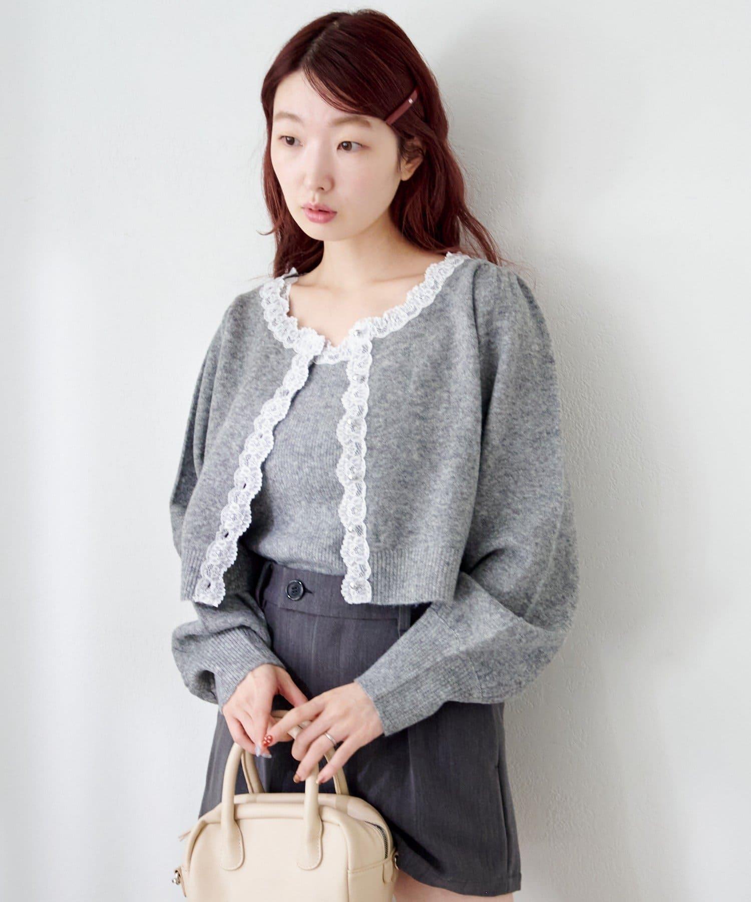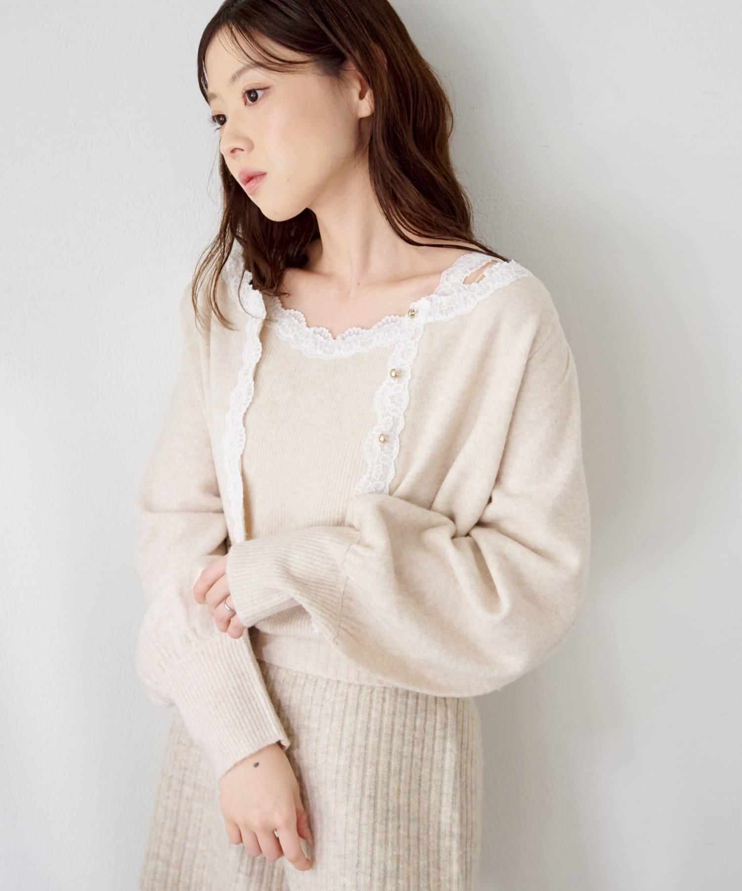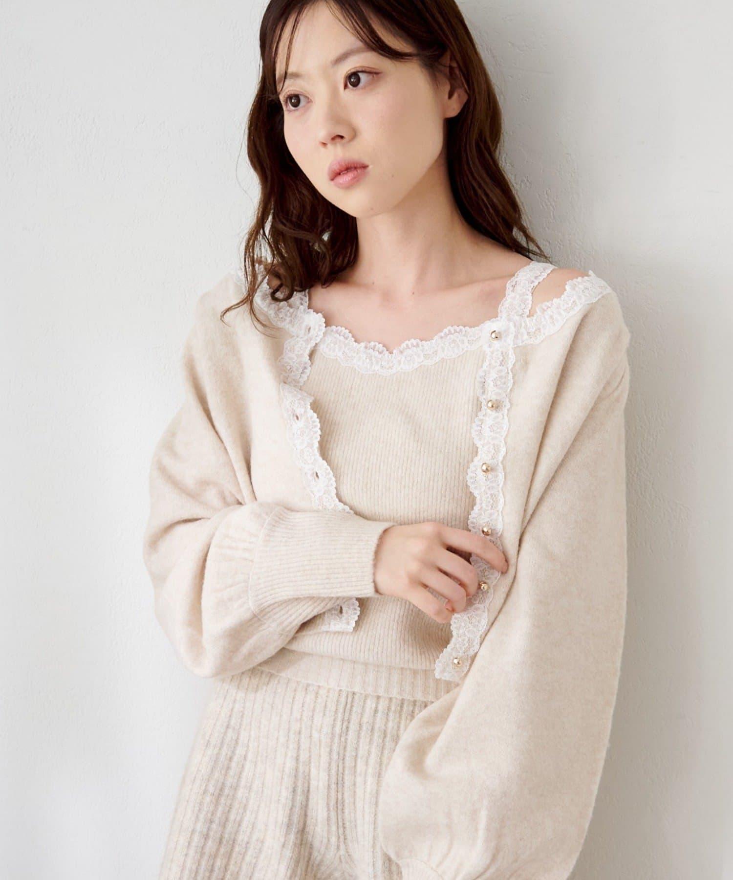 這套女性化的套裝由一件帶有精緻蕾絲的針織吊帶衫和一件同樣材質的開襟羊毛衫組成。