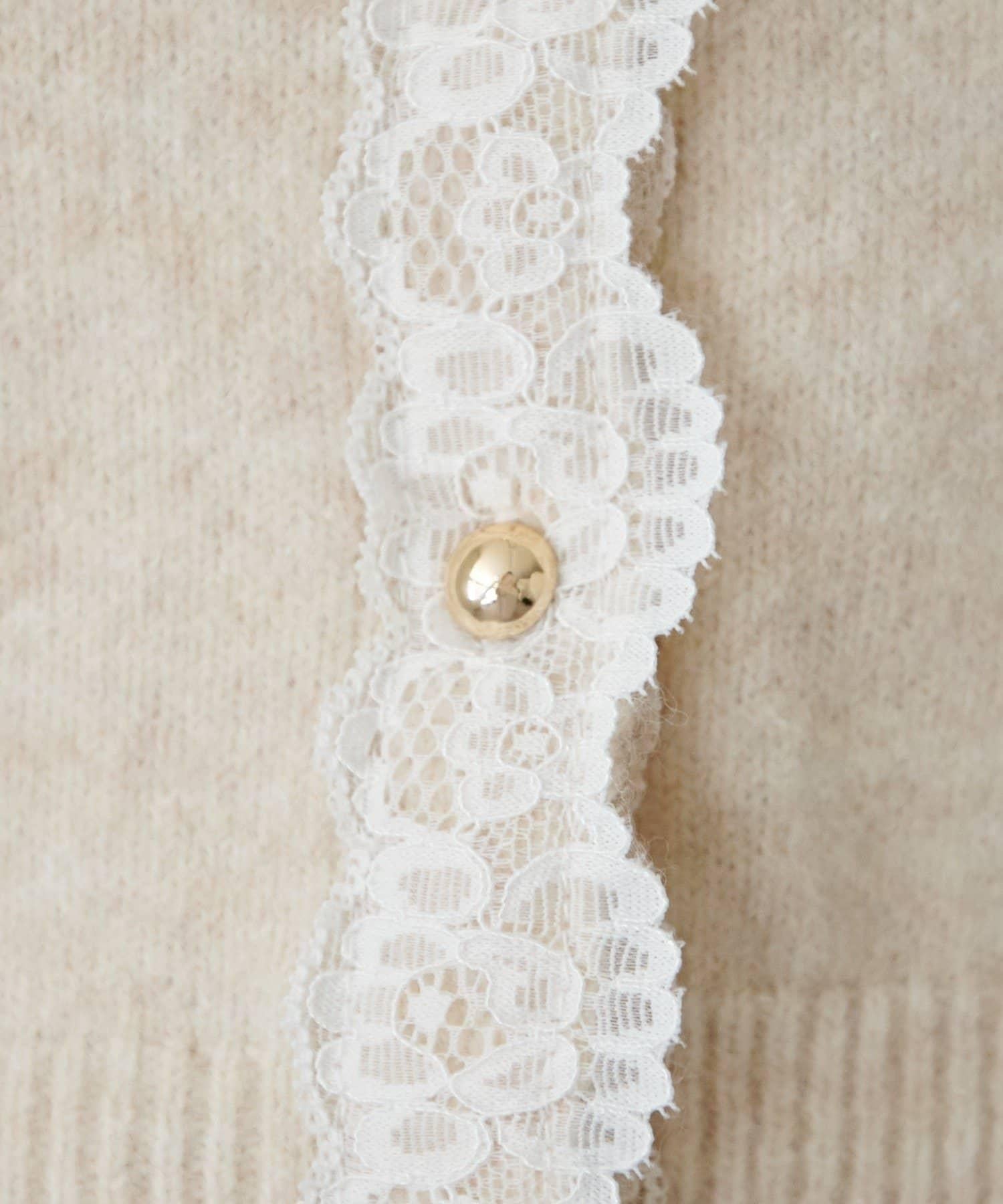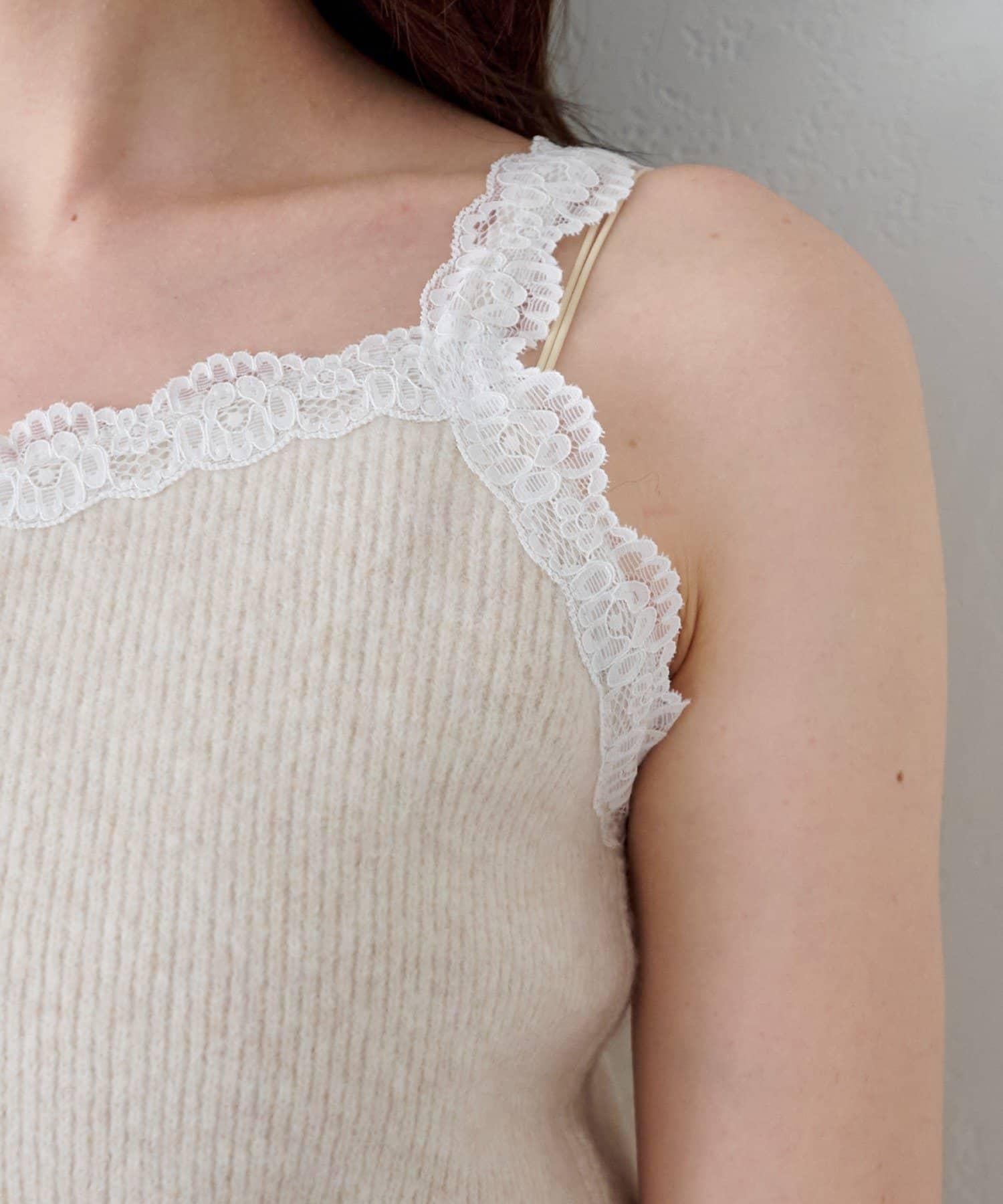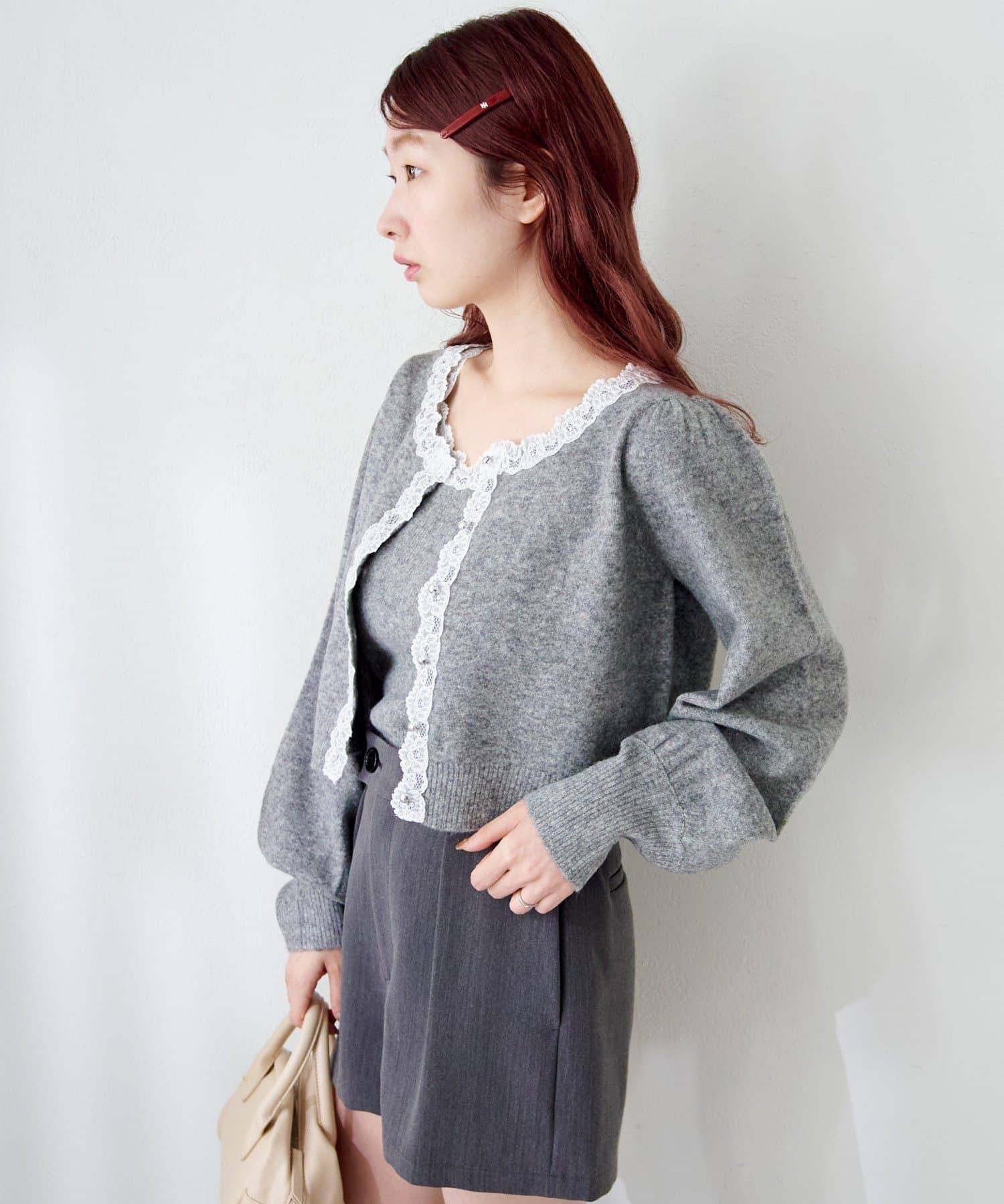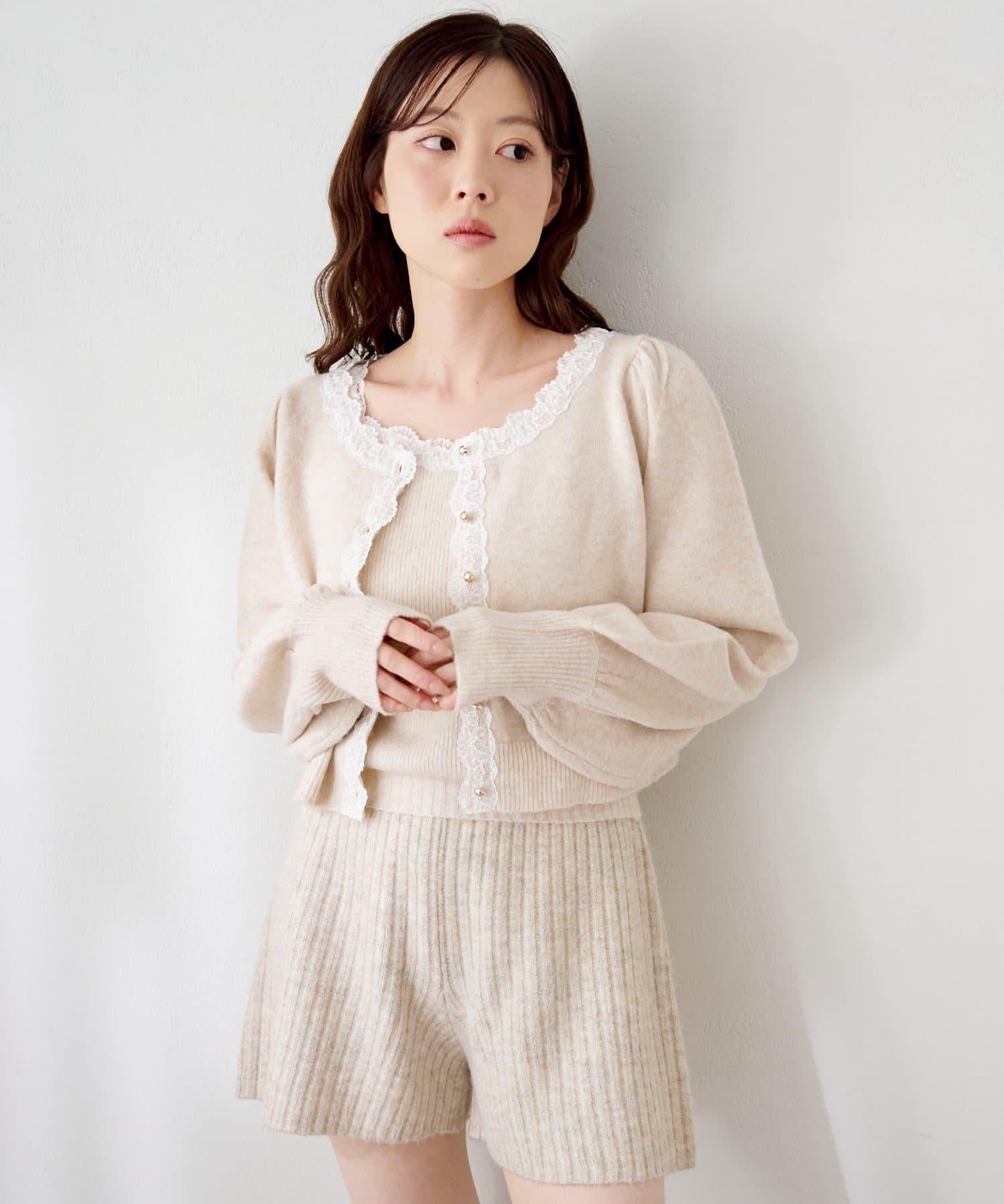 這套女性化的套裝由一件帶有精緻蕾絲的針織吊帶衫和一件同樣材質的開襟羊毛衫組成。