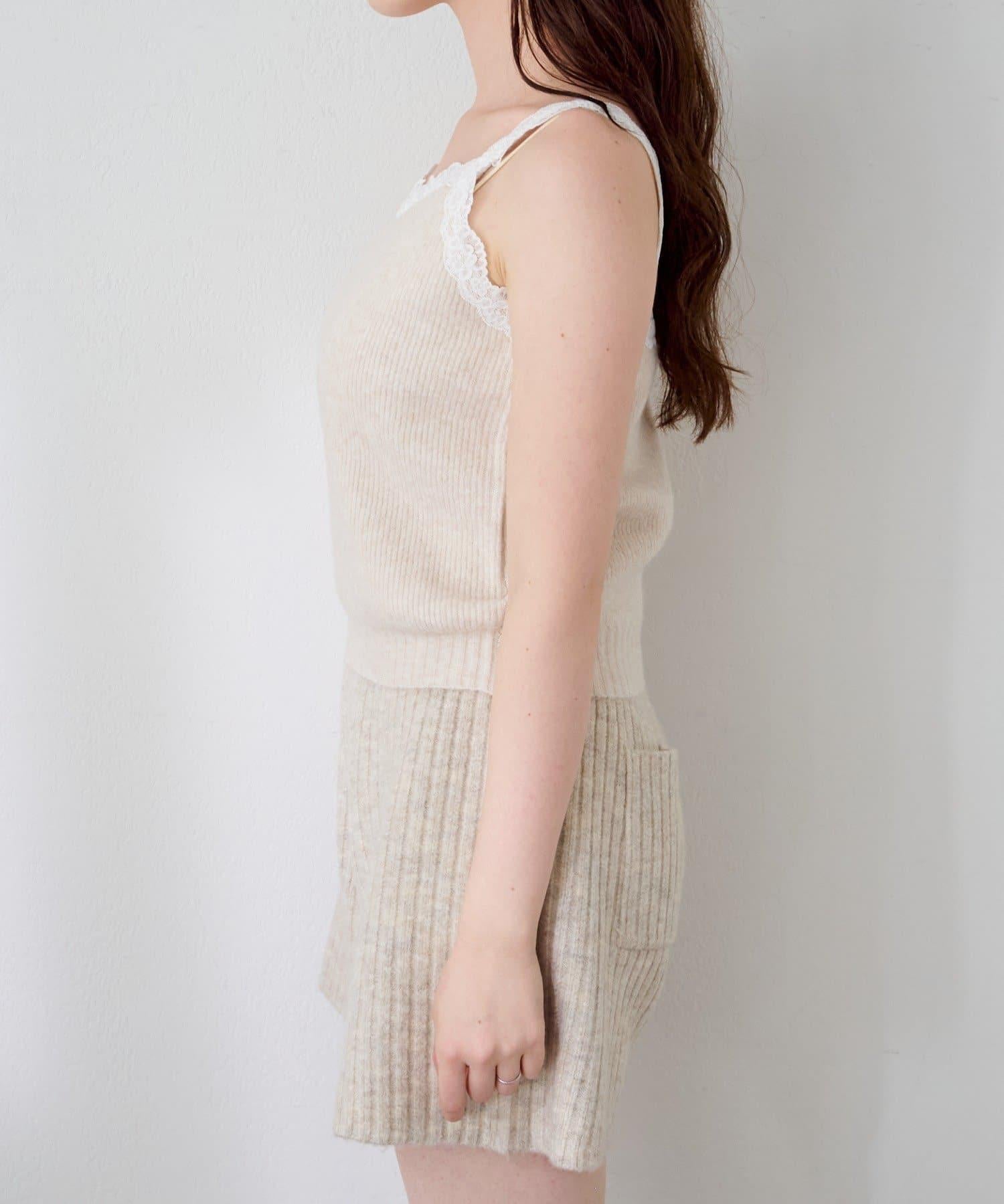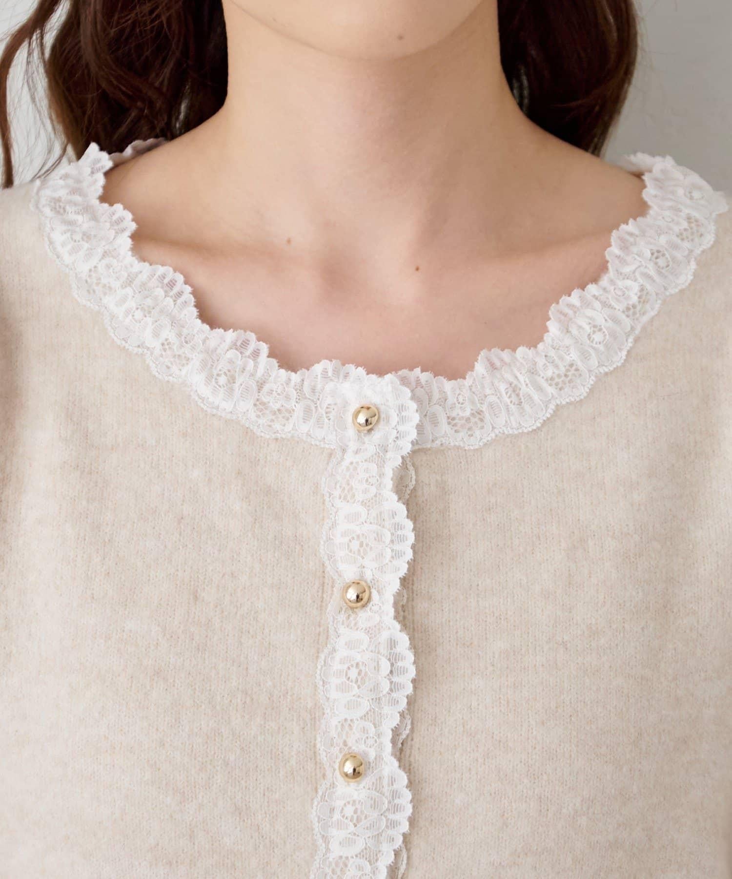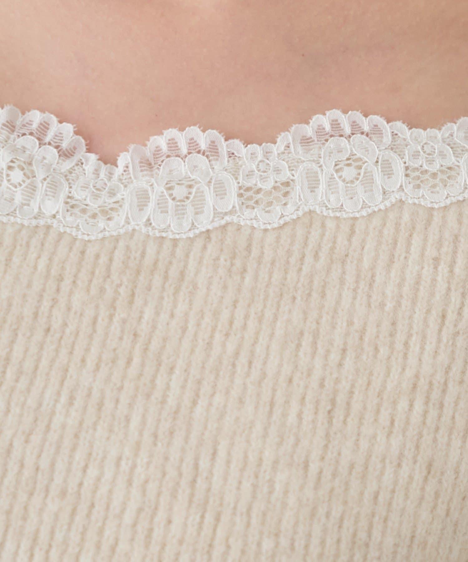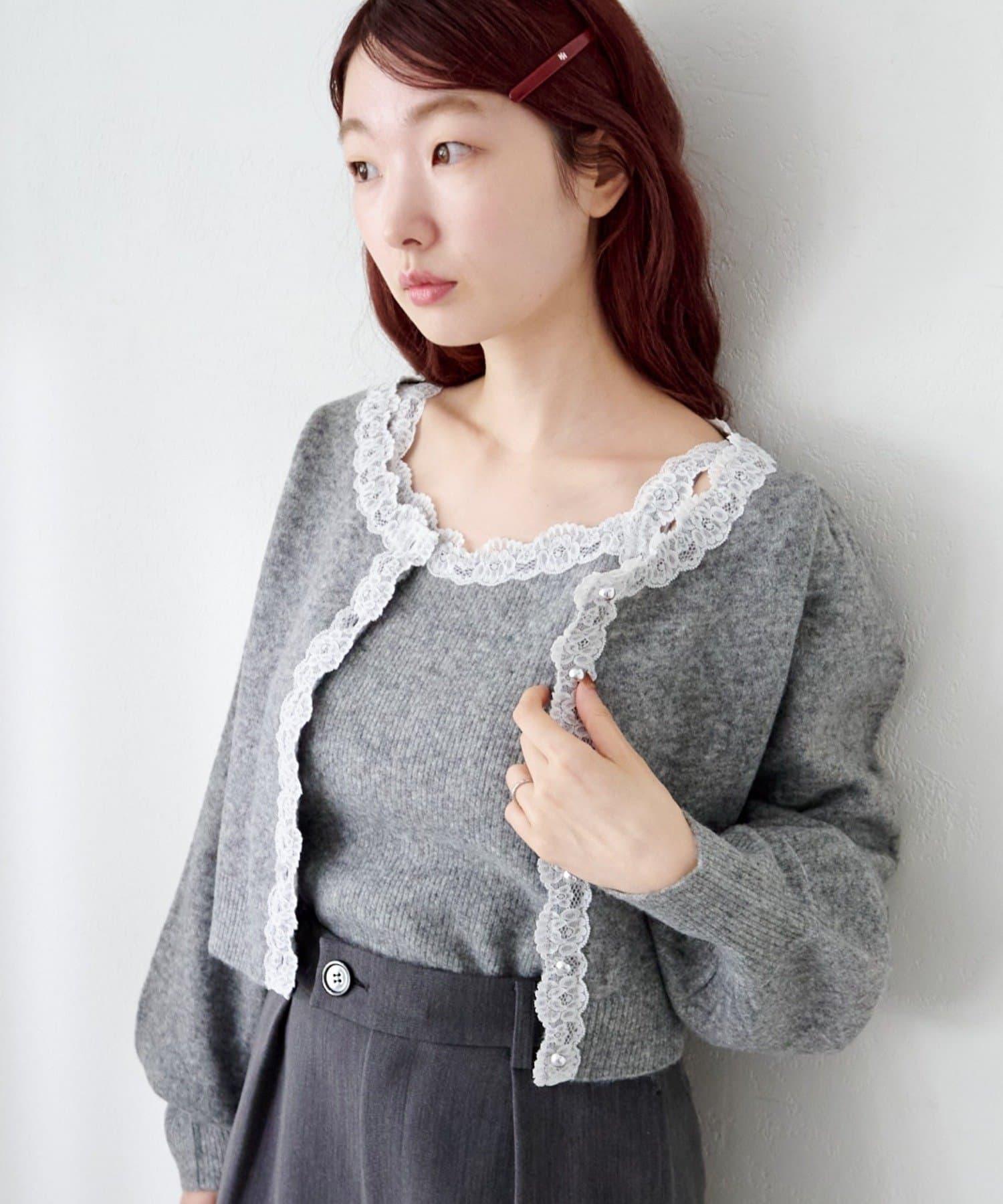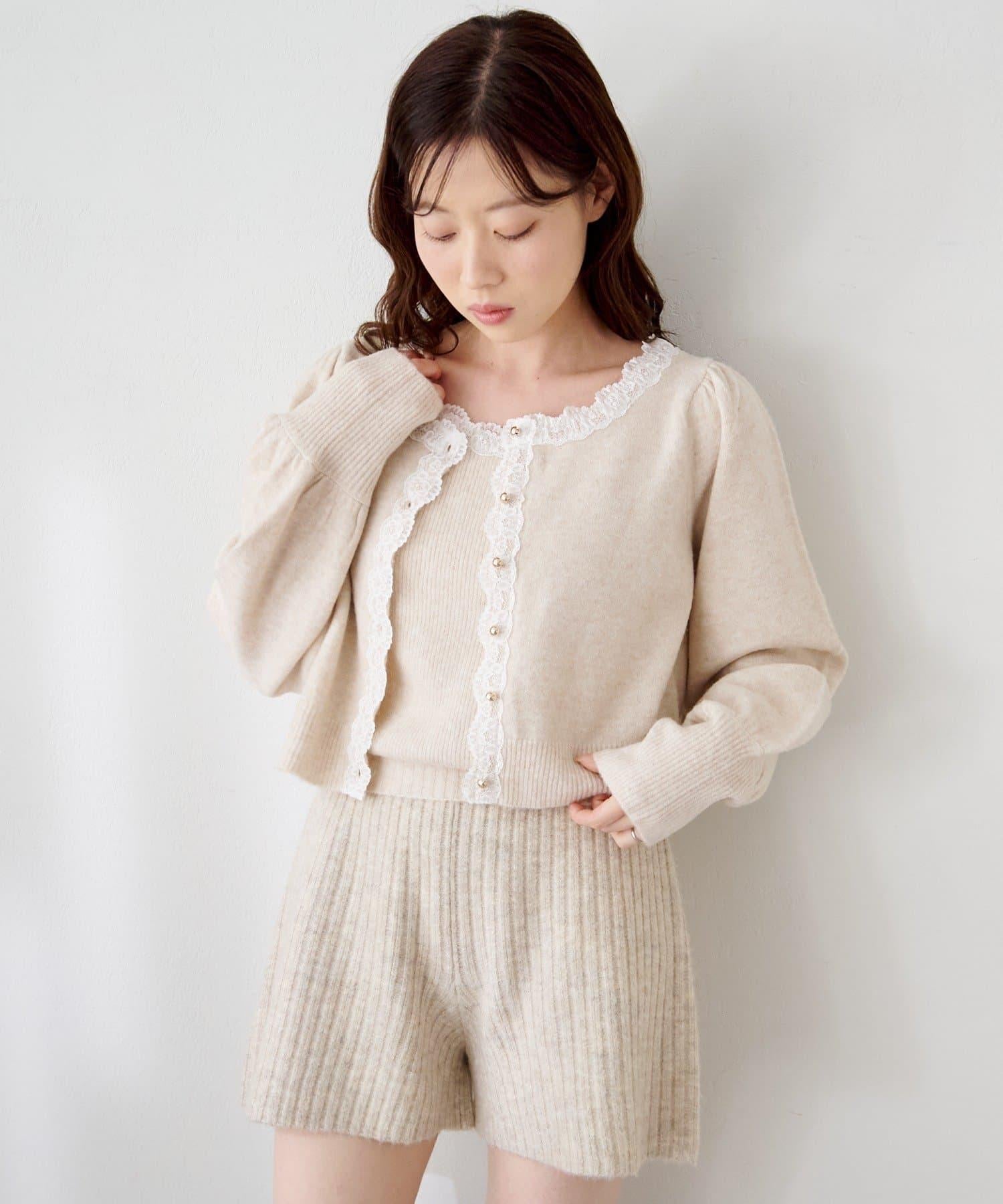 這套女性化的套裝由一件帶有精緻蕾絲的針織吊帶衫和一件同樣材質的開襟羊毛衫組成。