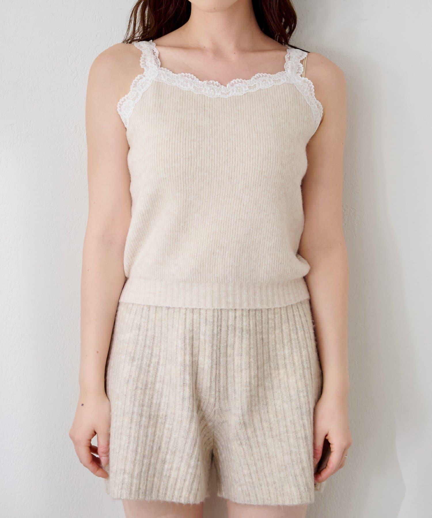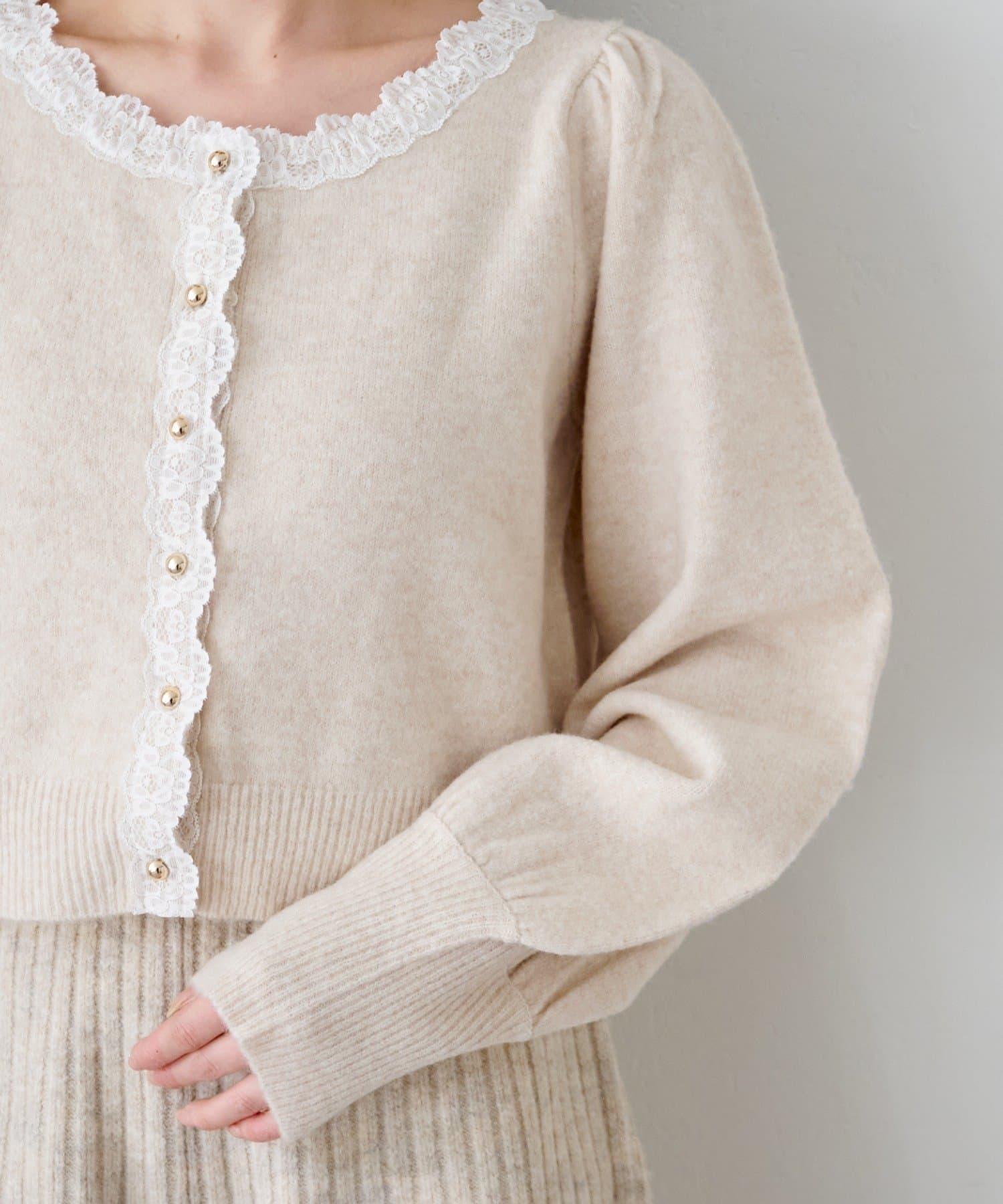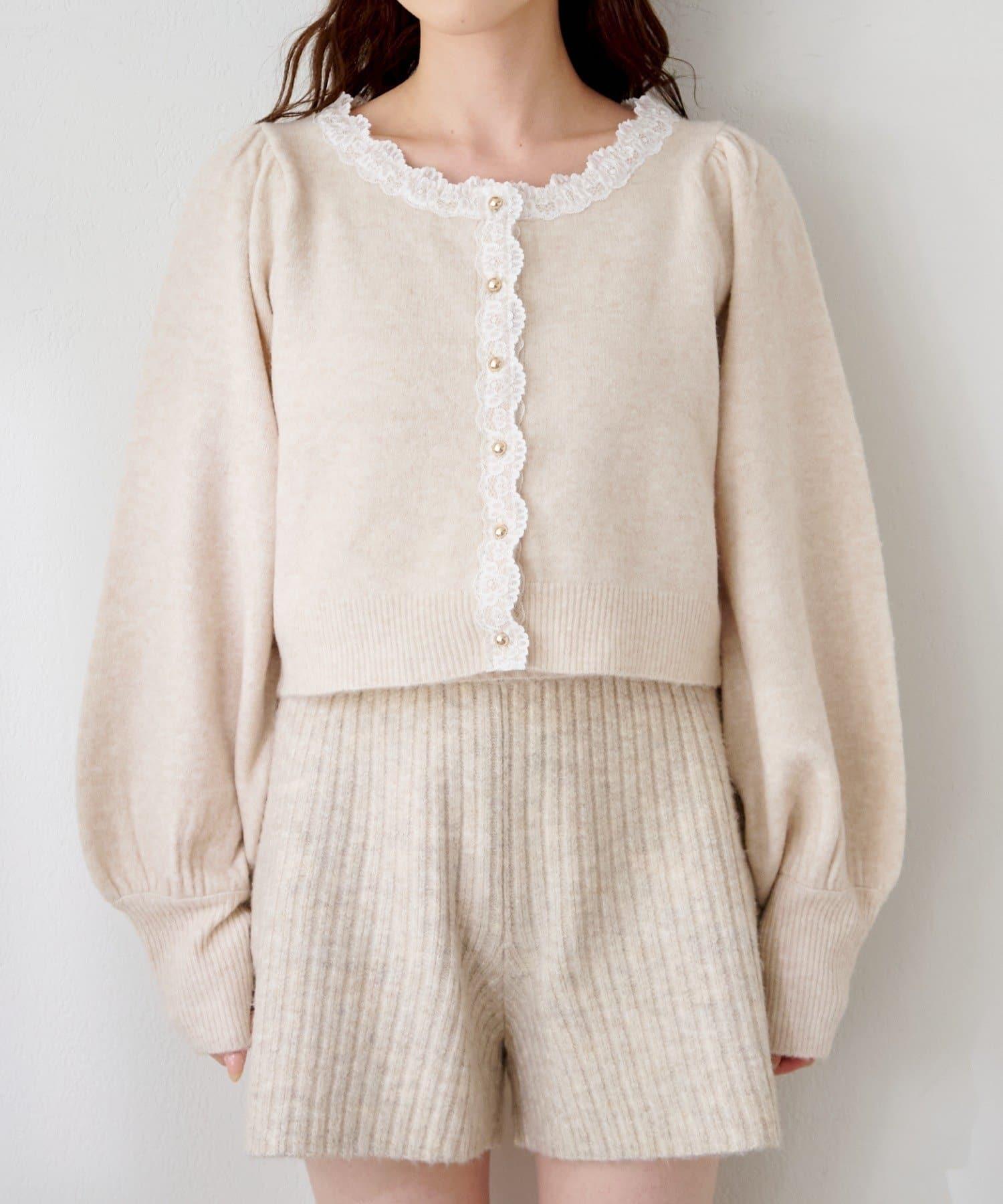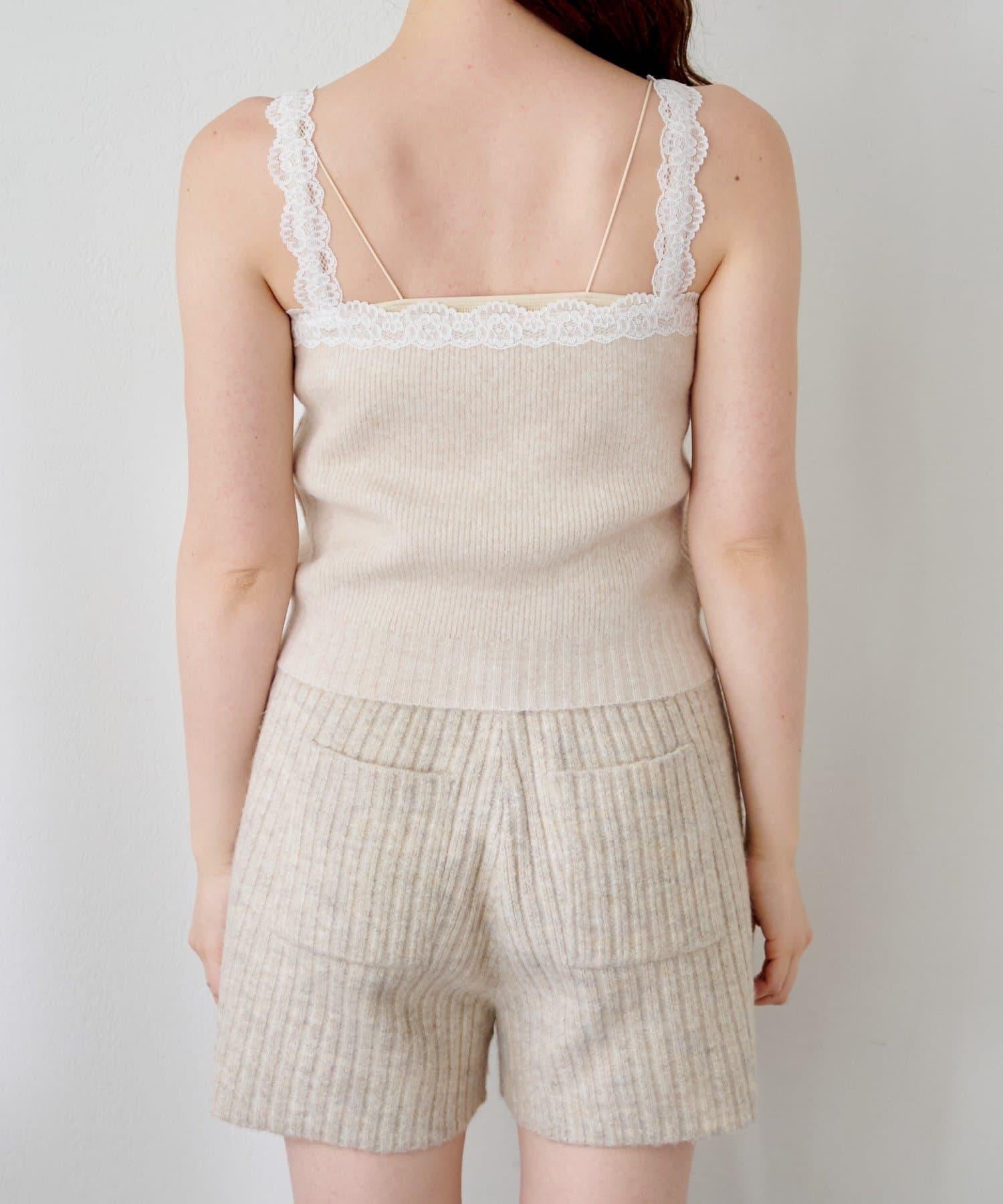 這套女性化的套裝由一件帶有精緻蕾絲的針織吊帶衫和一件同樣材質的開襟羊毛衫組成。