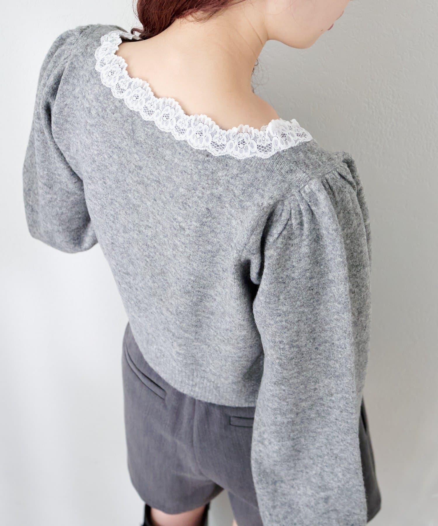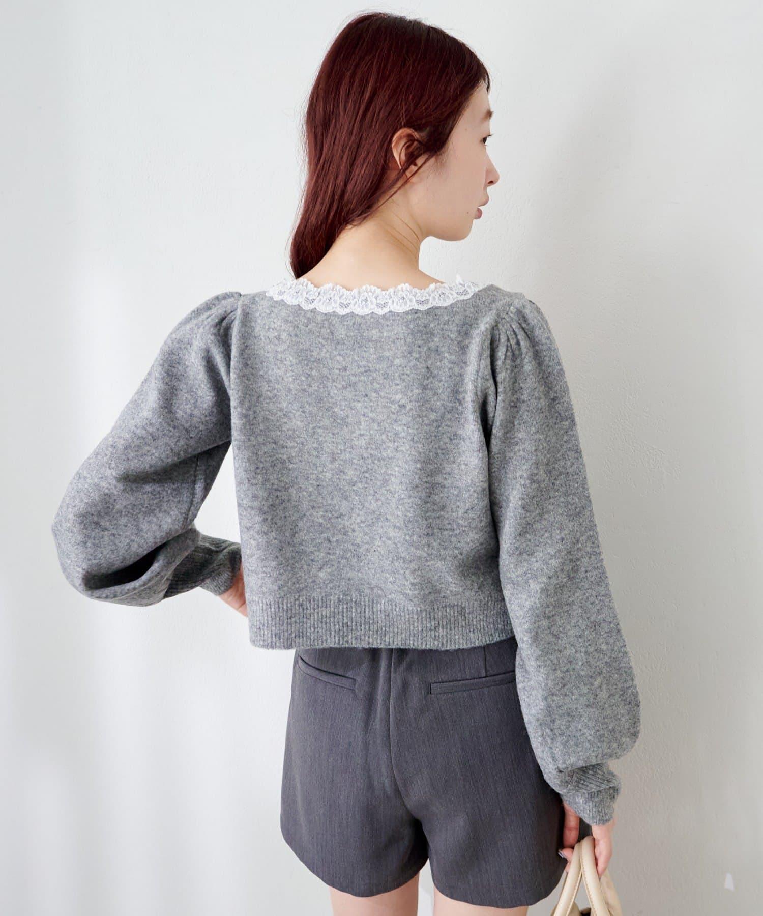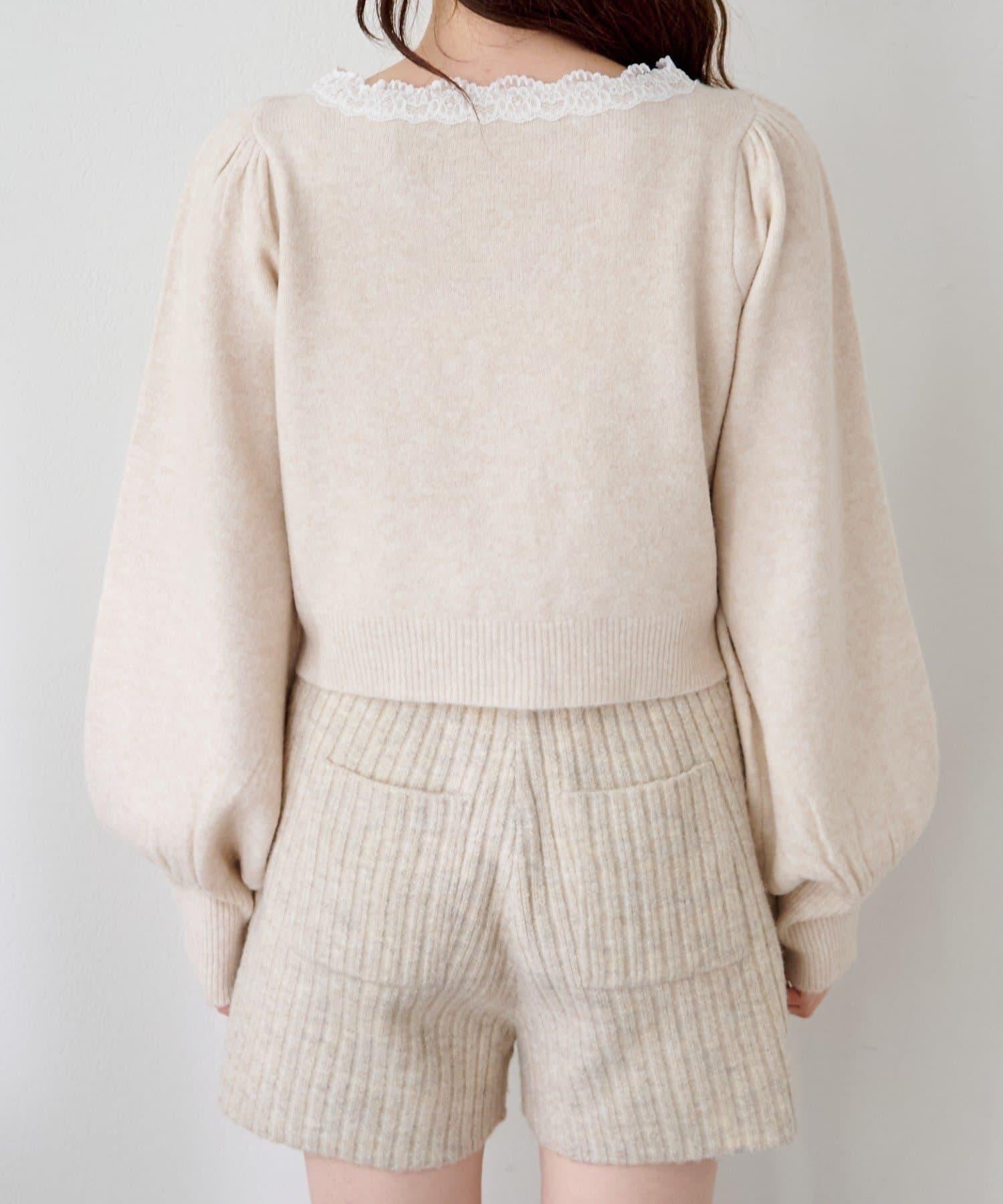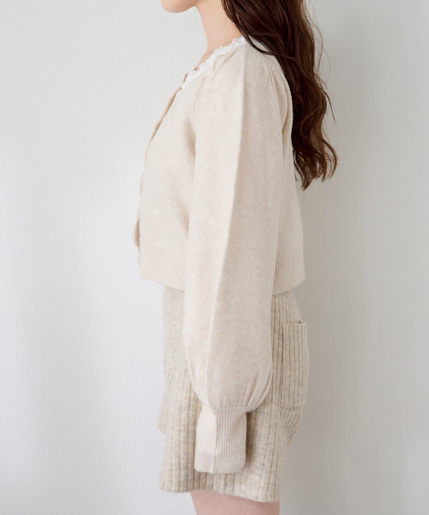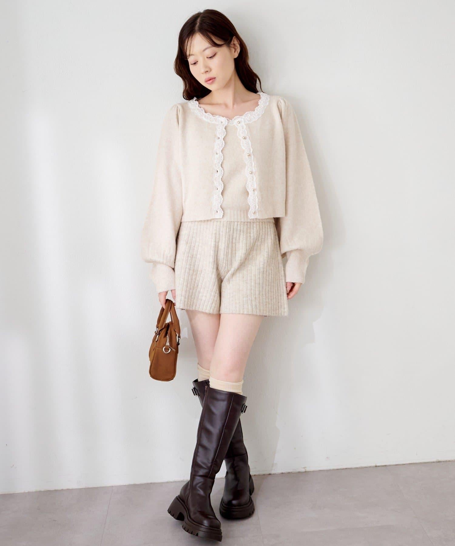 這套女性化的套裝由一件帶有精緻蕾絲的針織吊帶衫和一件同樣材質的開襟羊毛衫組成。
