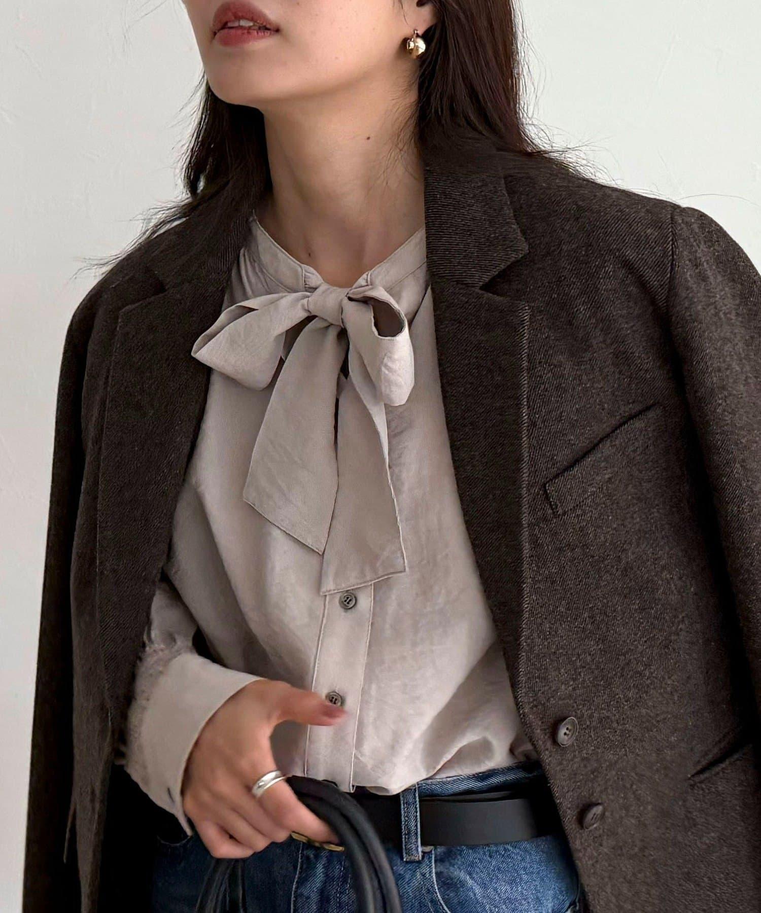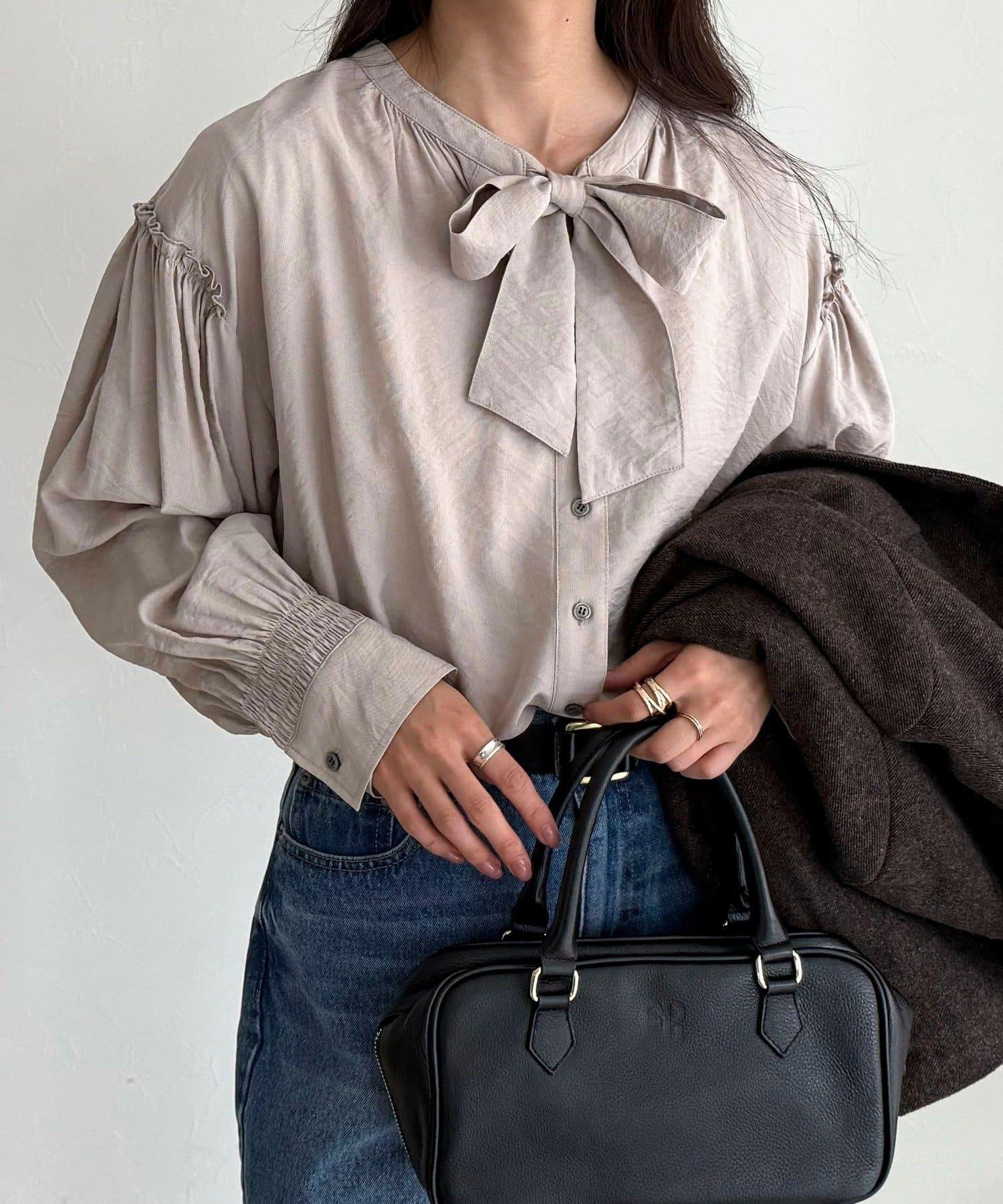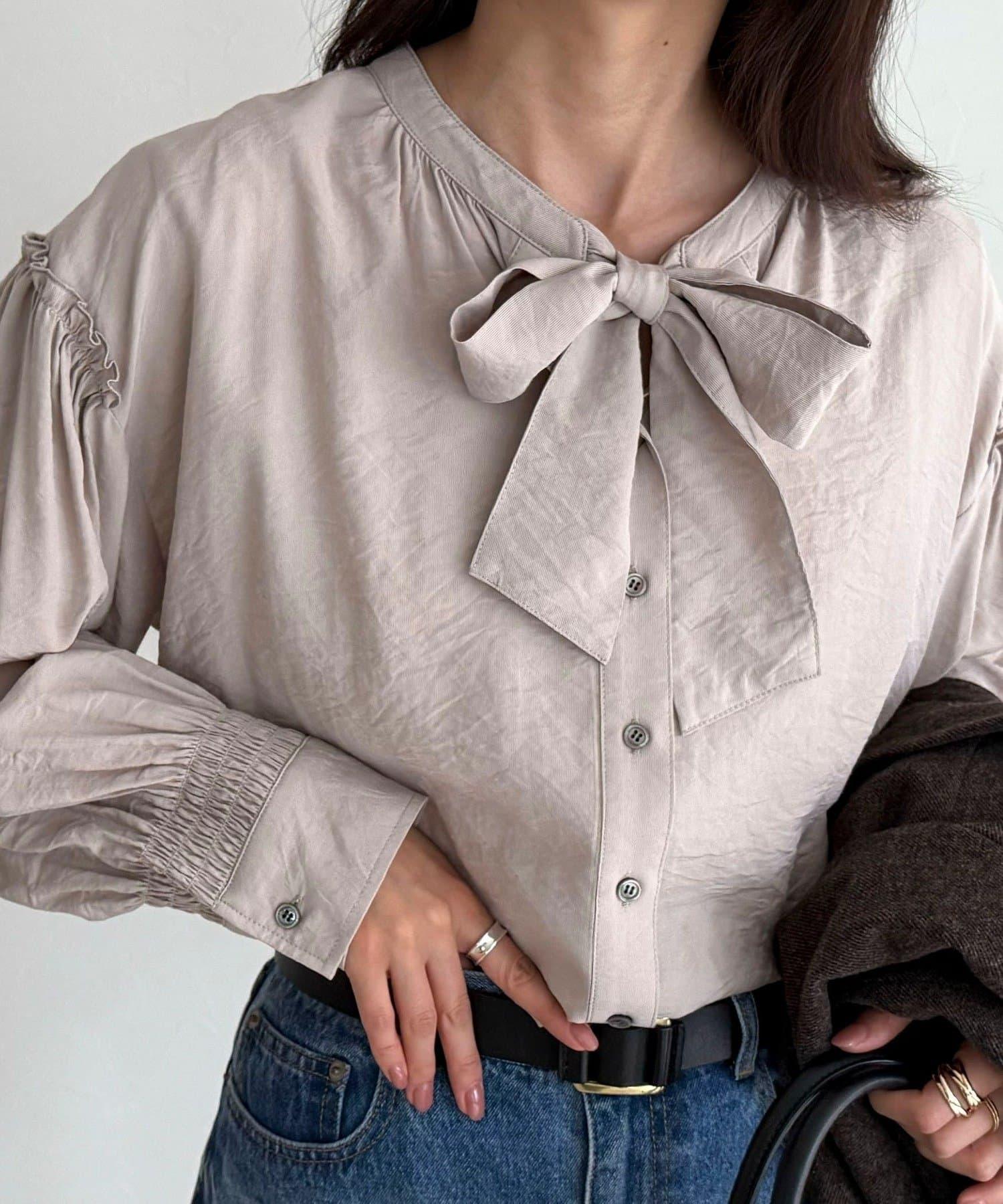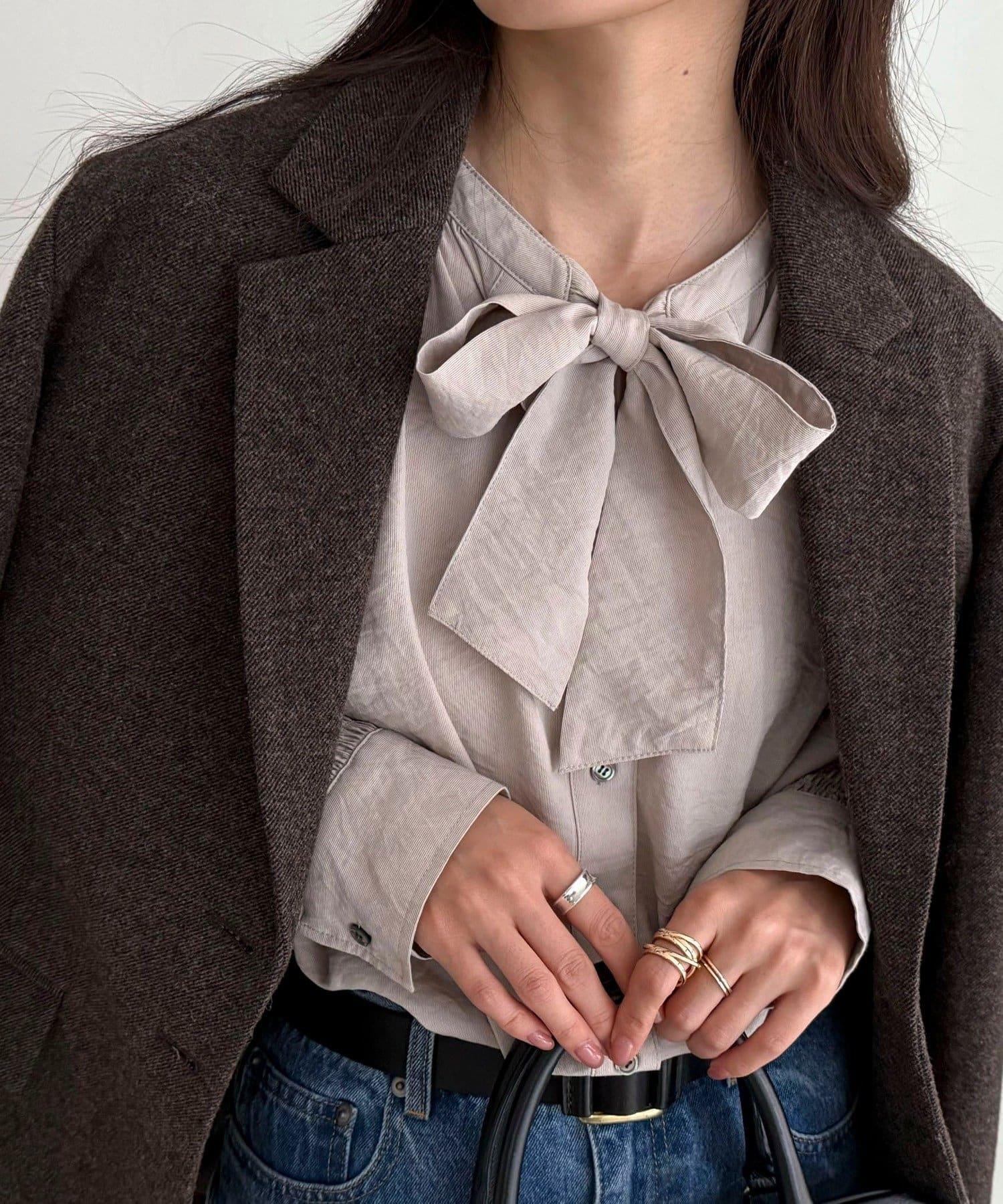 蝴蝶結領結和衣領周圍的褶皺設計,讓這件襯衫看起來女性味十足,魅力十足。