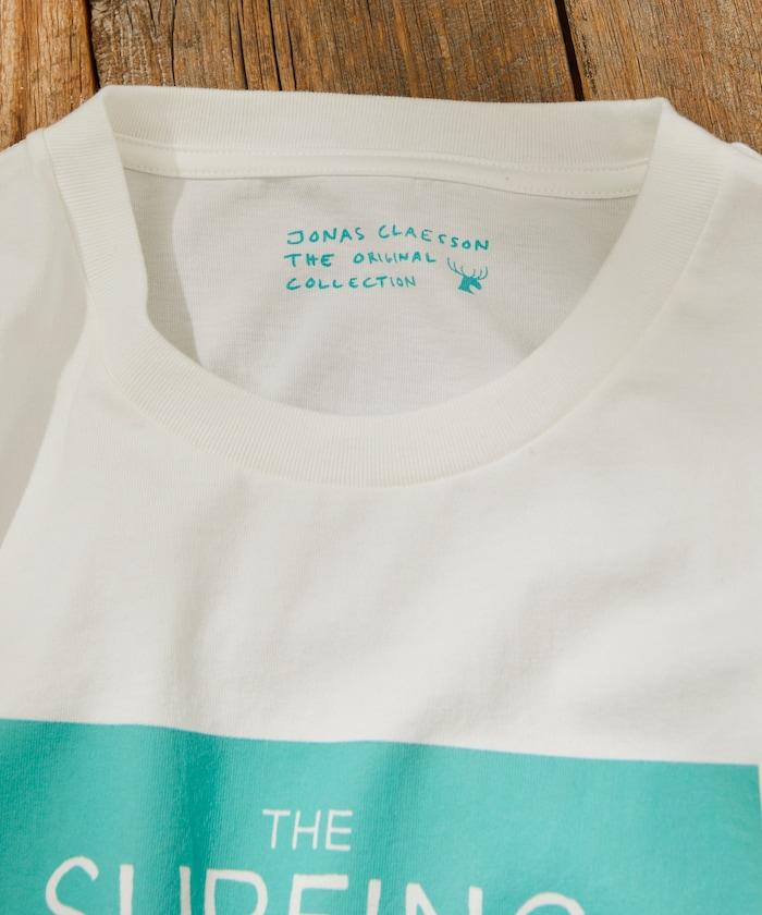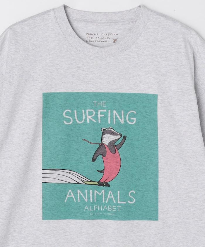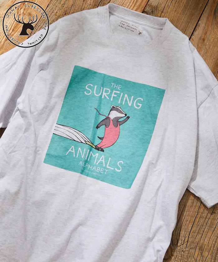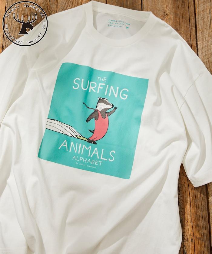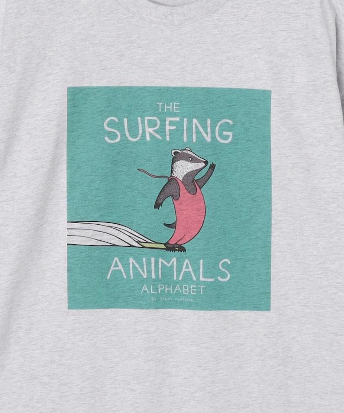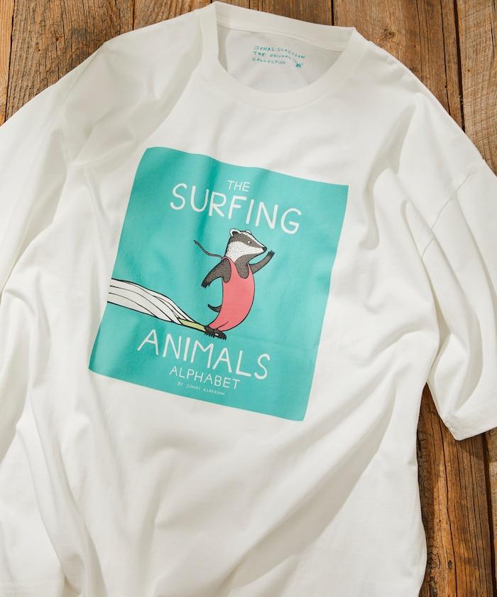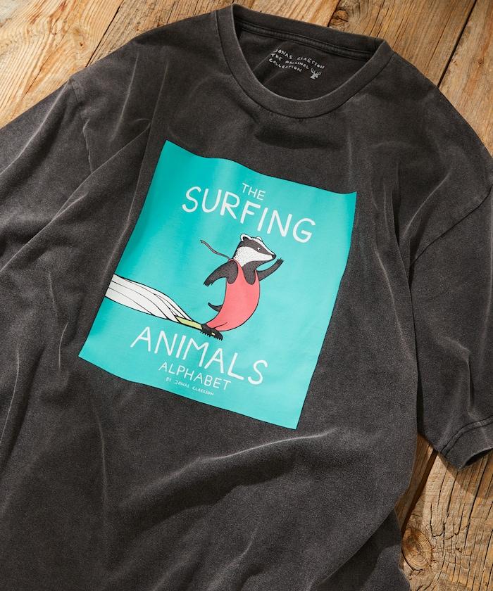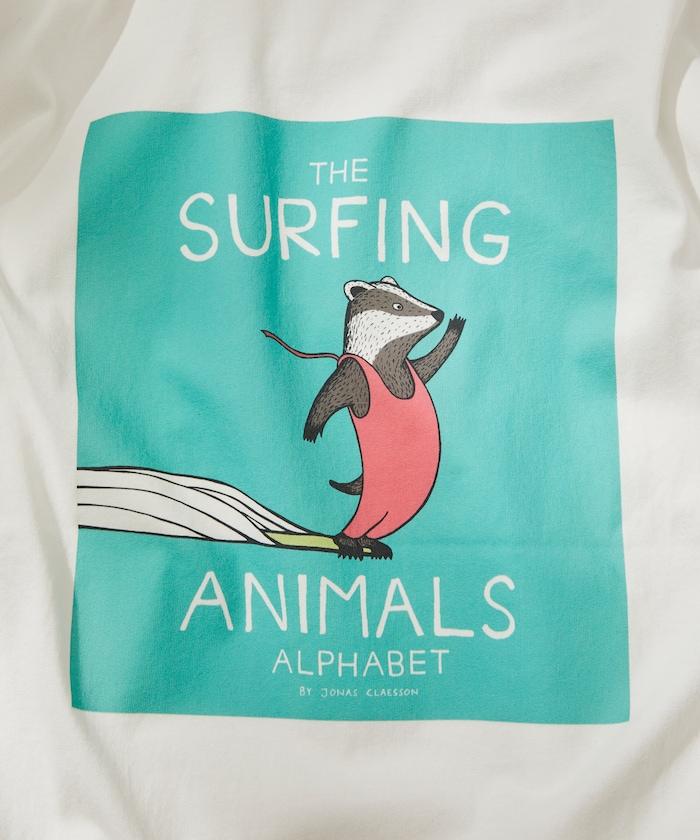該系列正面印有喬納斯-克萊松的繪本項目 "SURFING ANIMALS "的大尺寸印花,染色印花強調質感和設計感。