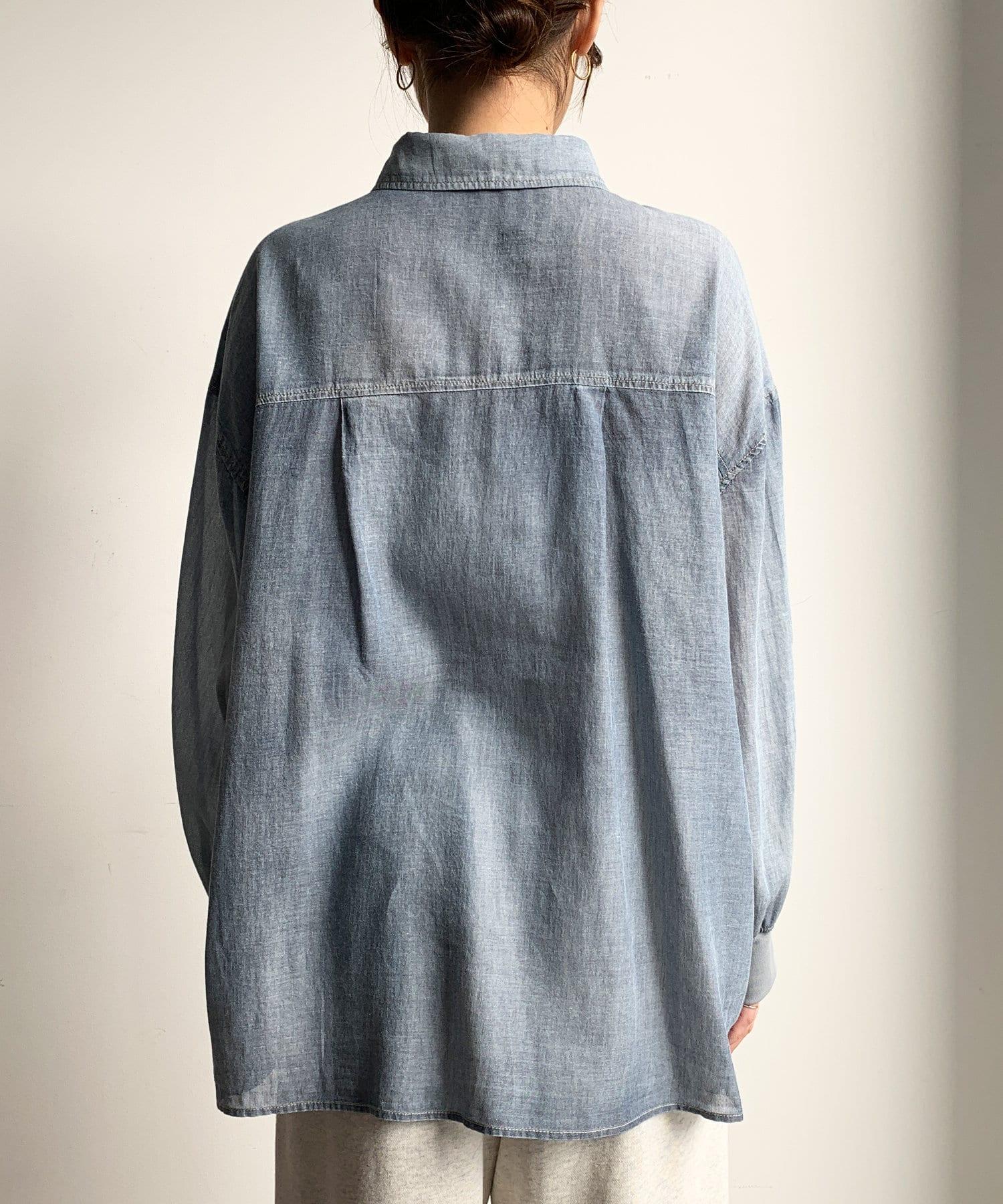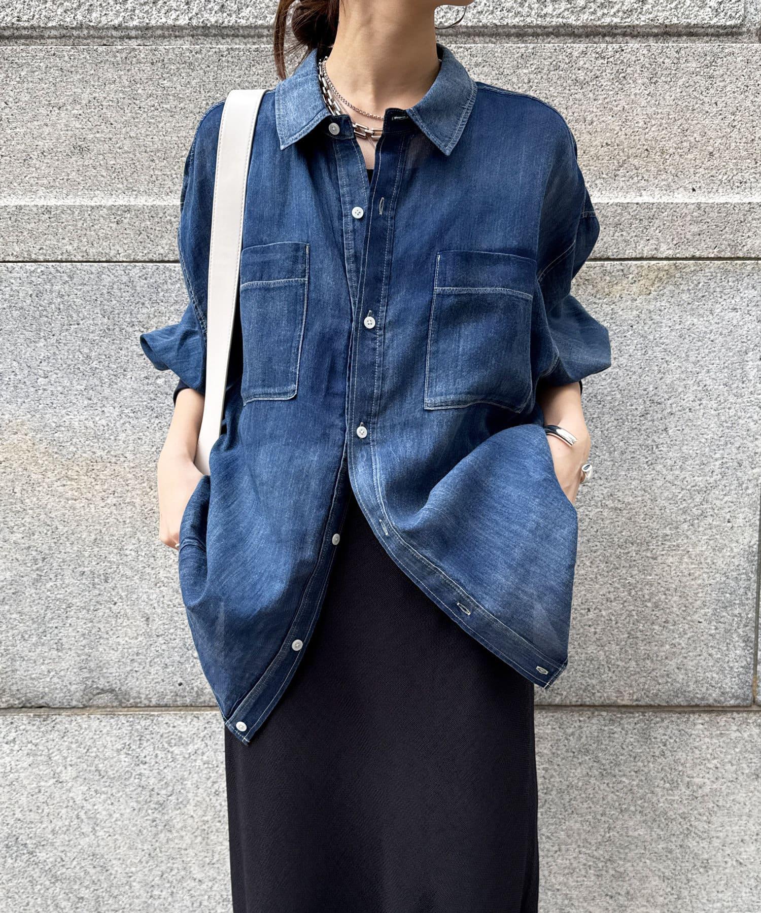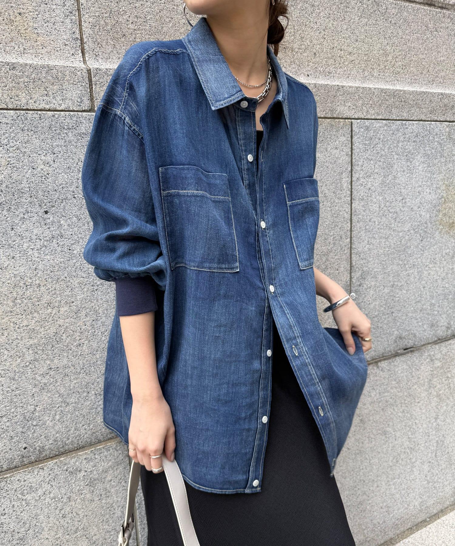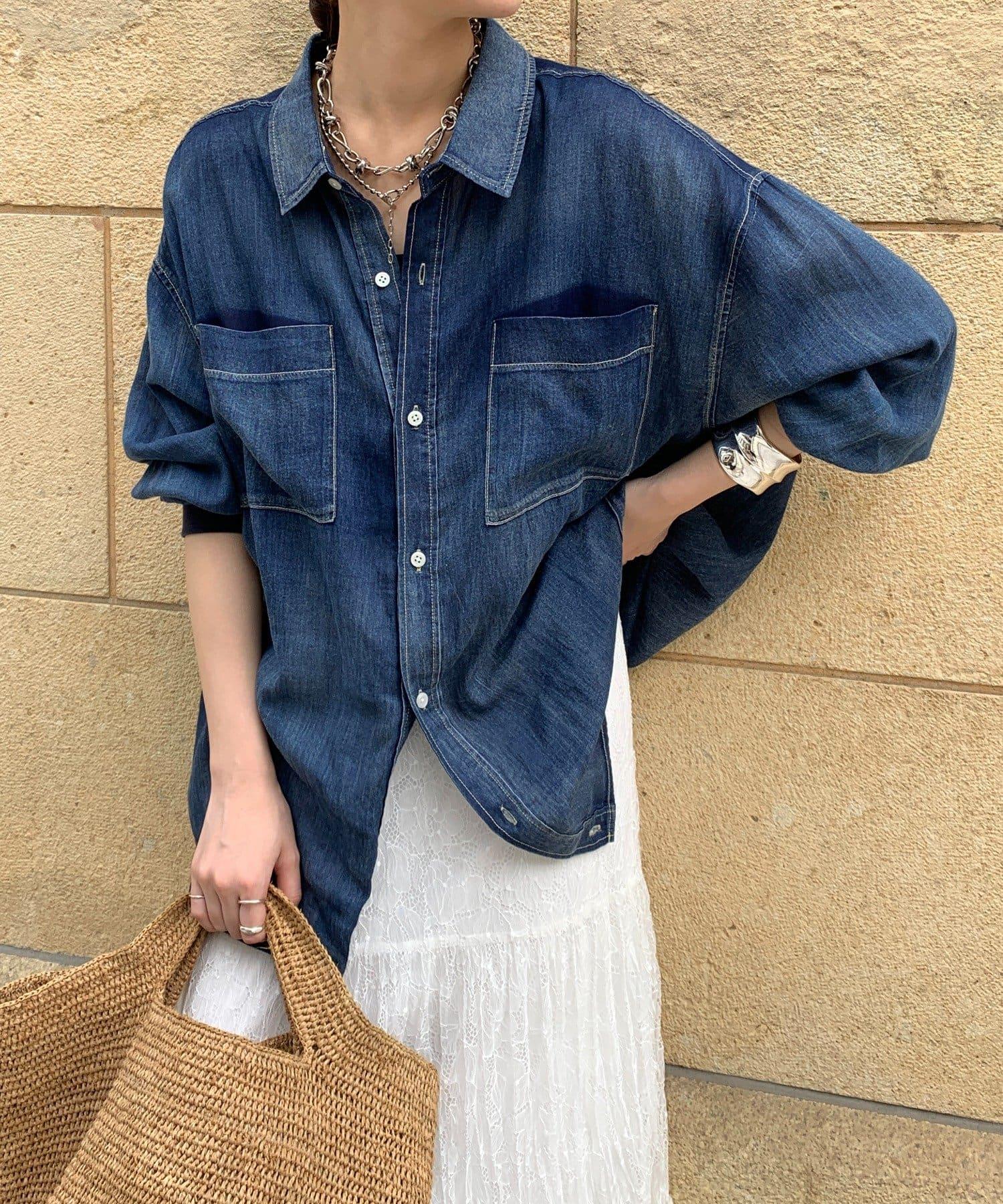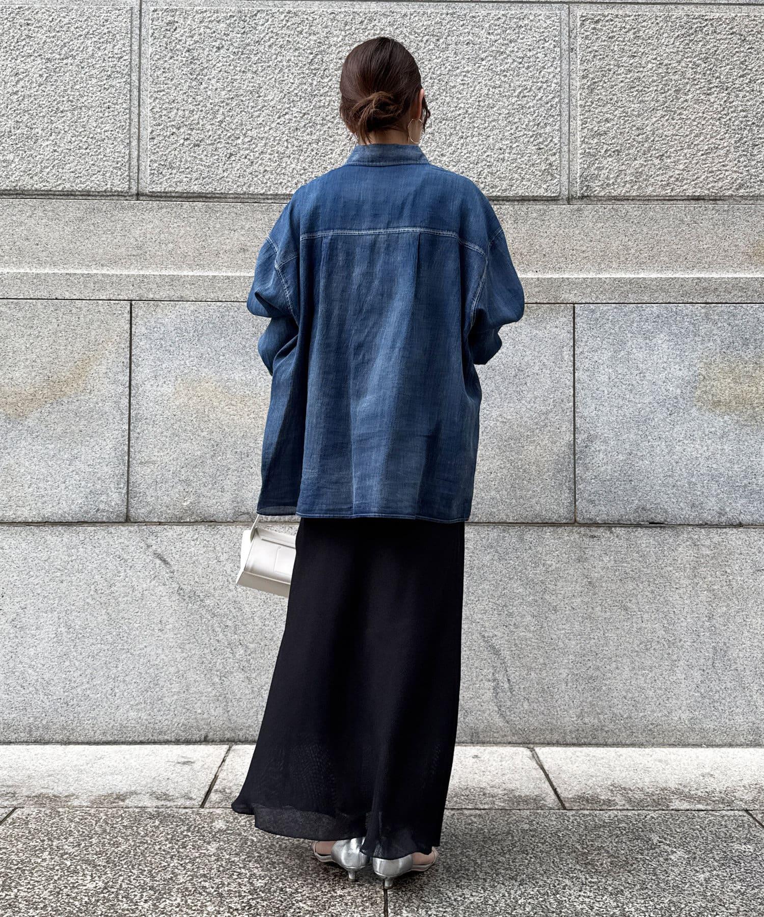 牛仔襯衫採用透視牛仔布料,給人耳目一新的感覺。