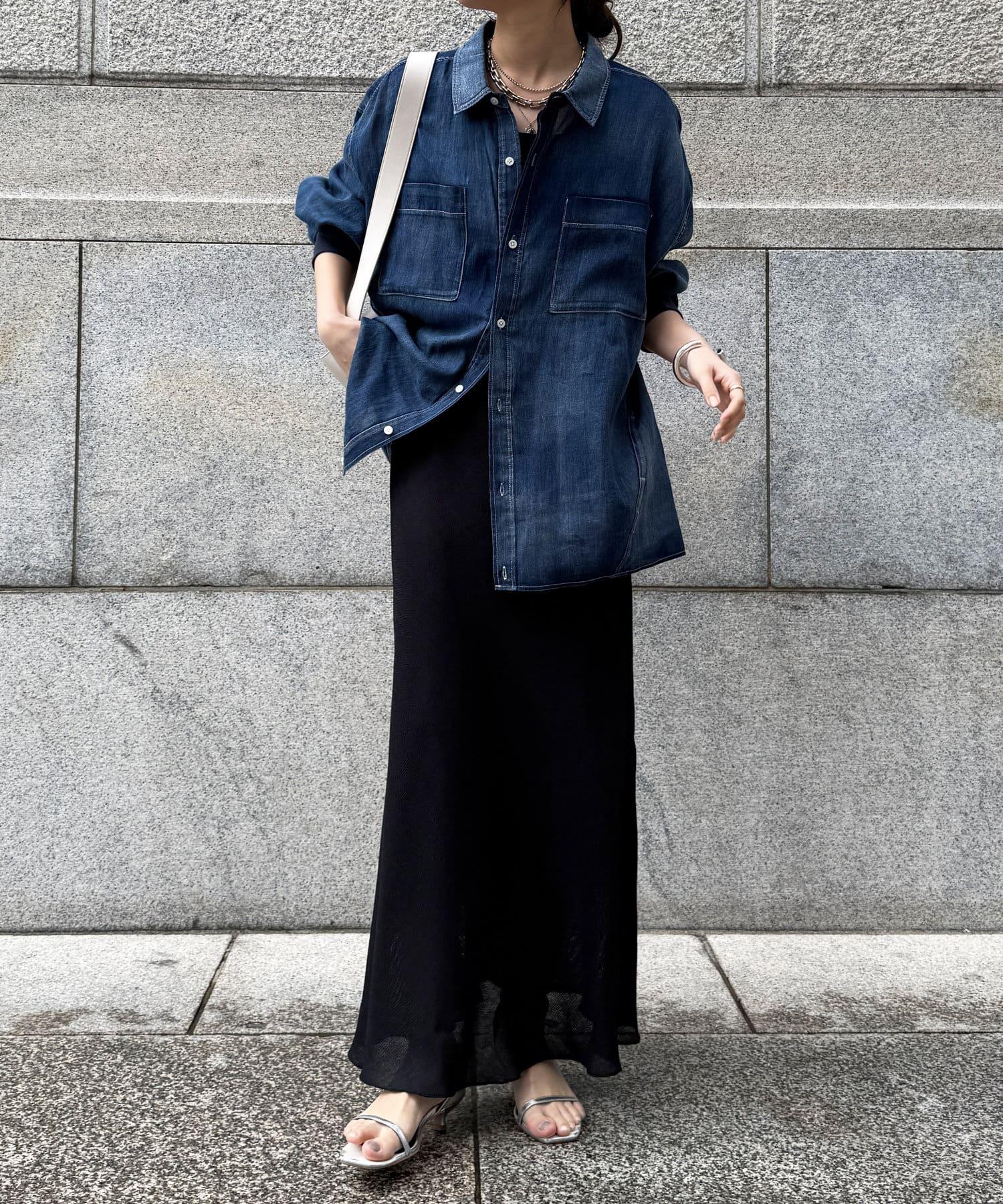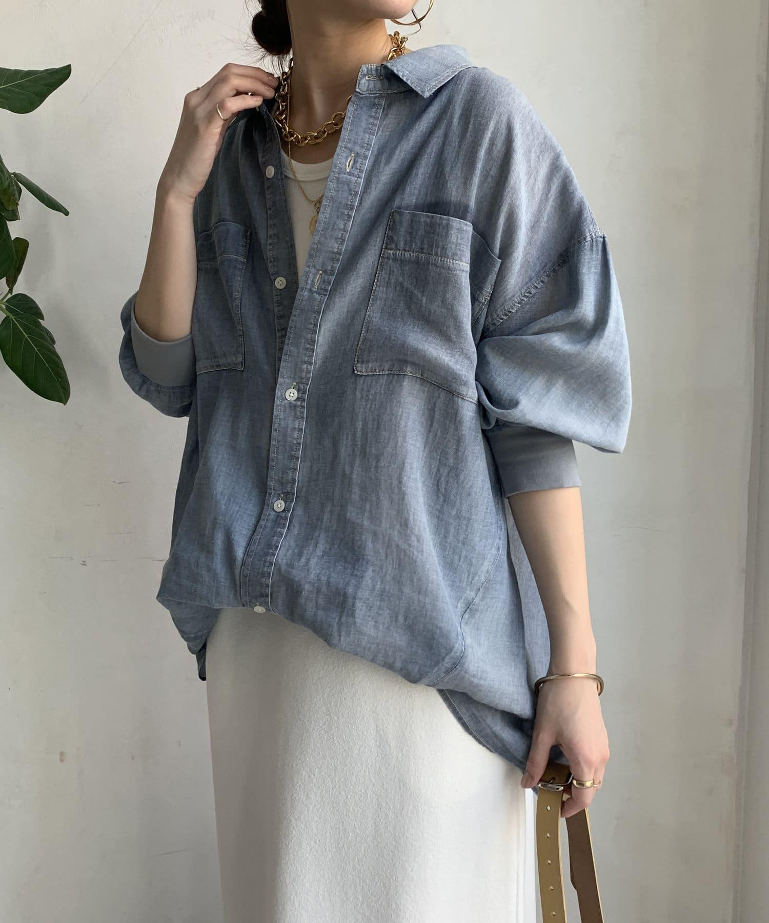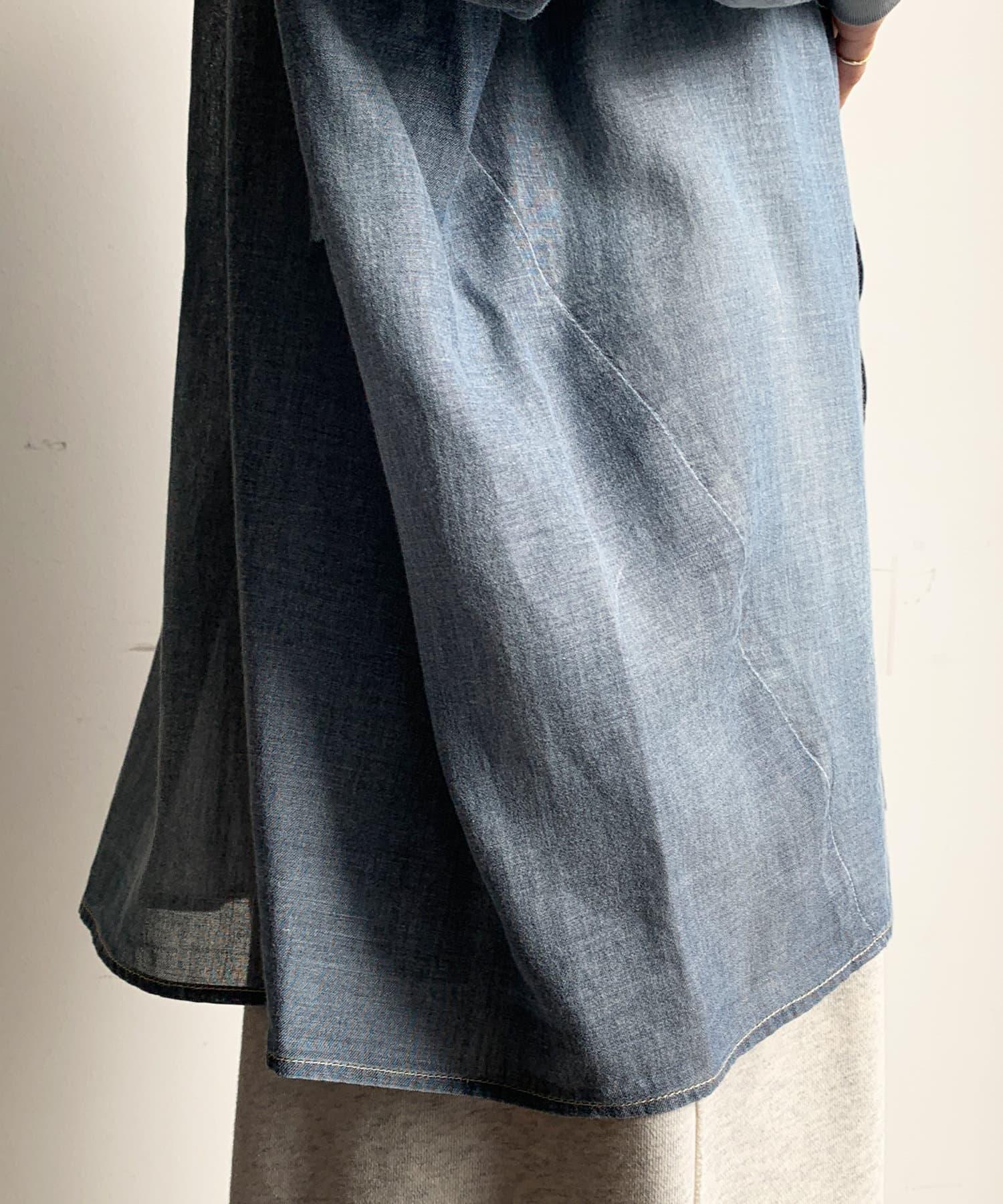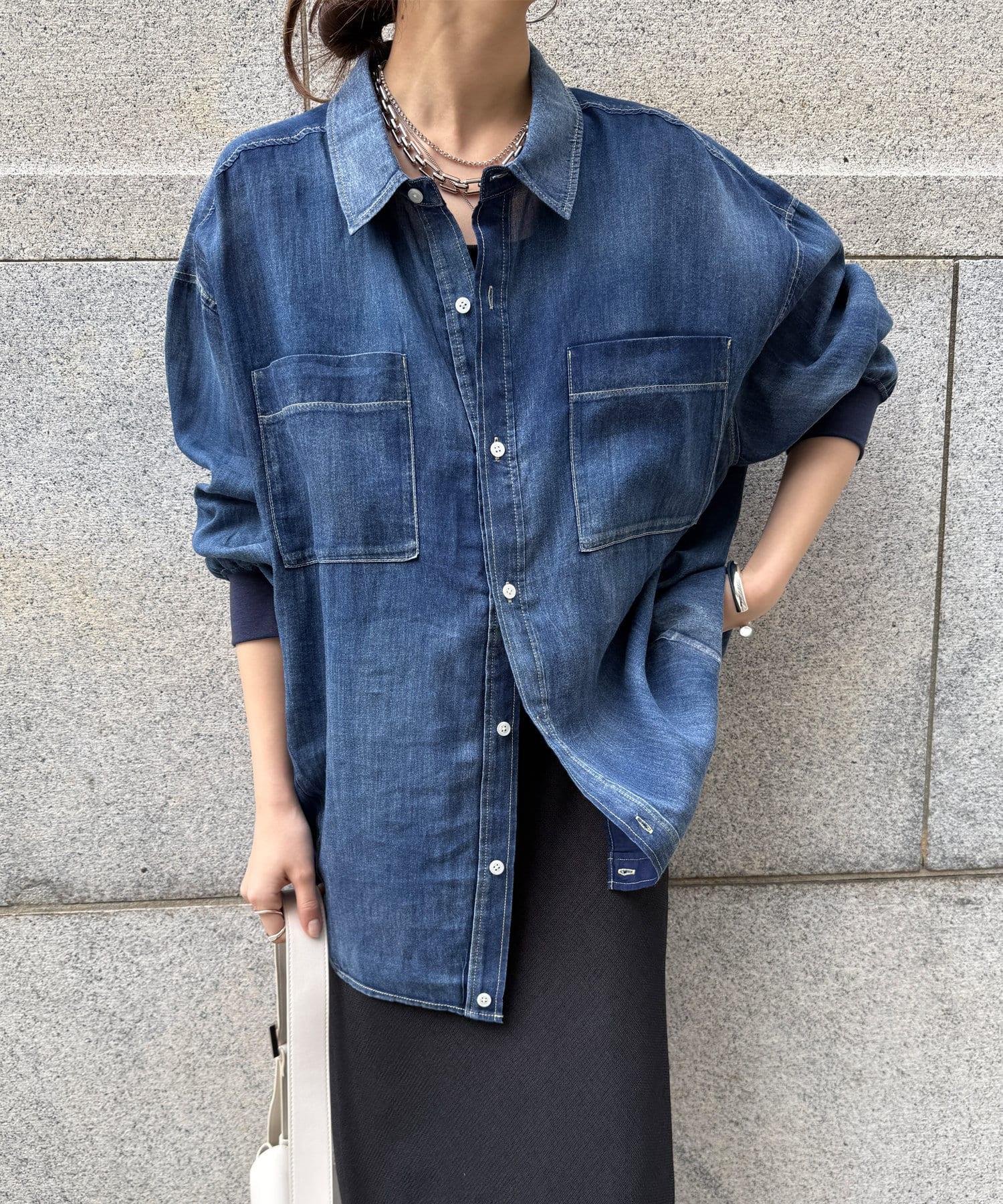 牛仔襯衫採用透視牛仔布料,給人耳目一新的感覺。