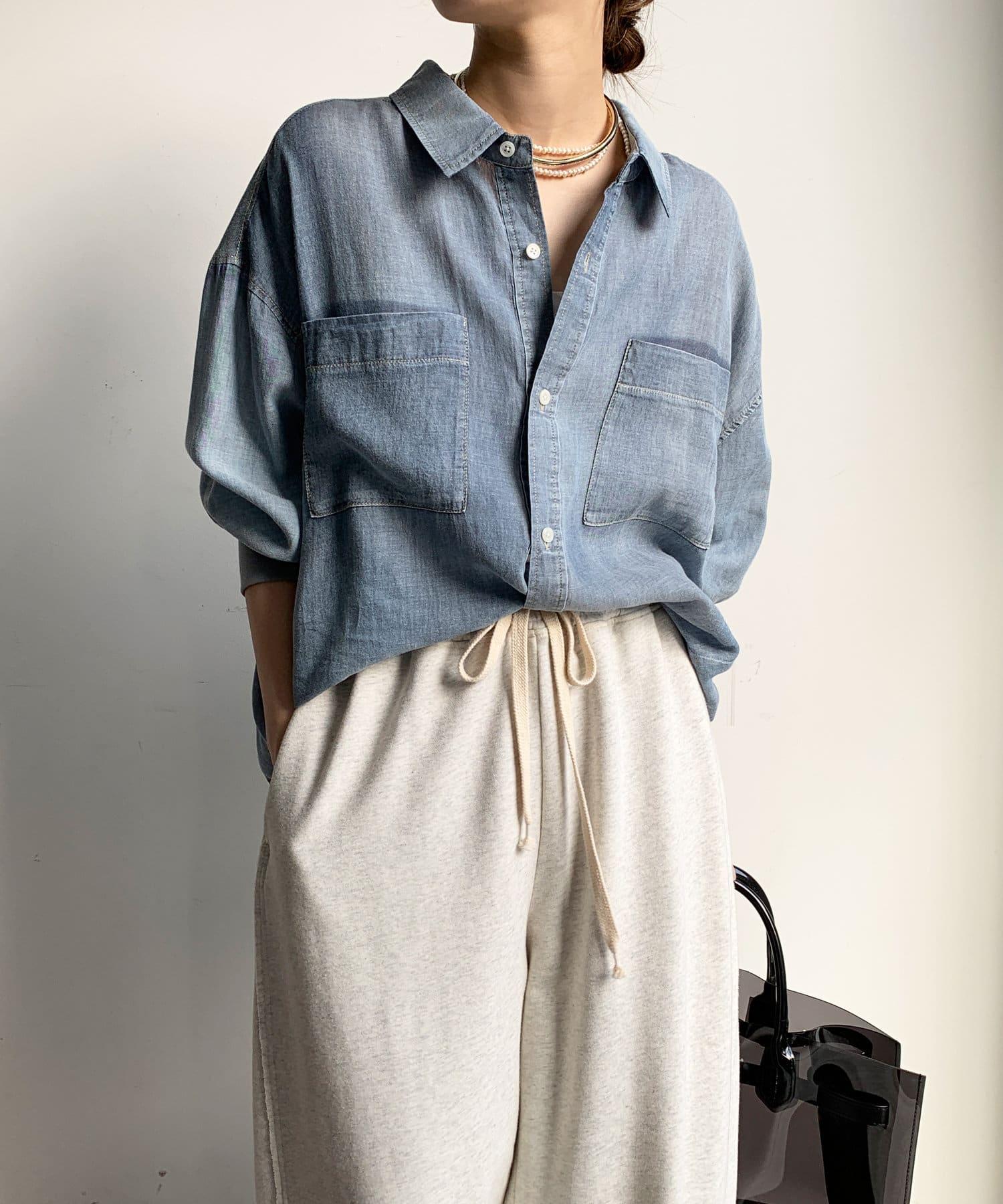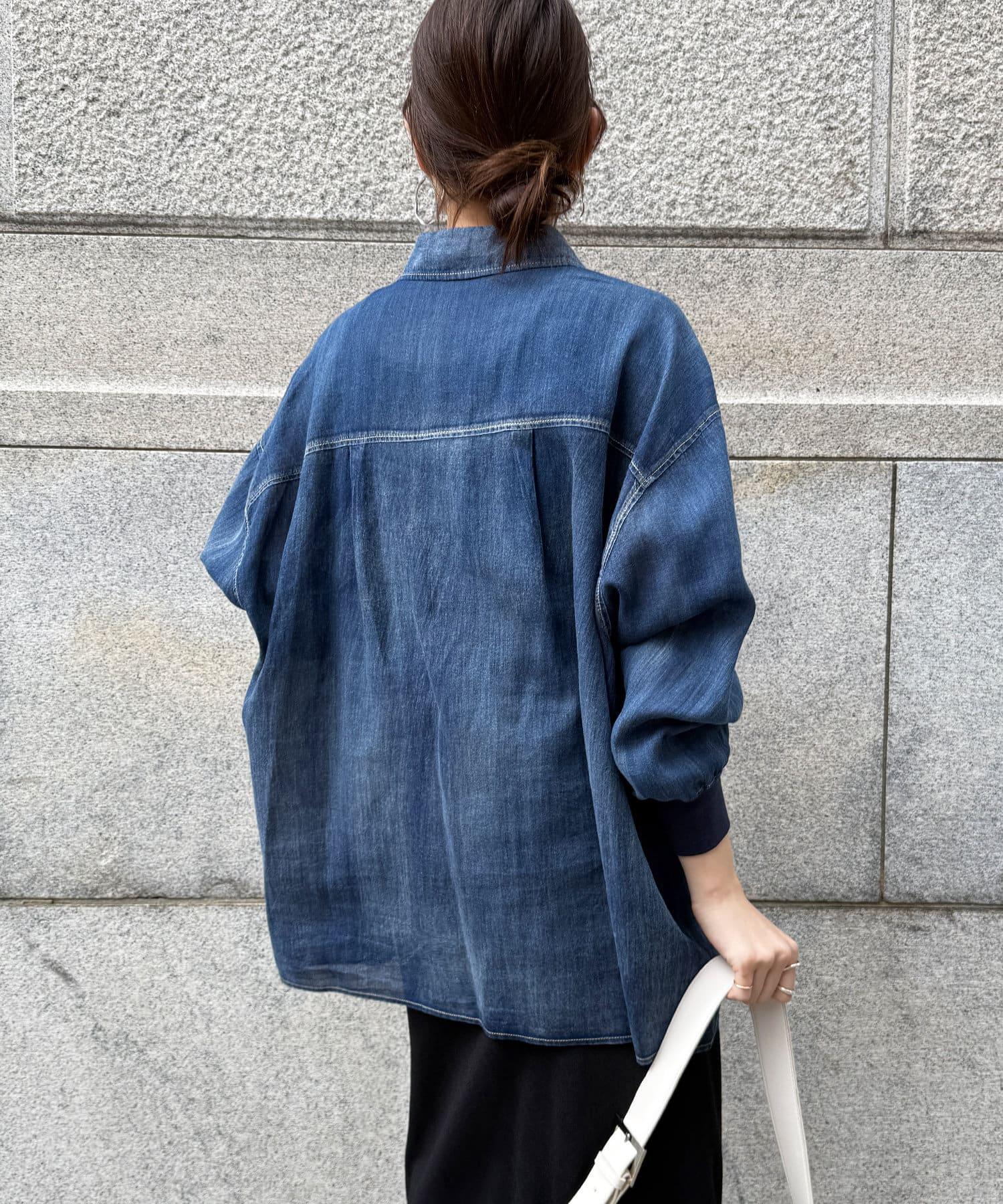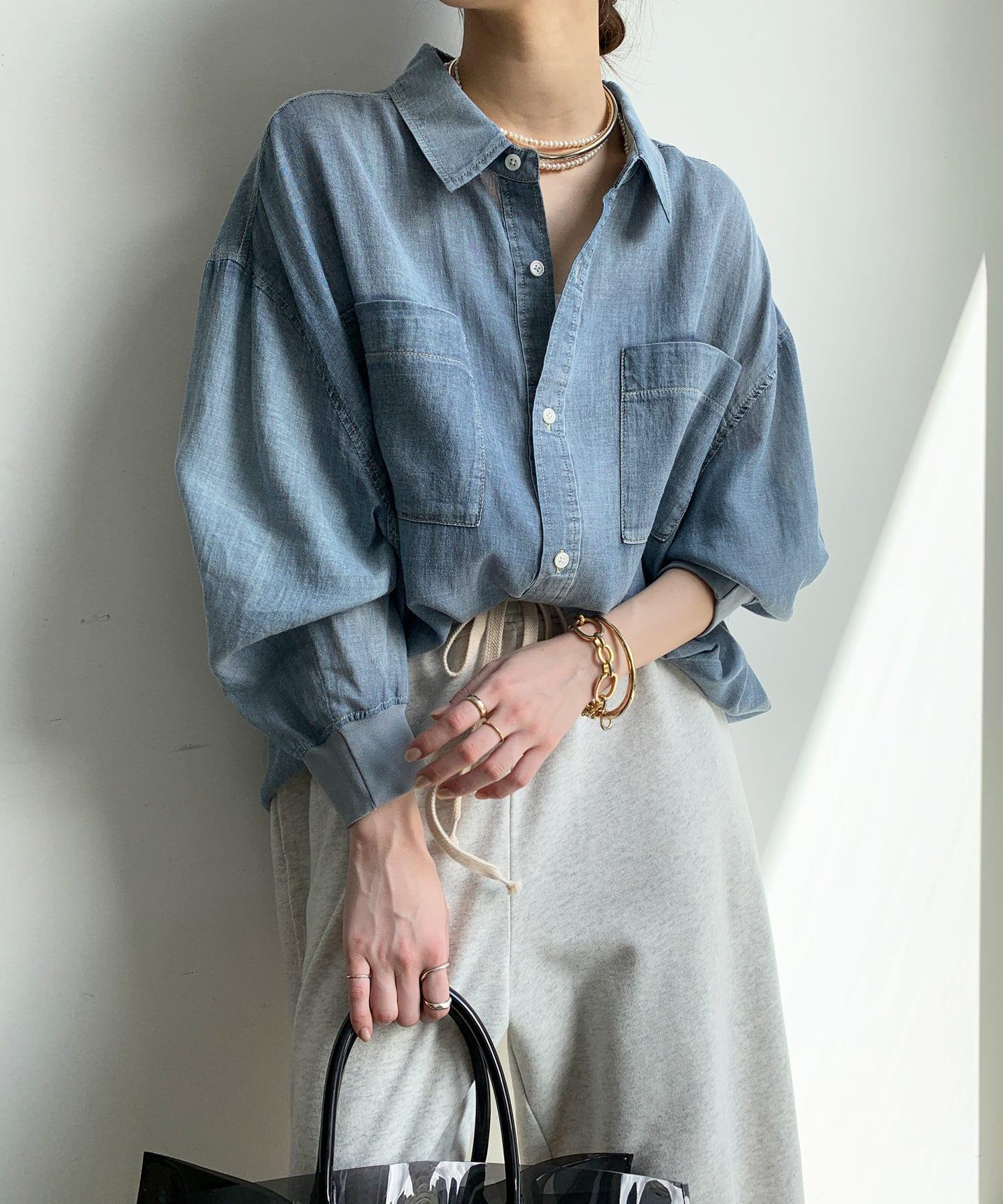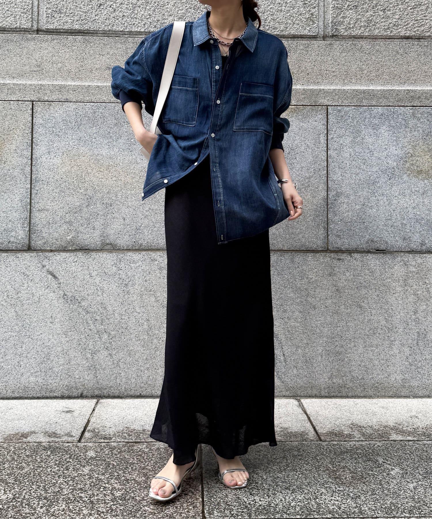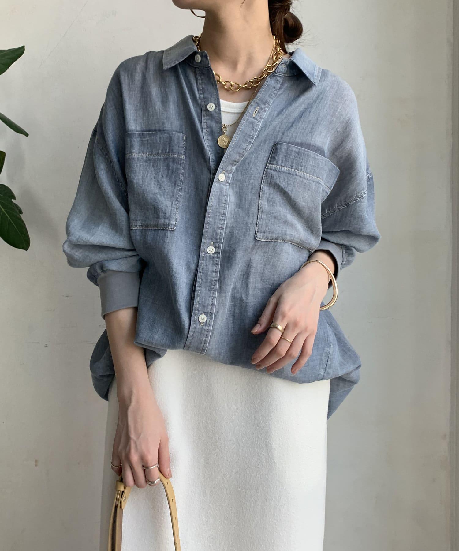 牛仔襯衫採用透視牛仔布料,給人耳目一新的感覺。
