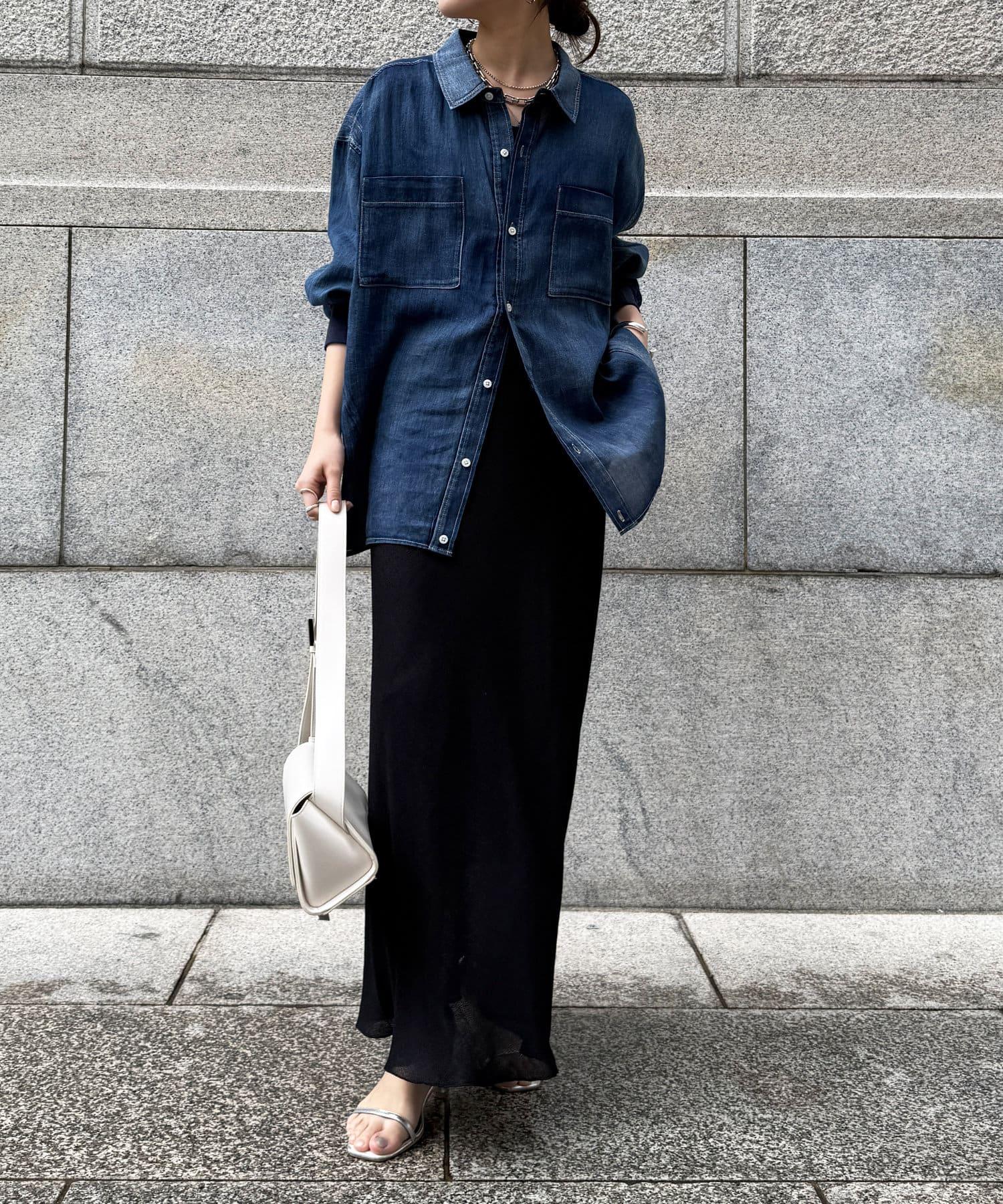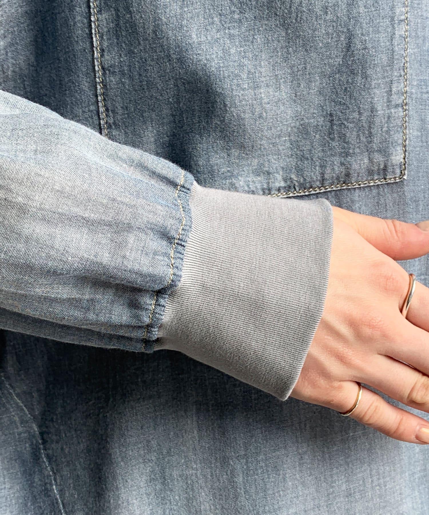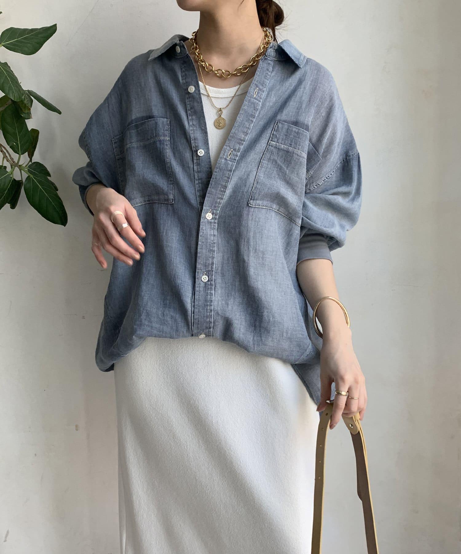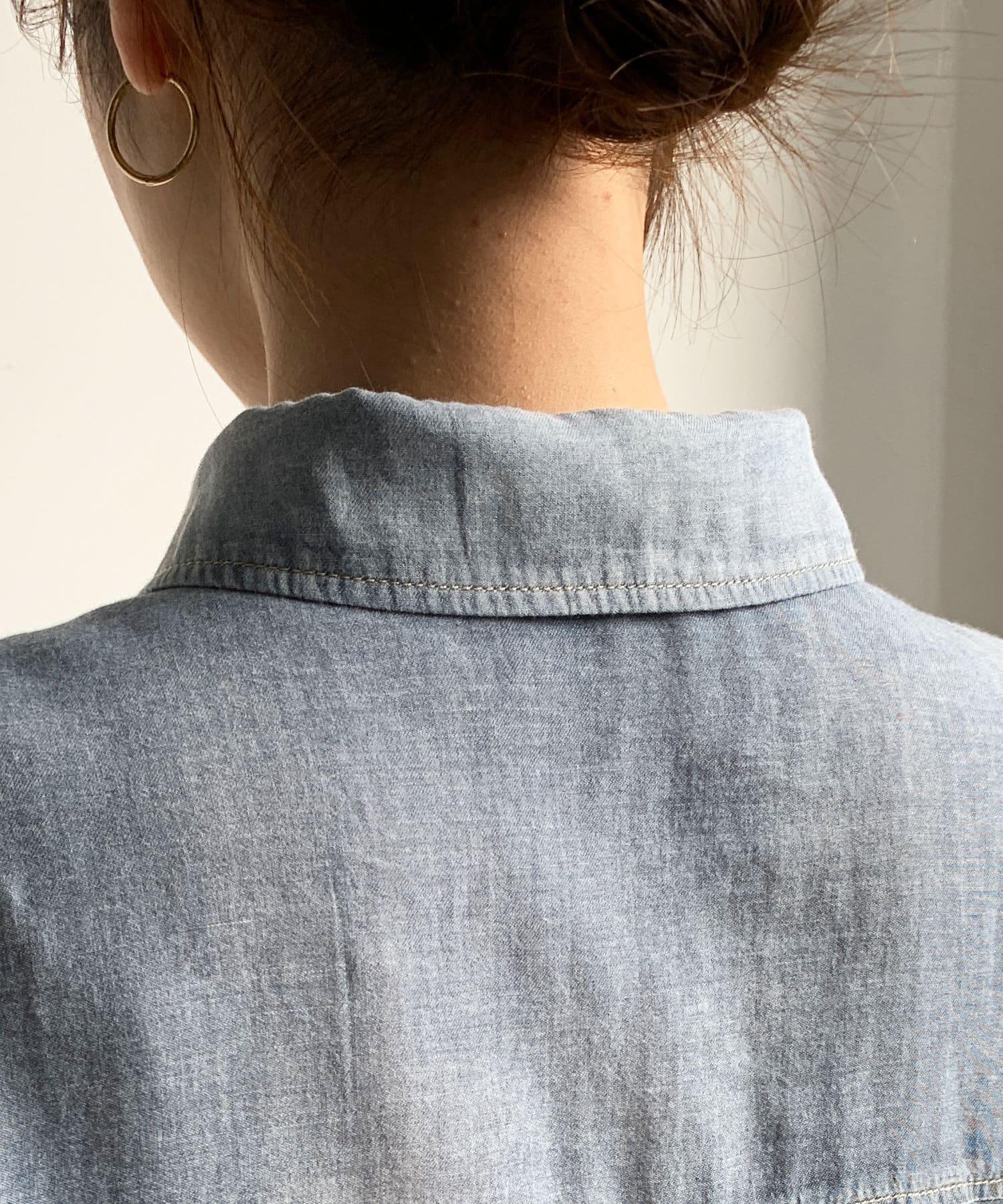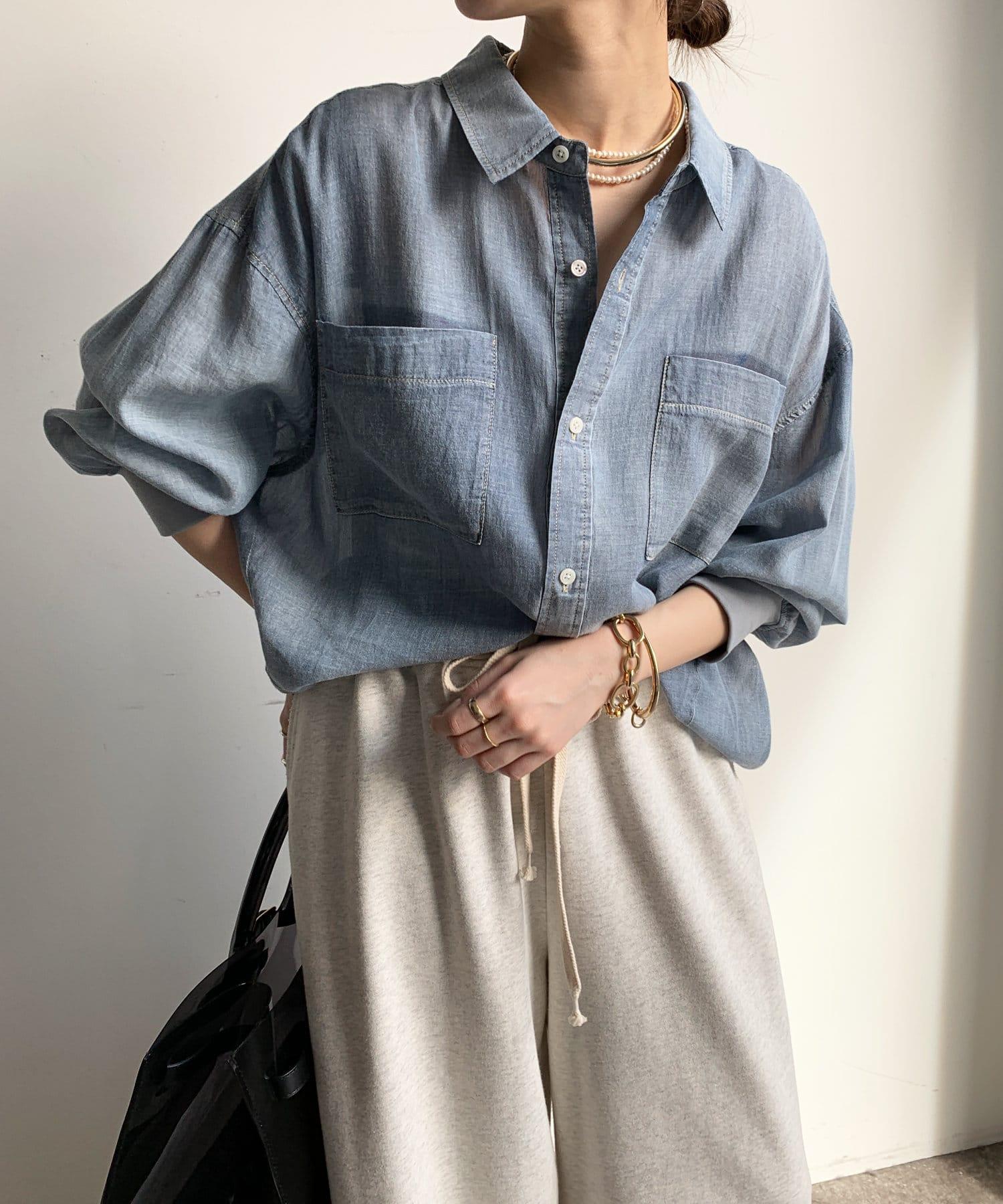 牛仔襯衫採用透視牛仔布料,給人耳目一新的感覺。