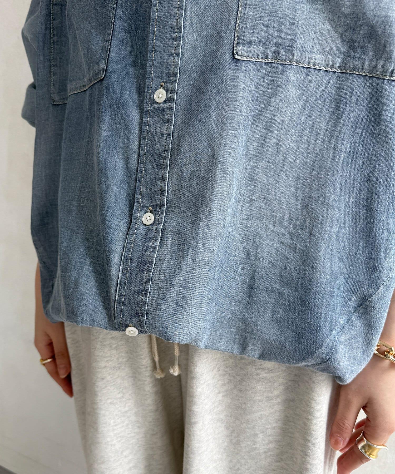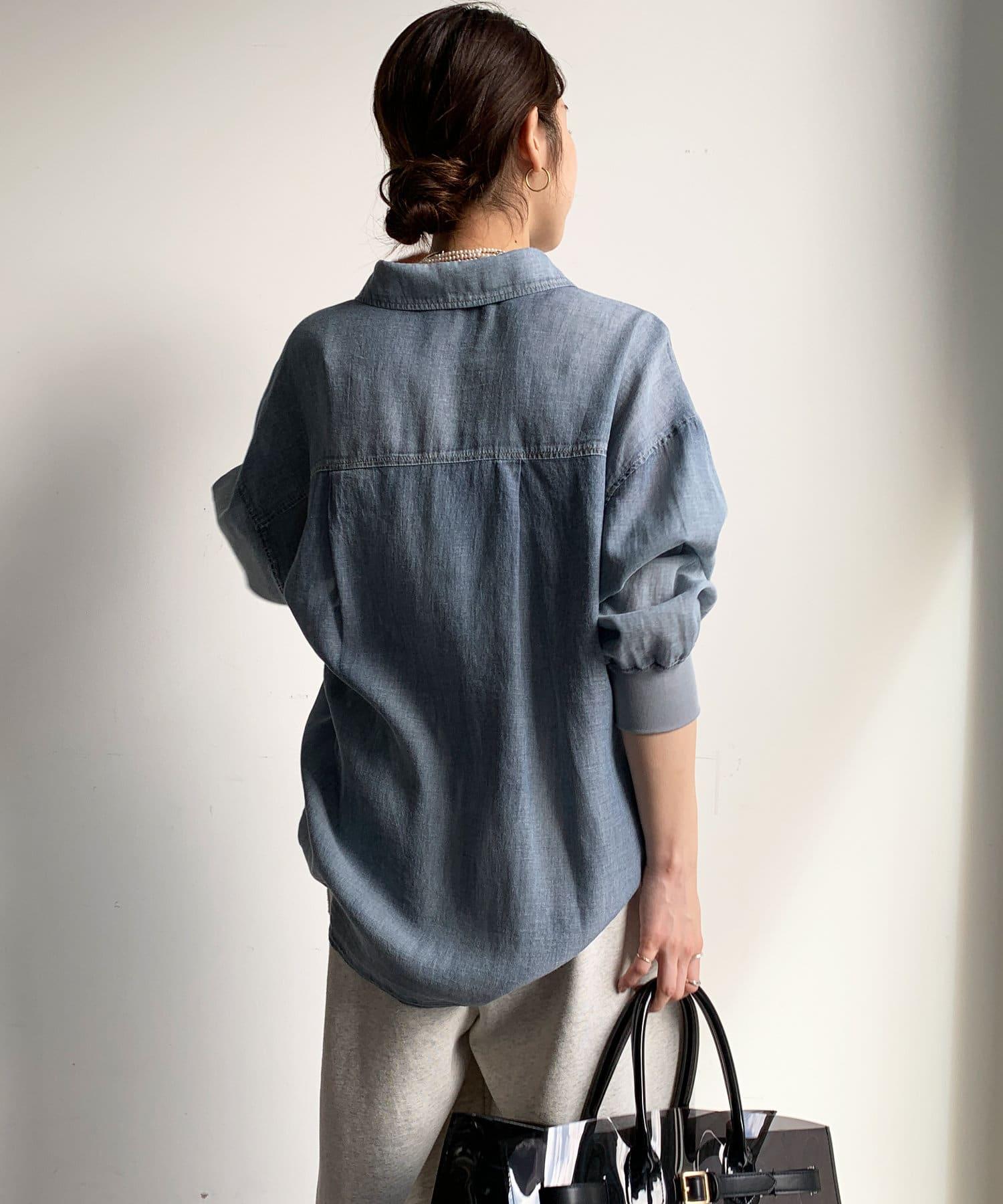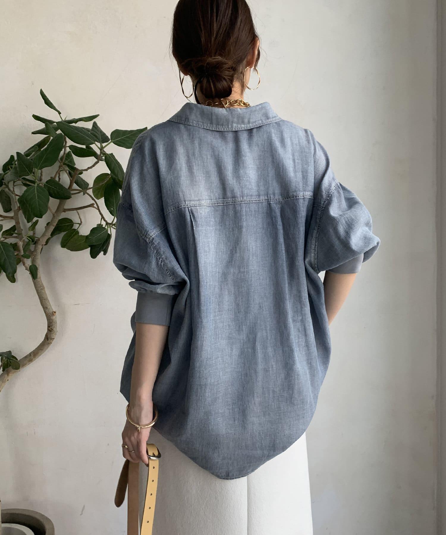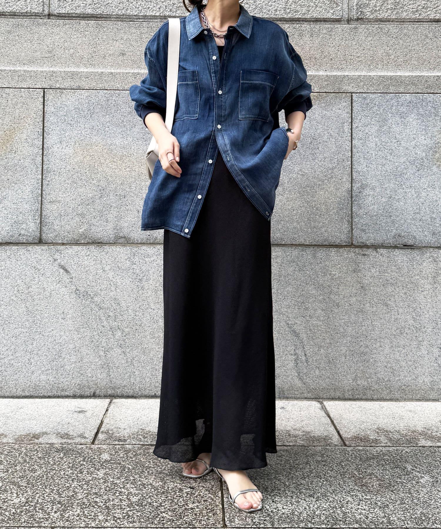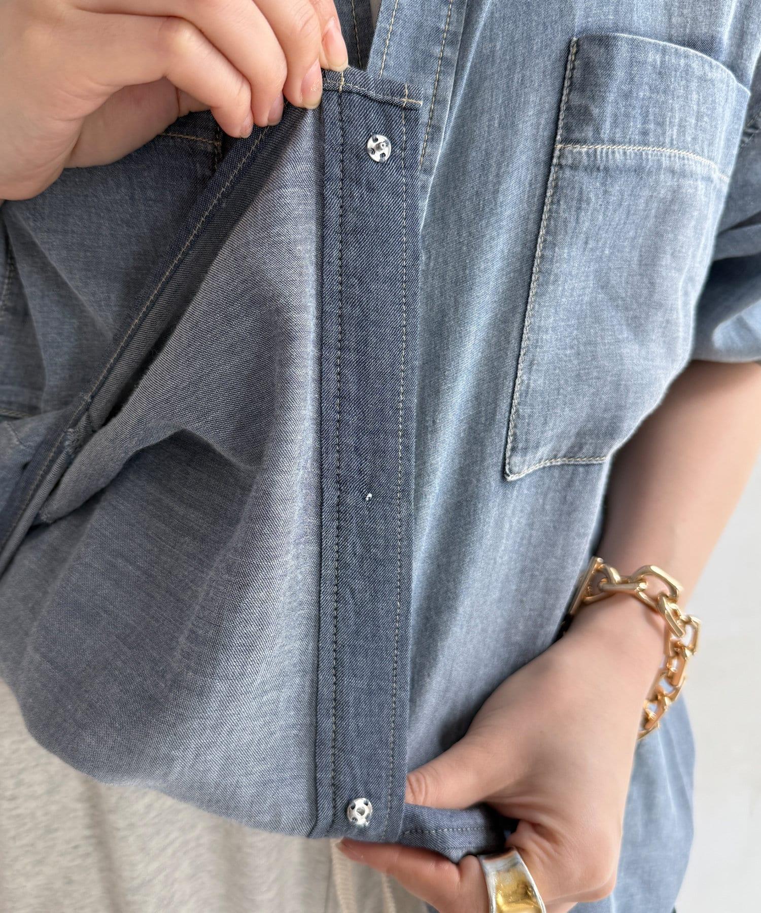 牛仔襯衫採用透視牛仔布料,給人耳目一新的感覺。