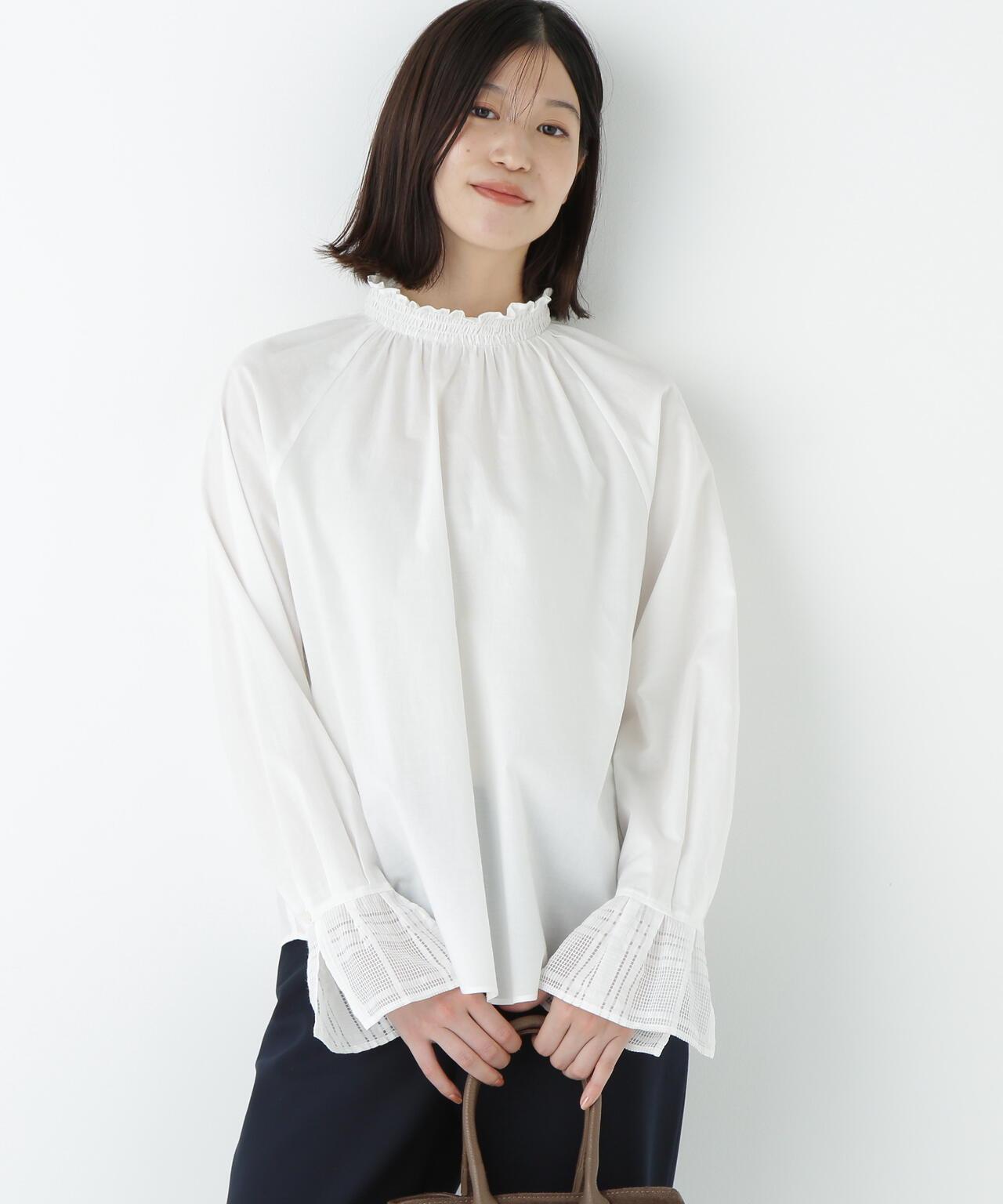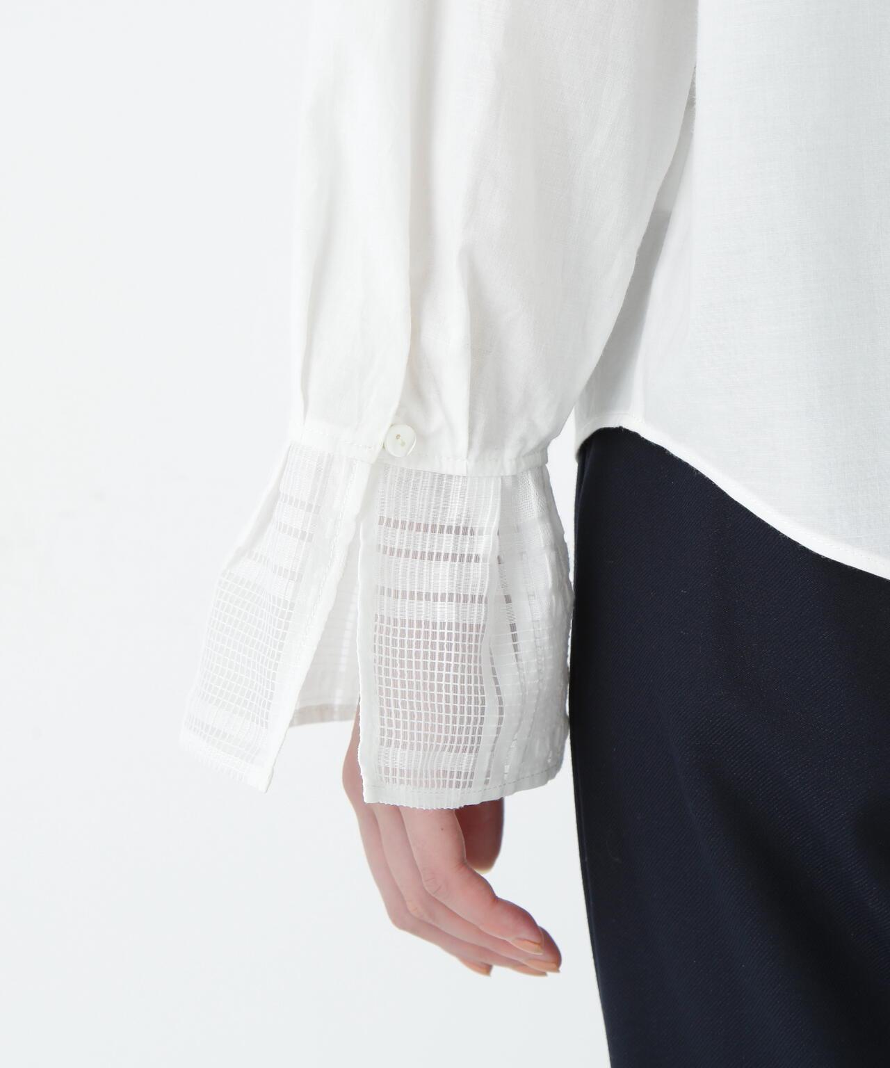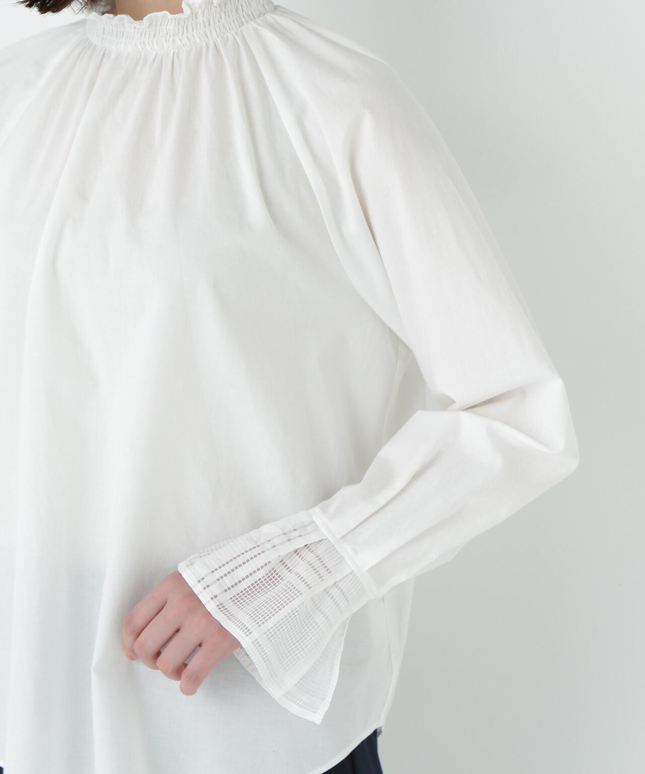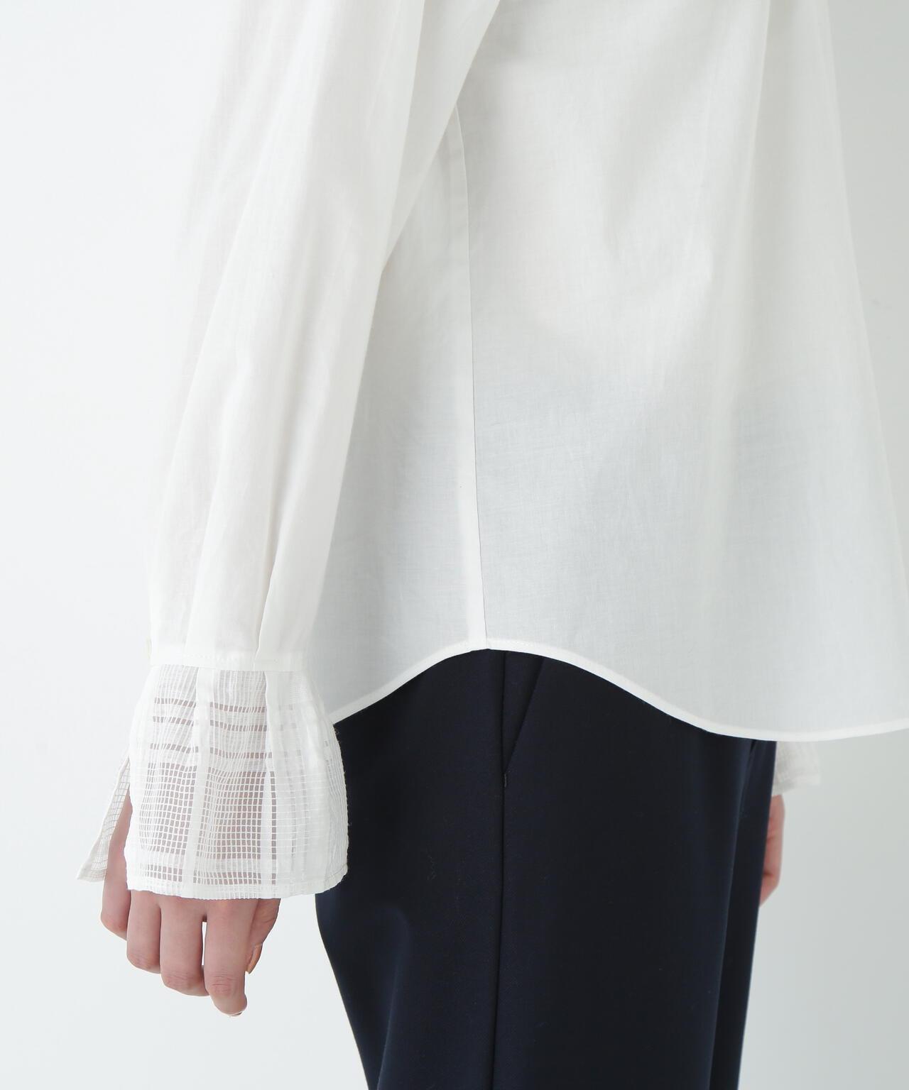 為多層款式增添魅力的設計上衣 [設計要點] 這款上衣單穿魅力十足,也建議用於多層搭配。衣領採用了波浪形設計,細密的褶皺給人一種不甜膩的感覺。袖口採用透視格紋面料。[材質要點] 雖然採用的是 100%純棉面料,但面料具有柔韌的彈性,輕薄但易於打理。袖子採用價值不菲的日本製造格紋提花面料。推薦搭配] 與針織套頭衫或開衫疊穿時,這款設計襯衫的領子和袖子都很可愛。長短搭配都很方便。