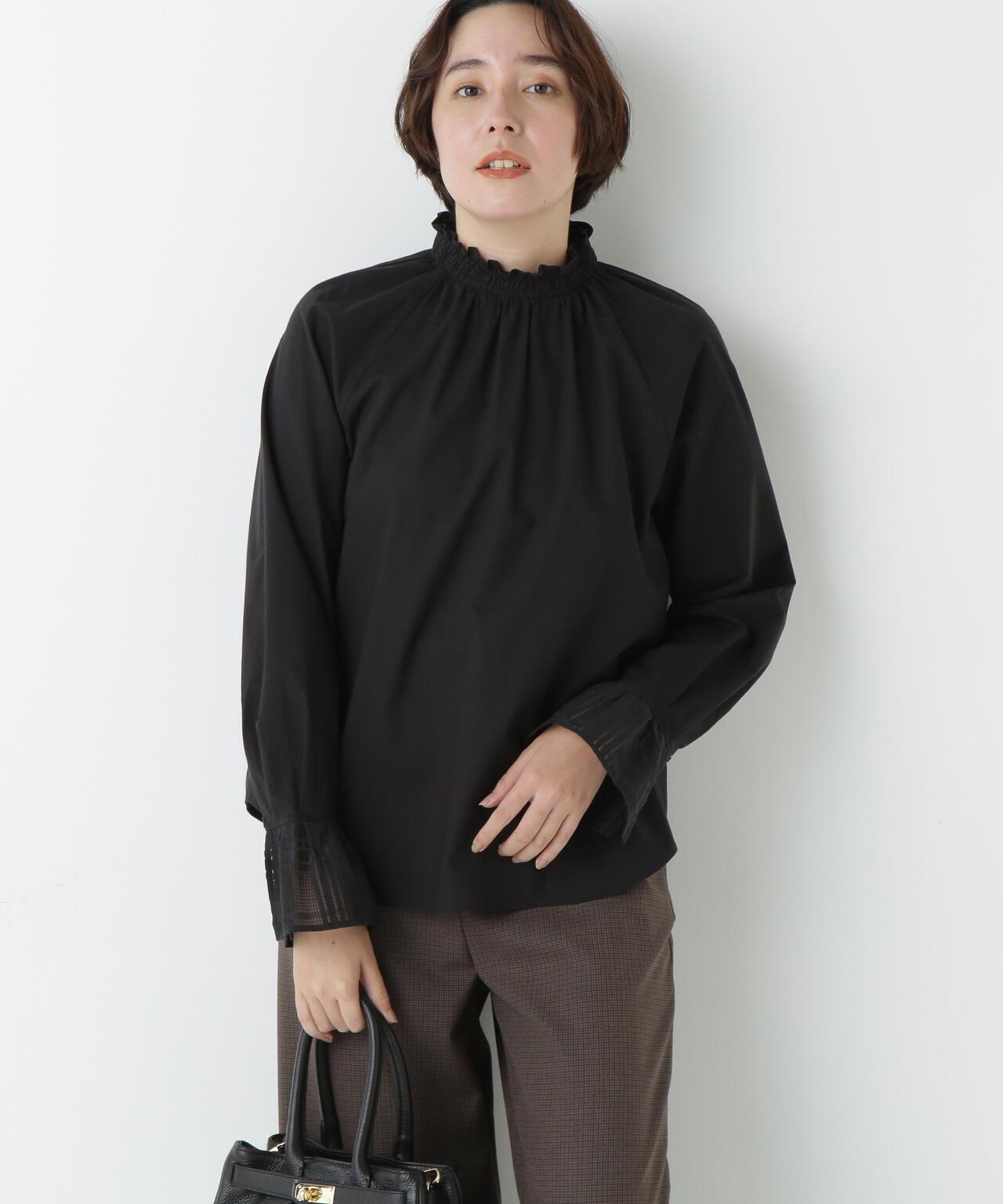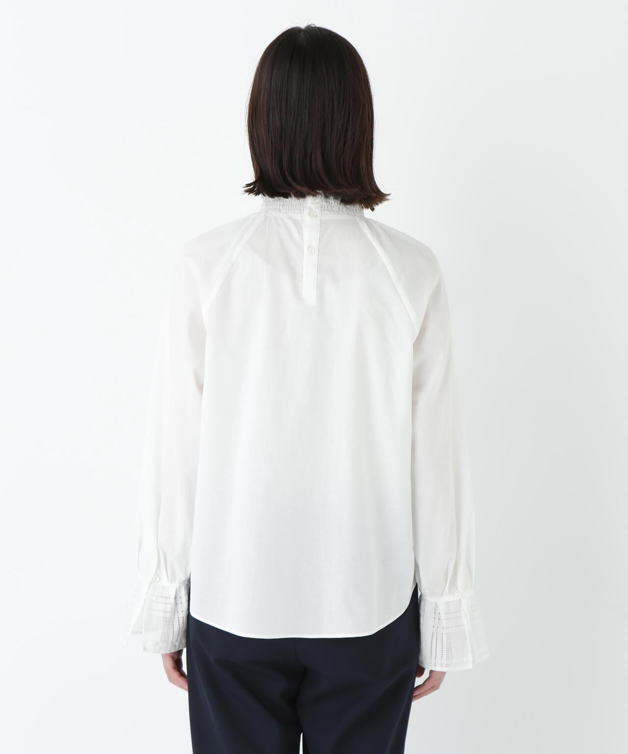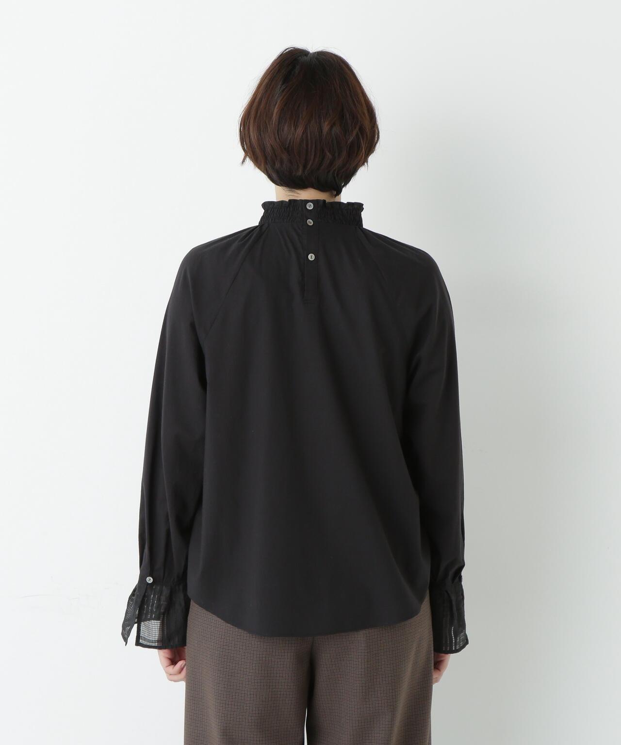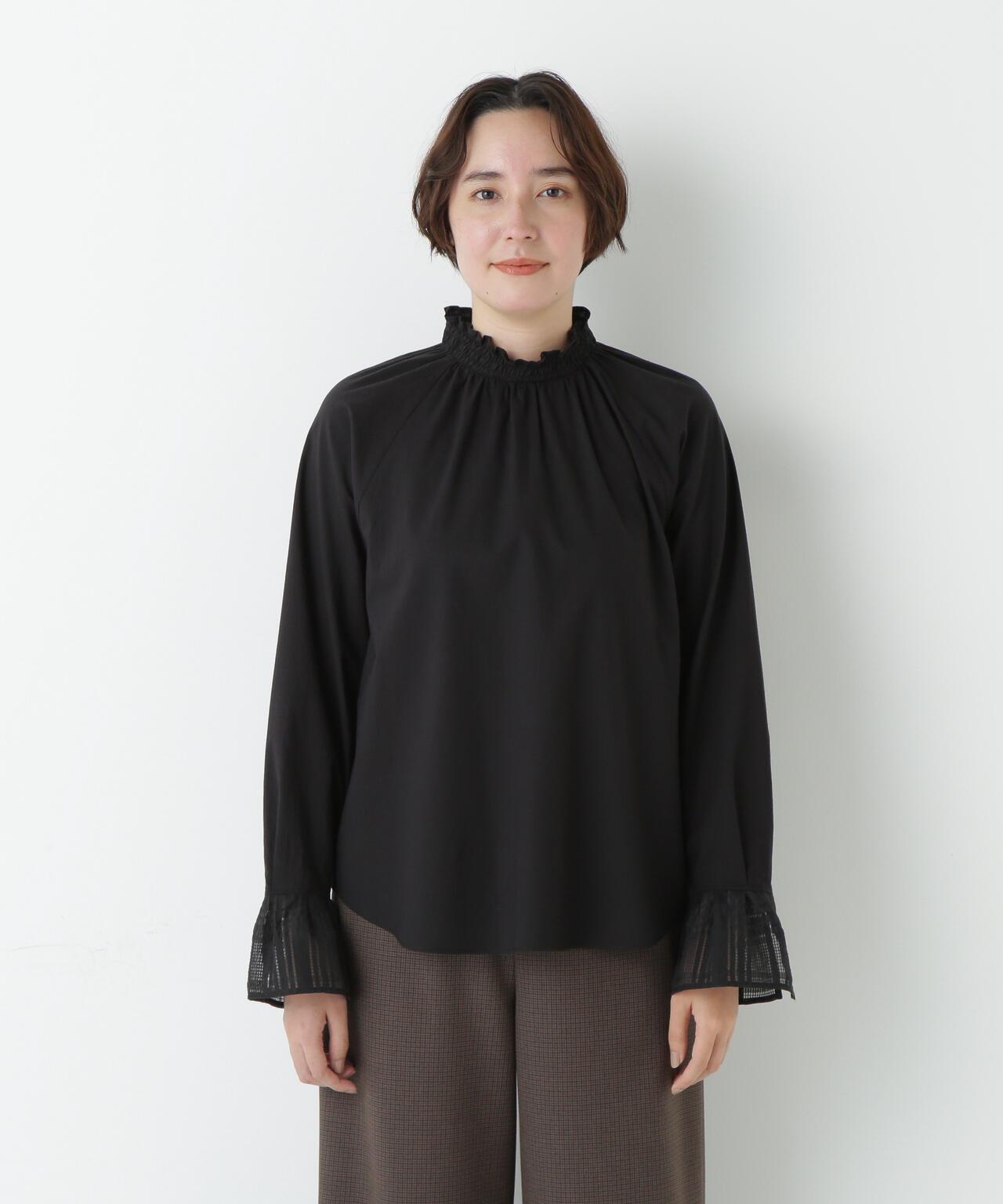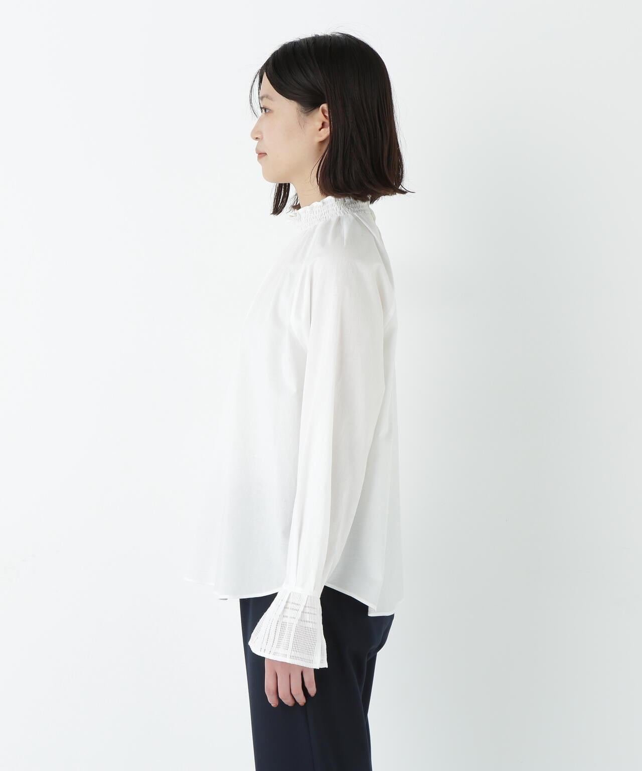 為多層款式增添魅力的設計上衣 [設計要點] 這款上衣單穿魅力十足,也建議用於多層搭配。衣領採用了波浪形設計,細密的褶皺給人一種不甜膩的感覺。袖口採用透視格紋面料。[材質要點] 雖然採用的是 100%純棉面料,但面料具有柔韌的彈性,輕薄但易於打理。袖子採用價值不菲的日本製造格紋提花面料。推薦搭配] 與針織套頭衫或開衫疊穿時,這款設計襯衫的領子和袖子都很可愛。長短搭配都很方便。