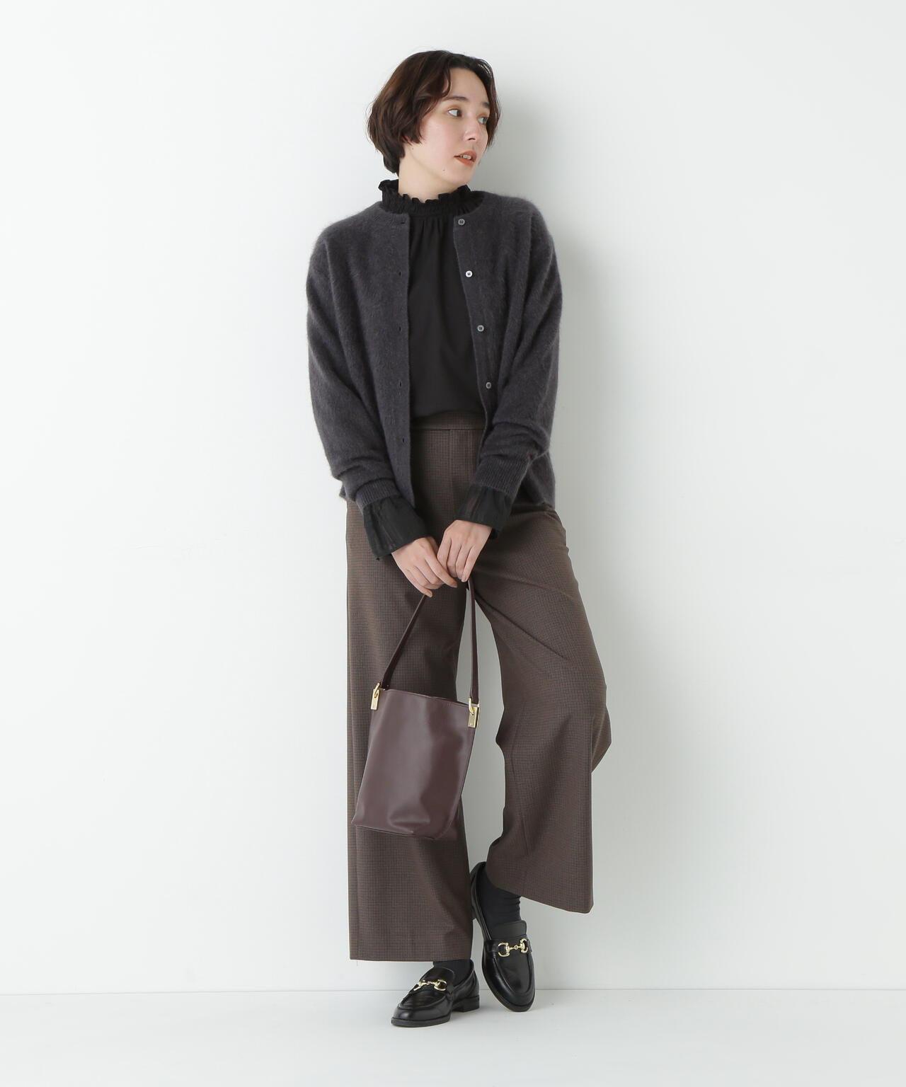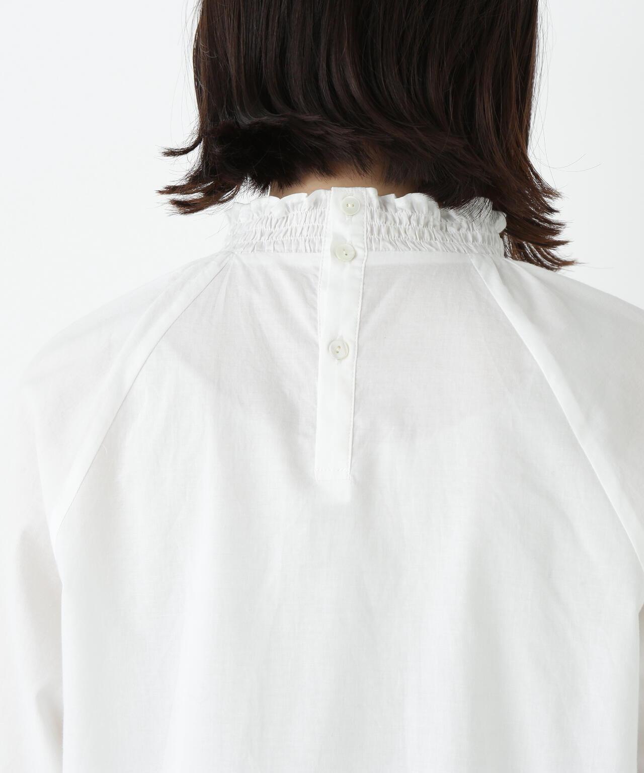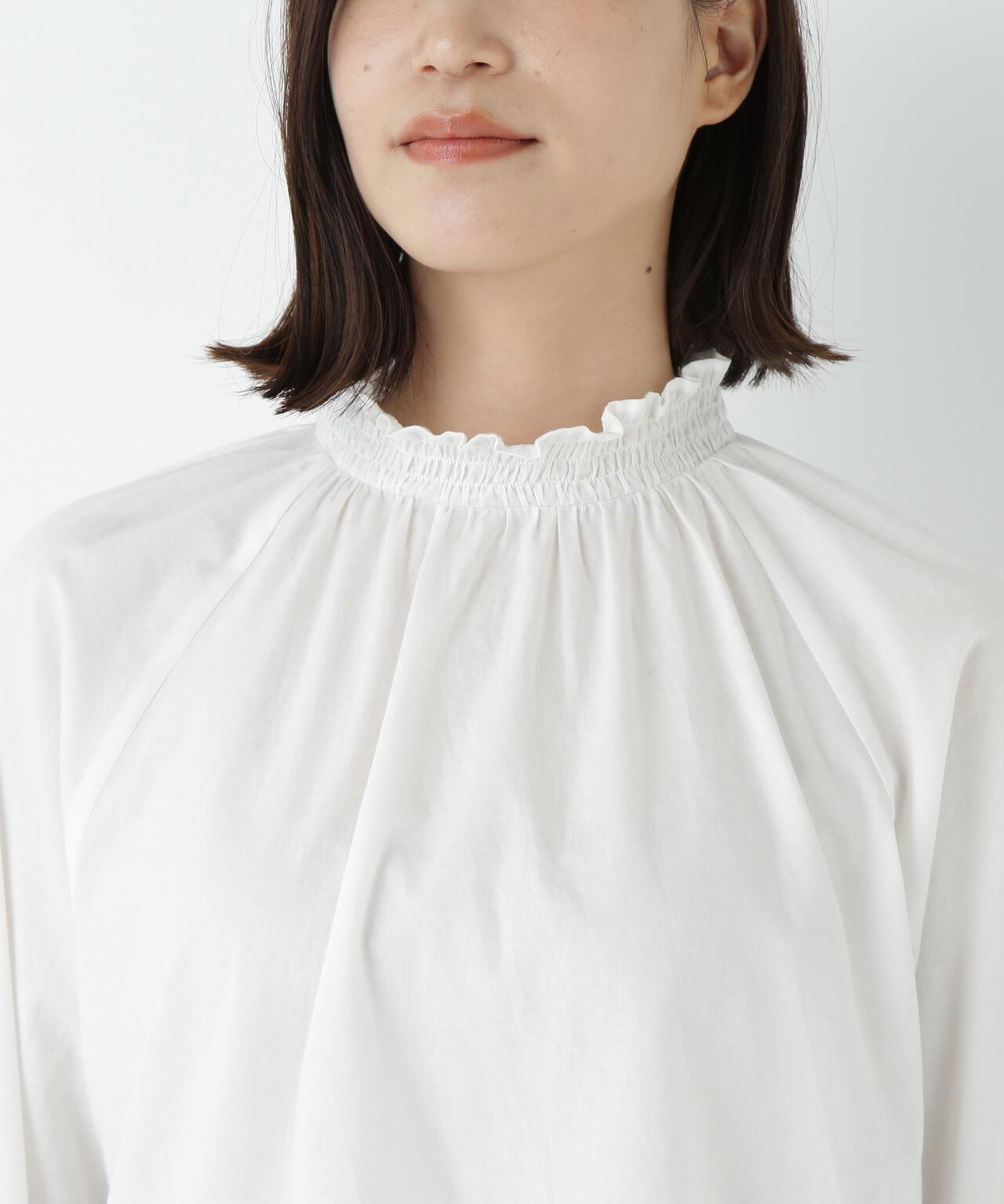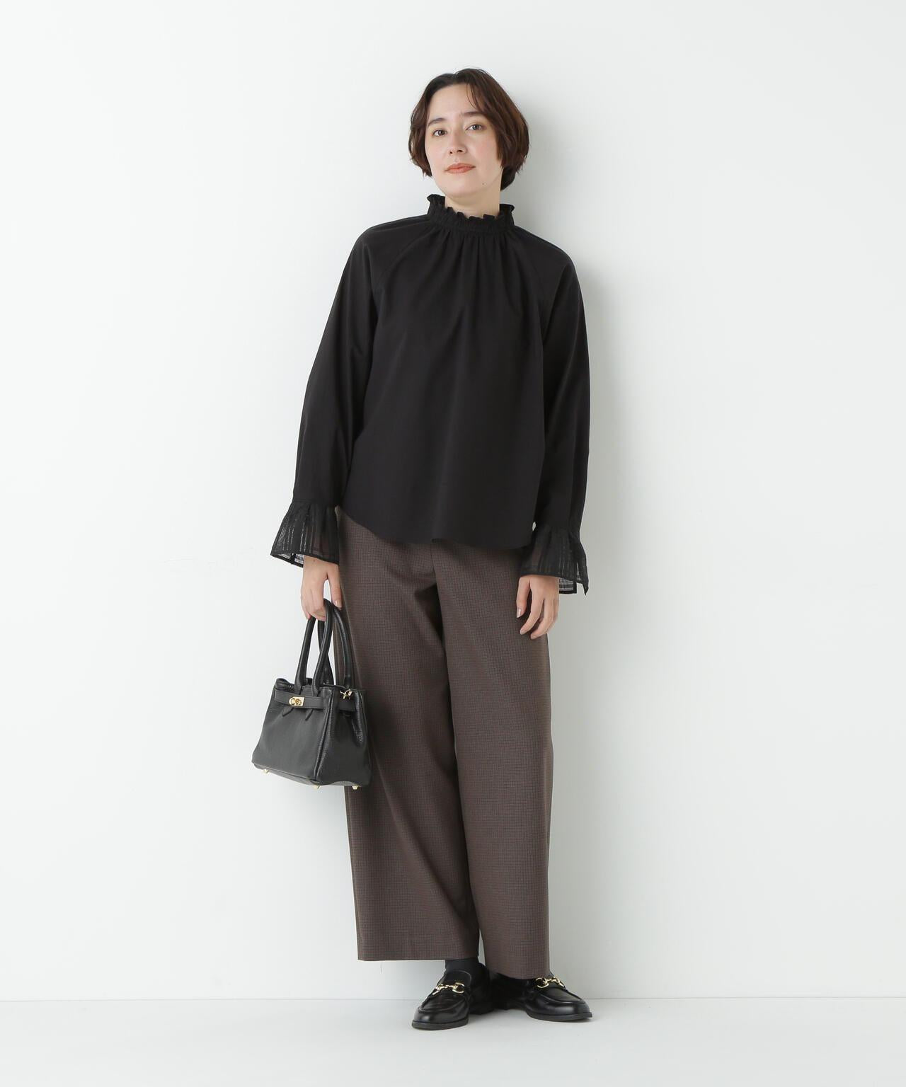 為多層款式增添魅力的設計上衣 [設計要點] 這款上衣單穿魅力十足,也建議用於多層搭配。衣領採用了波浪形設計,細密的褶皺給人一種不甜膩的感覺。袖口採用透視格紋面料。[材質要點] 雖然採用的是 100%純棉面料,但面料具有柔韌的彈性,輕薄但易於打理。袖子採用價值不菲的日本製造格紋提花面料。推薦搭配] 與針織套頭衫或開衫疊穿時,這款設計襯衫的領子和袖子都很可愛。長短搭配都很方便。