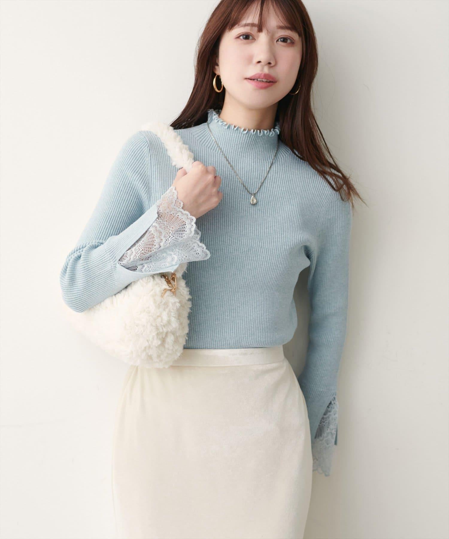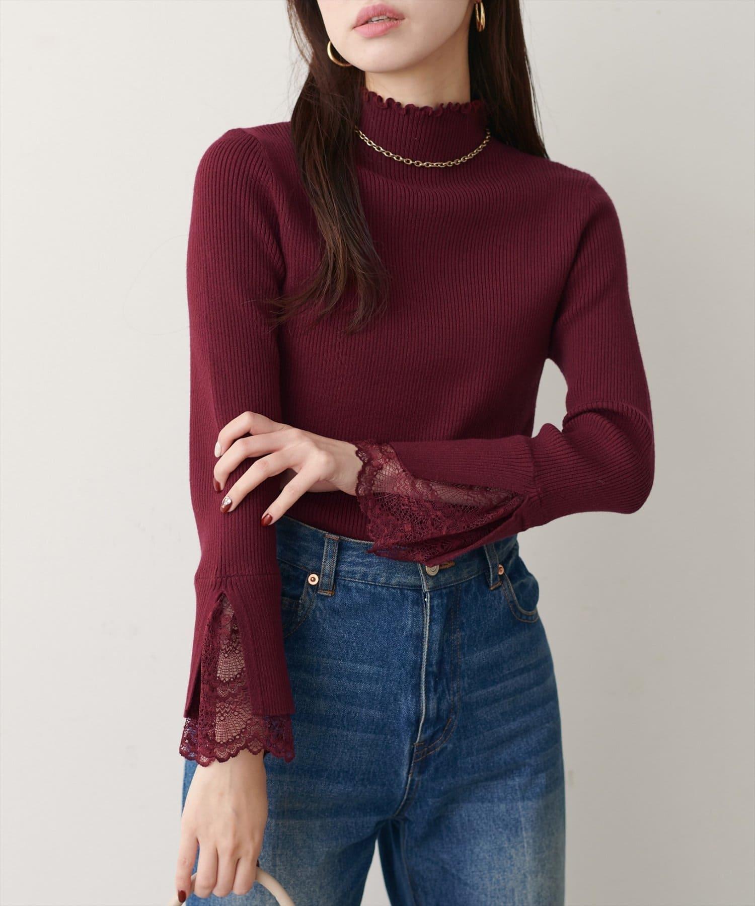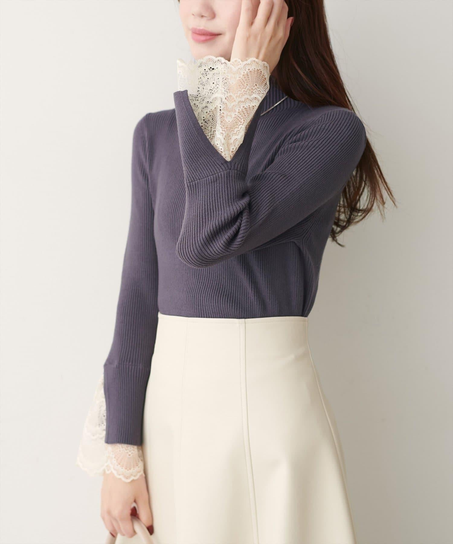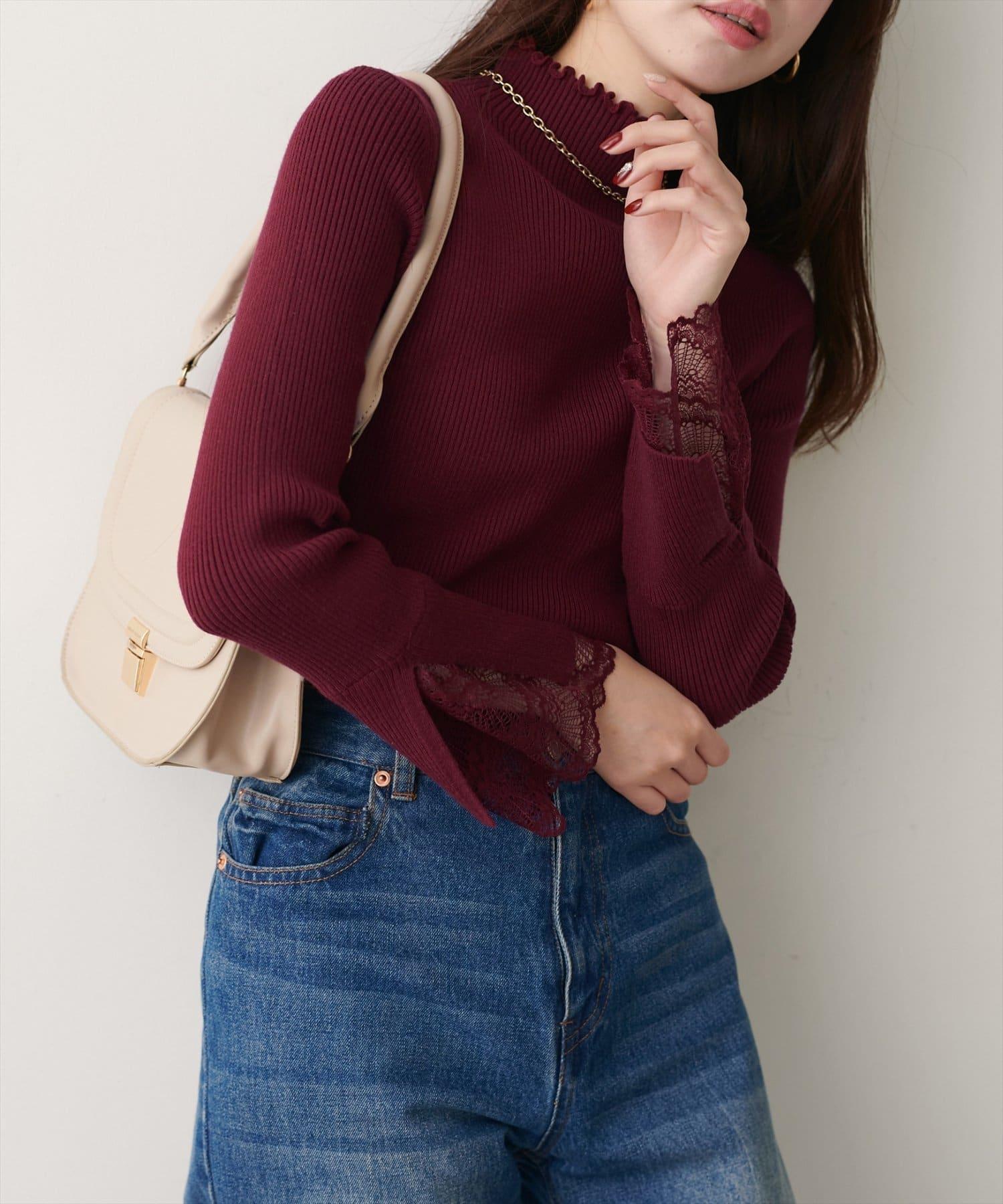 簡潔的羅紋針織上帶有蕾絲袖口的女性化高領針織衫,可搭配任何服飾。